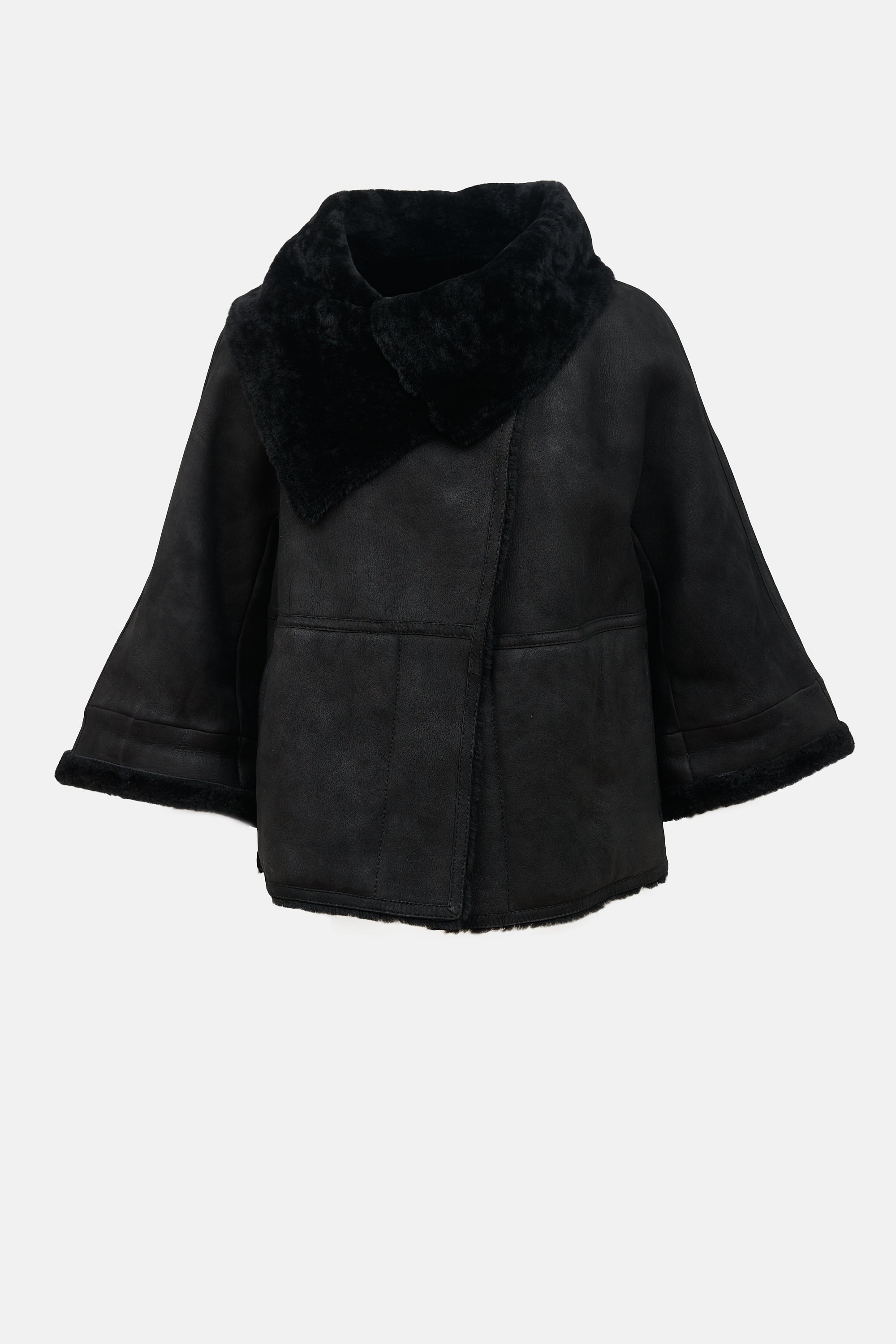 Pre-owned Max Mara black shearling jacket featuring a funnel neck with convertible spread collar, snap button fastening at collar, top seams, two welt pockets at waist, and cropped wide sleeves.