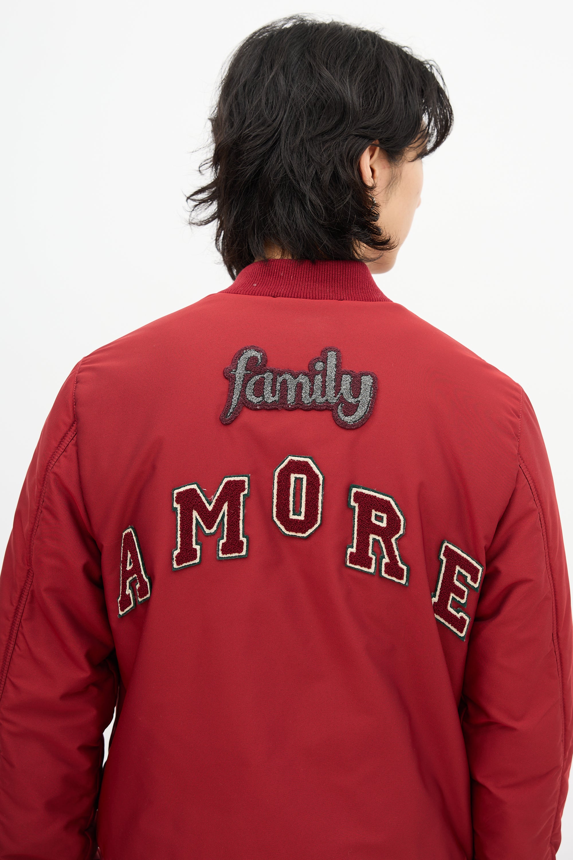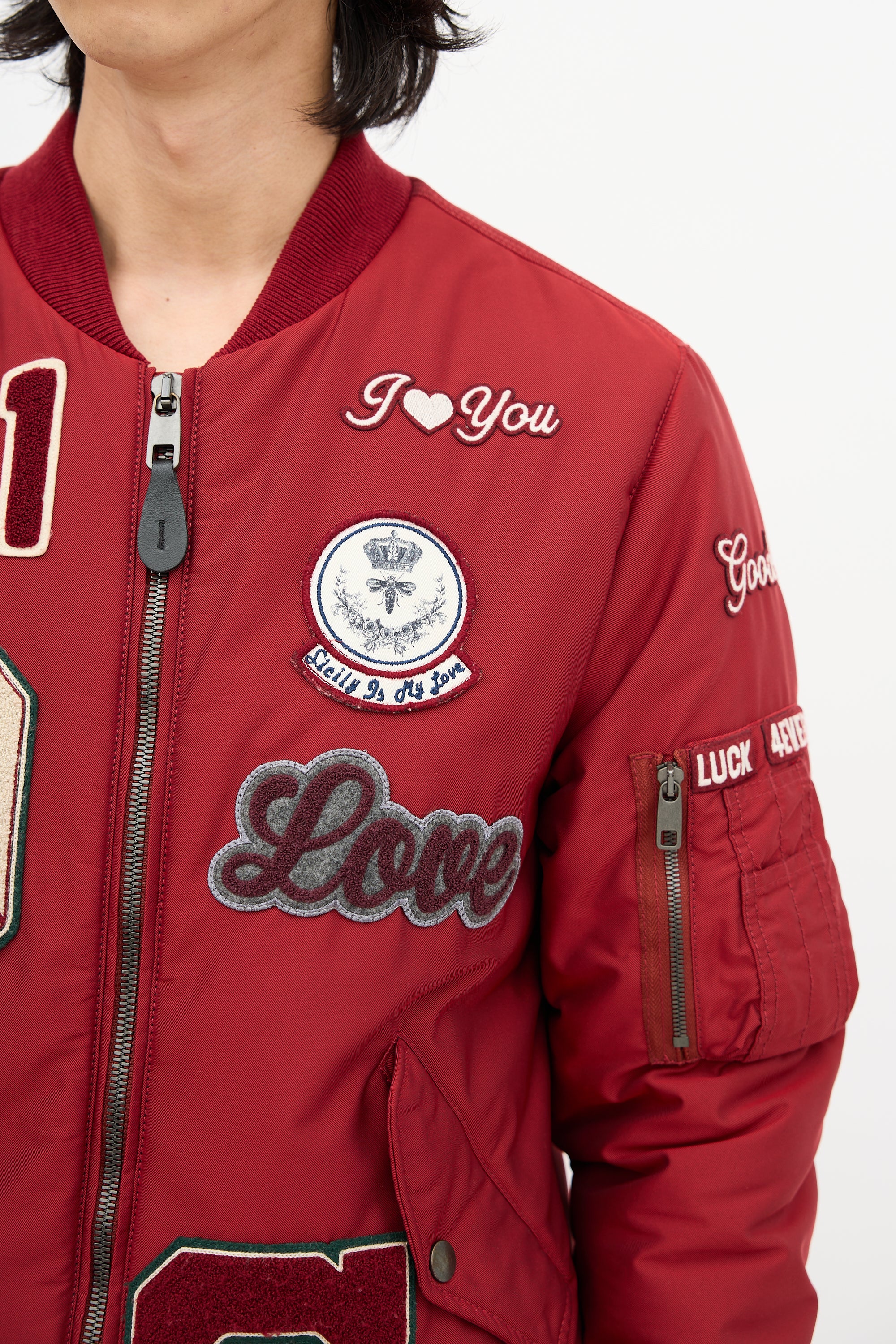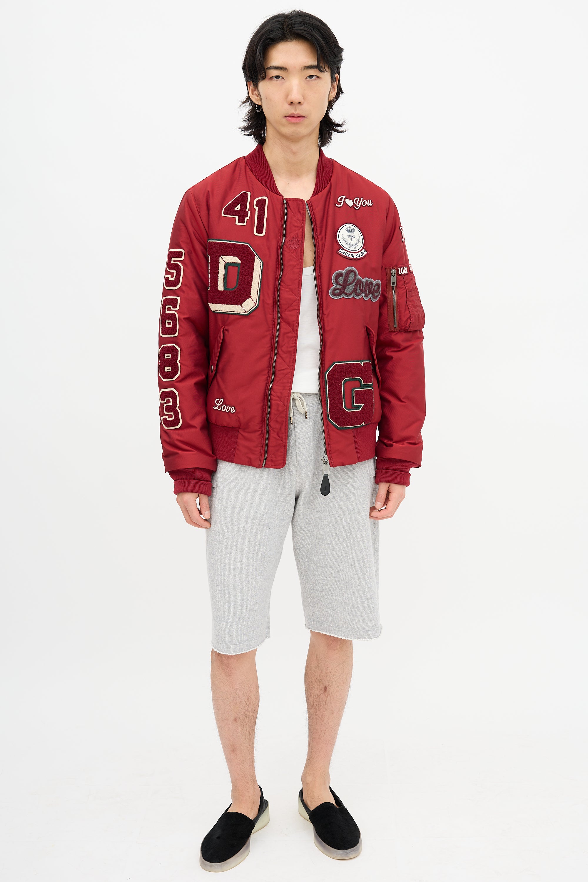 Pre-owned Dolce & Gabbana red bomber jacket featuring "Amore" motif patches, zip front, two front pockets, two interior pockets, pocket detail at left arm, printed interior, and ribbed collar, hem, and cuffs. Padded and lined.