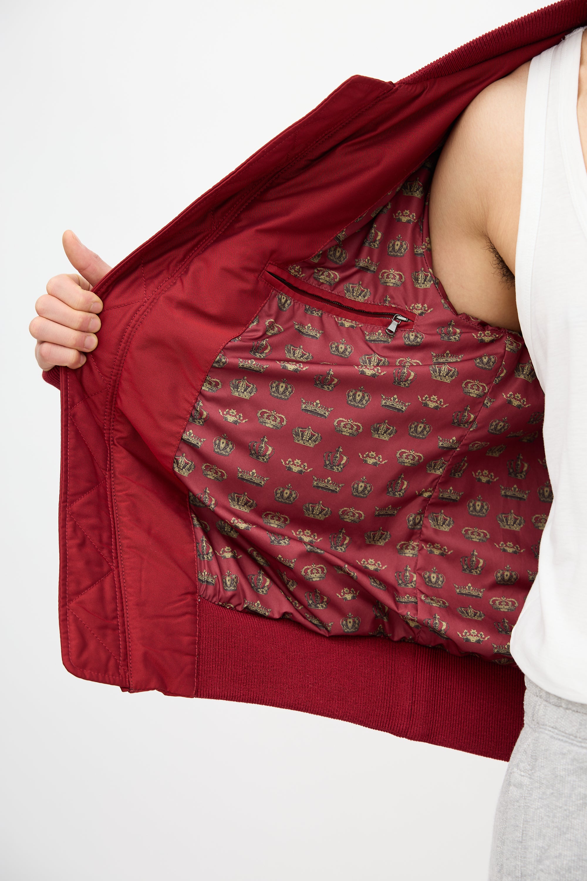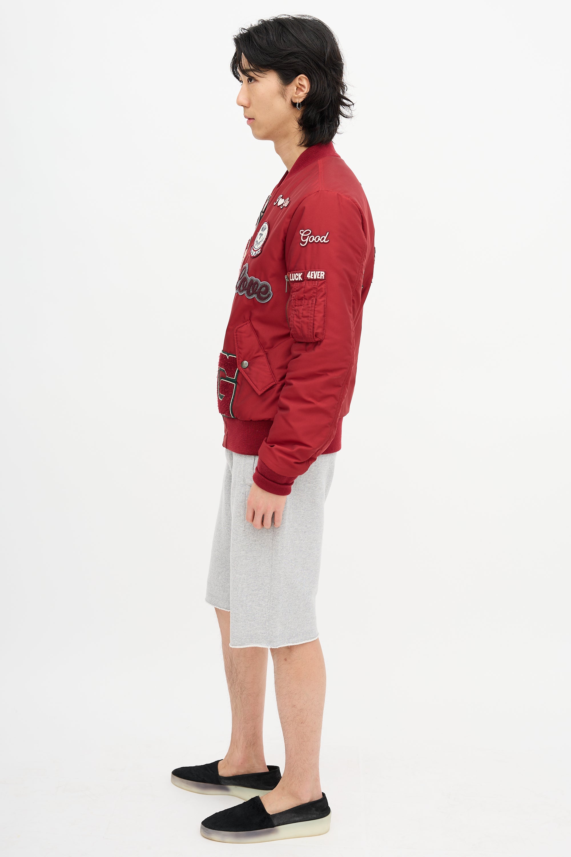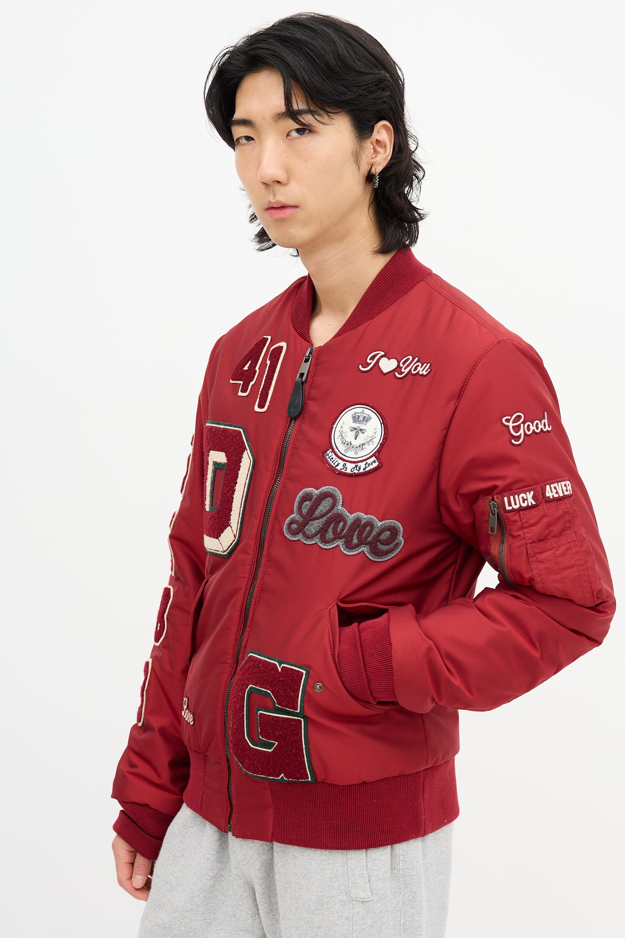 Pre-owned Dolce & Gabbana red bomber jacket featuring "Amore" motif patches, zip front, two front pockets, two interior pockets, pocket detail at left arm, printed interior, and ribbed collar, hem, and cuffs. Padded and lined.