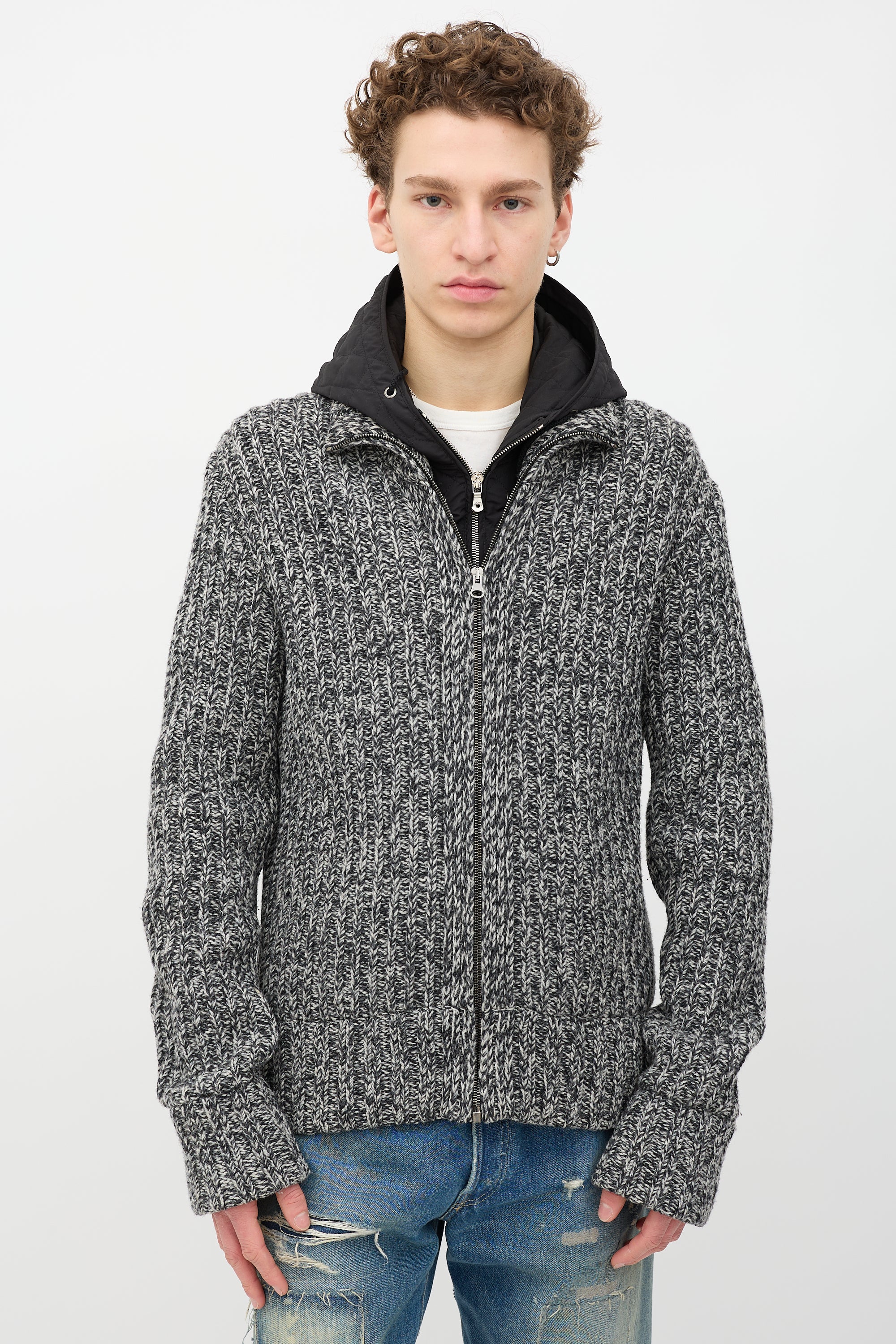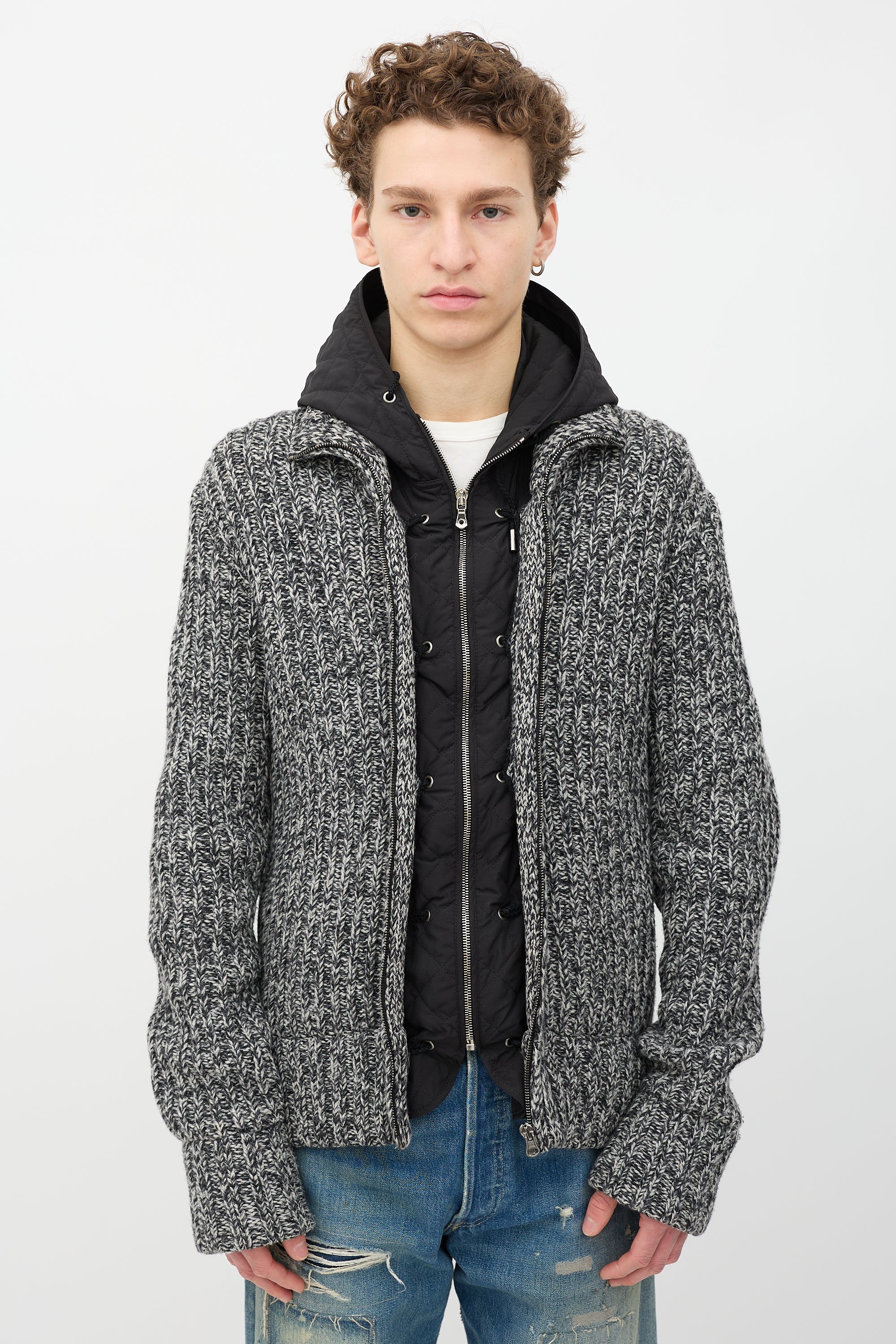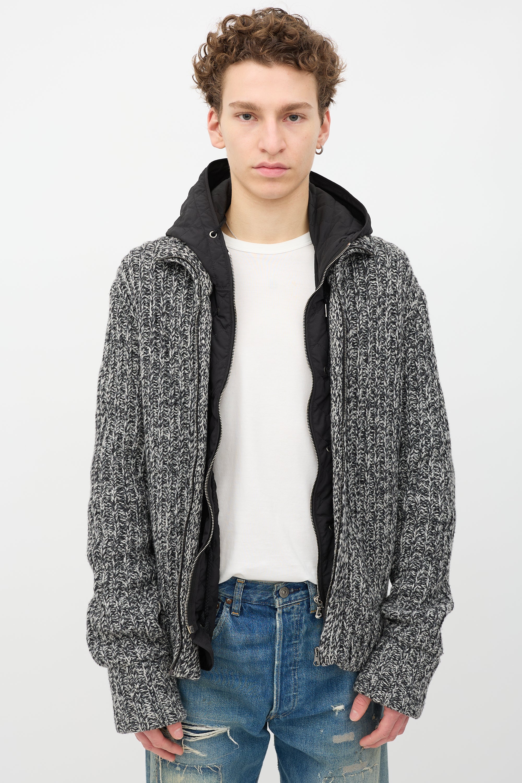 Pre-owned Dolce & Gabbana grey and white marled knit 2-in-1 jacket featuring stand collar, zip up front, and removable black quilted vest at interior with drawstring hood and front zip closure.