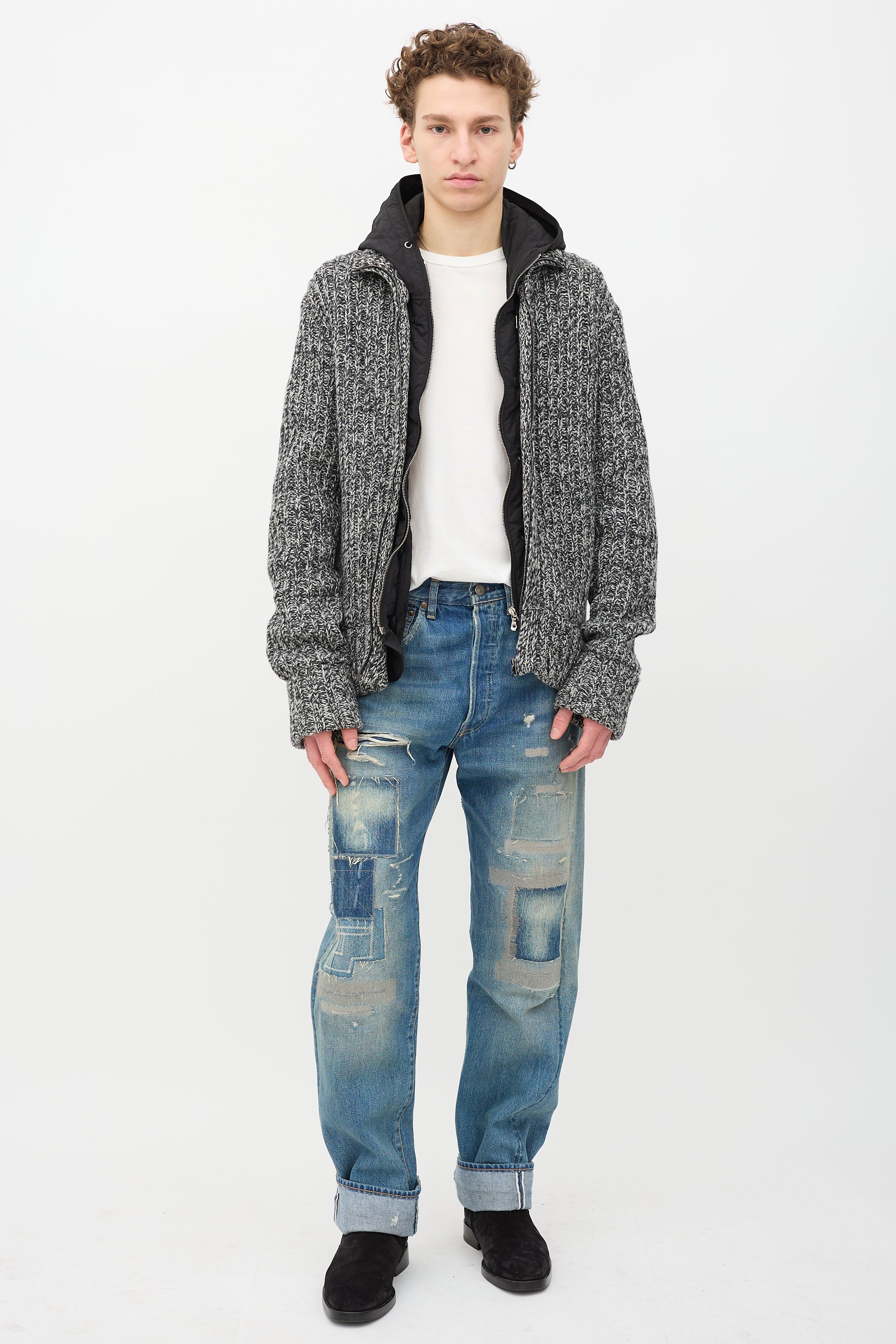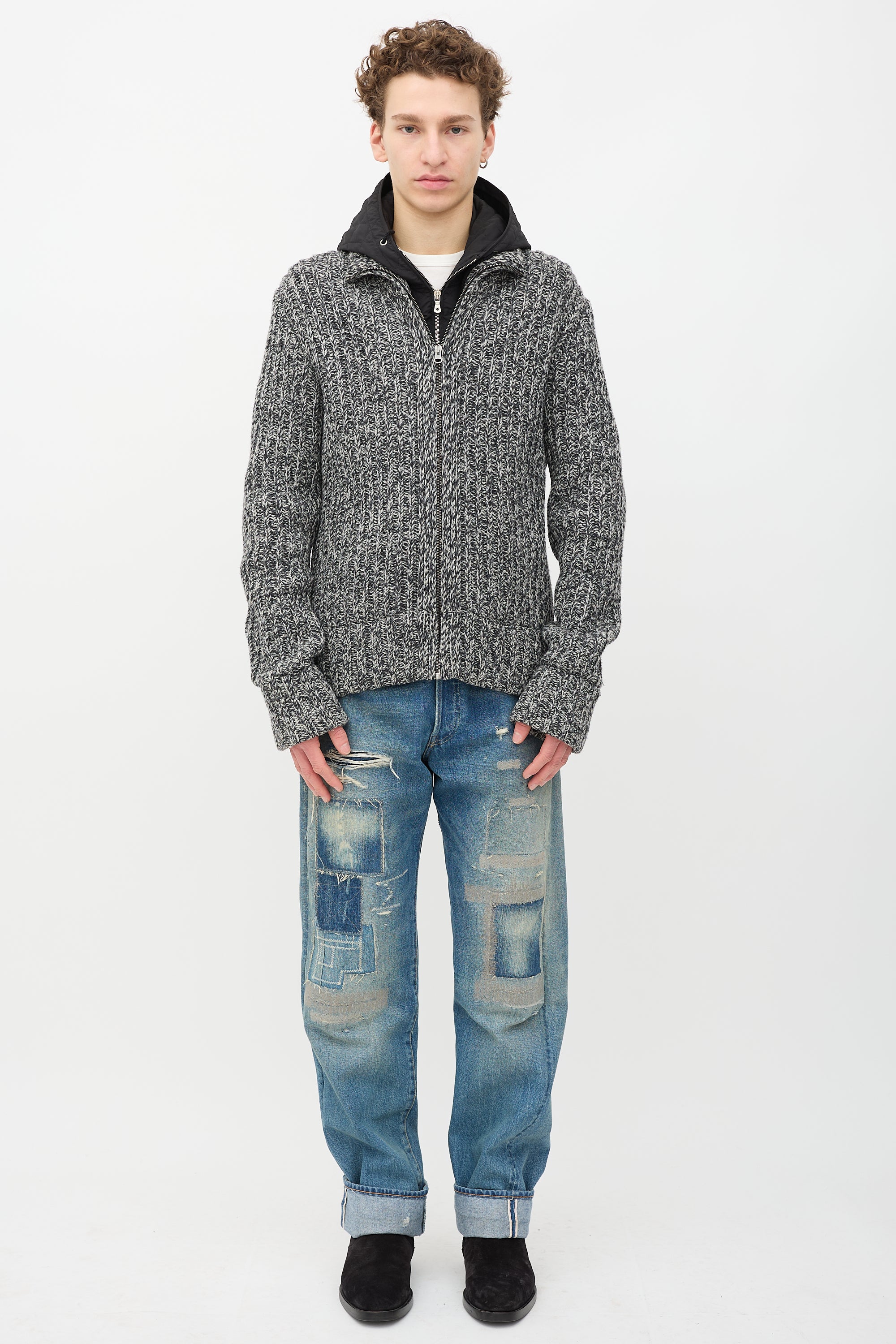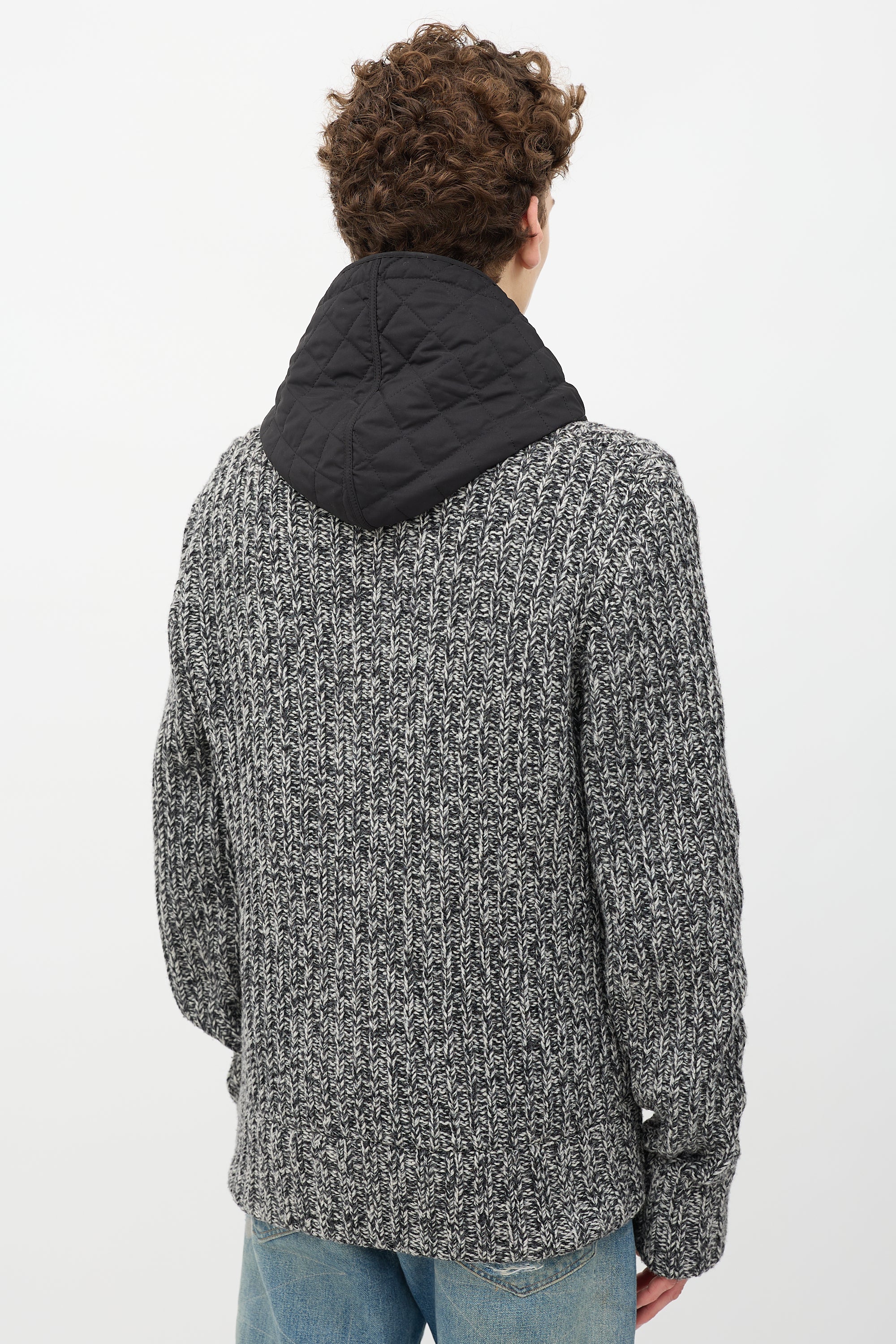 Pre-owned Dolce & Gabbana grey and white marled knit 2-in-1 jacket featuring stand collar, zip up front, and removable black quilted vest at interior with drawstring hood and front zip closure.