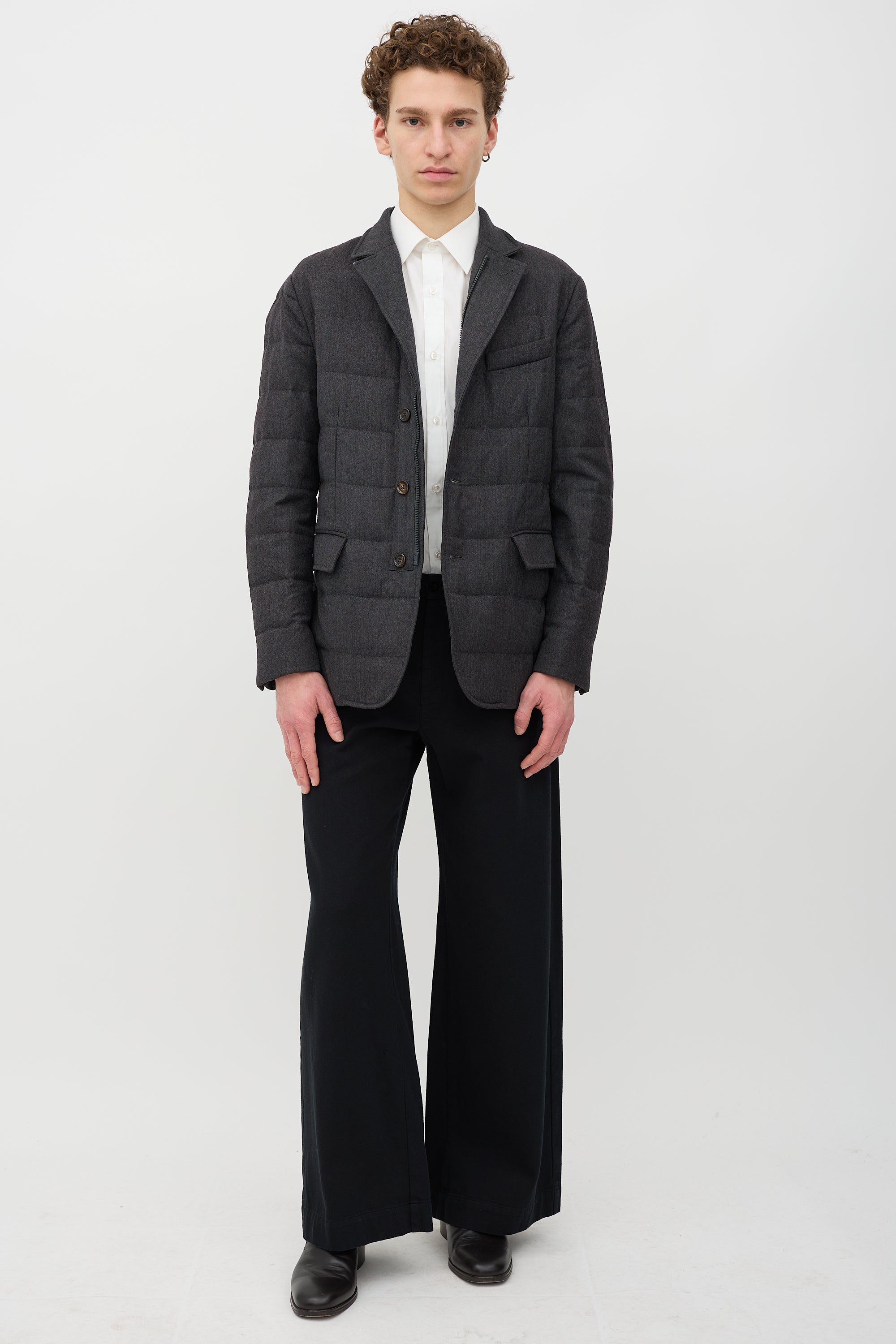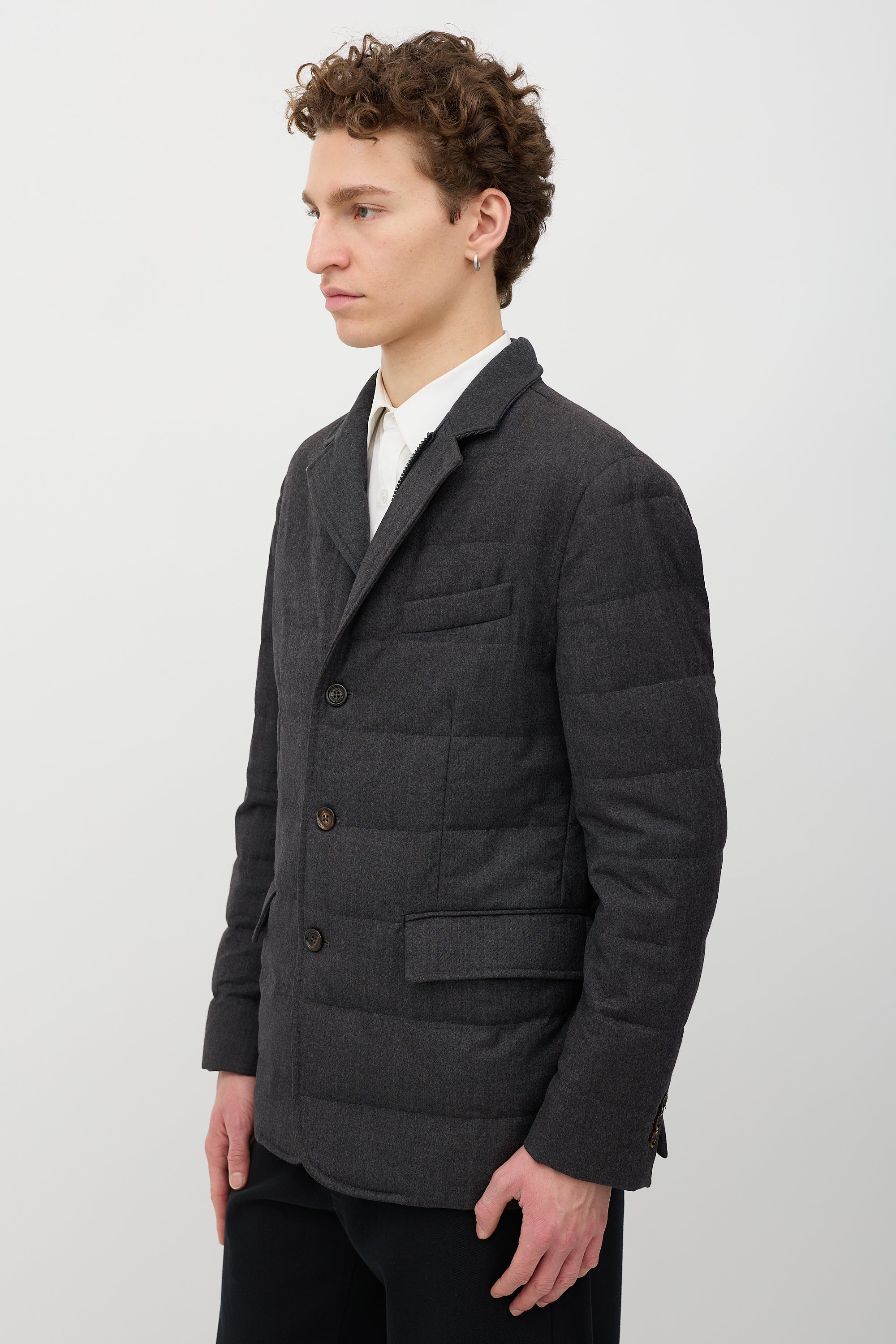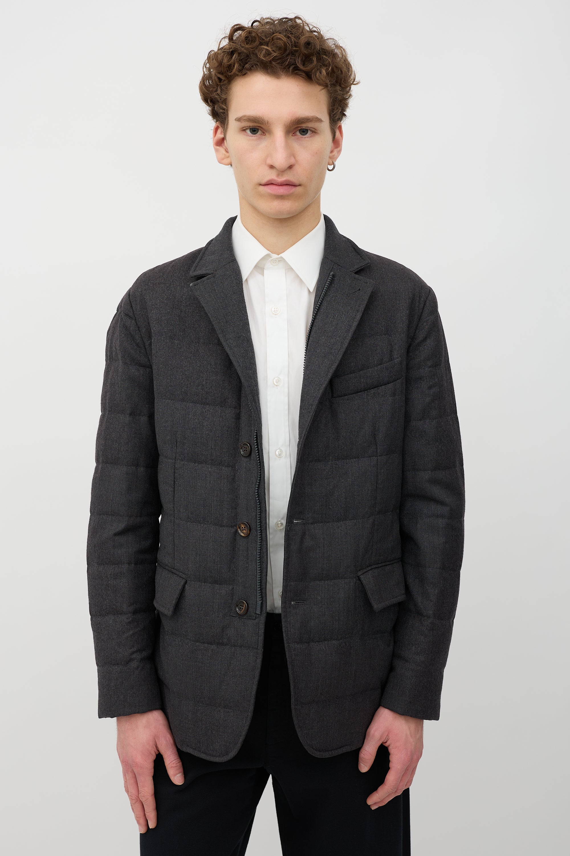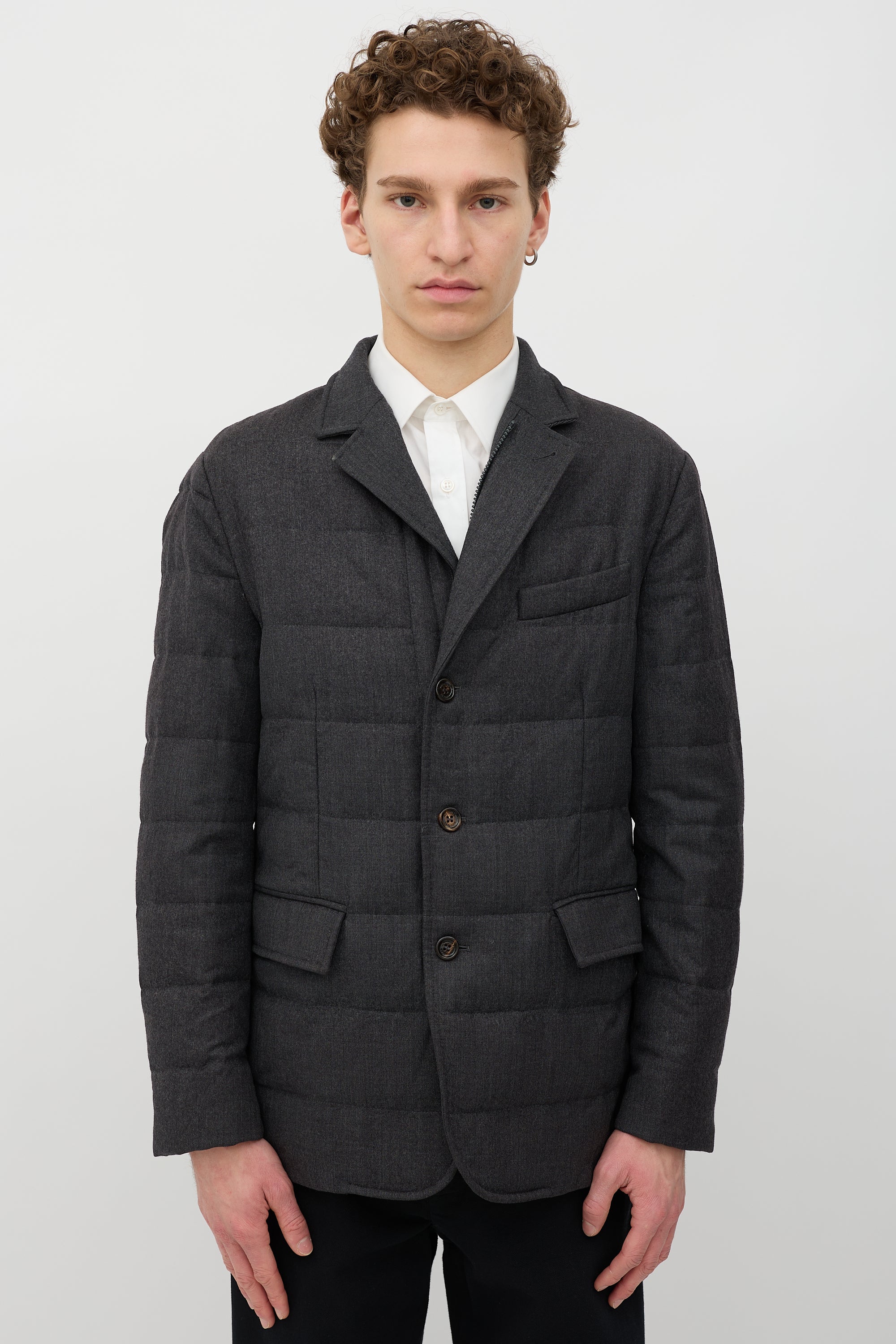 Pre-owned Moncler dark grey down Rodin jacket featuring wool shell, notched lapel, two way zip up front, button placket, three front pockets, one interior pocket, logo tab at left side seam, snap buttoned back double vent, and buttoned cuffs. Padded and lined.