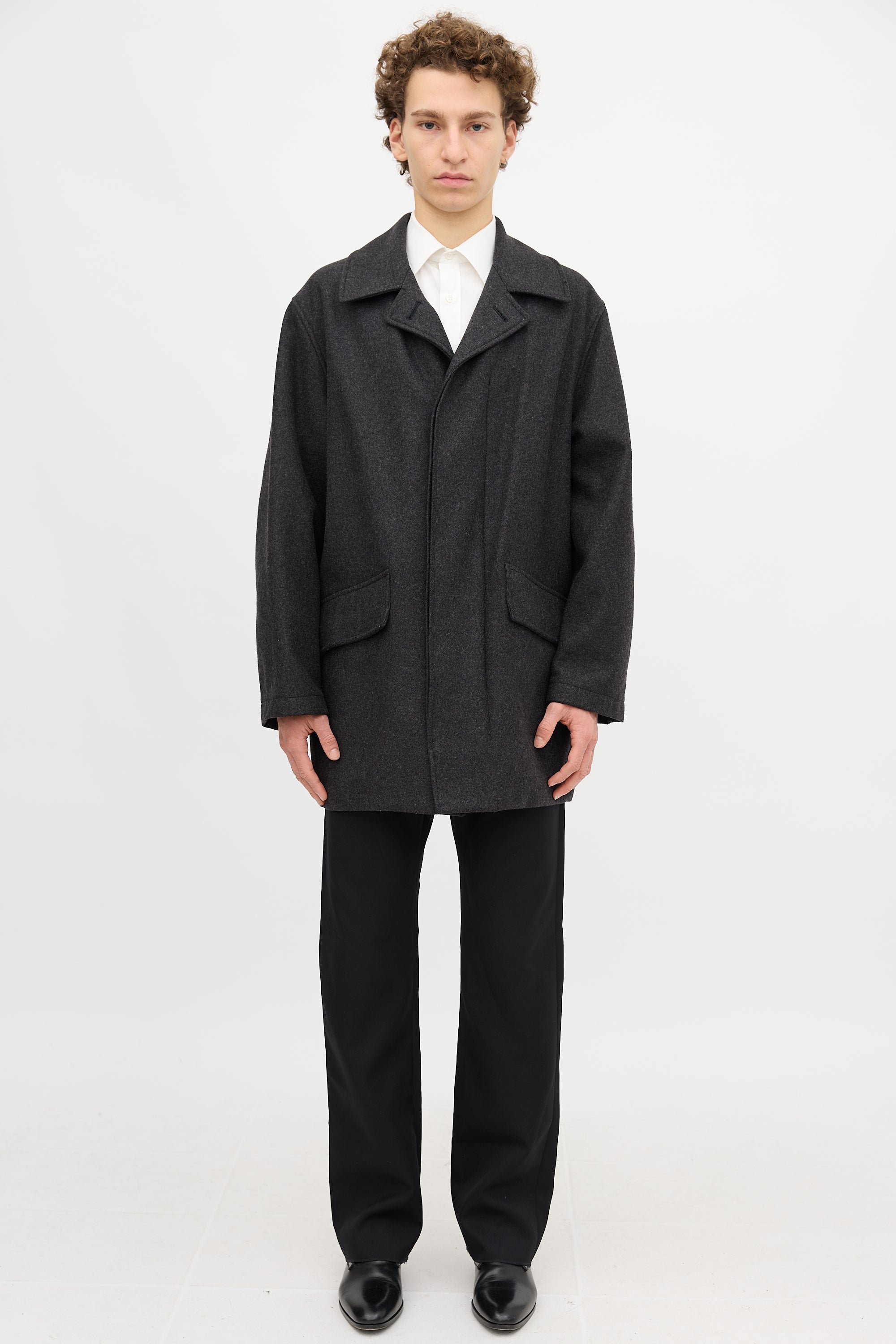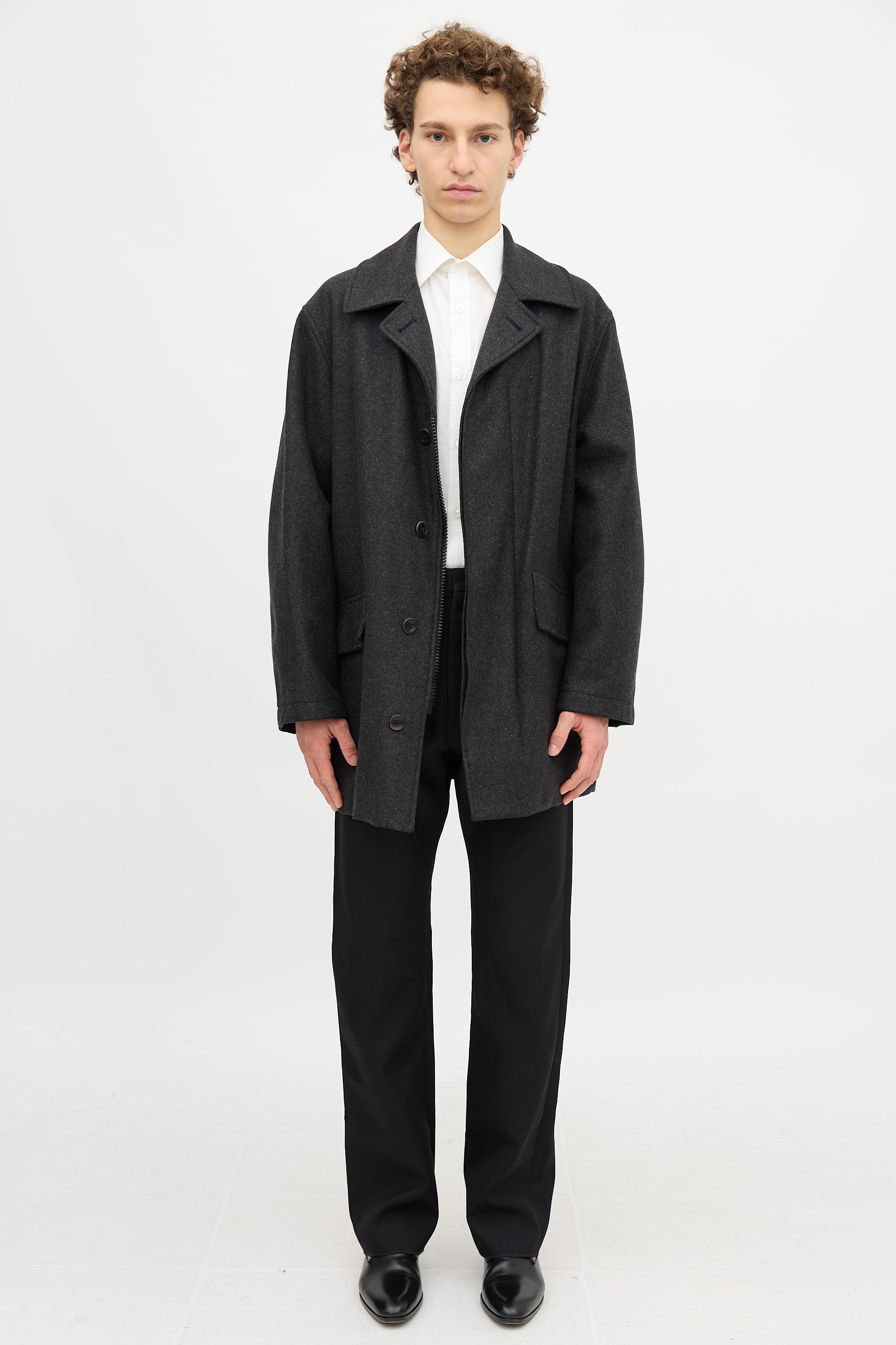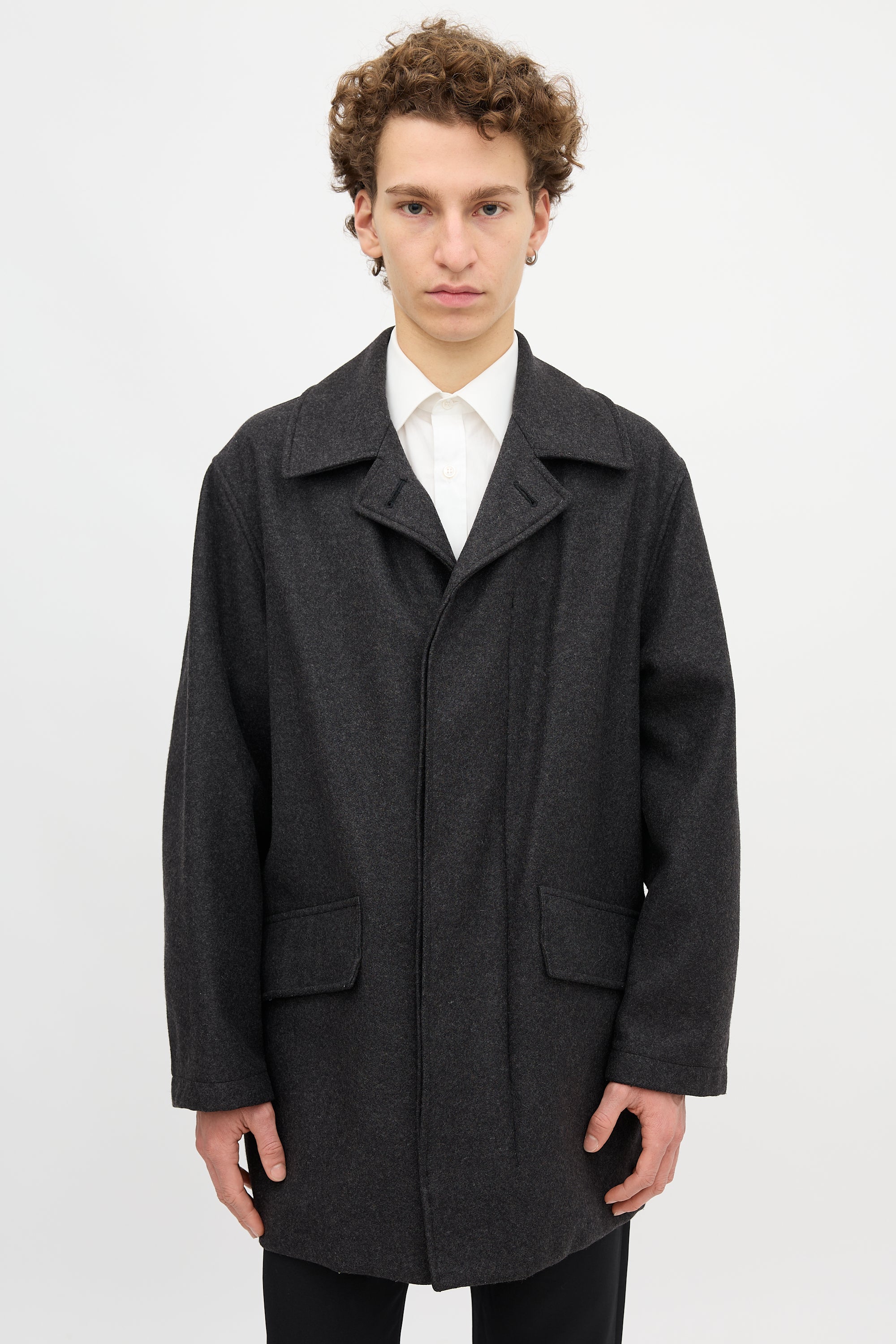 Pre-owned C.P. Company dark grey wool blend coat featuring wide collar and lapel, zip up front, concealed button up placket, and two front flap pockets.