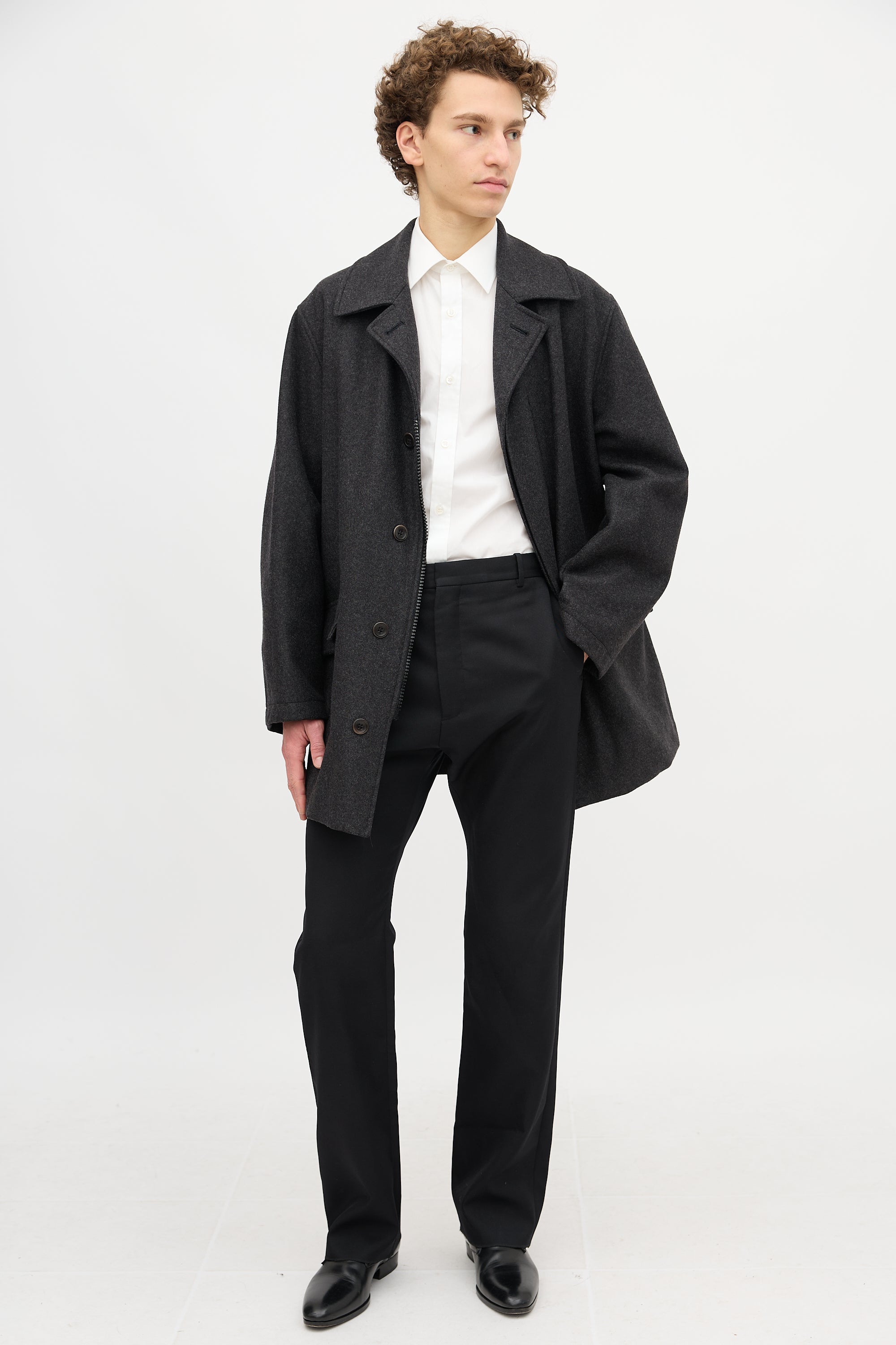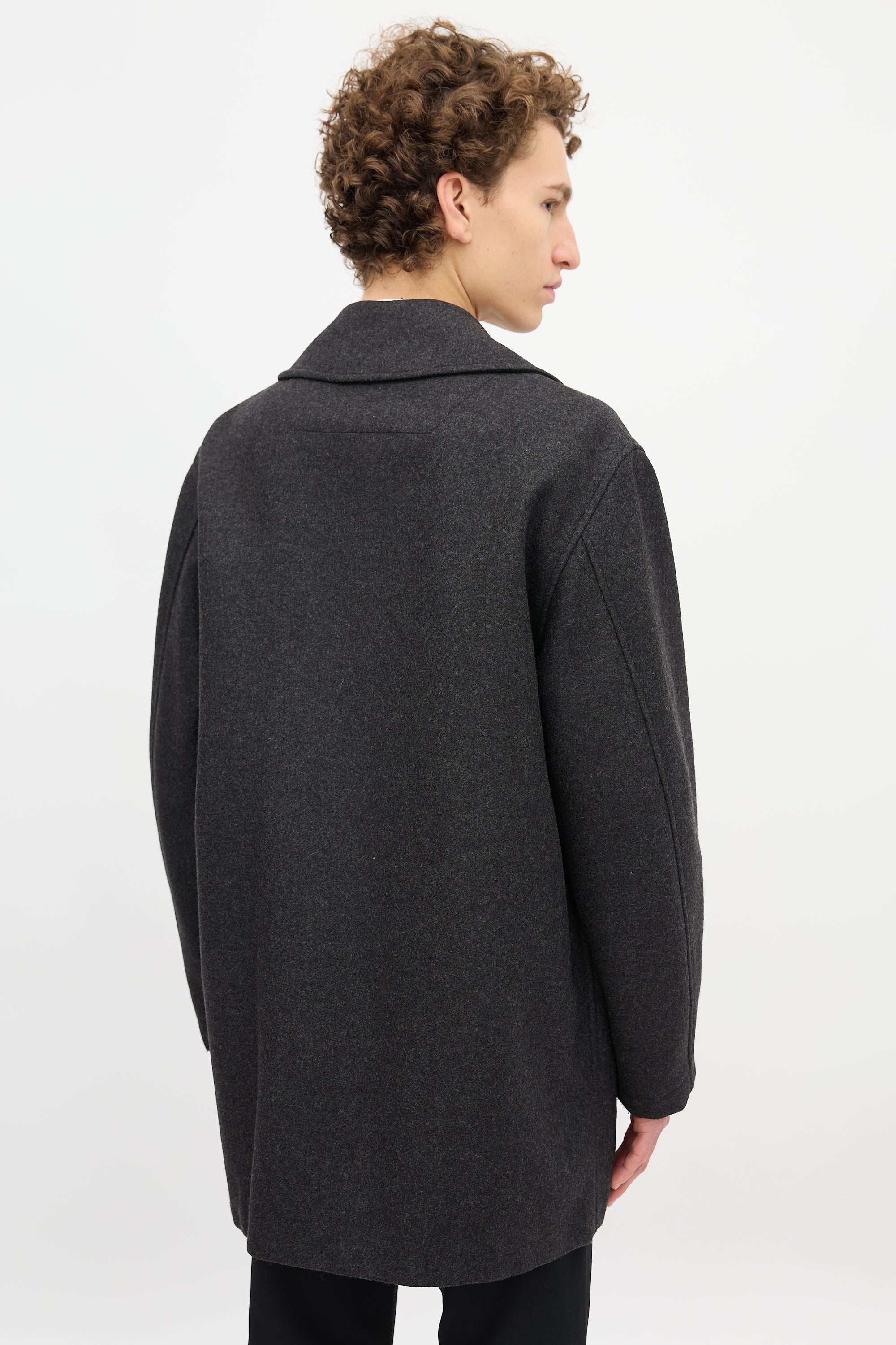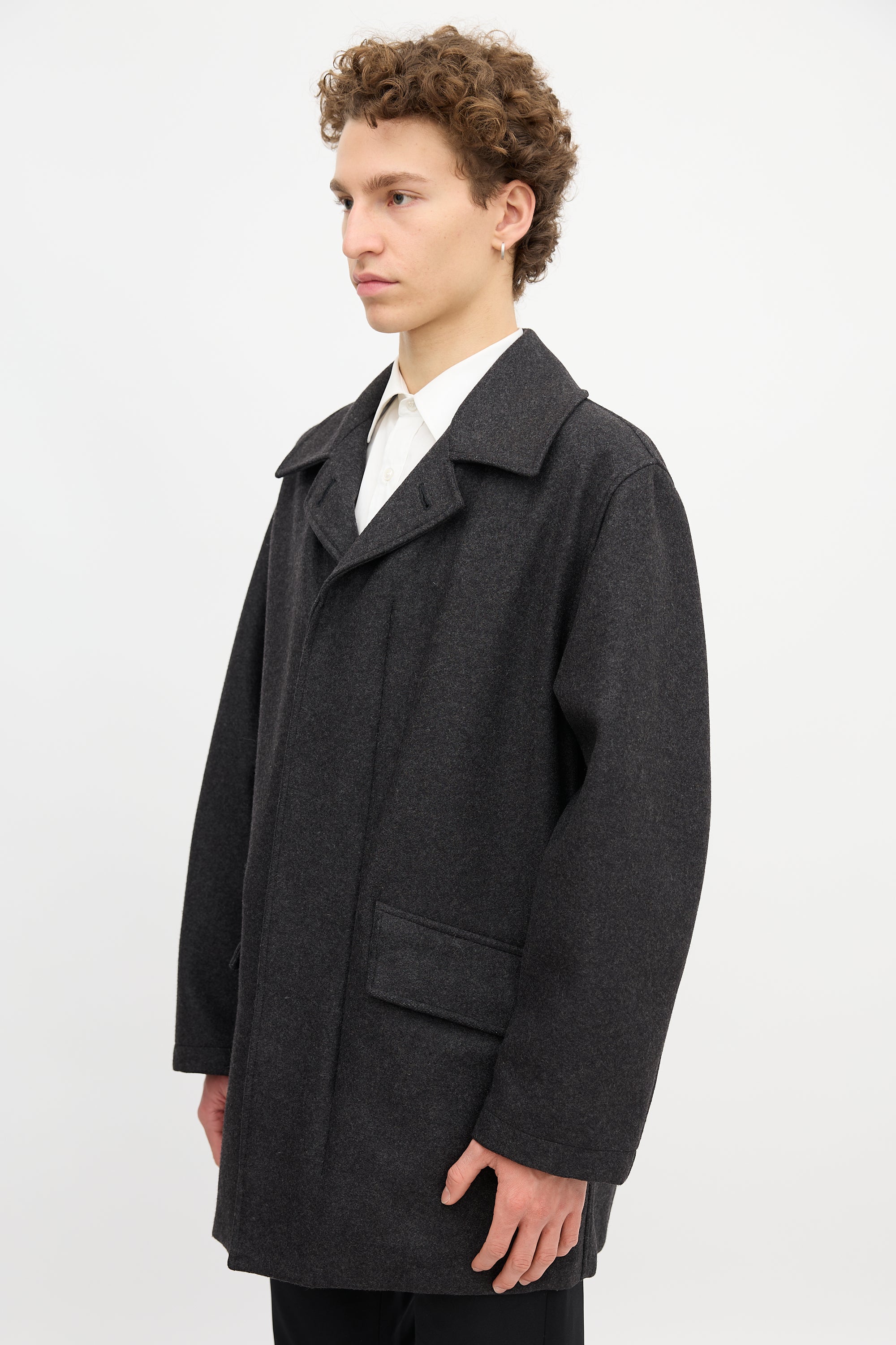 Pre-owned C.P. Company dark grey wool blend coat featuring wide collar and lapel, zip up front, concealed button up placket, and two front flap pockets.