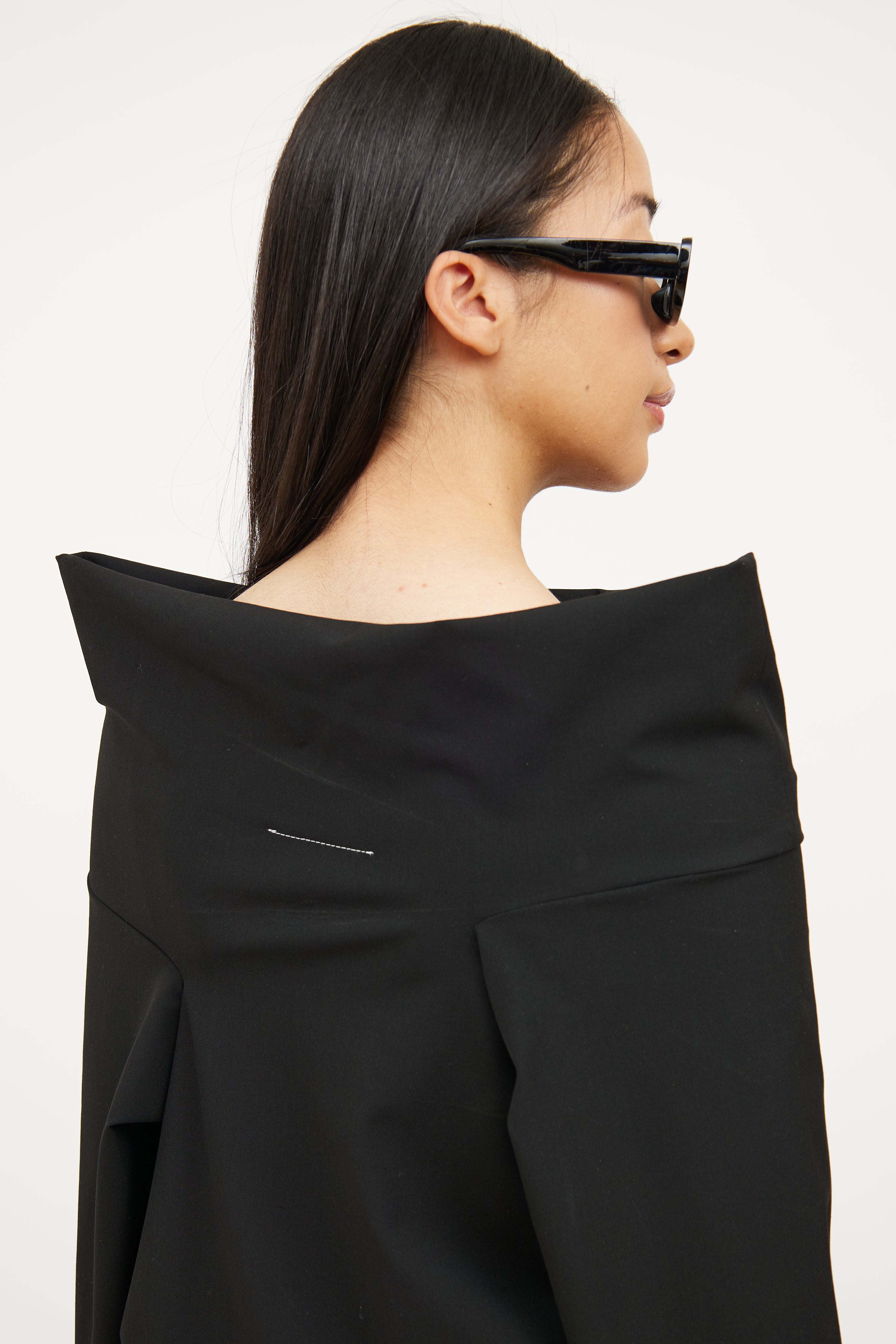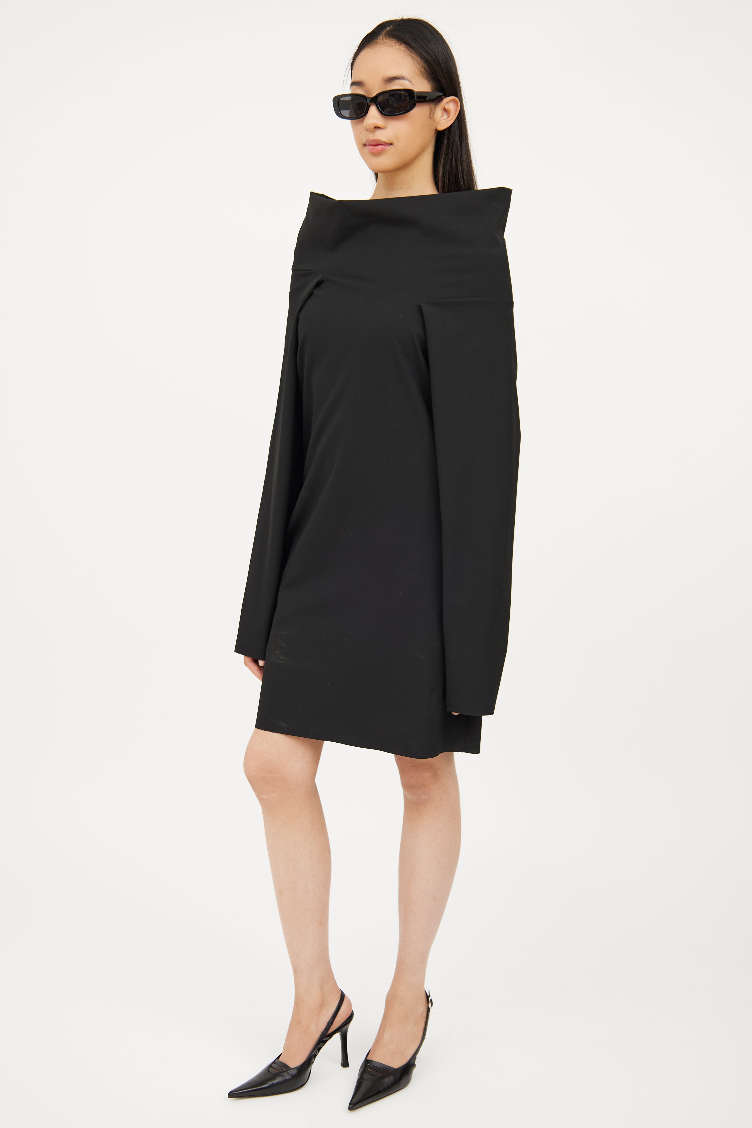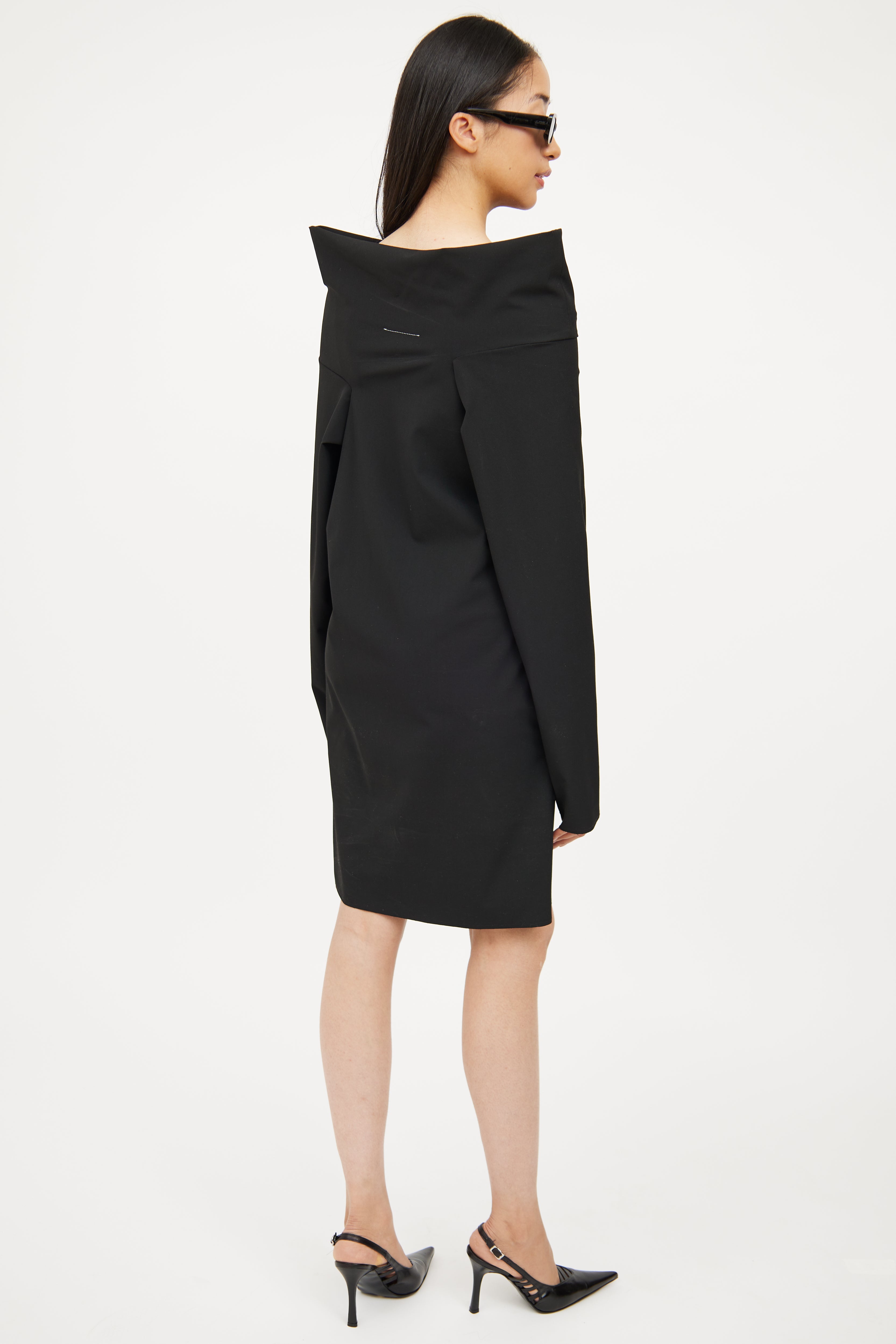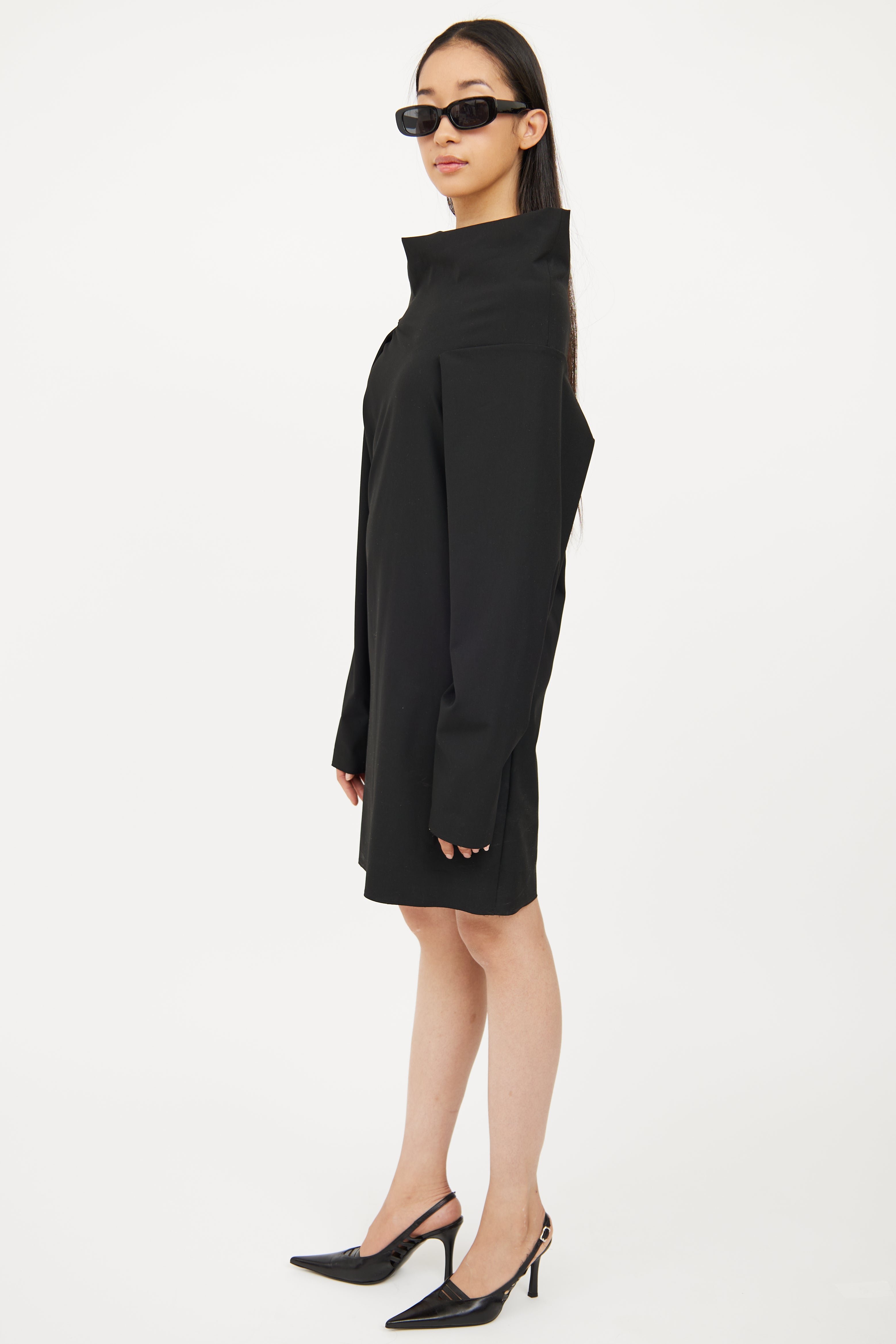 Pre-owned MM6 Maison Margiela black long sleeve dress featuring high pointed neck, raw edge hem and white exposed stitch on back of neck.