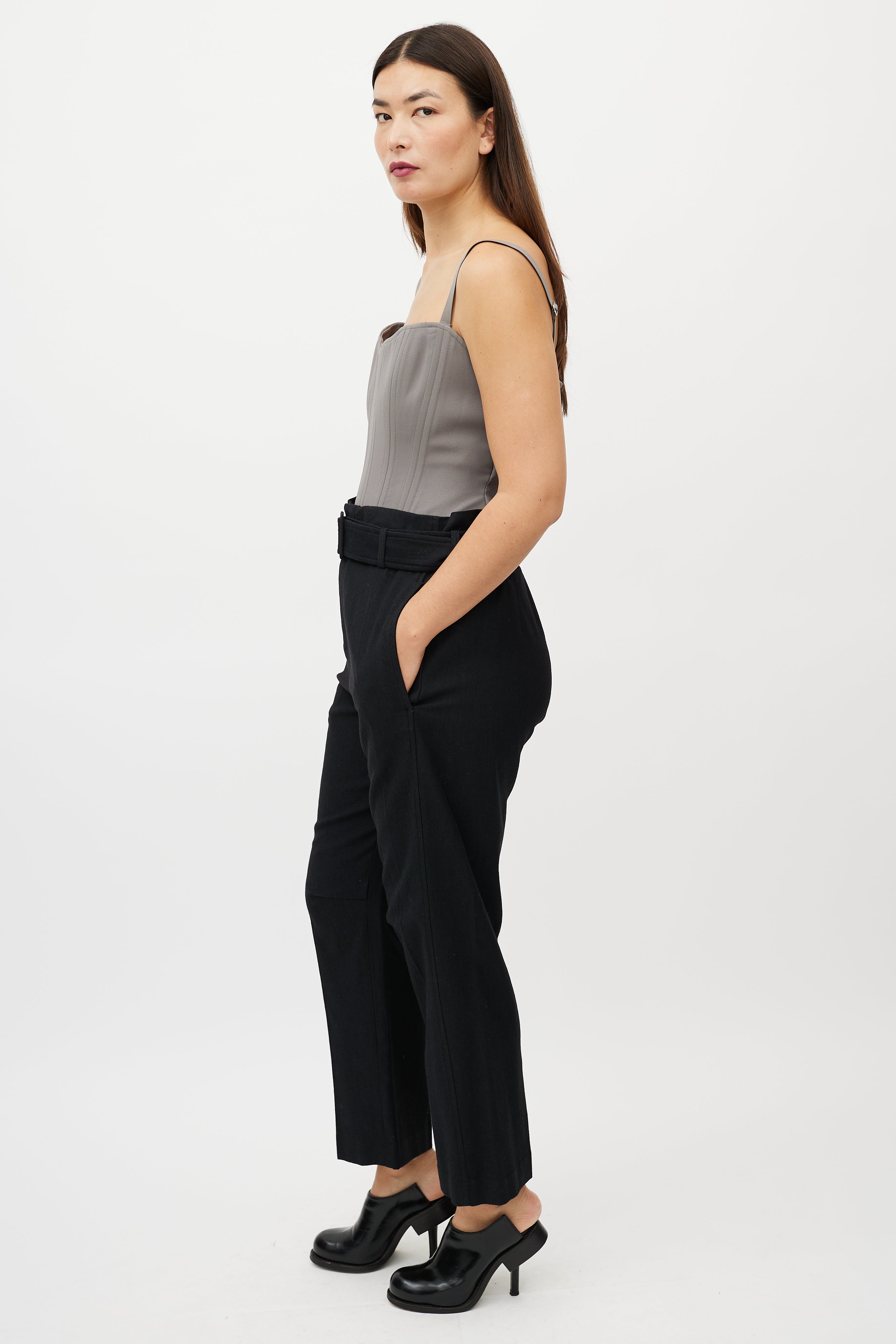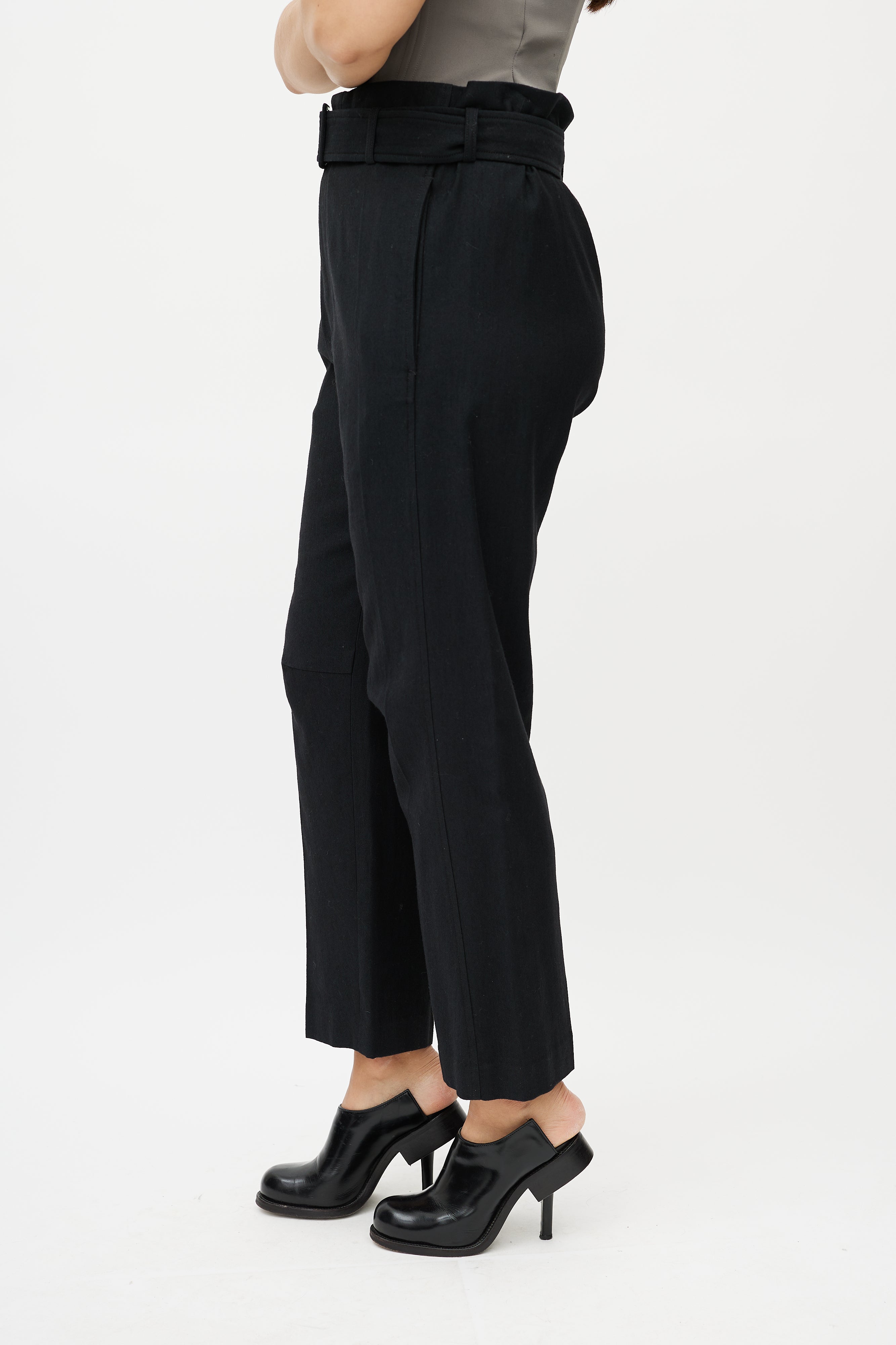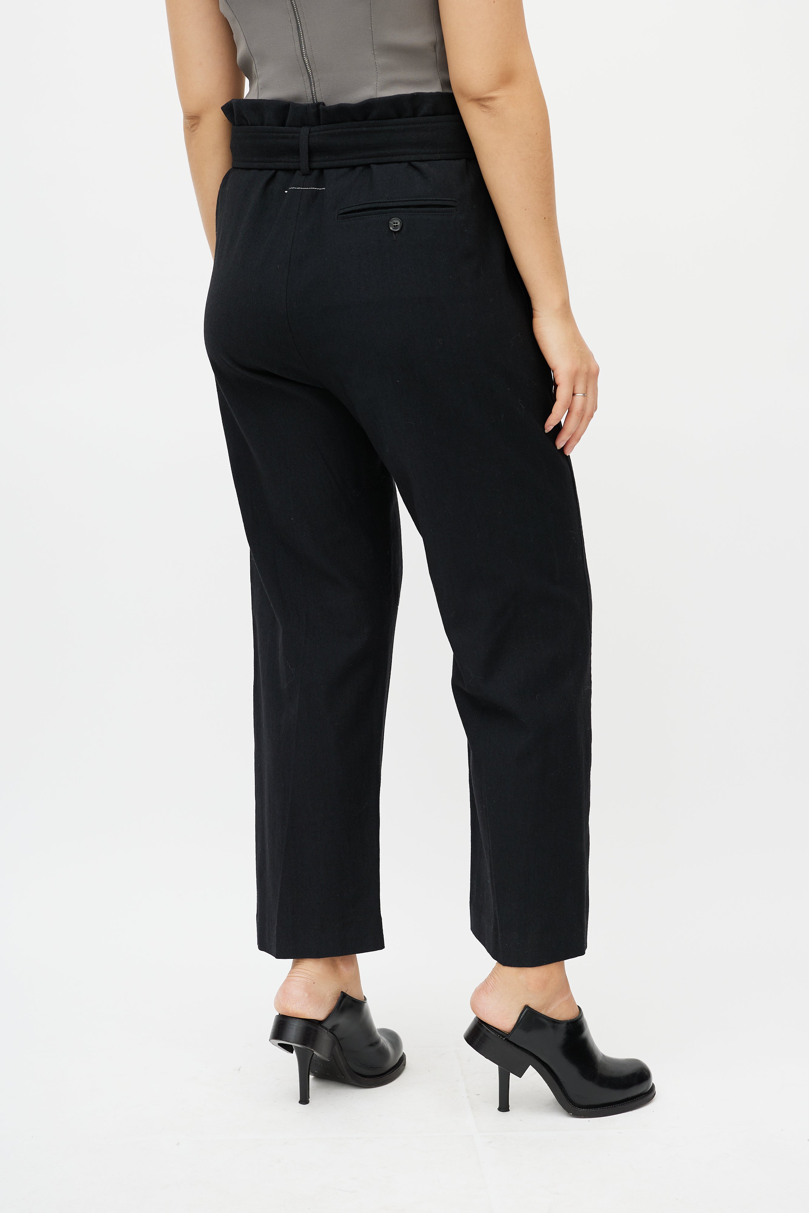 Pre-owned MM6 Maison Margiela black wool trousers featuring an adjustable belted waist, two slip pockets at hip, one welt pocket at back, wide leg, and zip fly with button closure.
