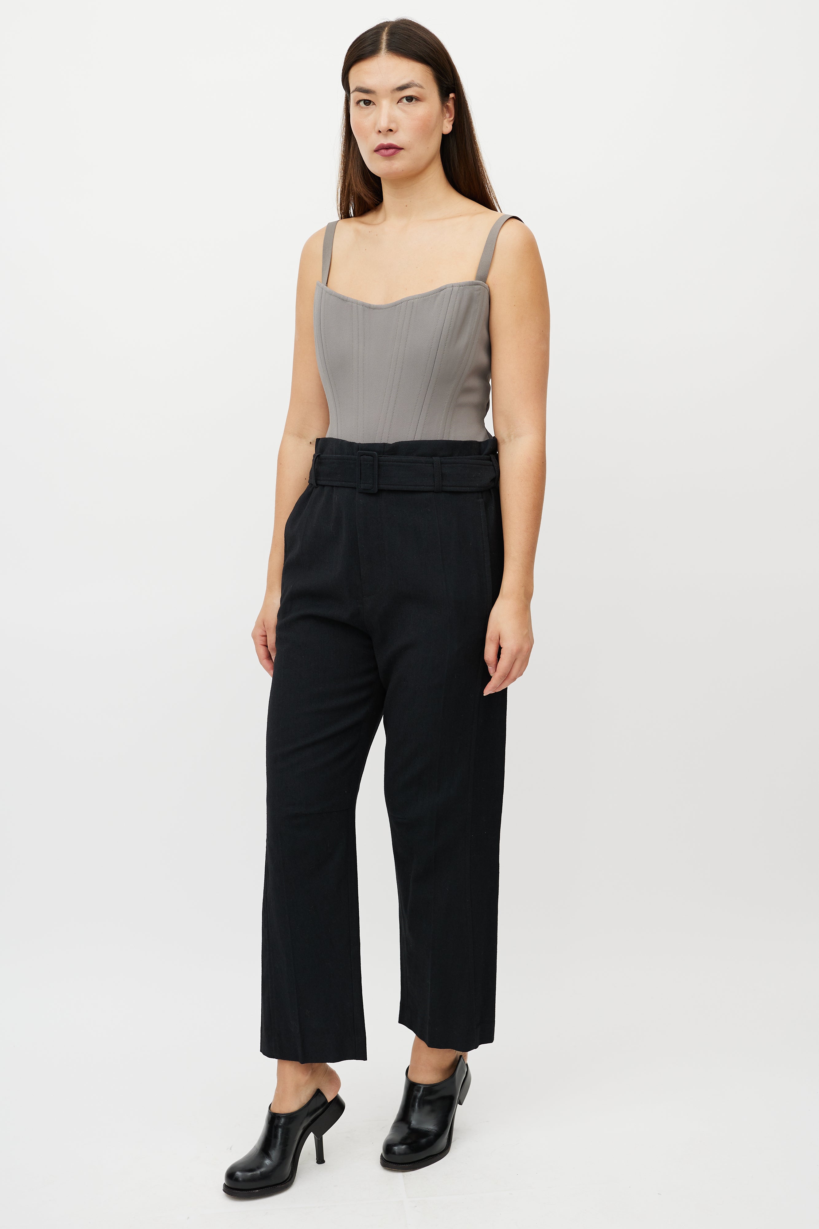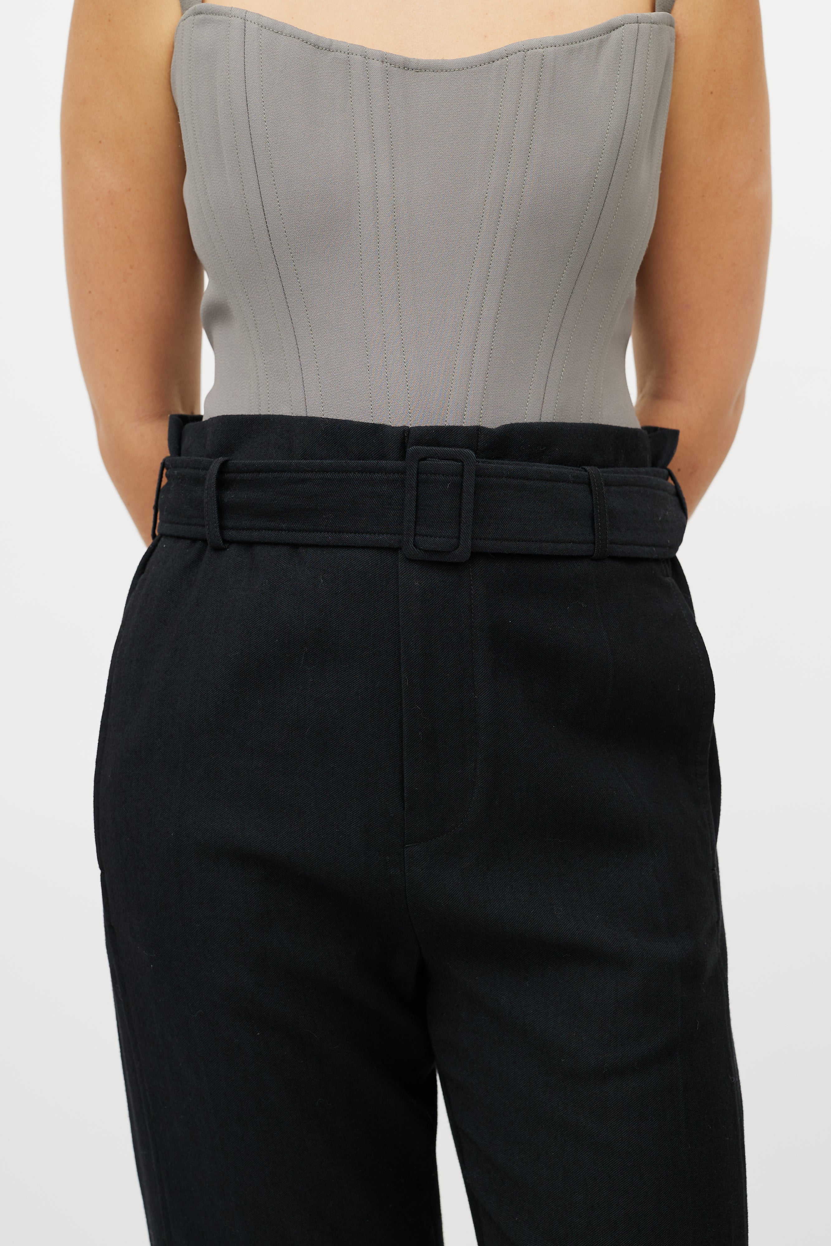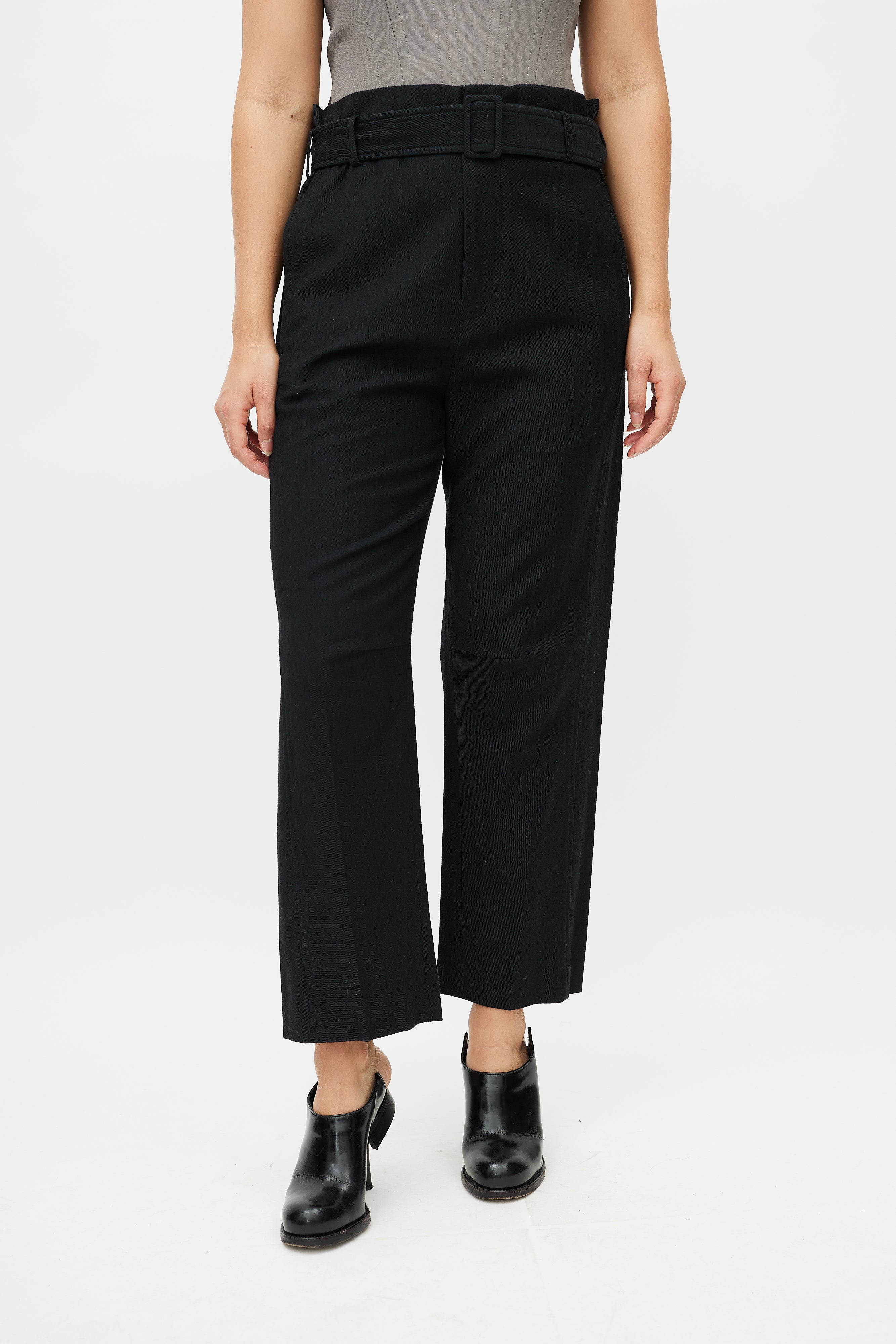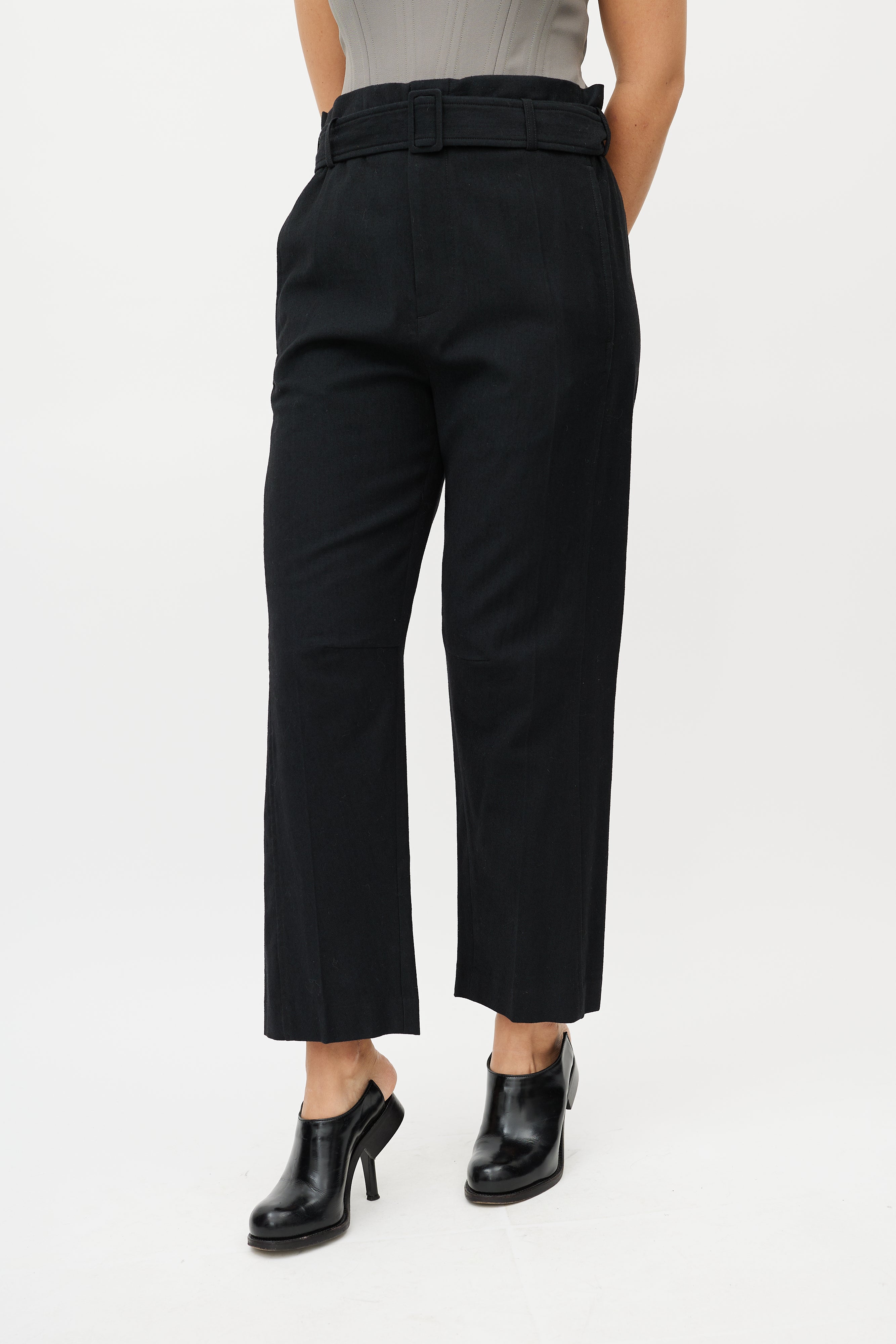 Pre-owned MM6 Maison Margiela black wool trousers featuring an adjustable belted waist, two slip pockets at hip, one welt pocket at back, wide leg, and zip fly with button closure.