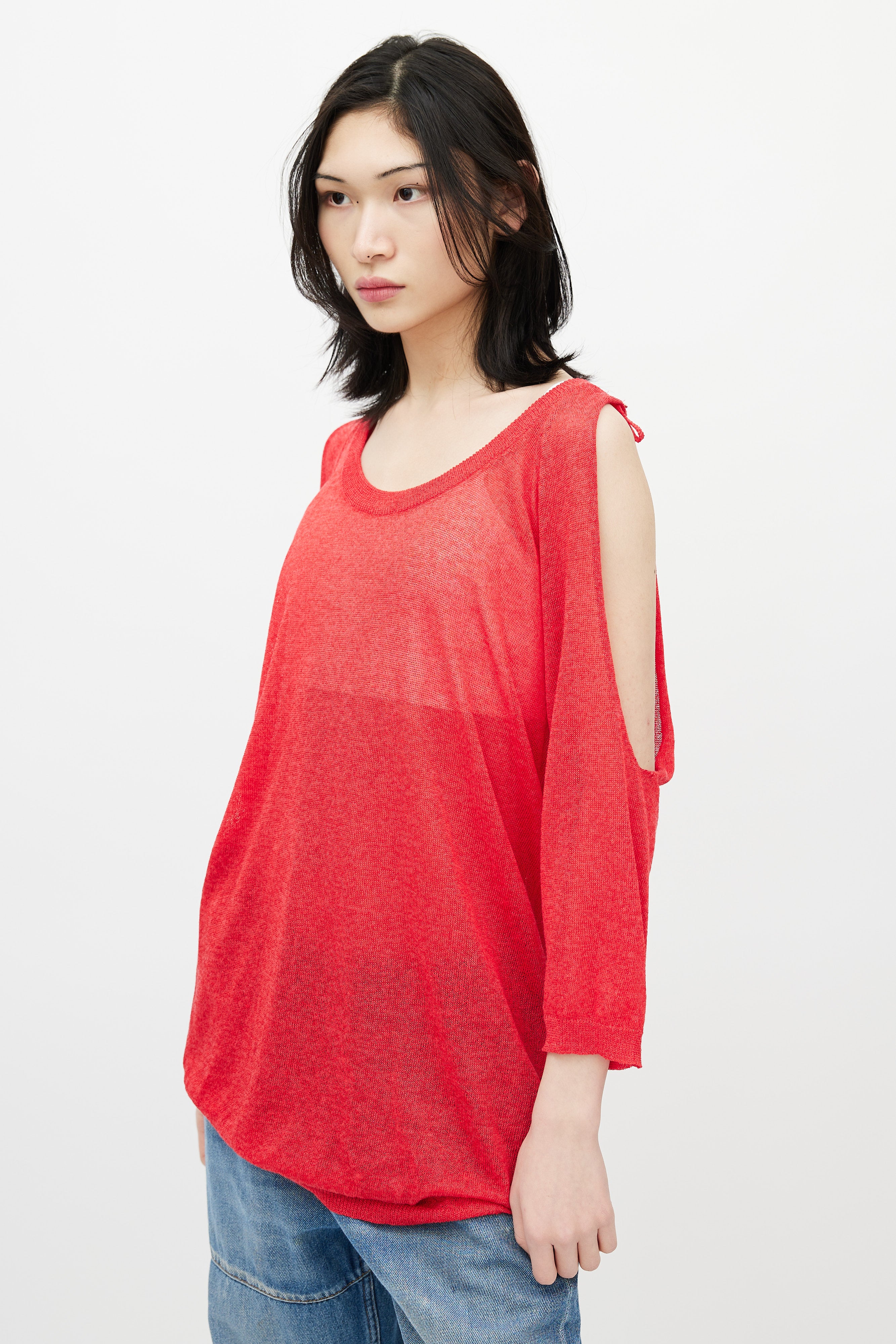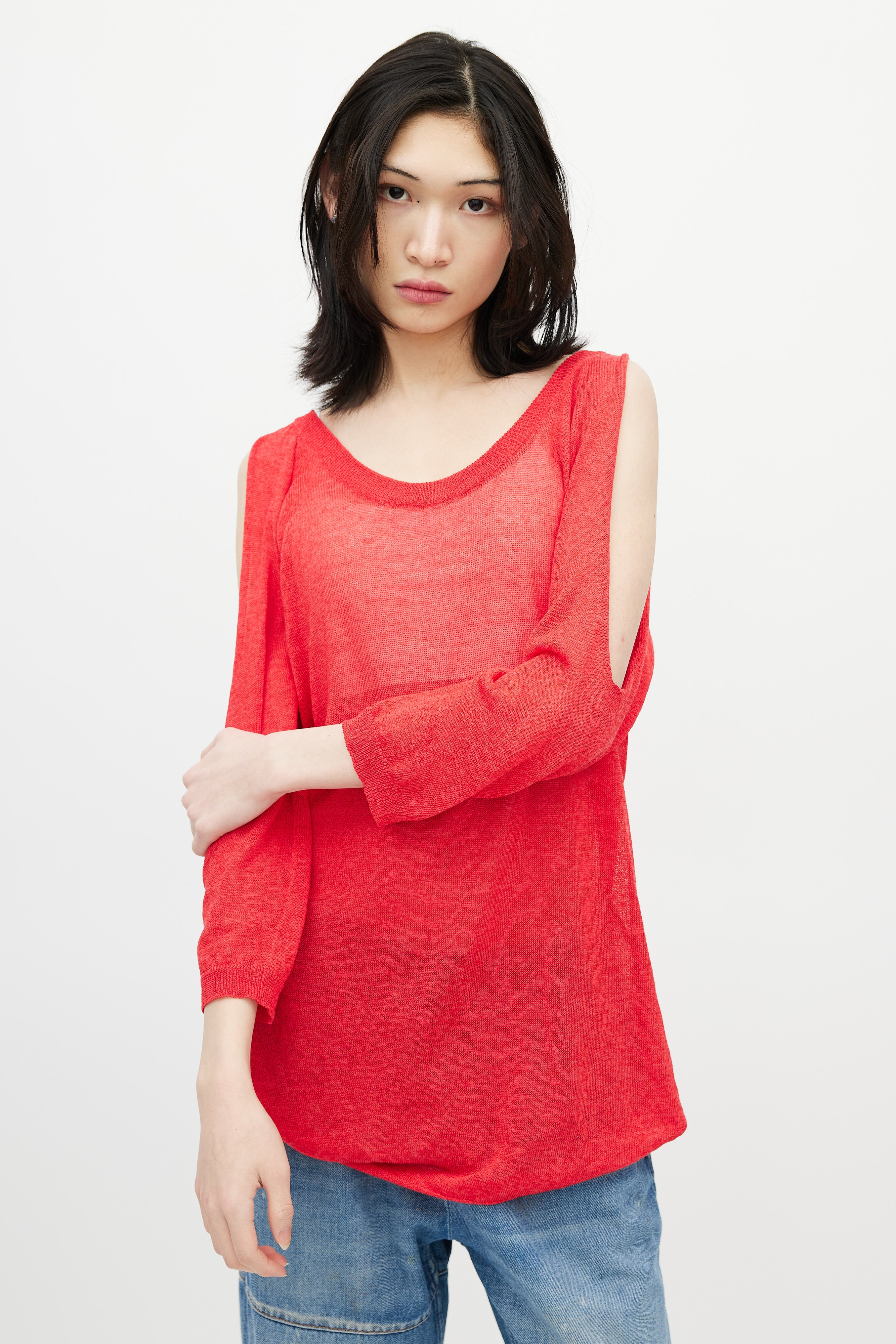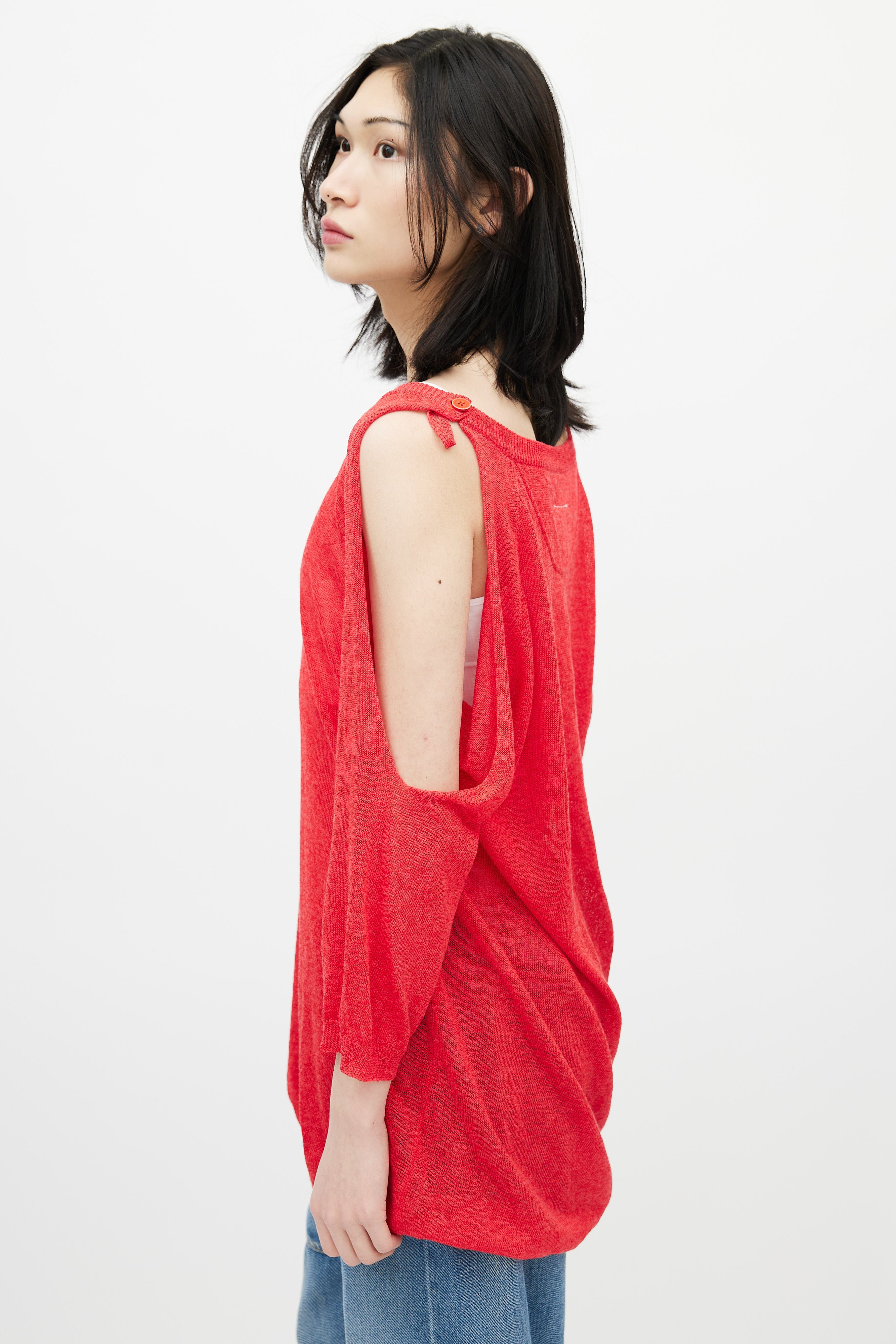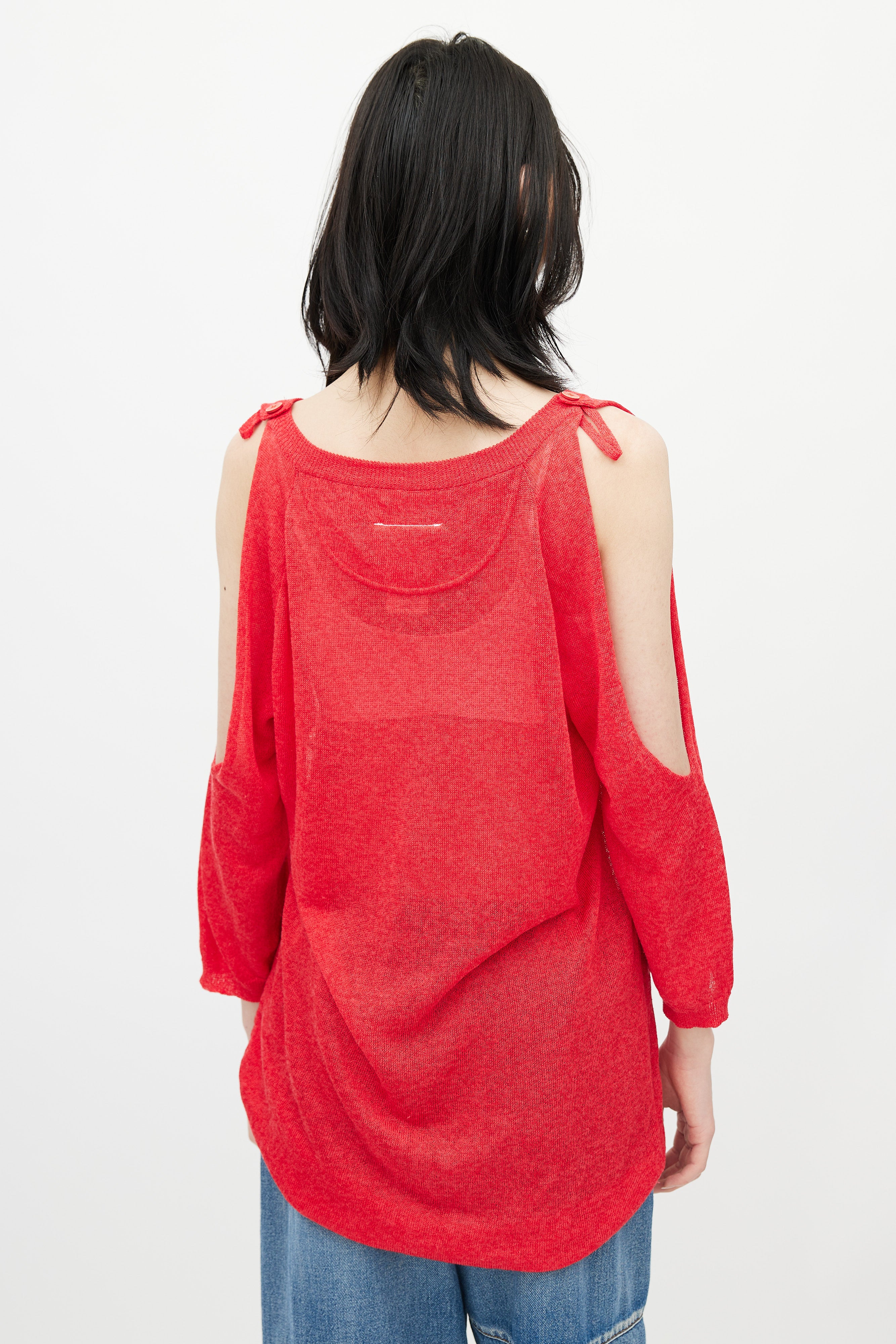 Pre-owned MM6 Maison Margiela red sweater featuring a scoop neckline, long sleeves, off the shoulder styling with cut out details, and ribbed hem.