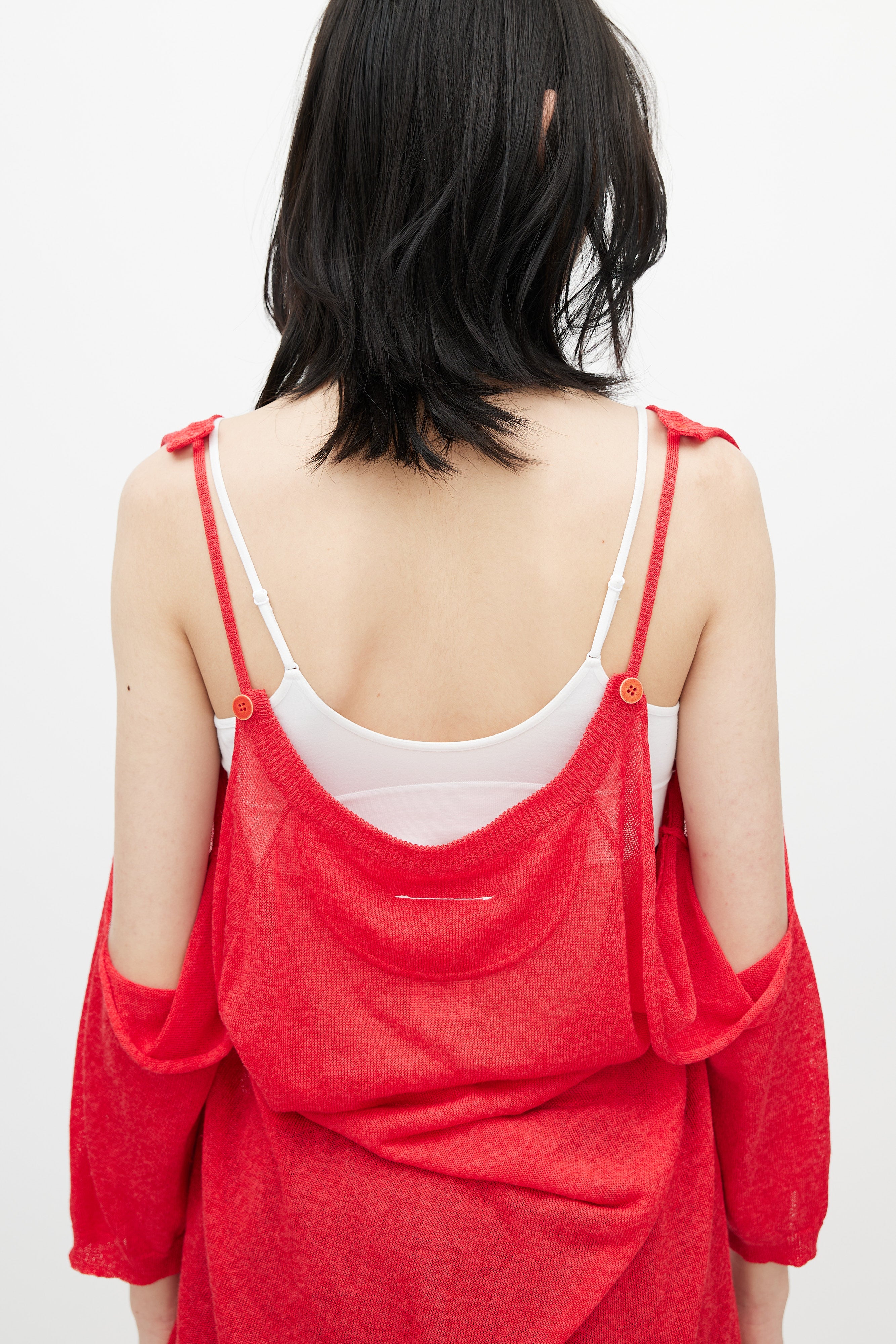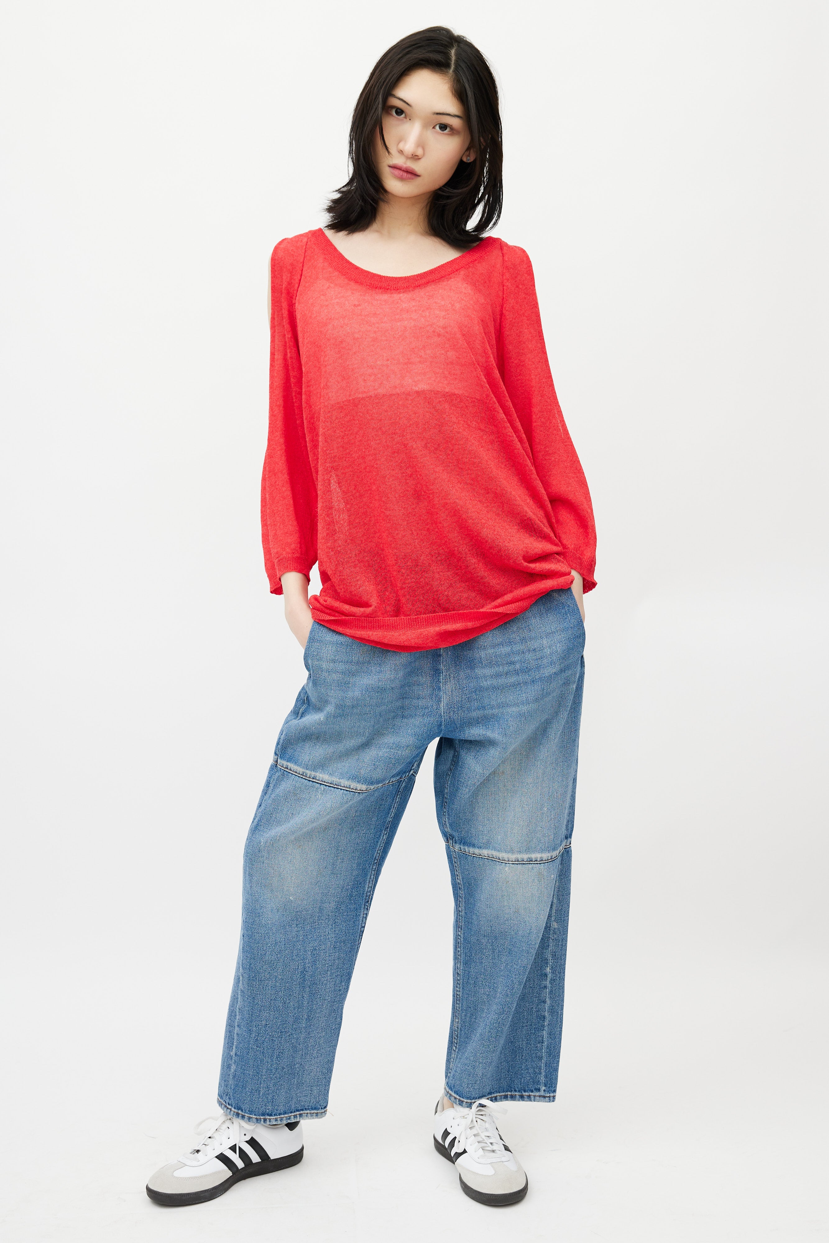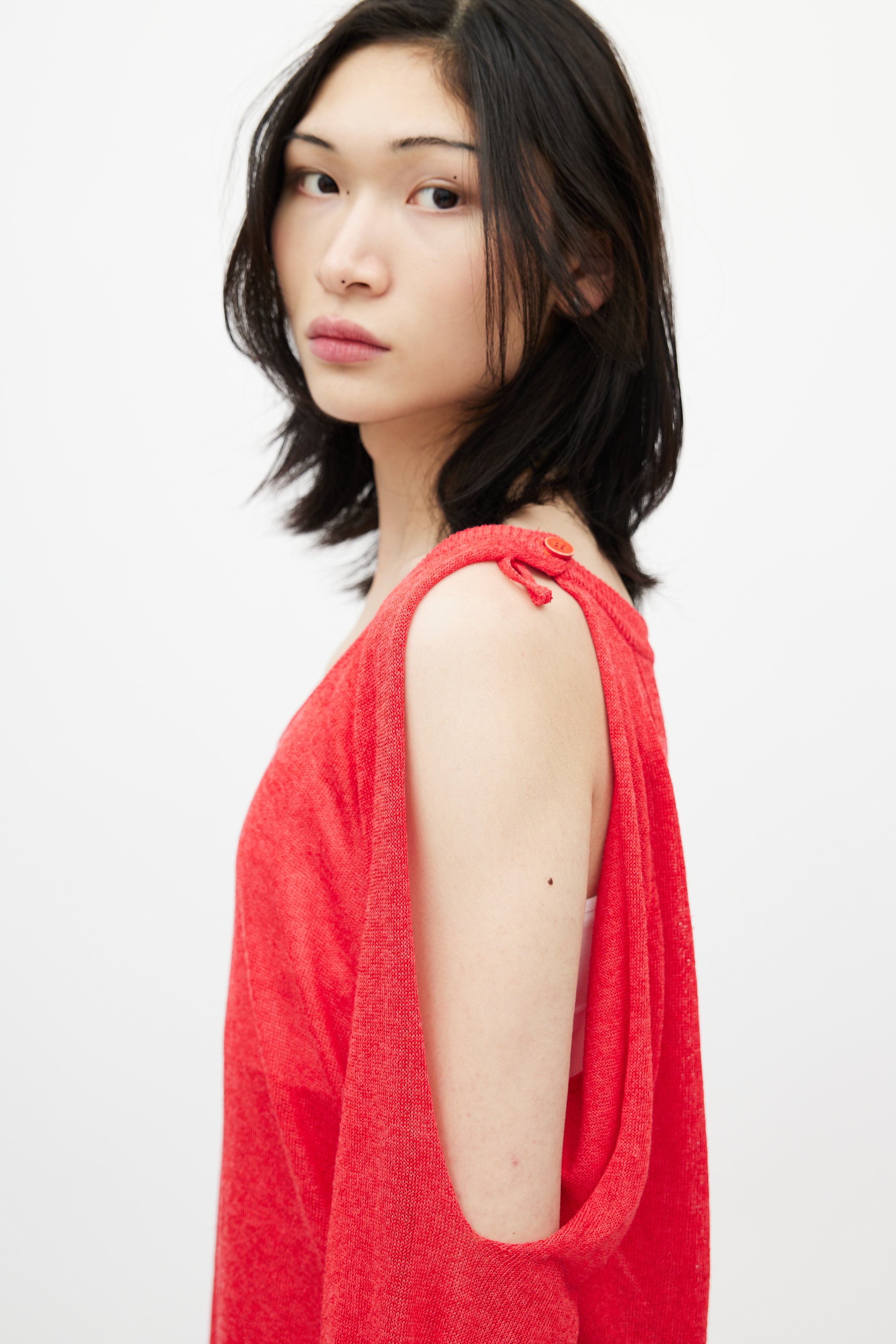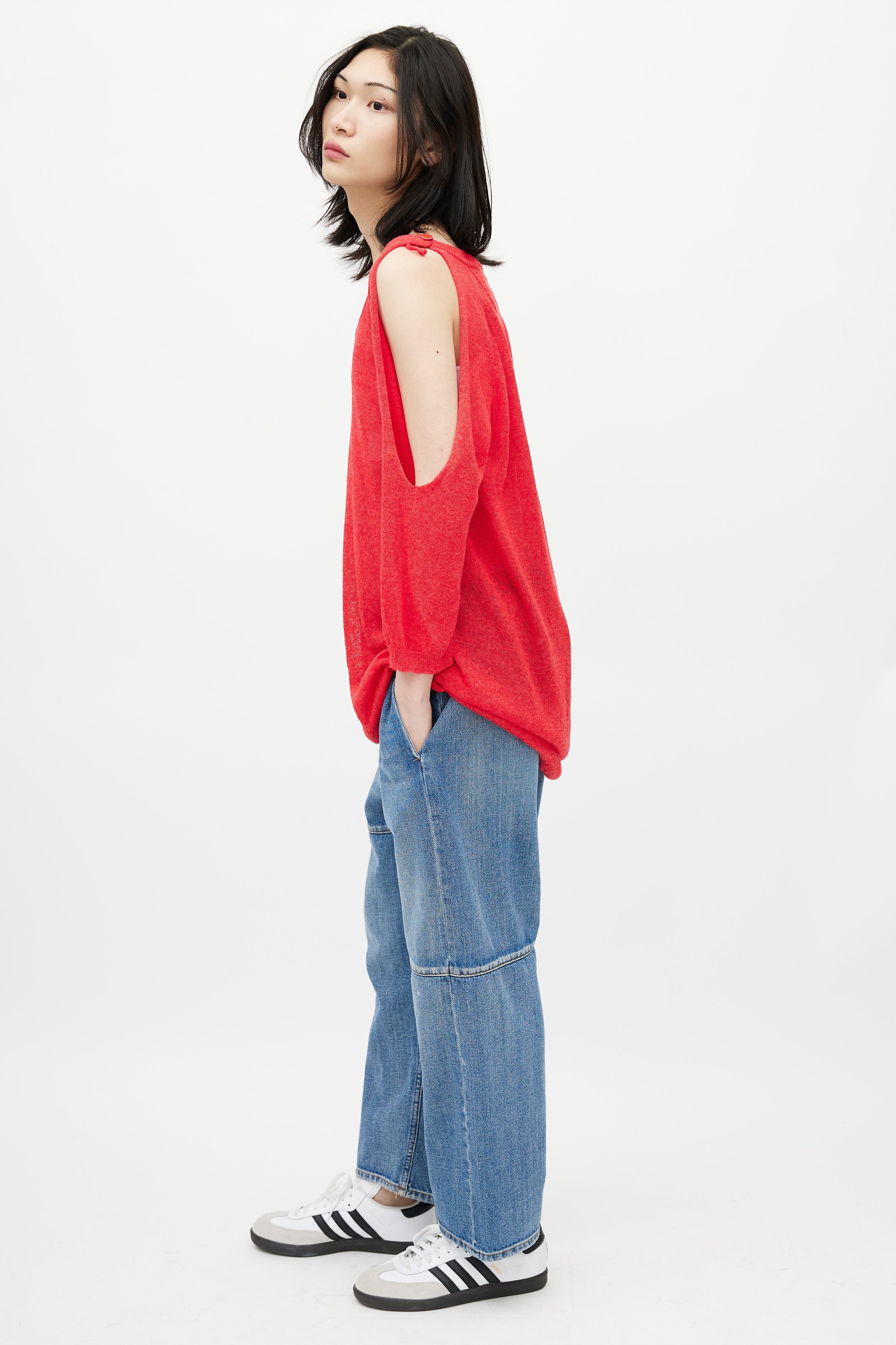 Pre-owned MM6 Maison Margiela red sweater featuring a scoop neckline, long sleeves, off the shoulder styling with cut out details, and ribbed hem.
