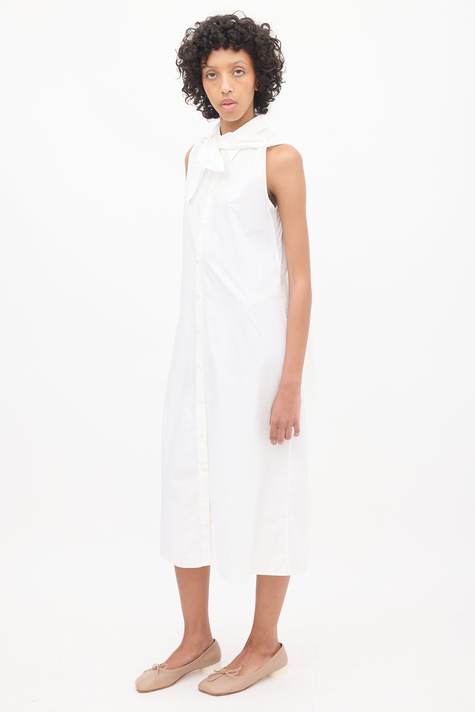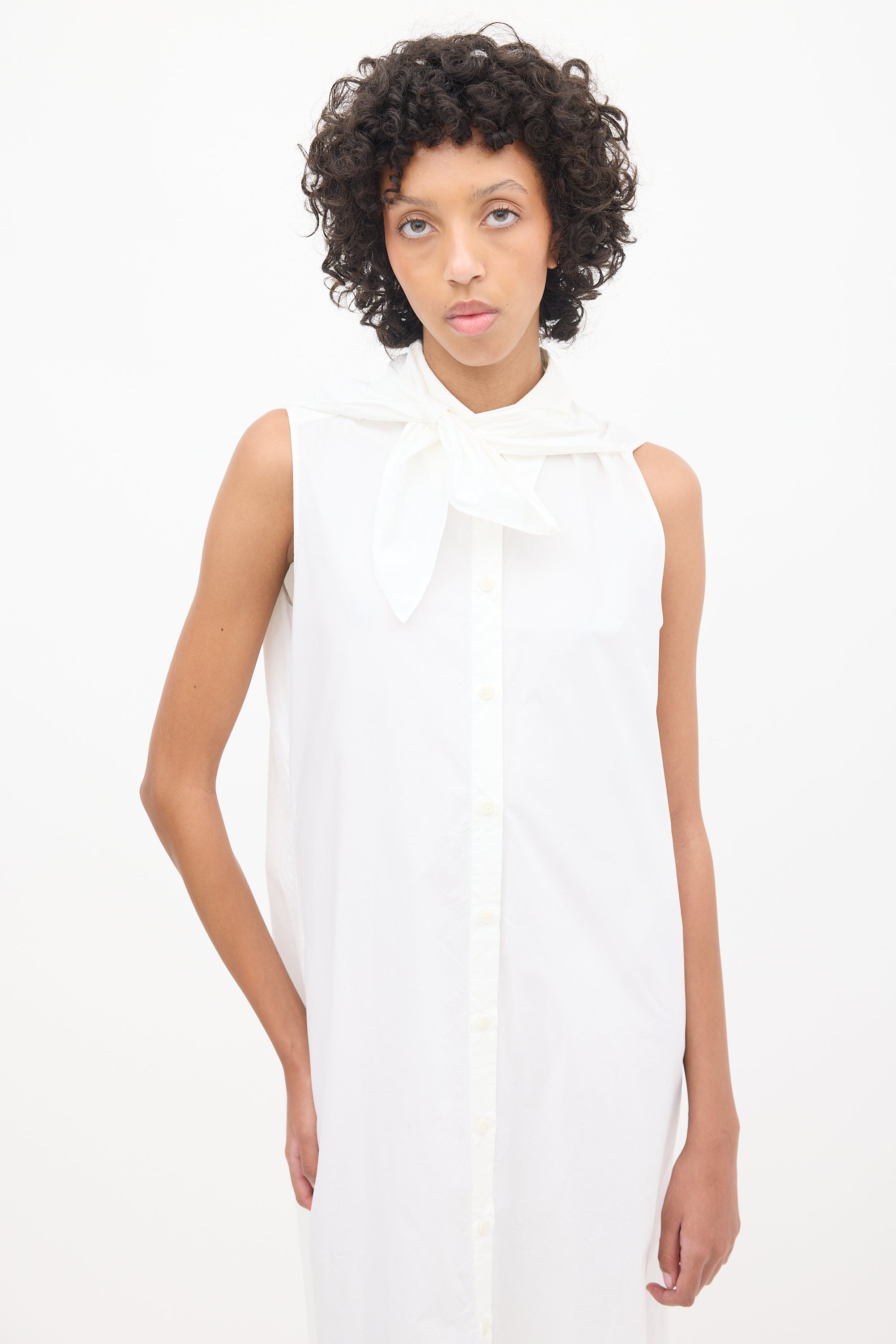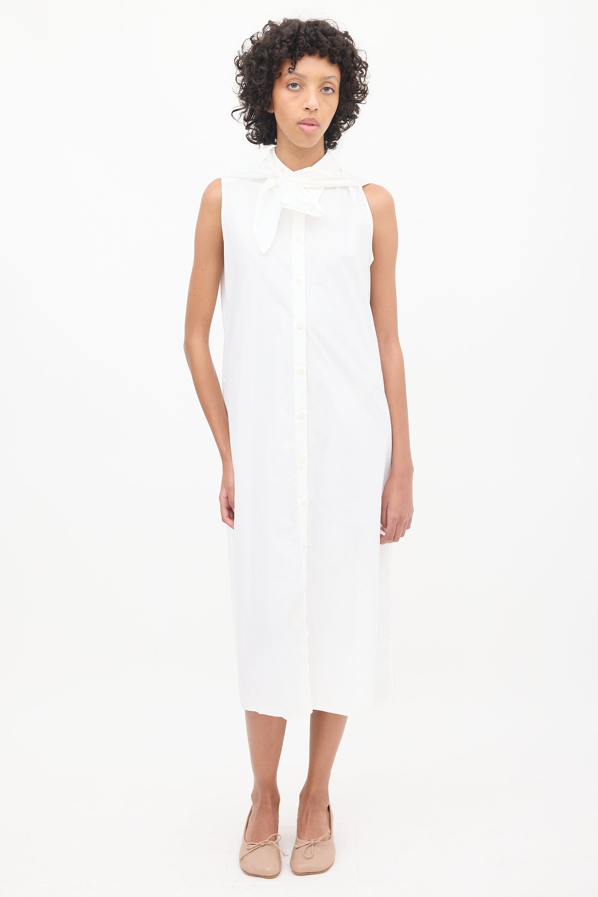 Pre-owned MM6 Maison Margiela white sleeveless midi shirt dress featuring a pointed collar, button up front, even hem, and tie neck layer detail.