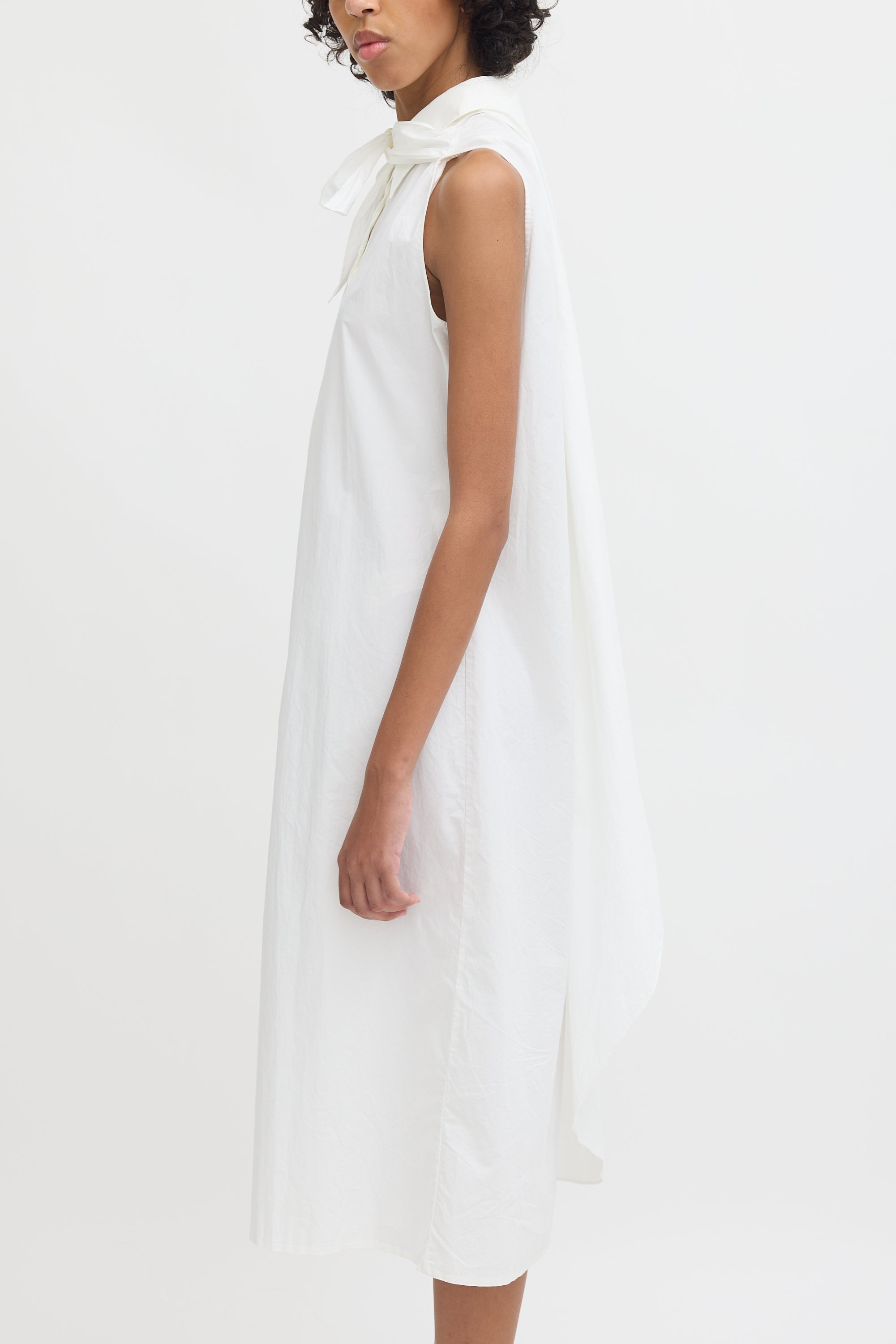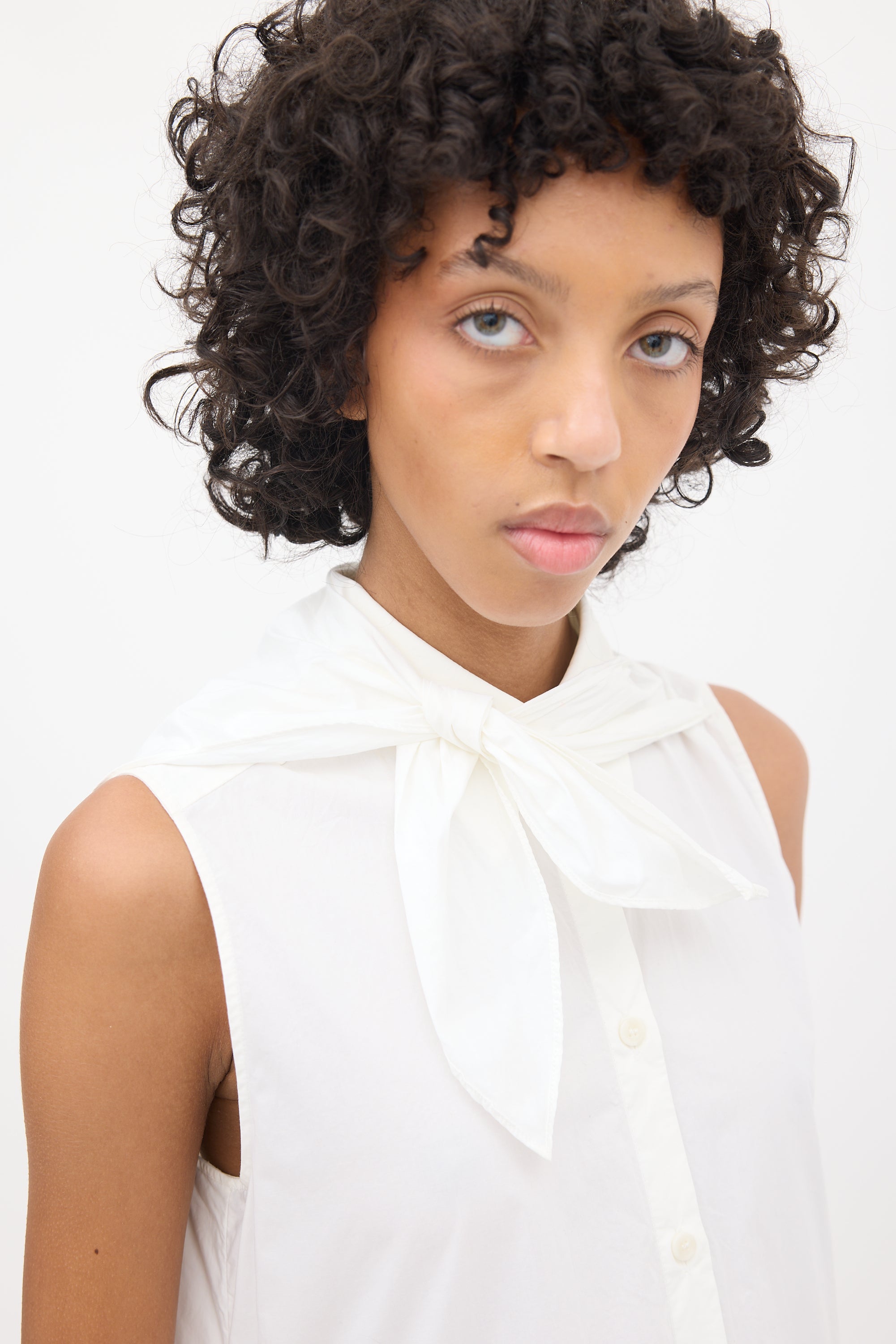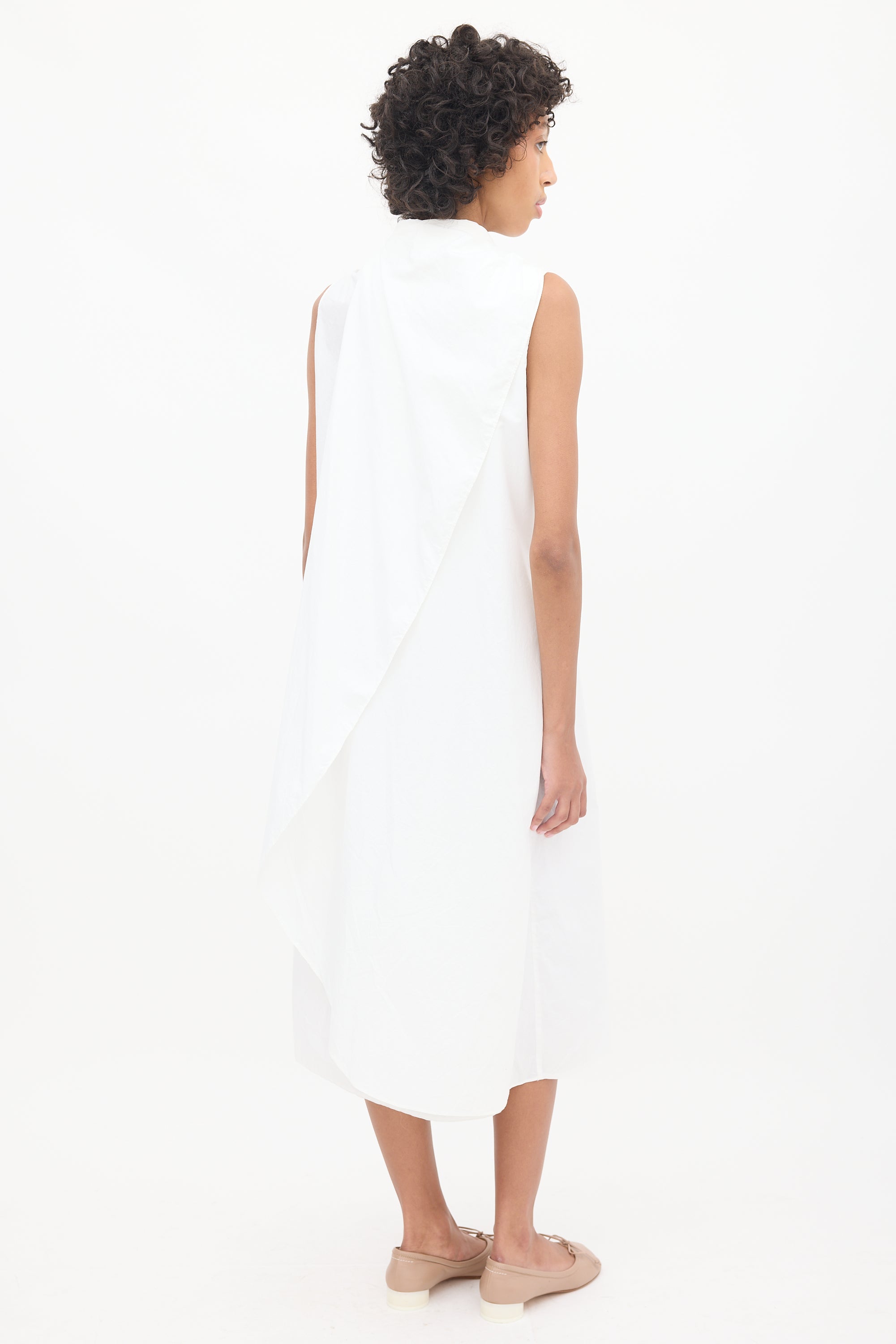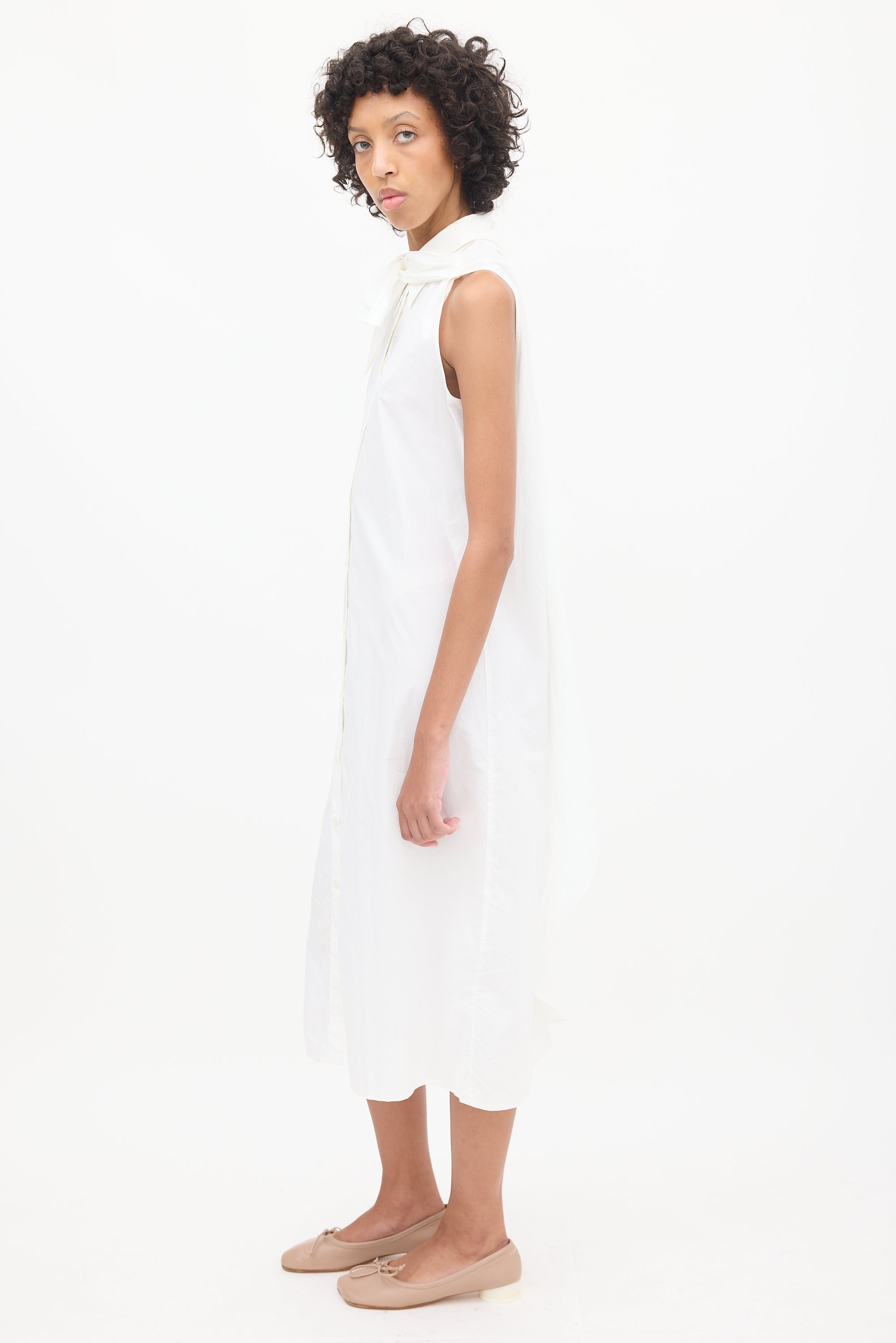 Pre-owned MM6 Maison Margiela white sleeveless midi shirt dress featuring a pointed collar, button up front, even hem, and tie neck layer detail.