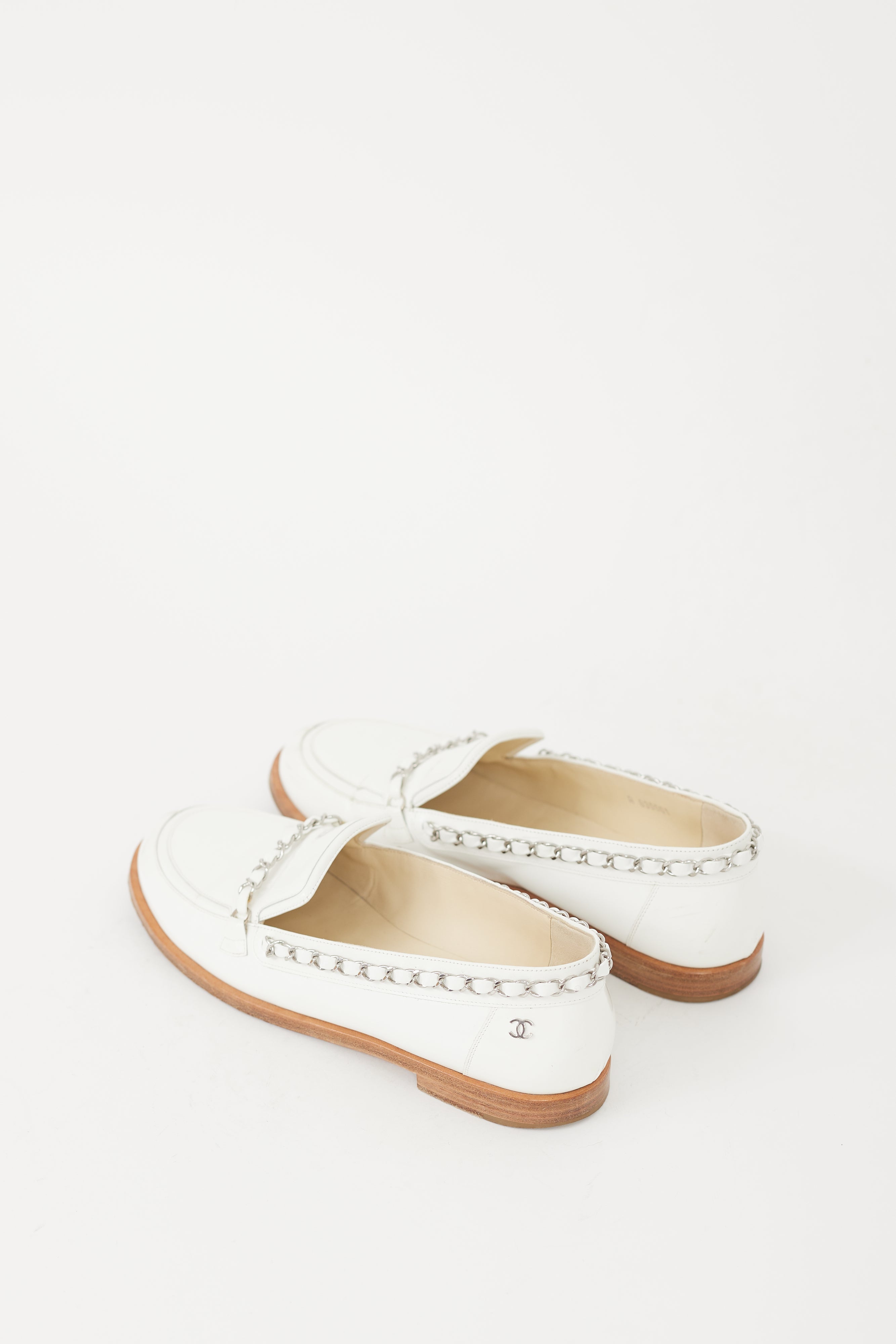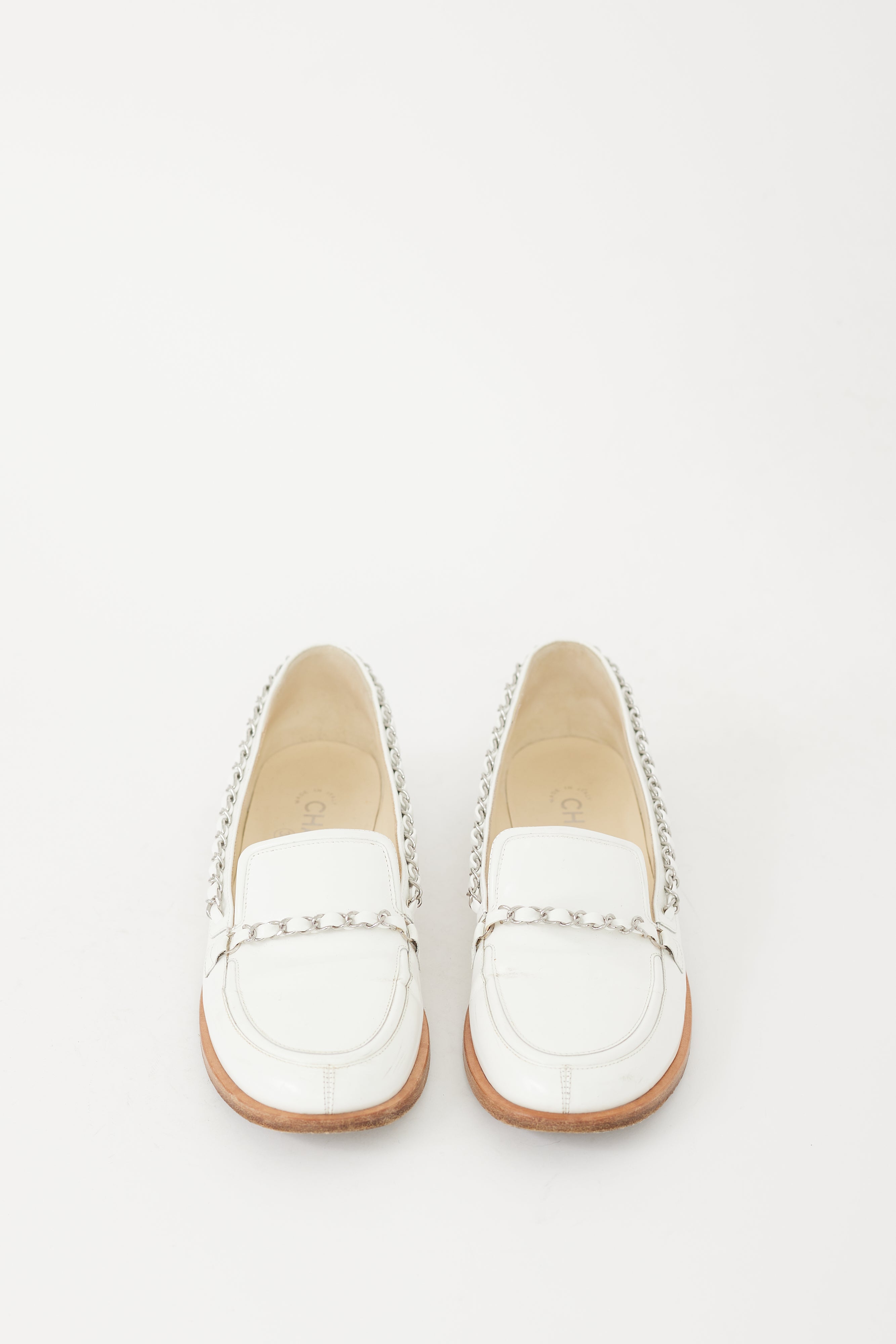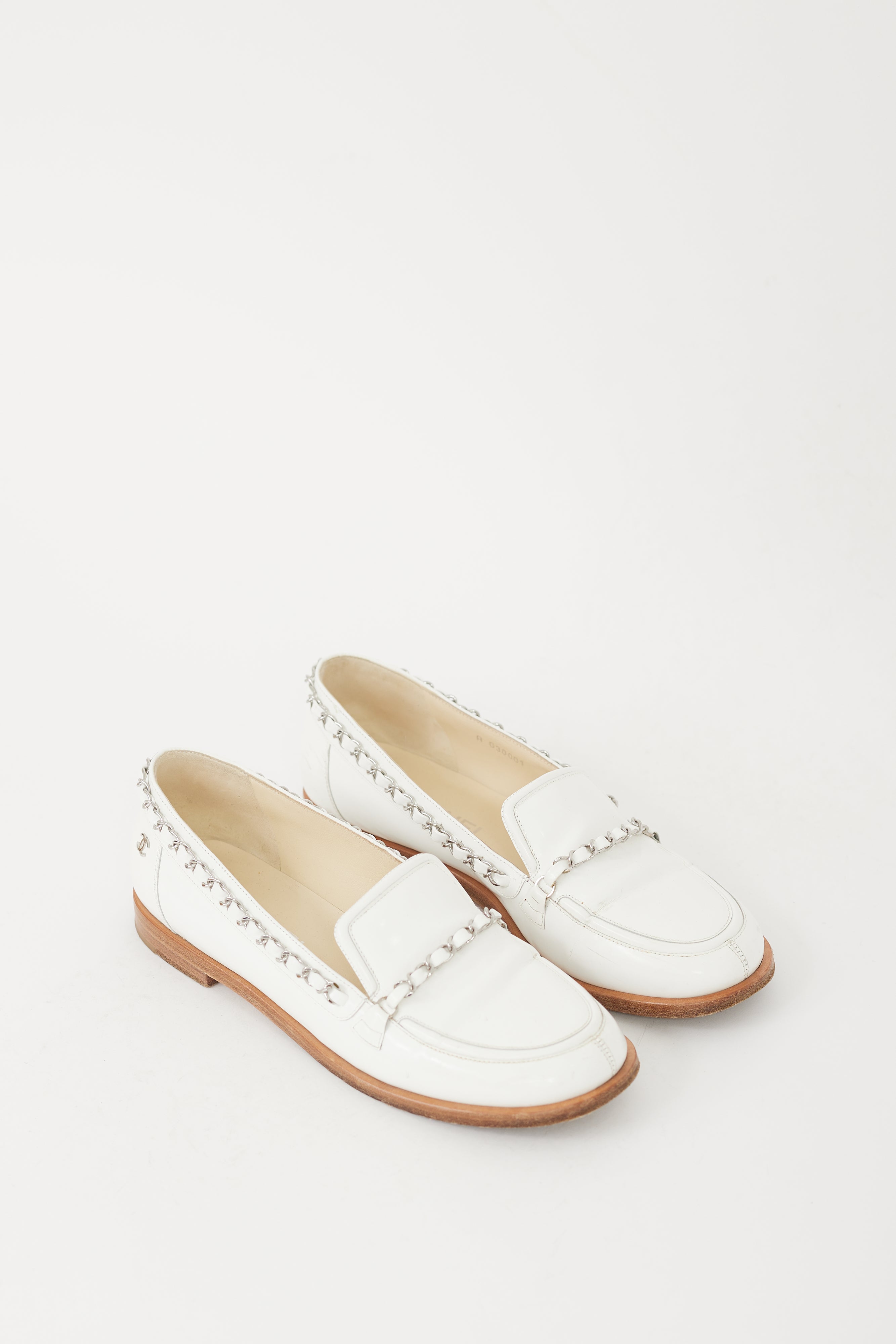 Pre-owned Chanel Cruise 2010 loafers featuring a rounded toe, white patent leather upper, notched topline, silver tone woven chain trim across vamp and collar, silver tone CC logo hardware at outer counter, and brown wooden sole.