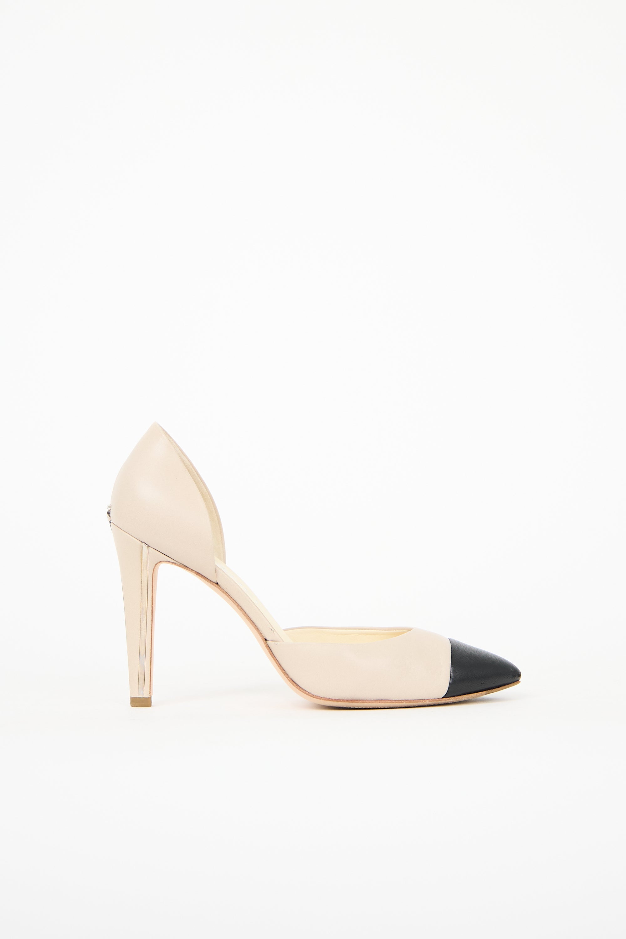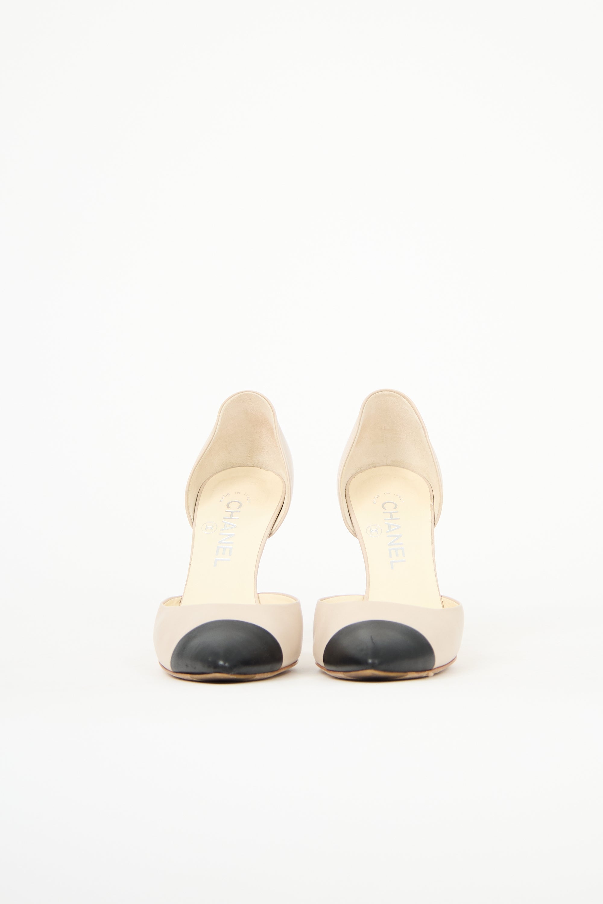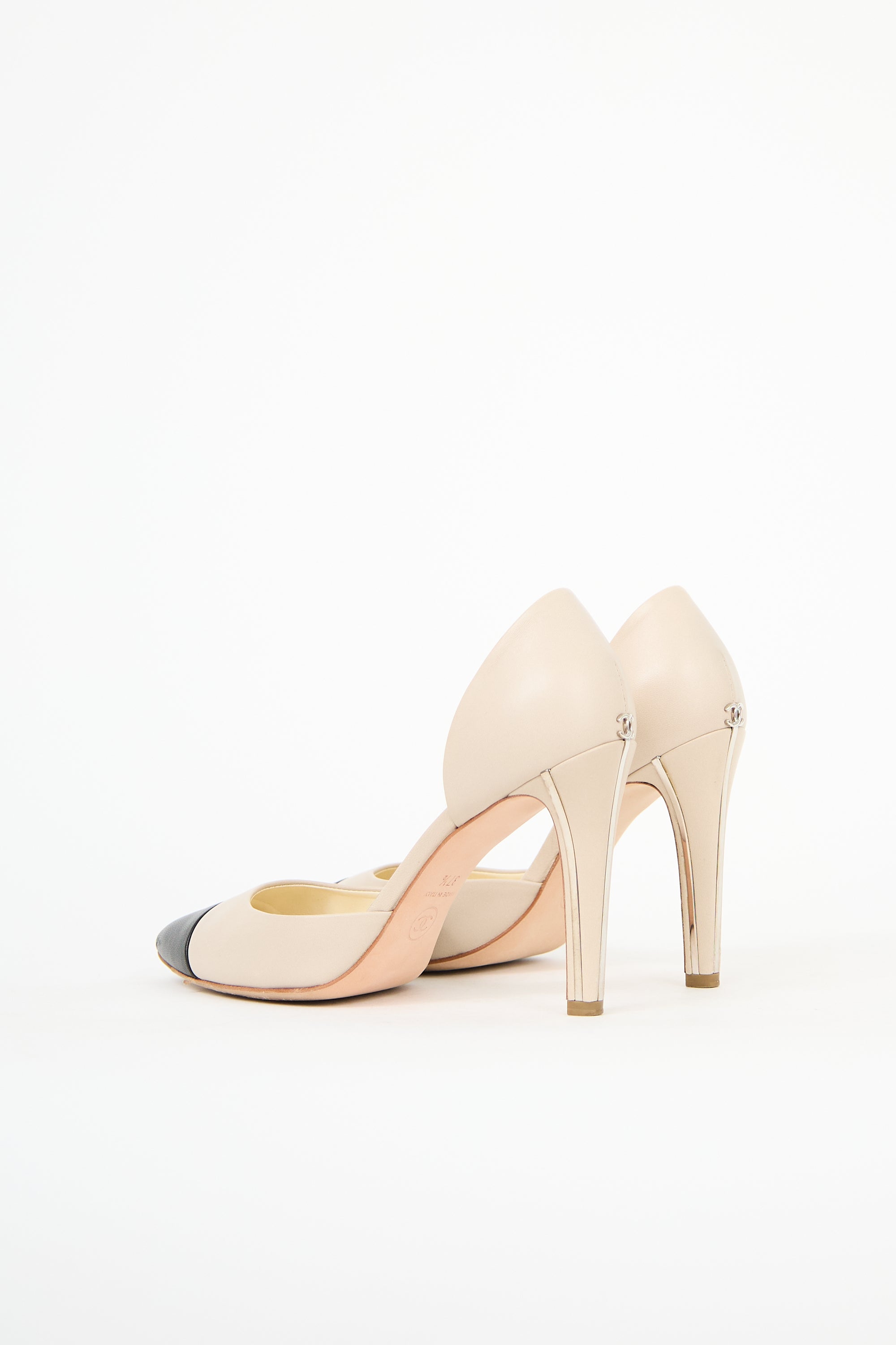 Pre-owned Chanel beige leather D'Orsay heels featuring pointed toe with black cap, covered stiletto heel, and silver tone CC embellishment and accents at heel. Comes with original box and care guide.