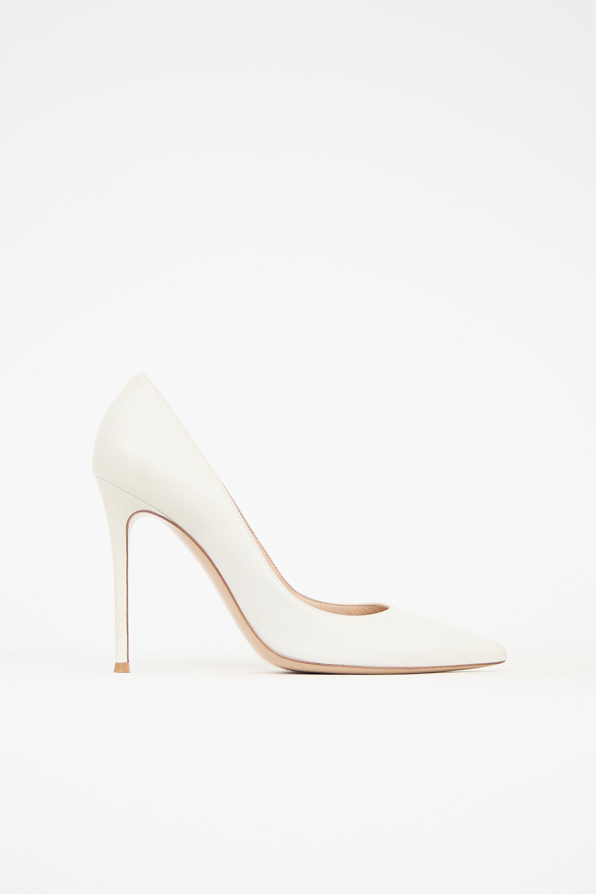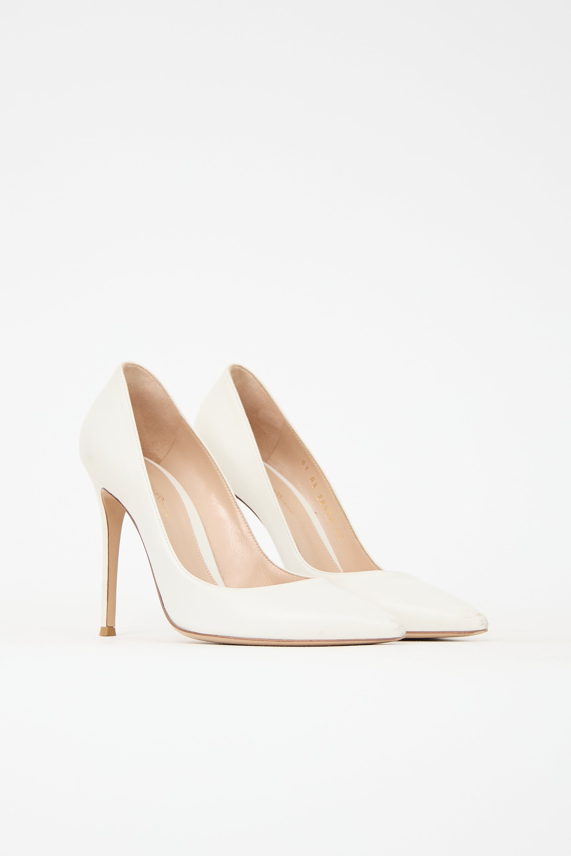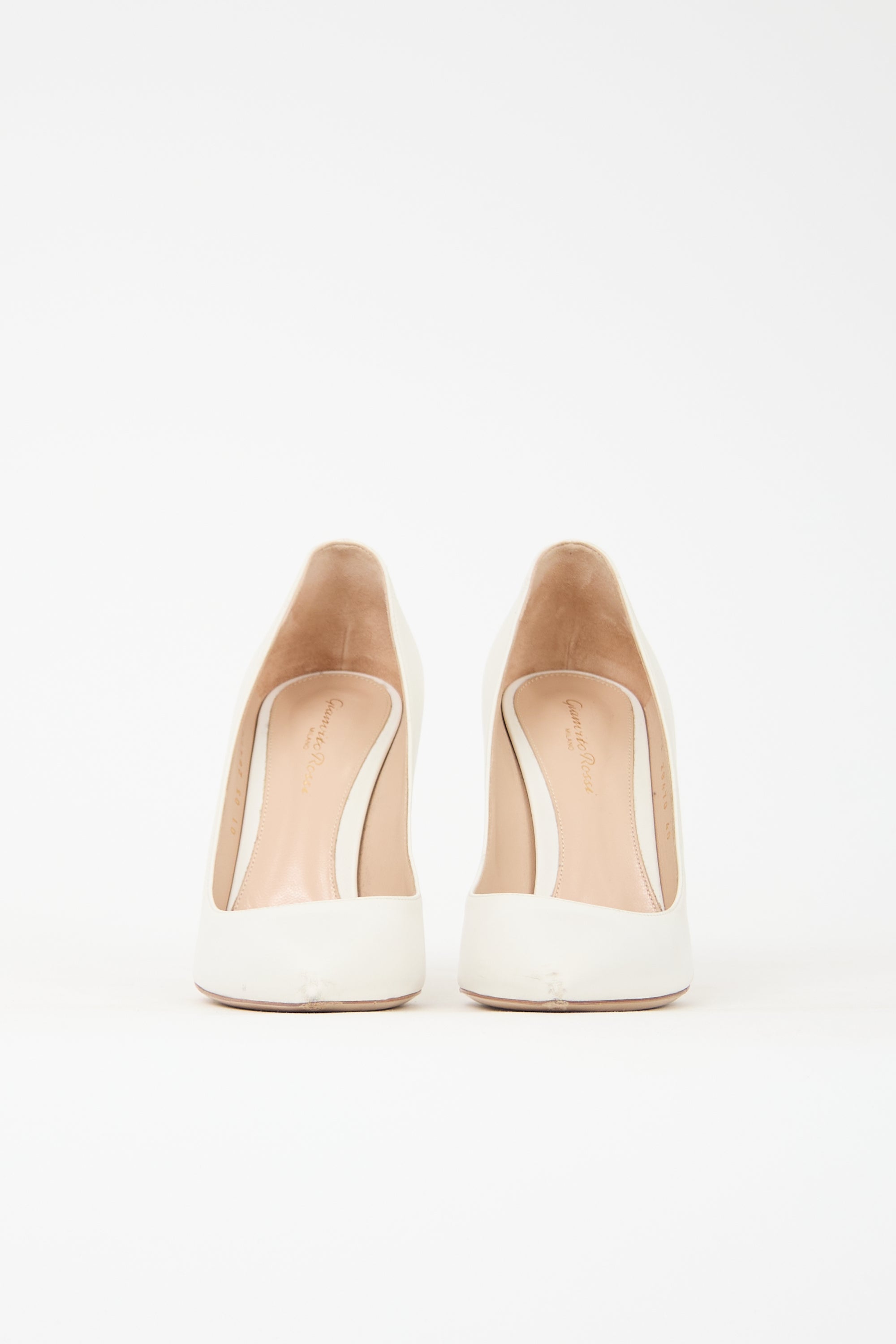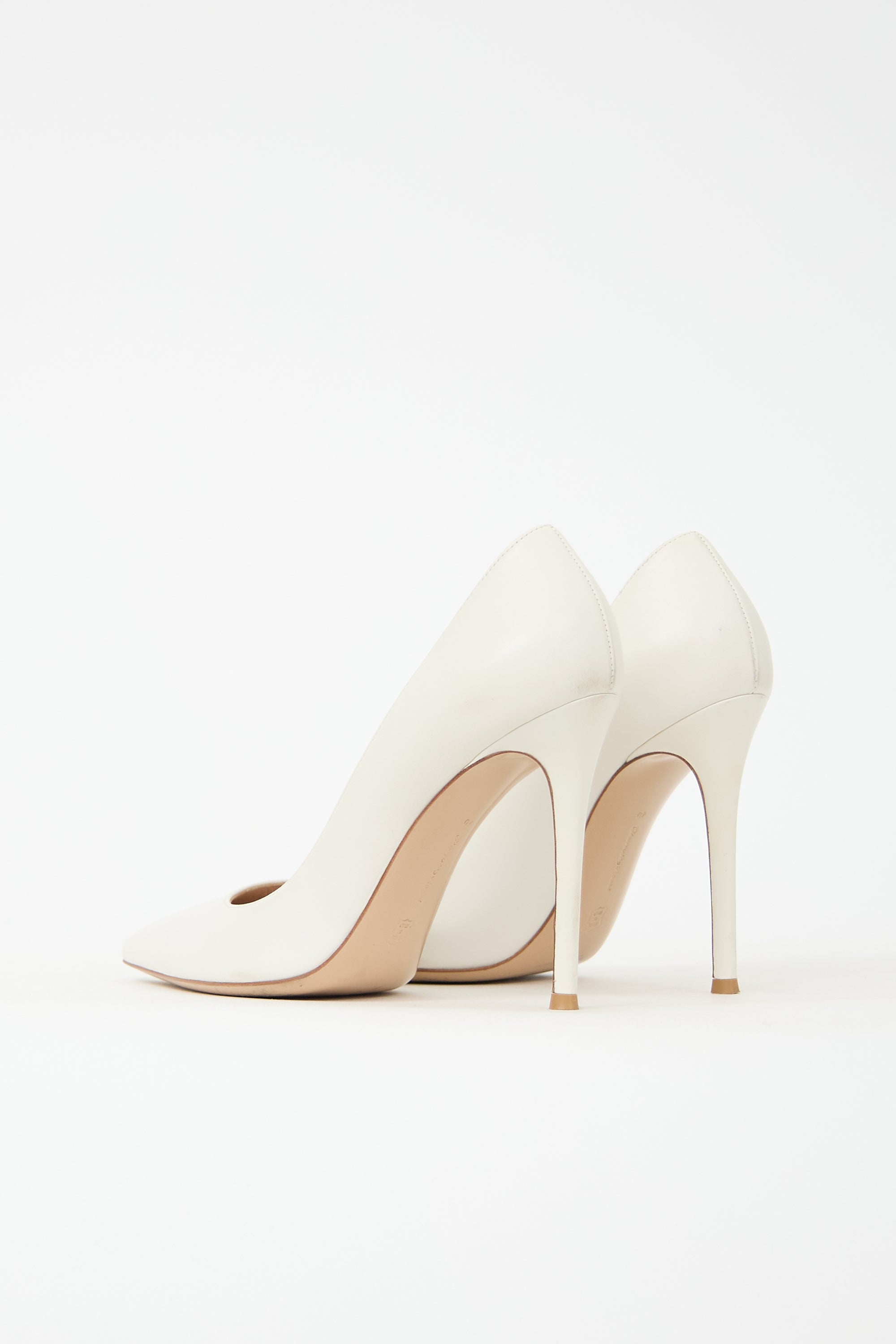 Pre-owned Gianvito Rossi white leather Gianvito 105 pumps featuring a pointed toe, slip on entry, and covered stiletto heel.