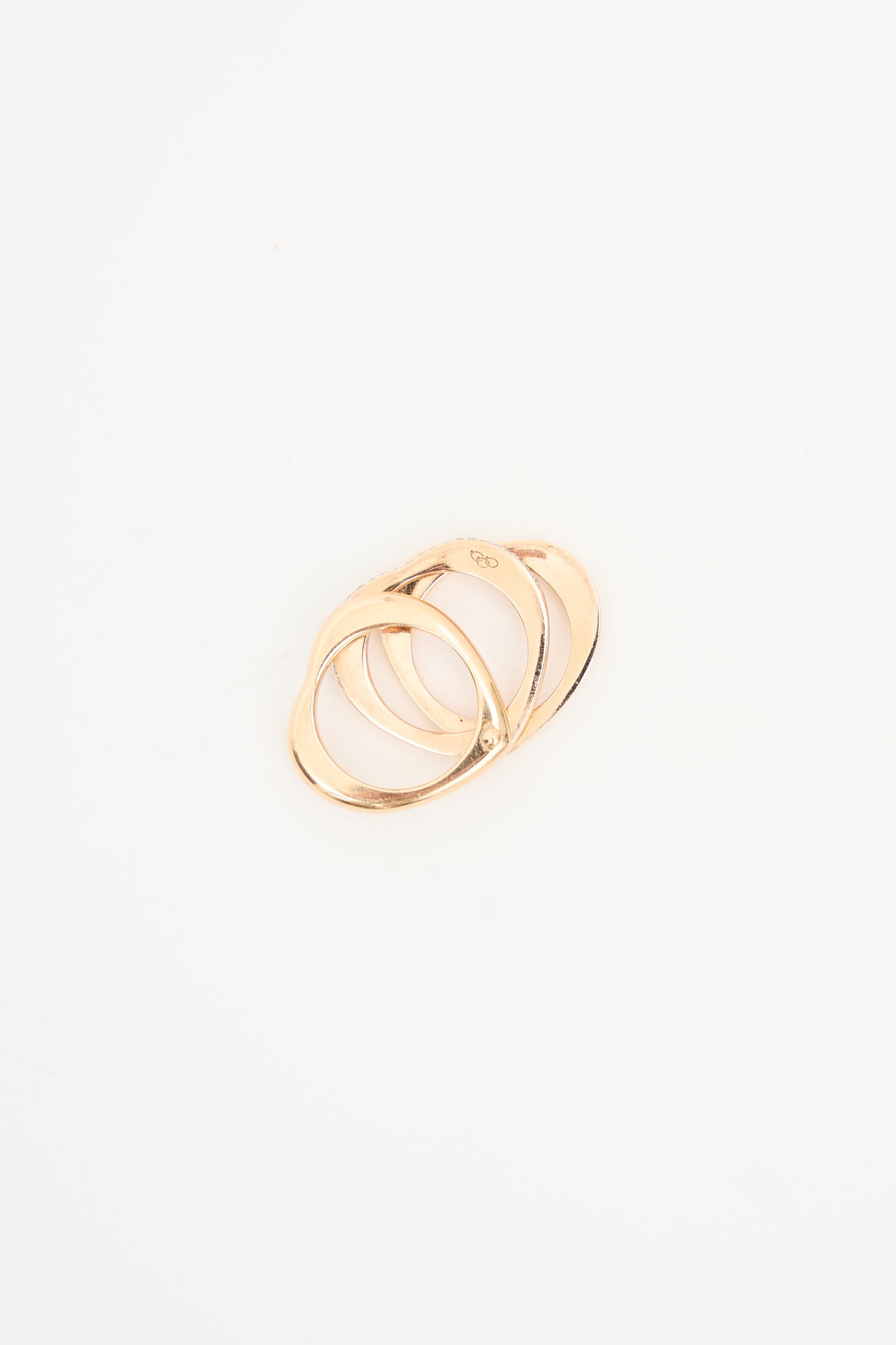 Pre-owned Links of London 18k rose gold Love Note ring featuring three heart shaped rings, connecting swivel mechanism, and 24 diamonds at center ring.
