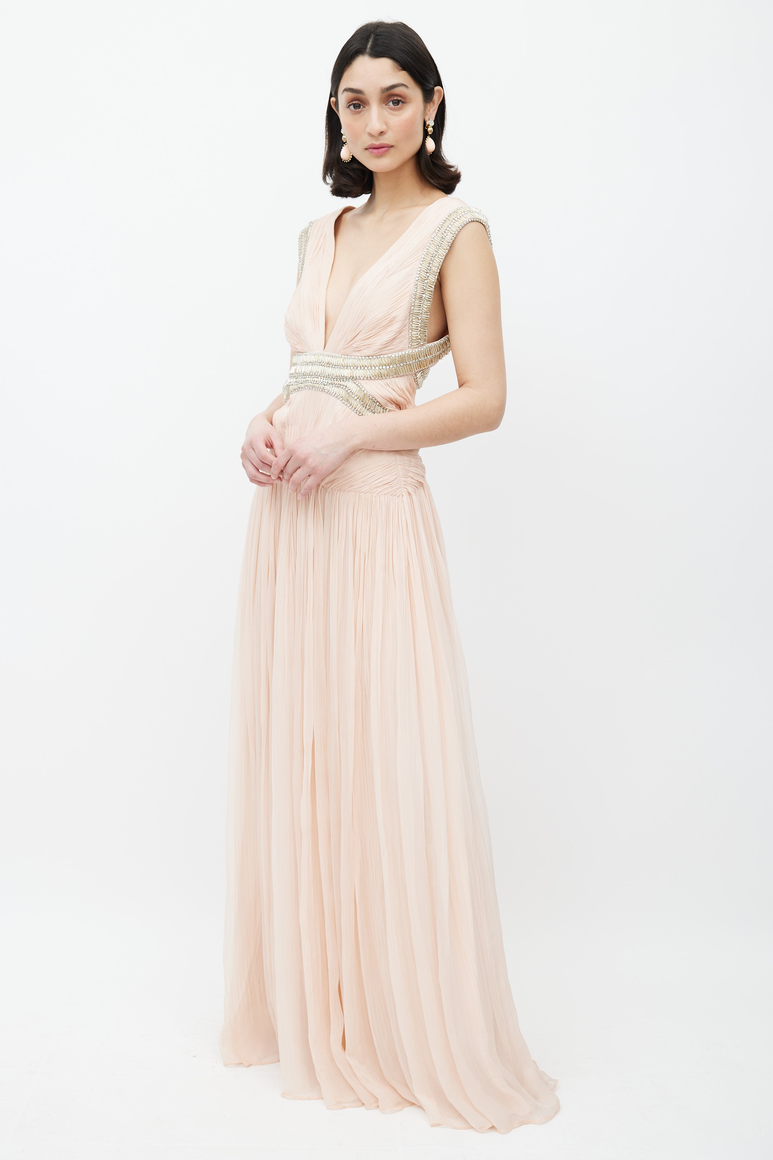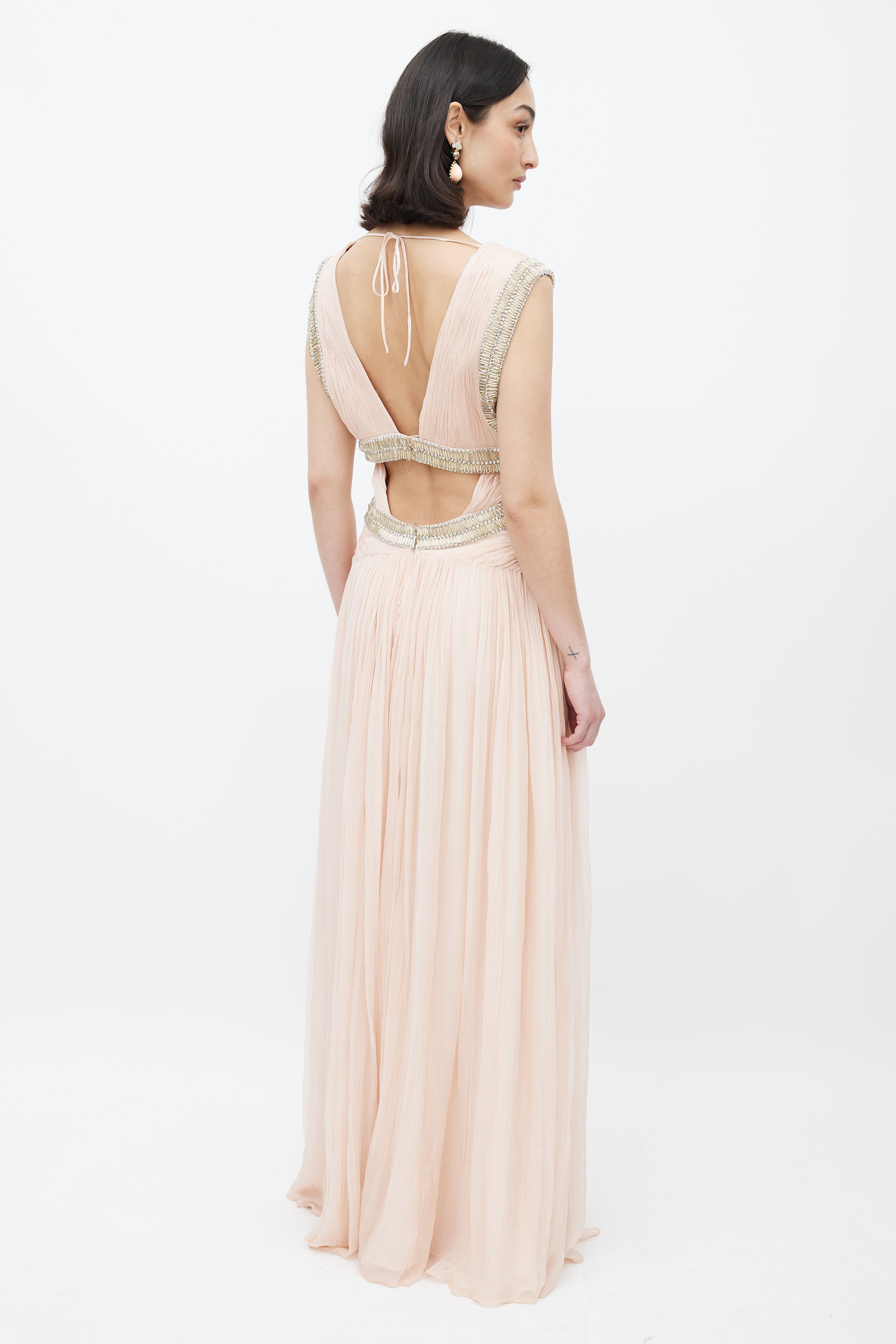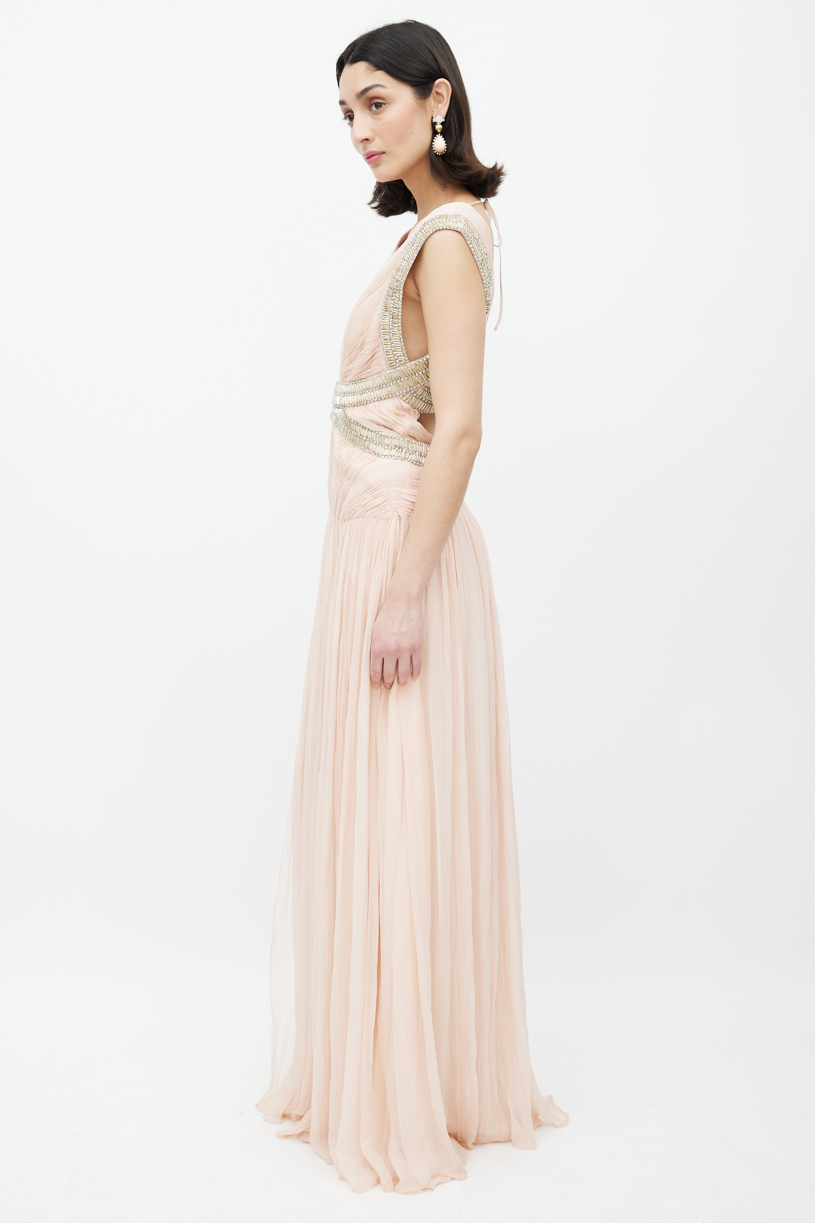 Pre-owned Roberto Cavalli pink sleeveless gown featuring gathering throughout torso, gold tone and silver tone embellished trim along armhole and across waist, deep V-neckline, self tie at back neck, cutout at back, concealed back zip, back hook and eye fasteners, and interior bodysuit bottom with hook and eye fasteners. Lined.