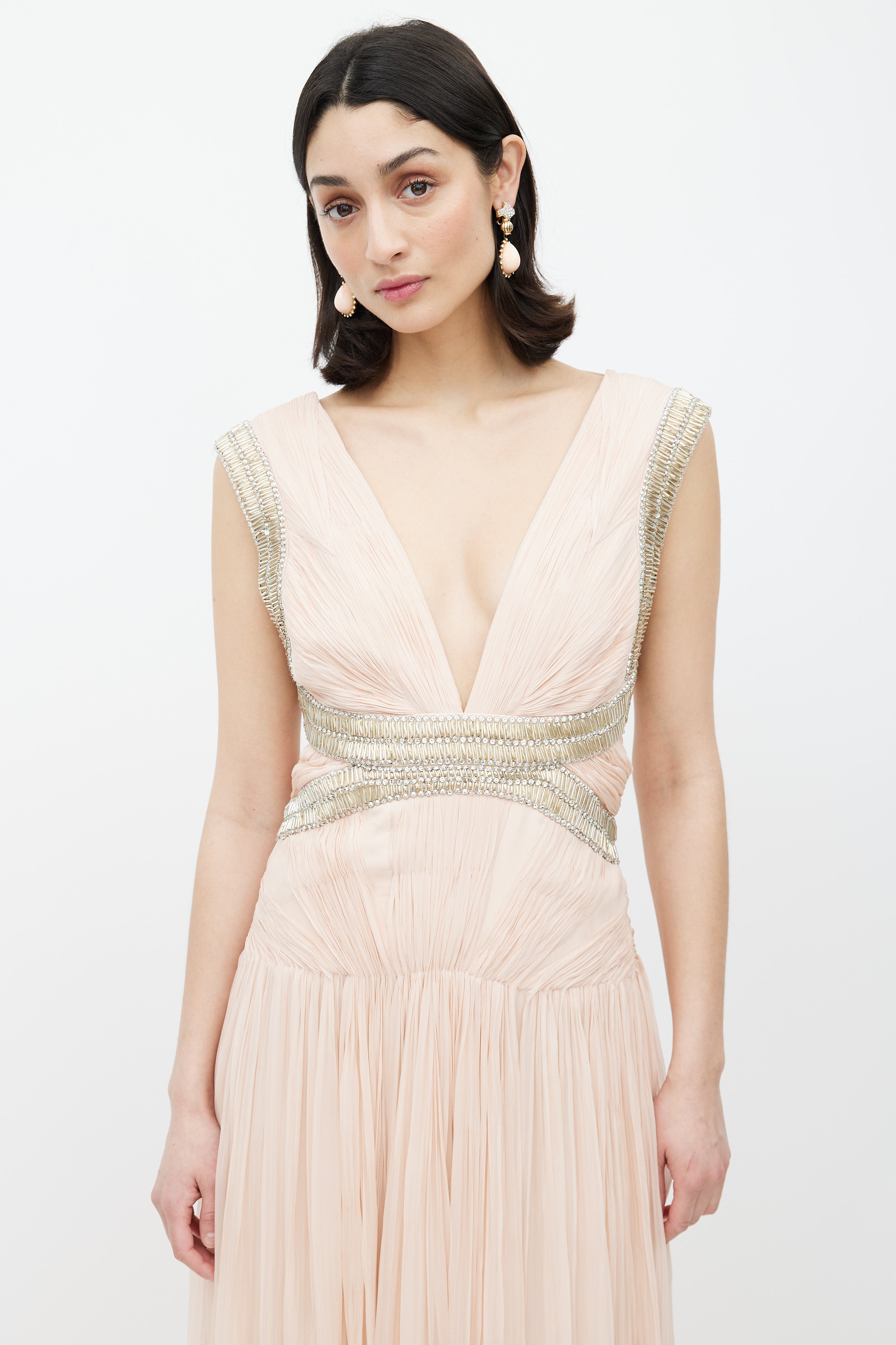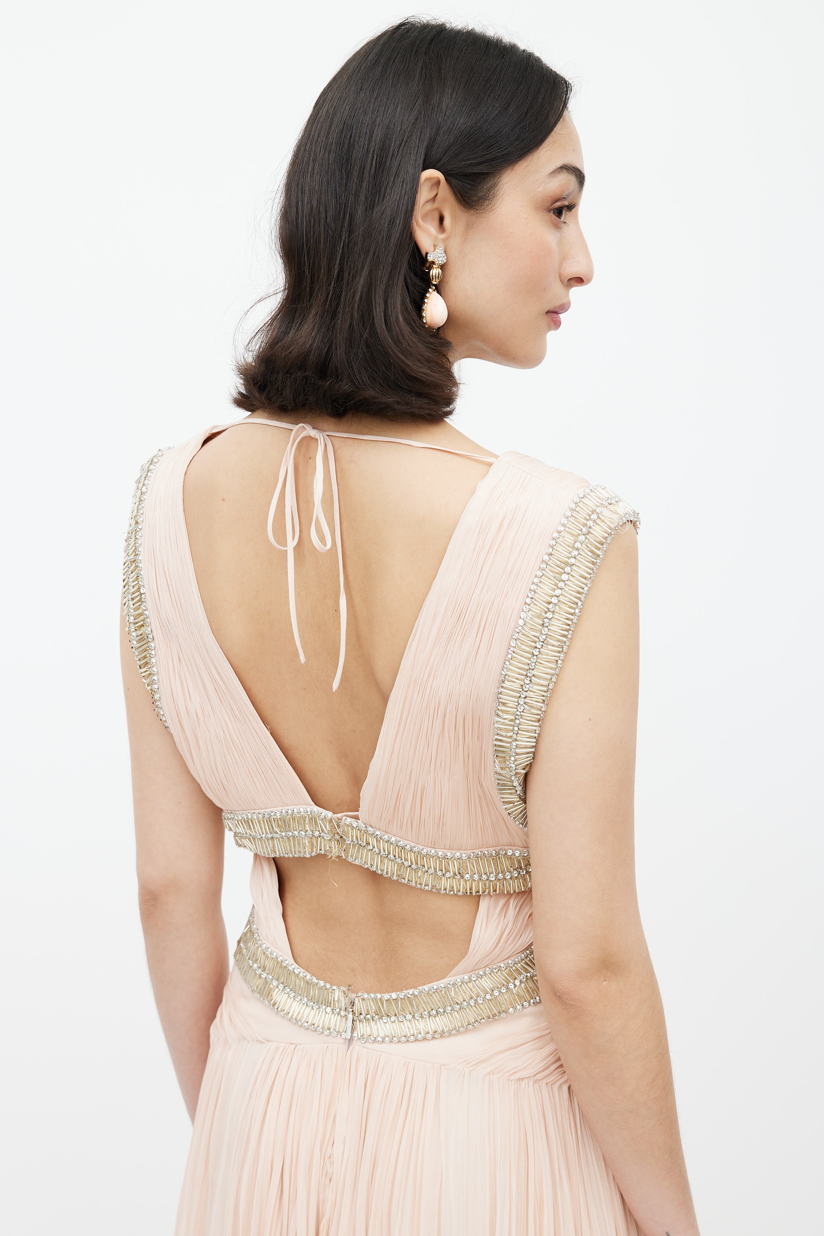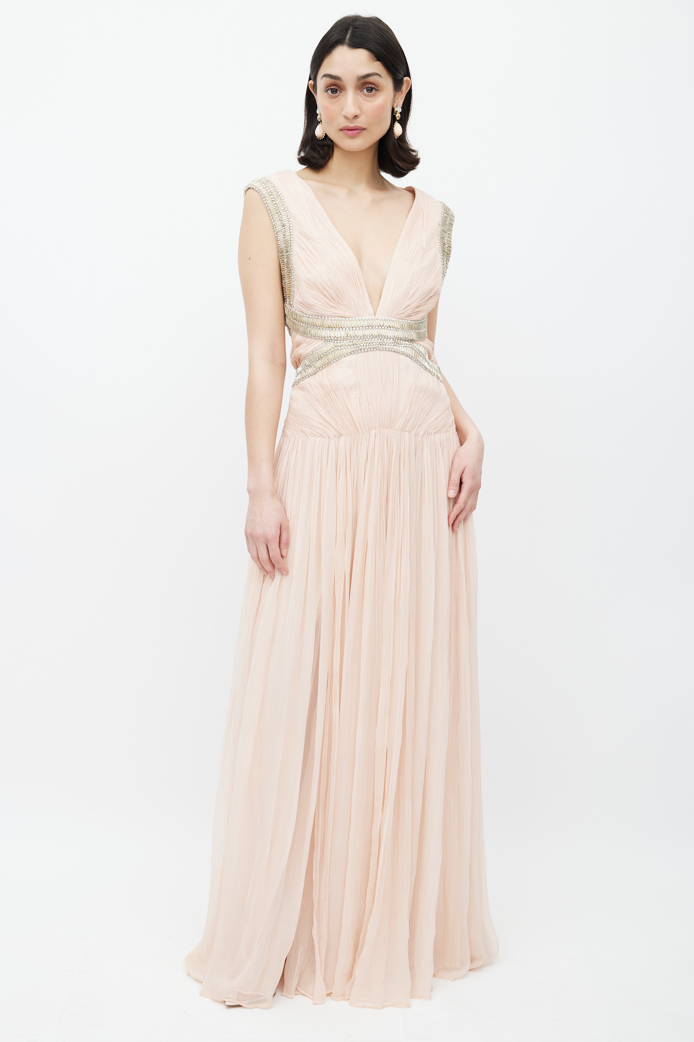 Pre-owned Roberto Cavalli pink sleeveless gown featuring gathering throughout torso, gold tone and silver tone embellished trim along armhole and across waist, deep V-neckline, self tie at back neck, cutout at back, concealed back zip, back hook and eye fasteners, and interior bodysuit bottom with hook and eye fasteners. Lined.