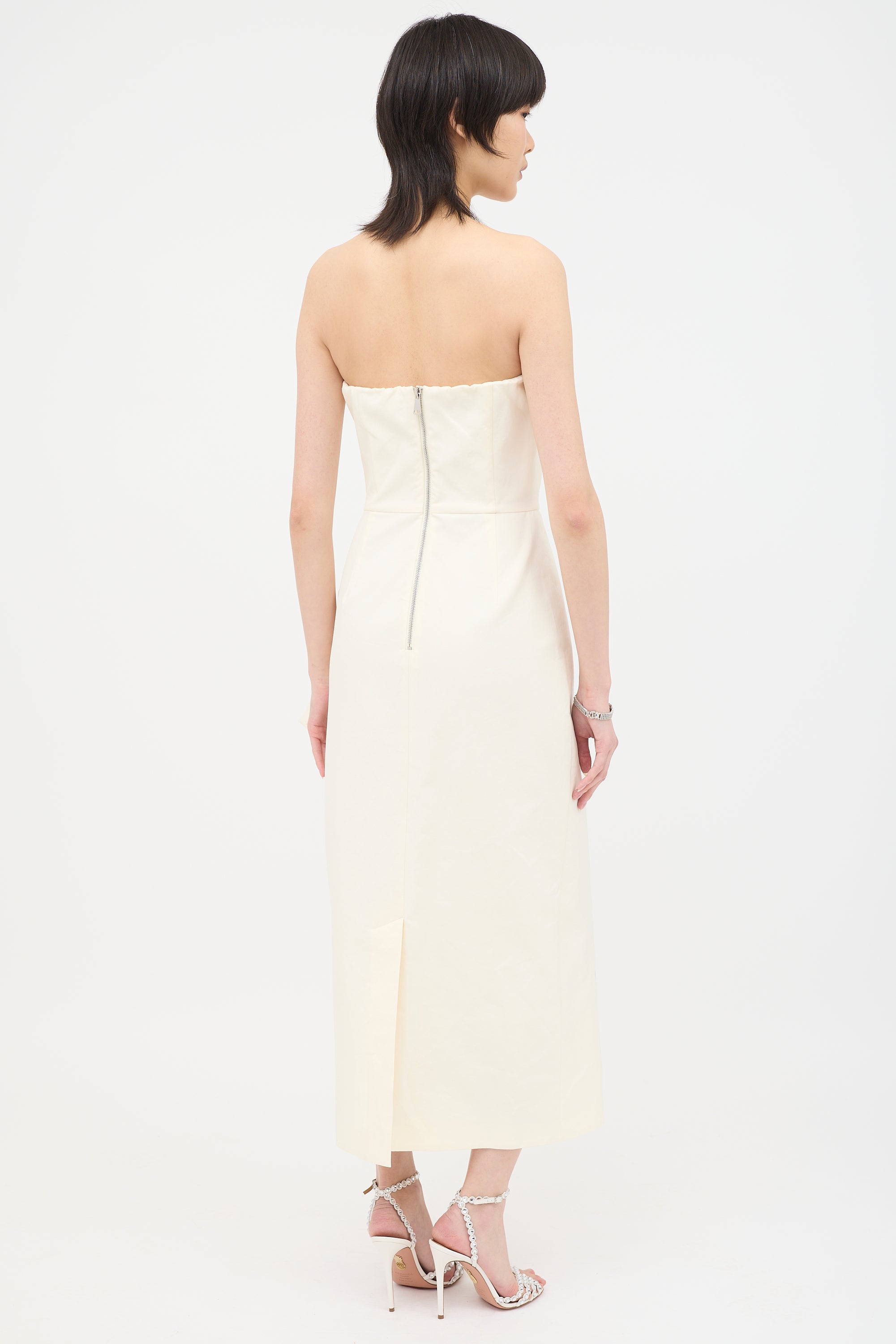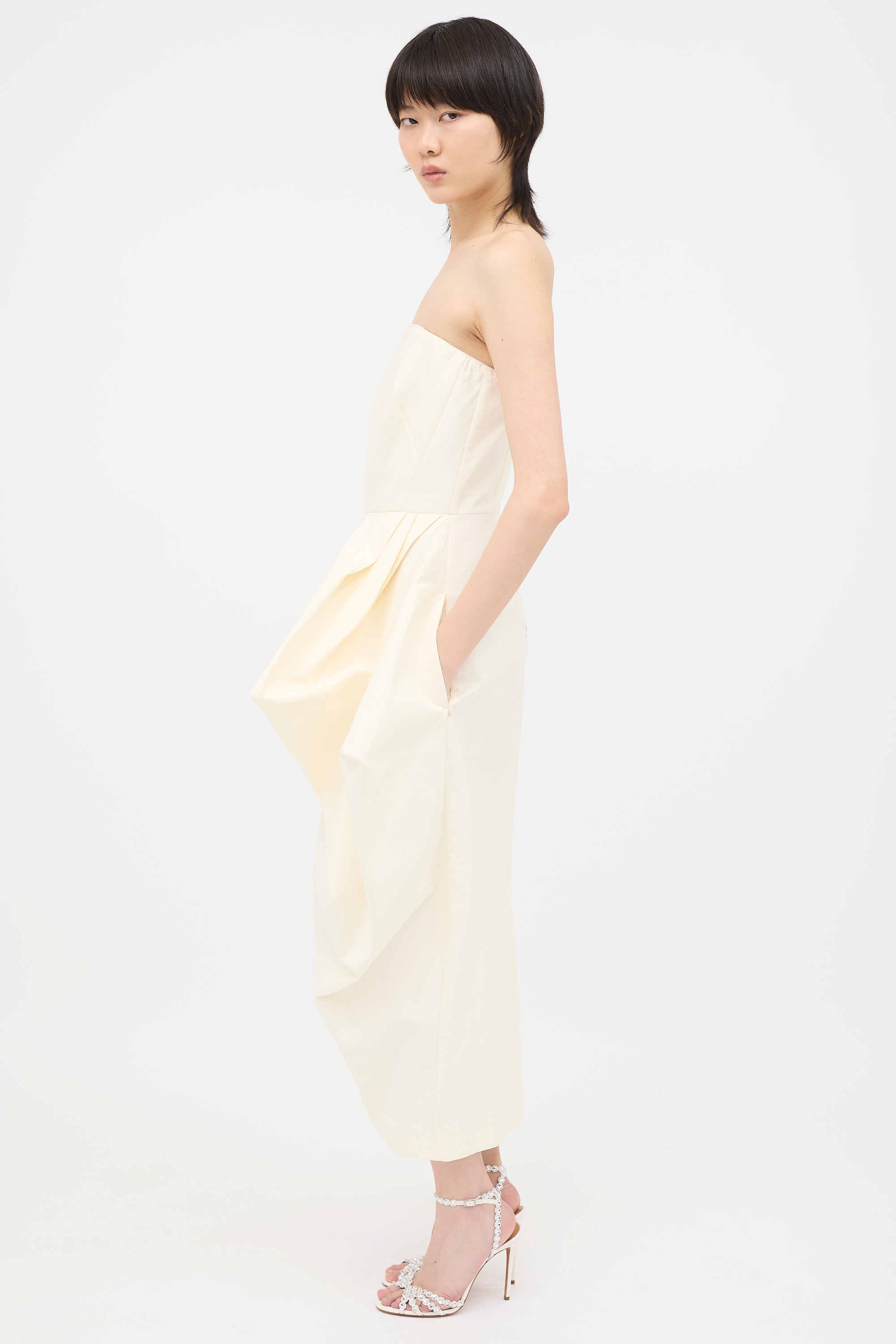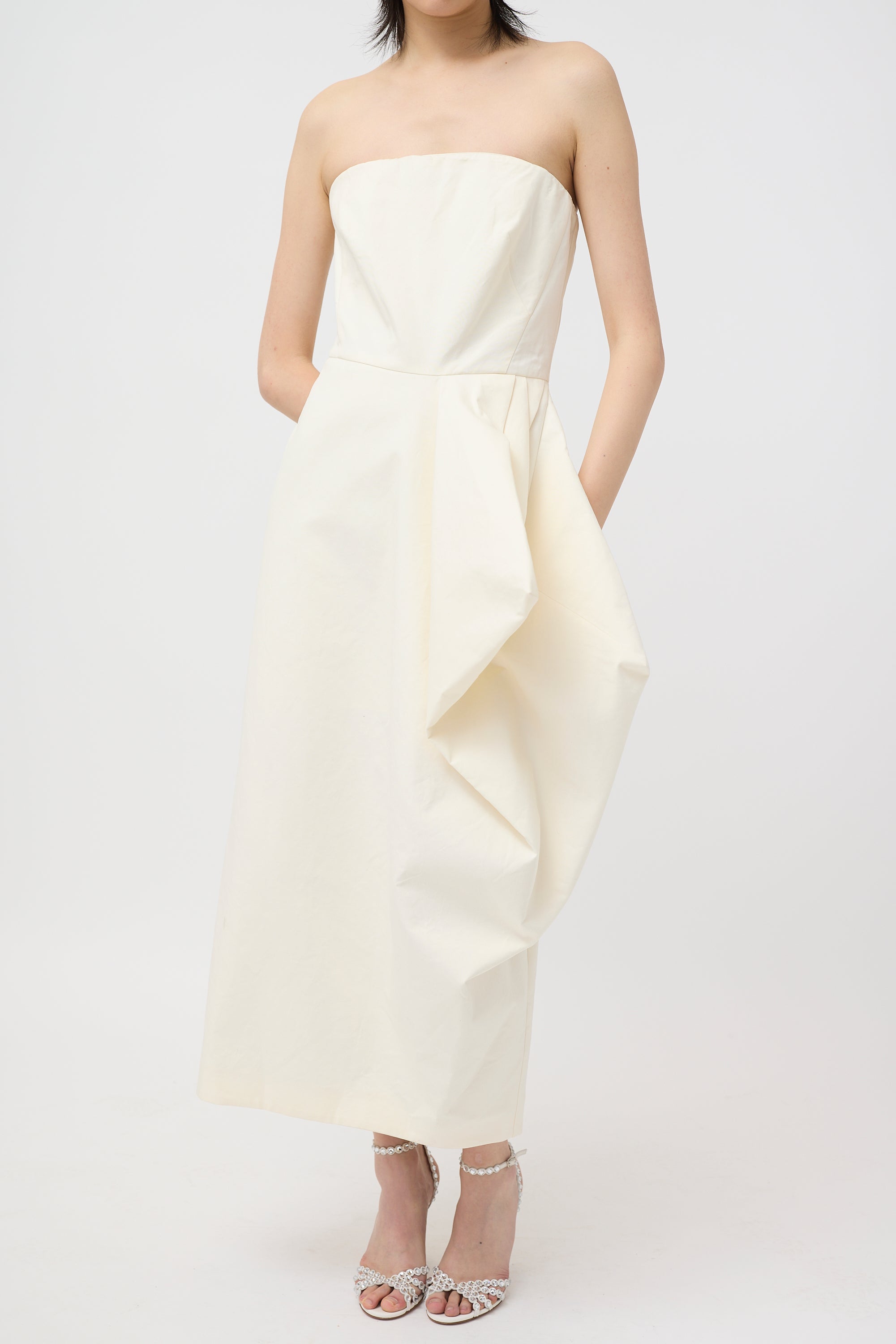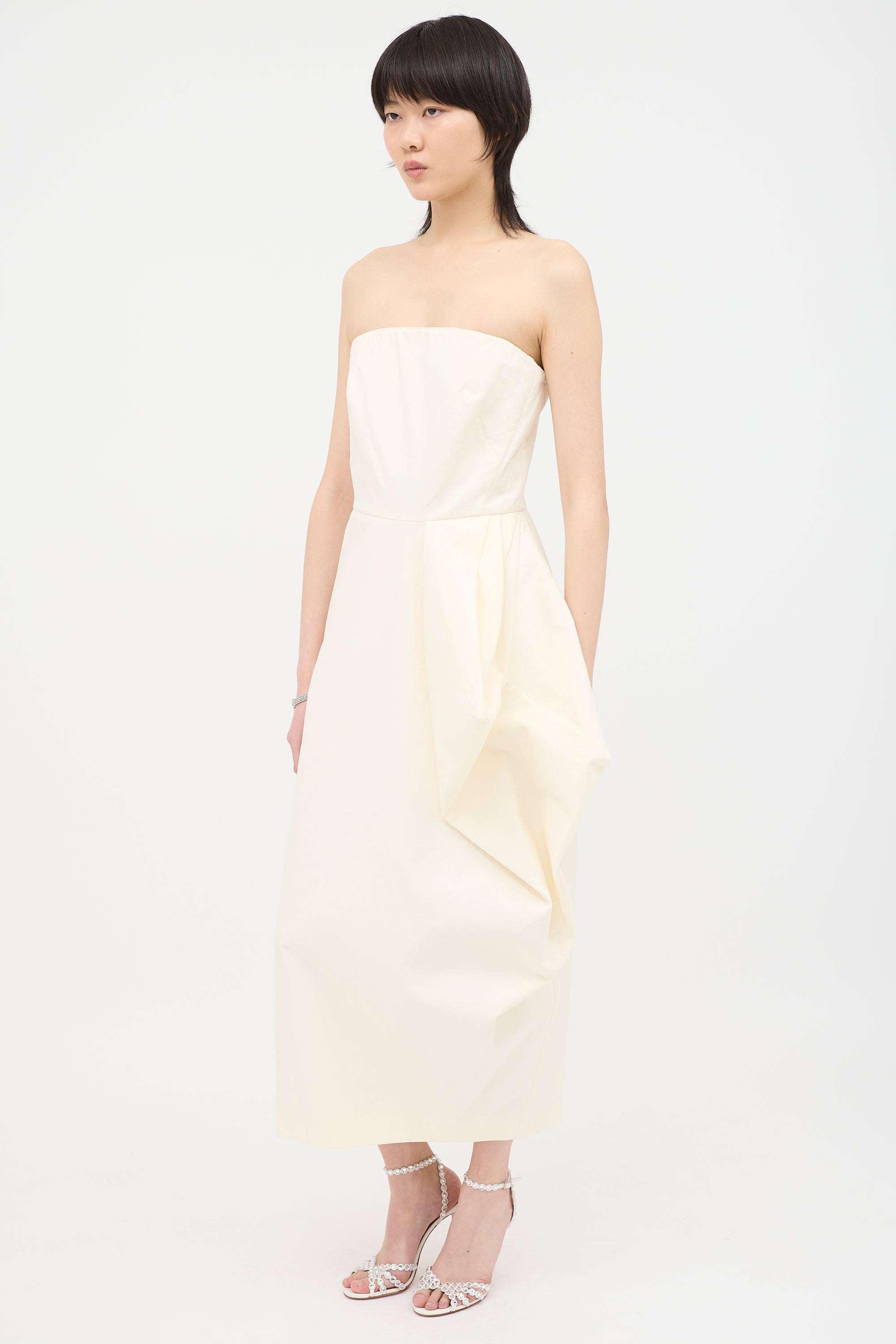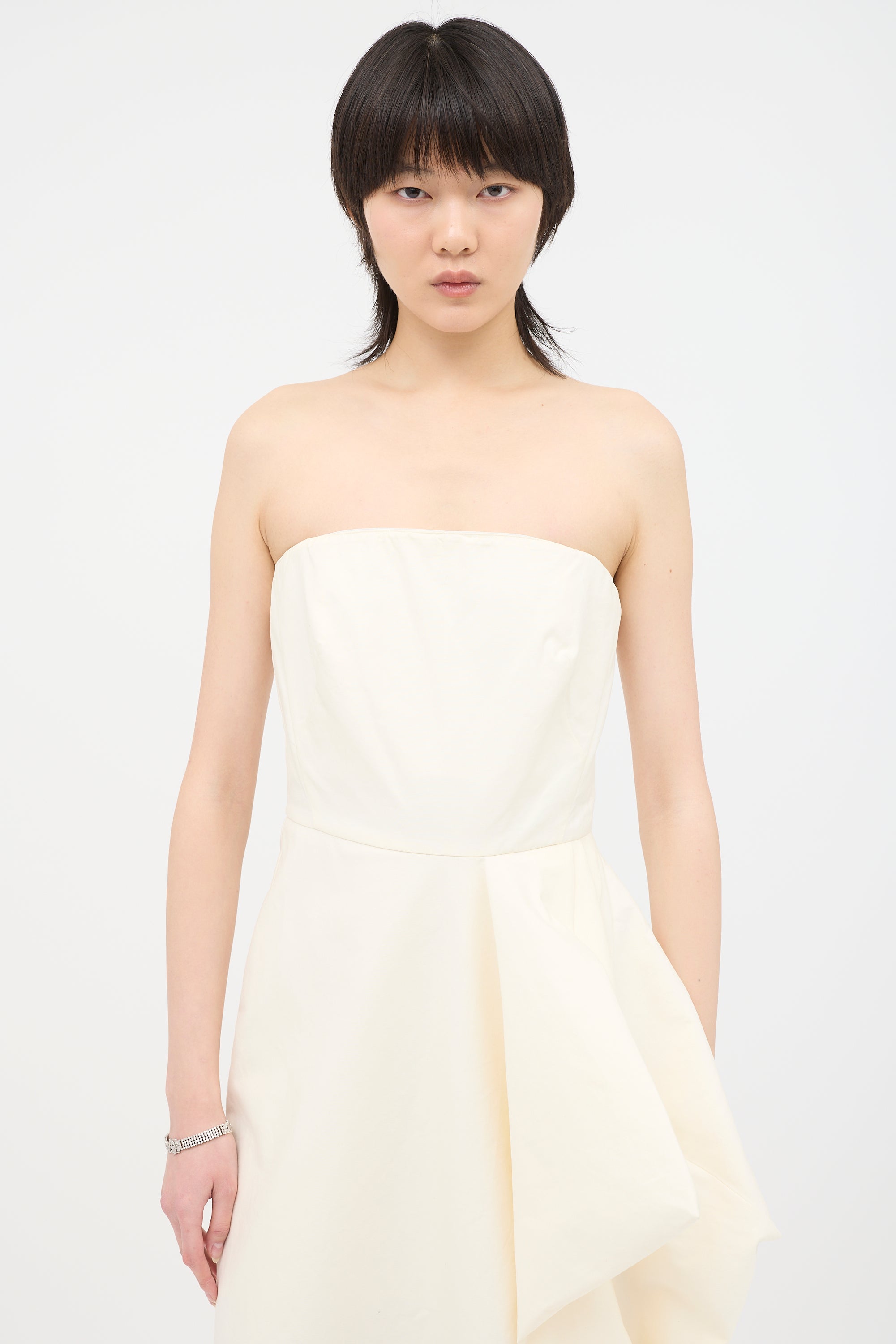 Pre-owned Sportmax white Gisella dress featuring a strapless straight neckline, darted bust, boned bustier at interior, back zip closure, draped asymmetric skirt, one slip pocket at left hip, and a kick pleat.