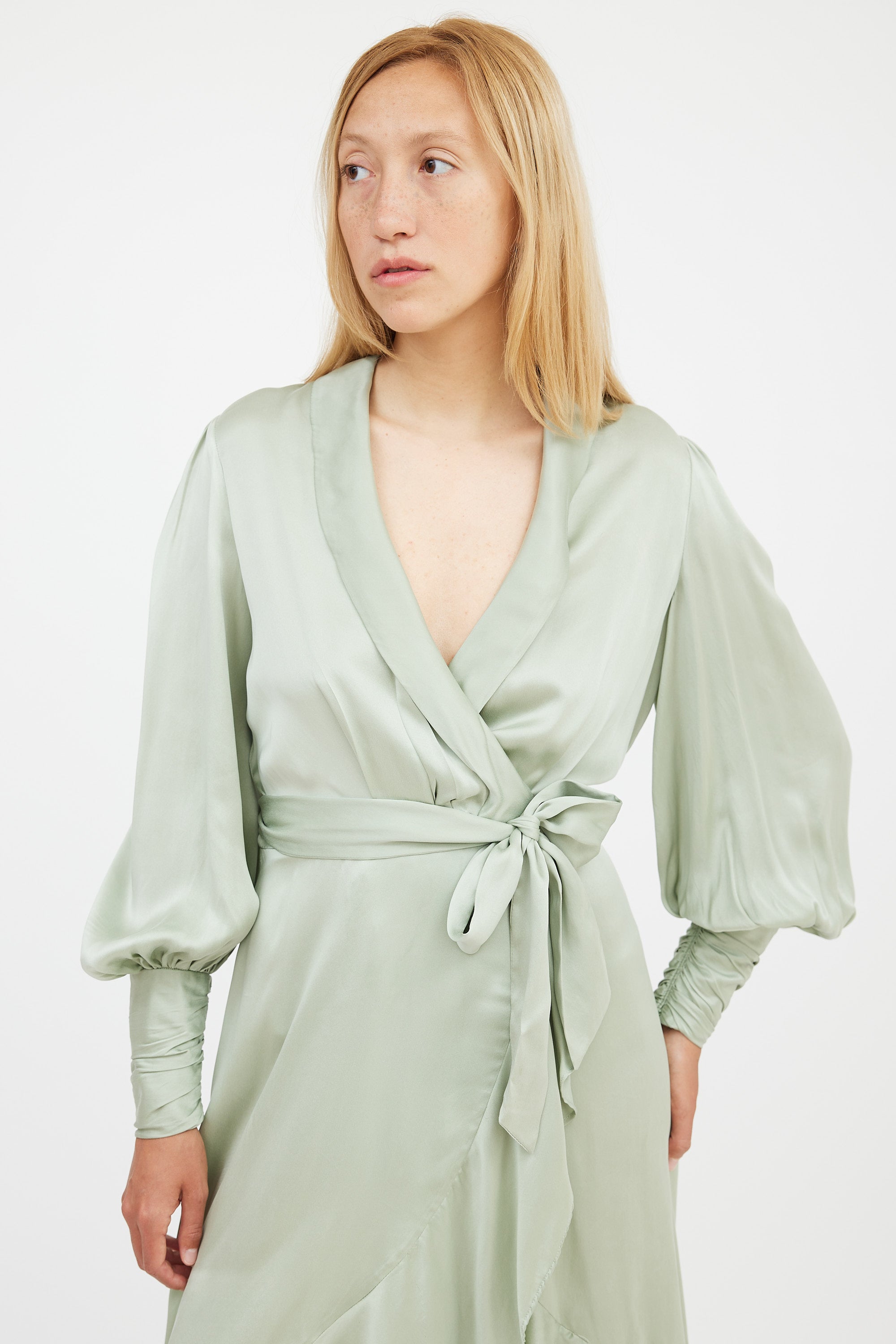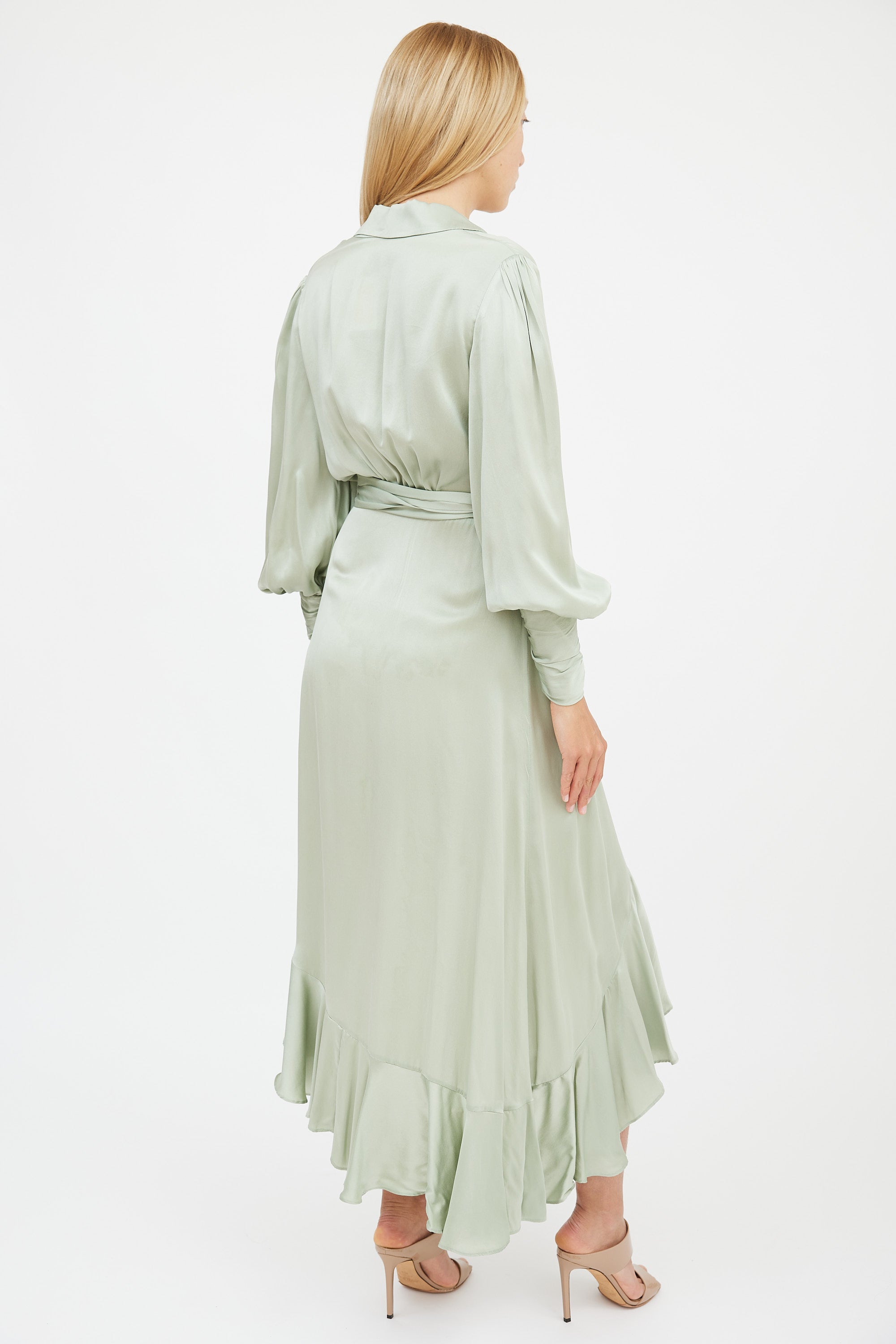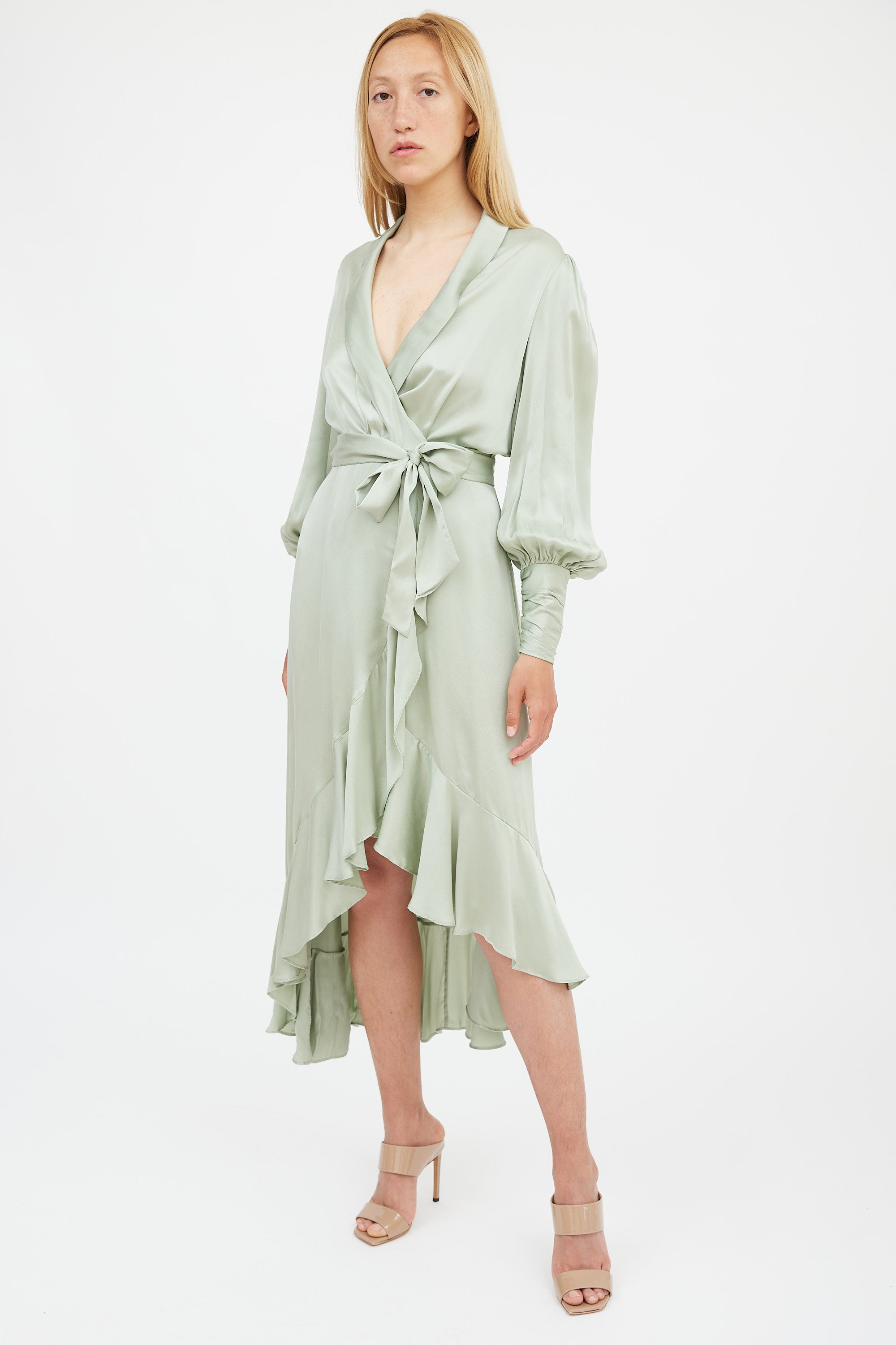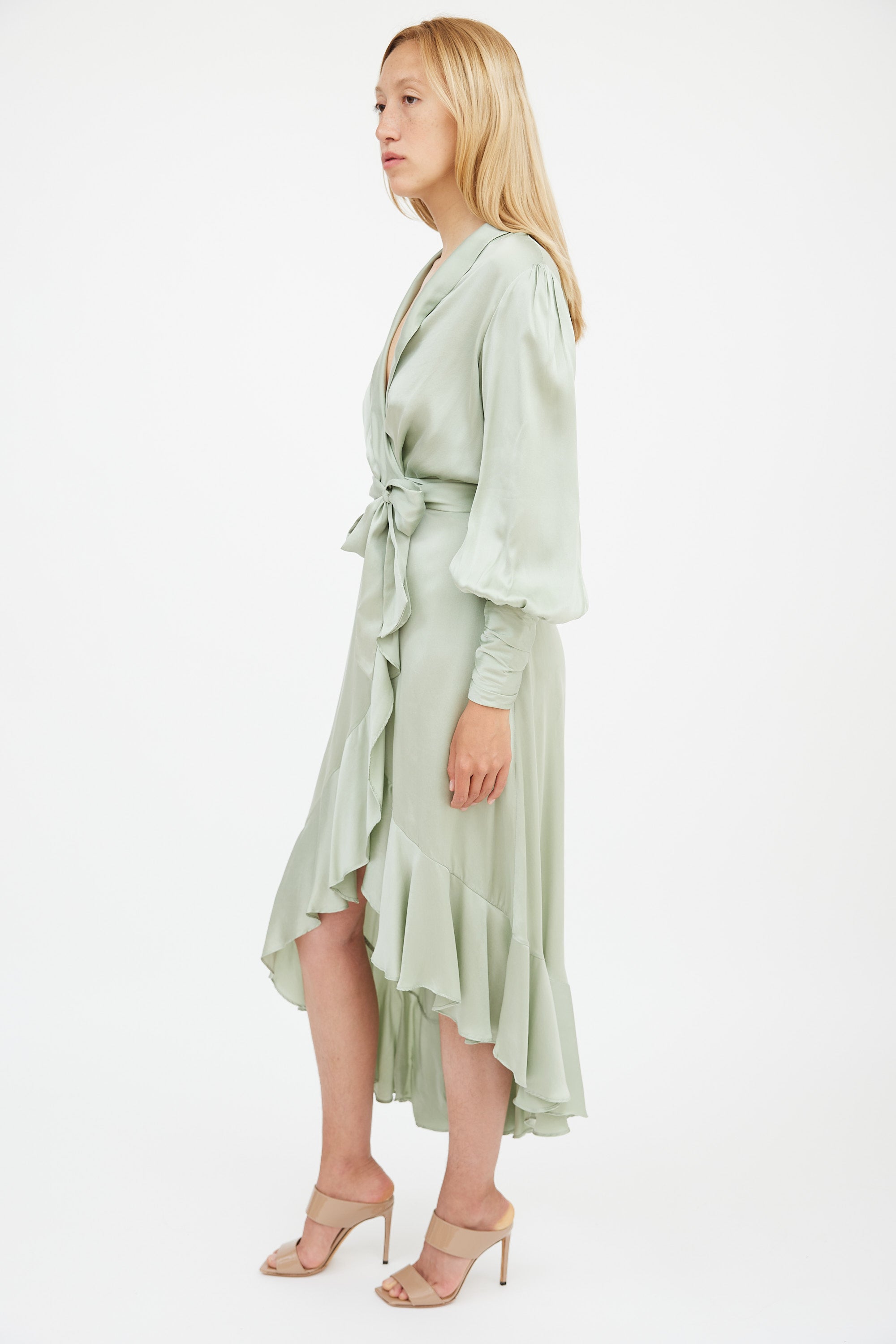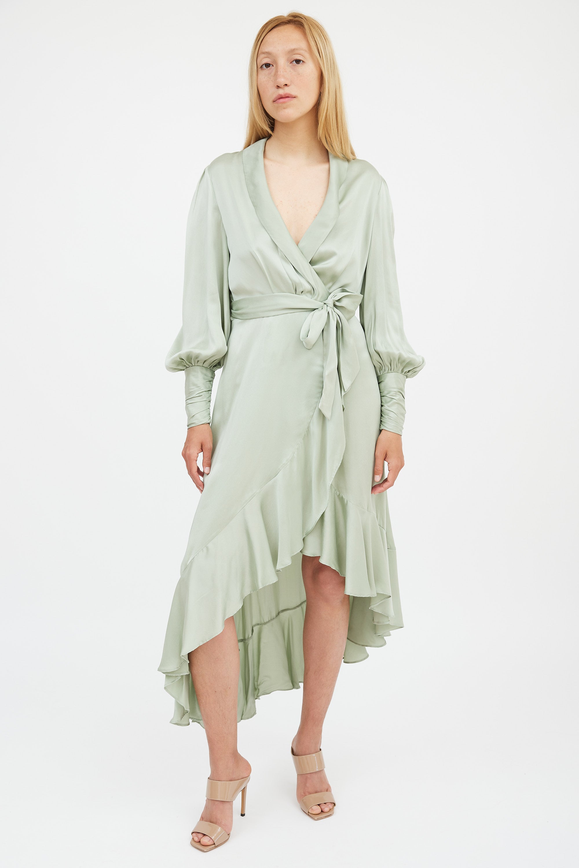 Pre-owned Zimmermann green silk Dancer dress featuring wrap closure, V-neckline, poet sleeves with zipped cuffs, and ruffled hem.
