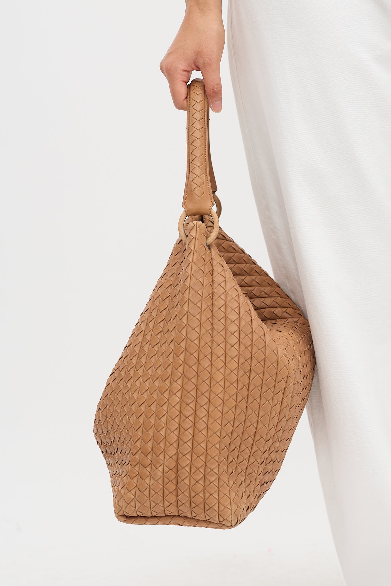 Pre-owned Bottega Veneta brown leather large Natte tote bag featuring signature Intrecciato woven body, single padded top handle, open top, and one lined main compartment with one zip pocket and one slip pocket.