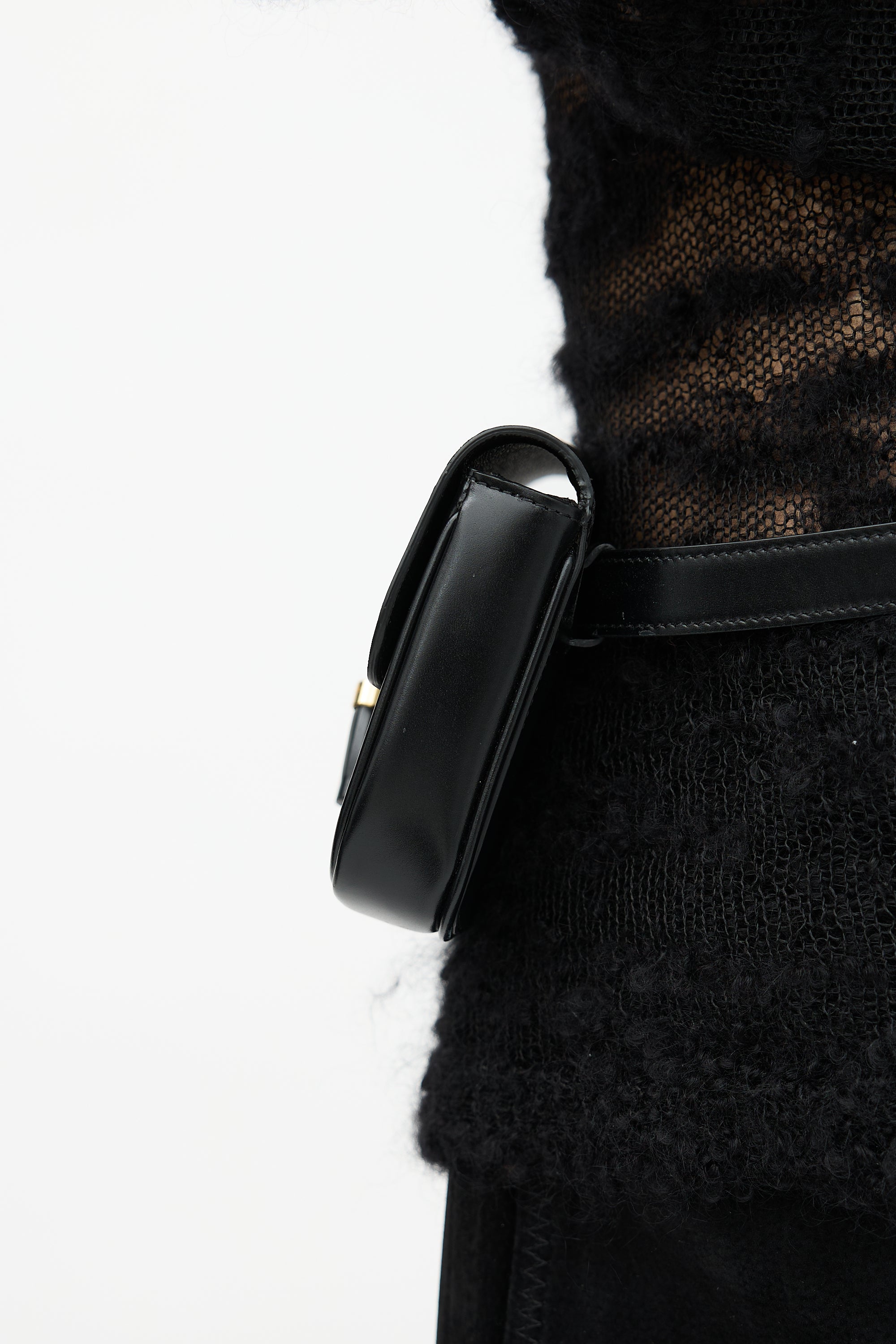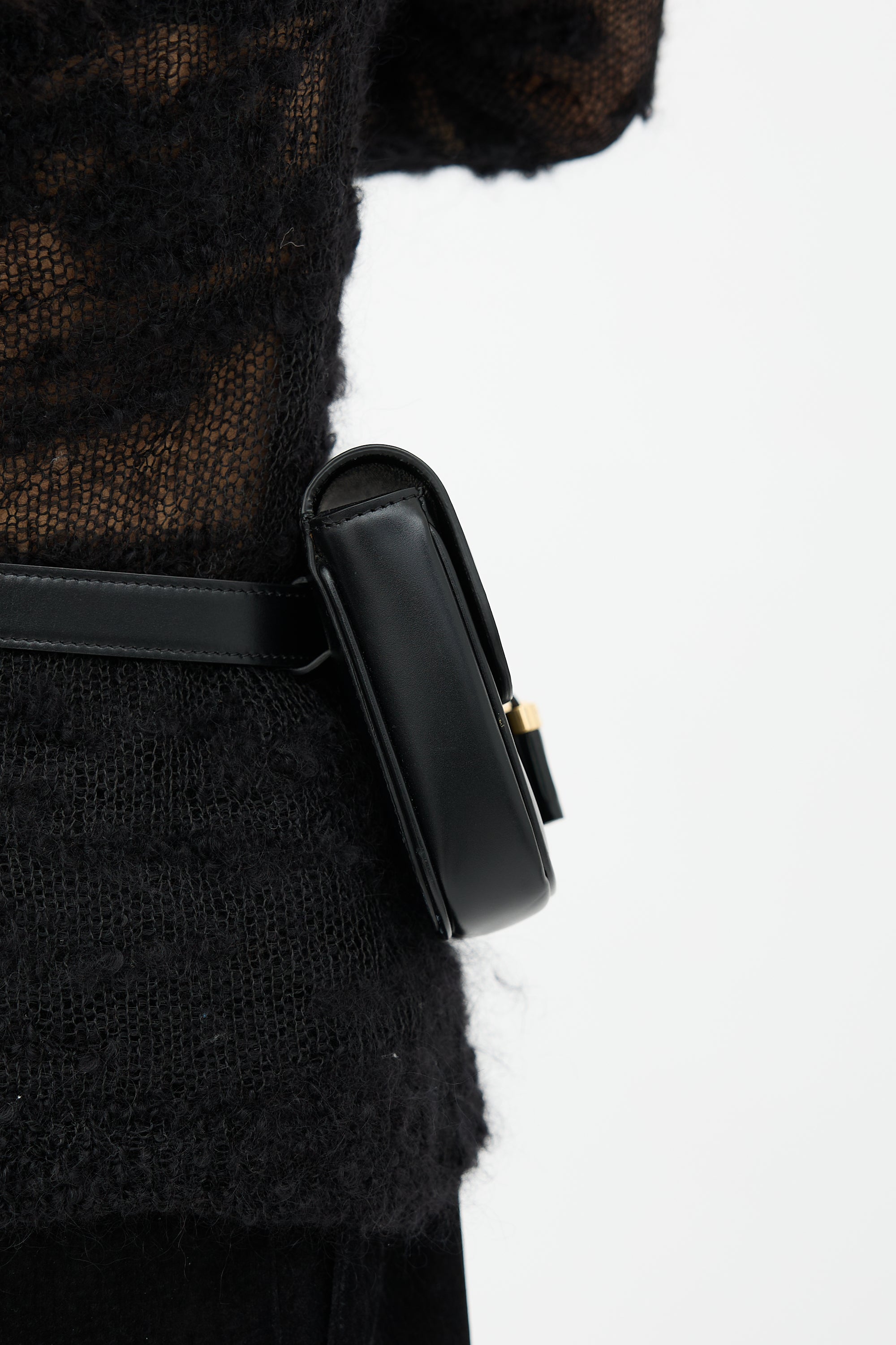 Pre-owned Celine black leather Tassel belt bag featuring gold tone hardware, adjustable belt strap, front flap with tassel details and magnetic closure, gold stamped logo under flap, and one main compartment with four card slots.