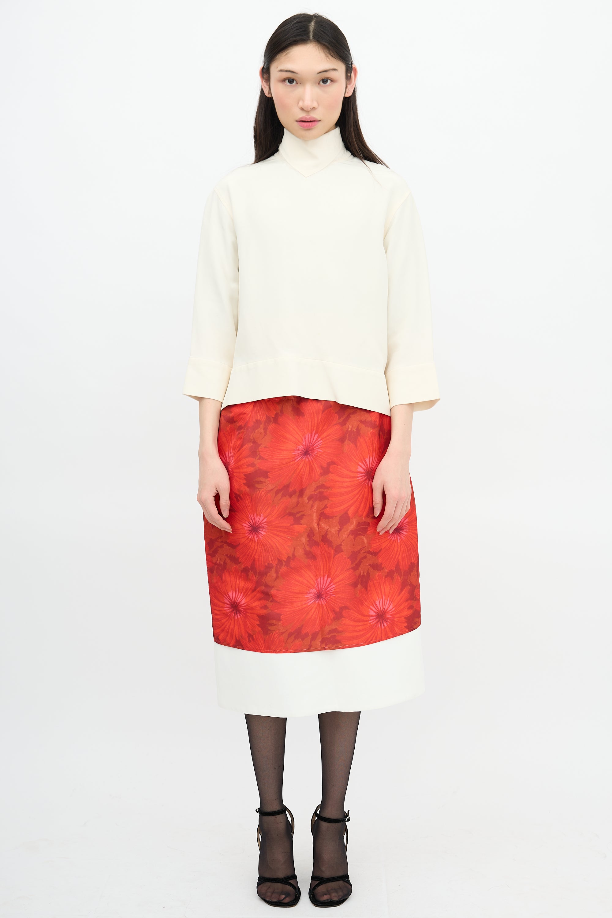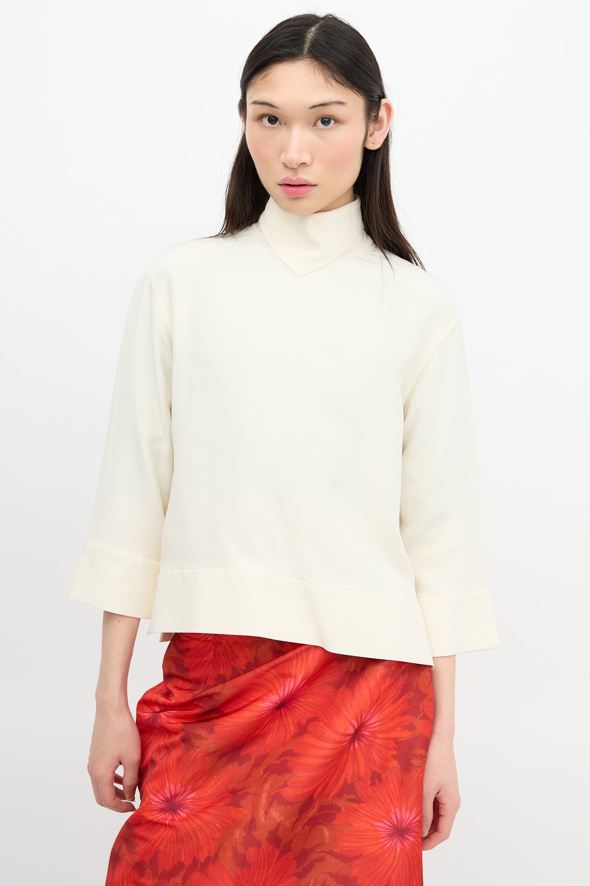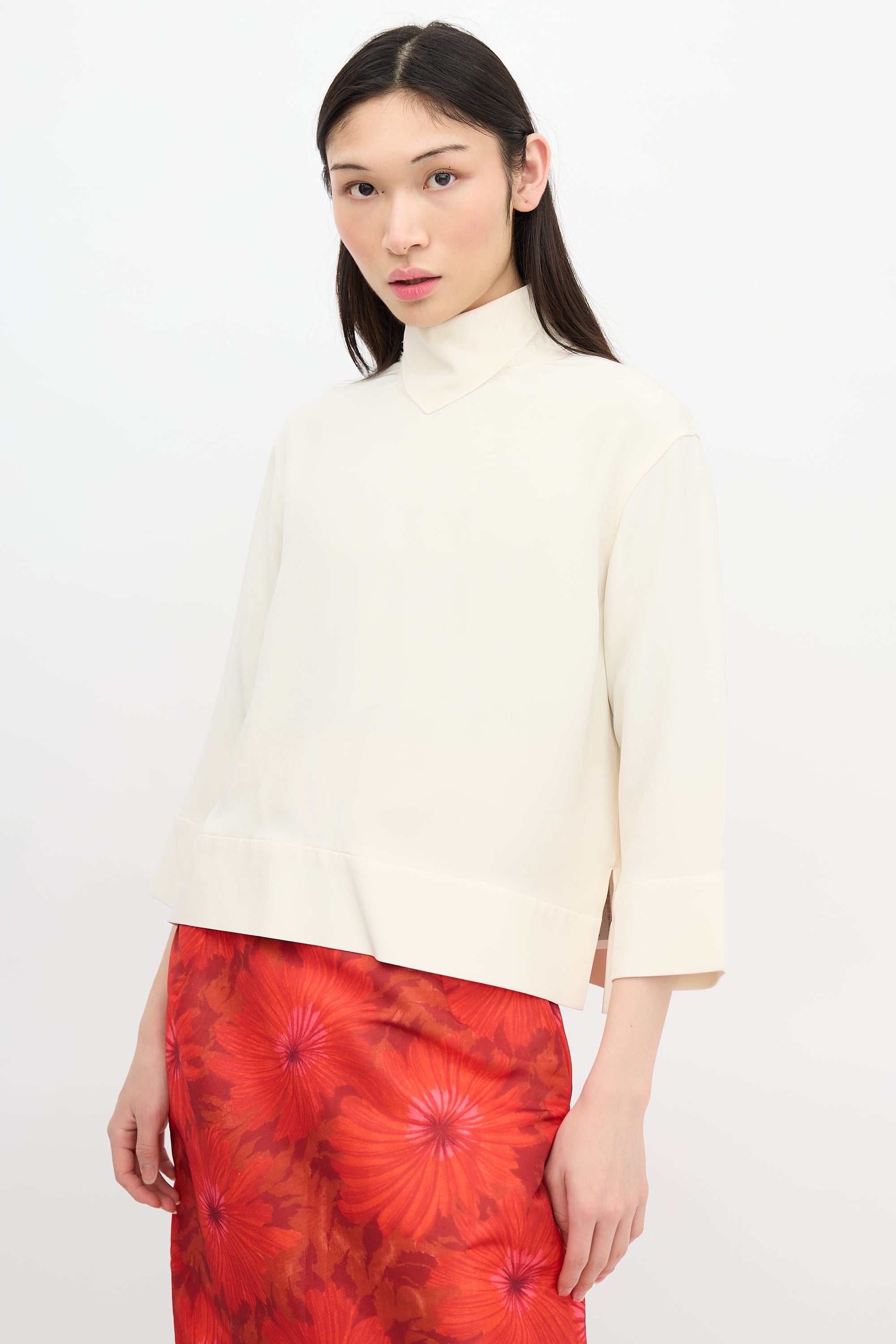 Pre-owned Celine cream mulberry silk top featuring a fringe trim stand collar with pointed front, sheer underlayer, concealed back zip, and side vents.