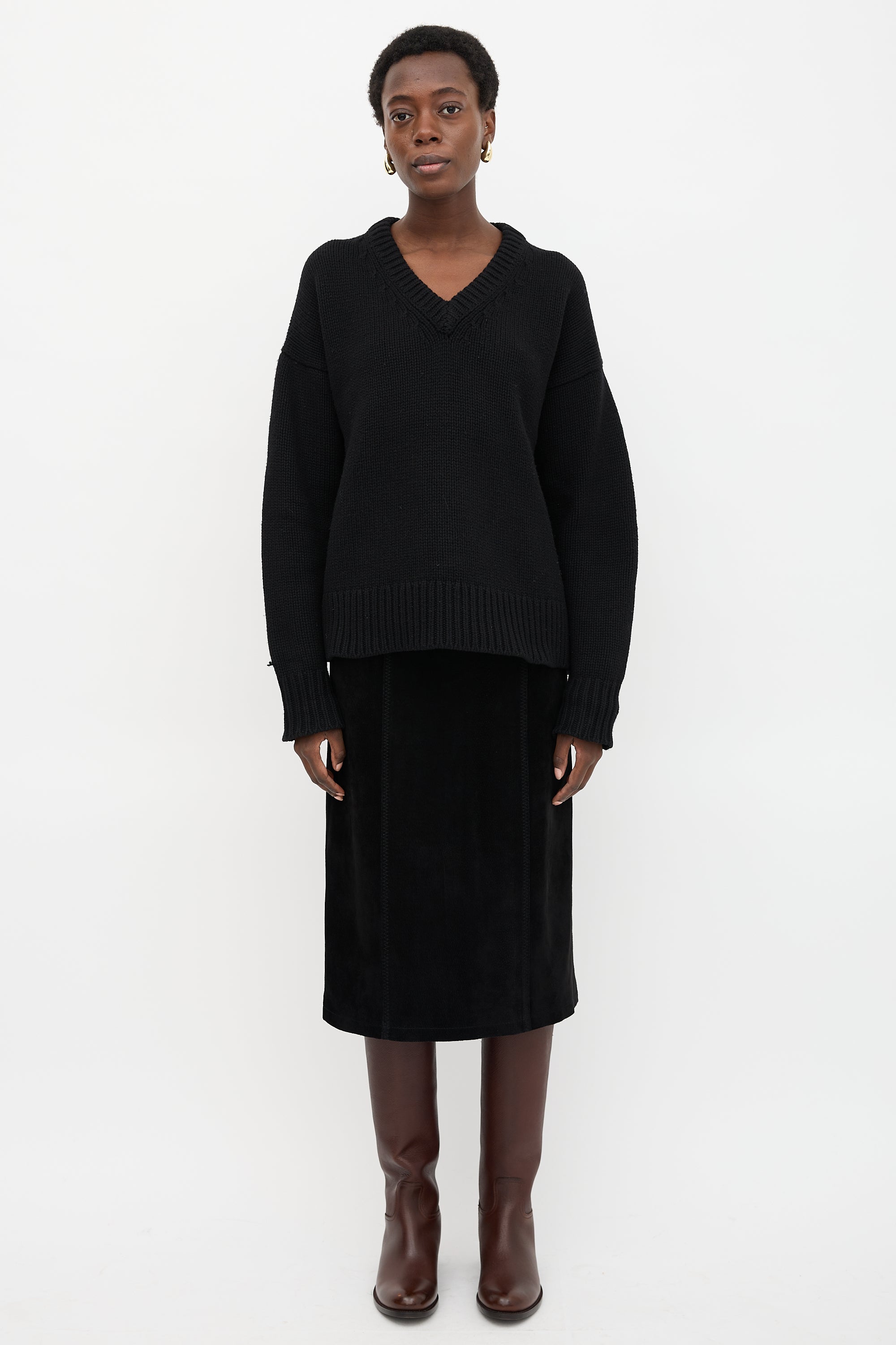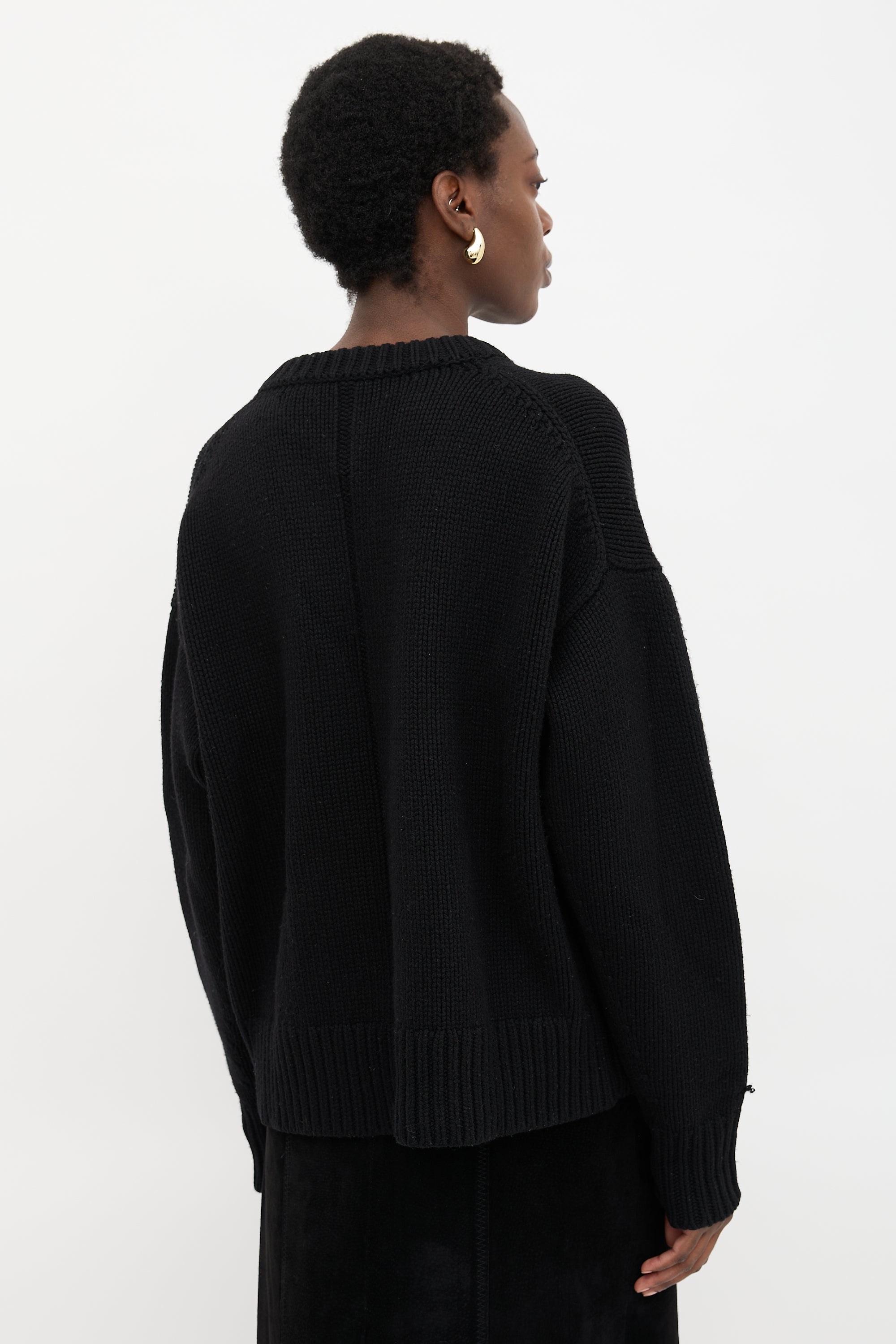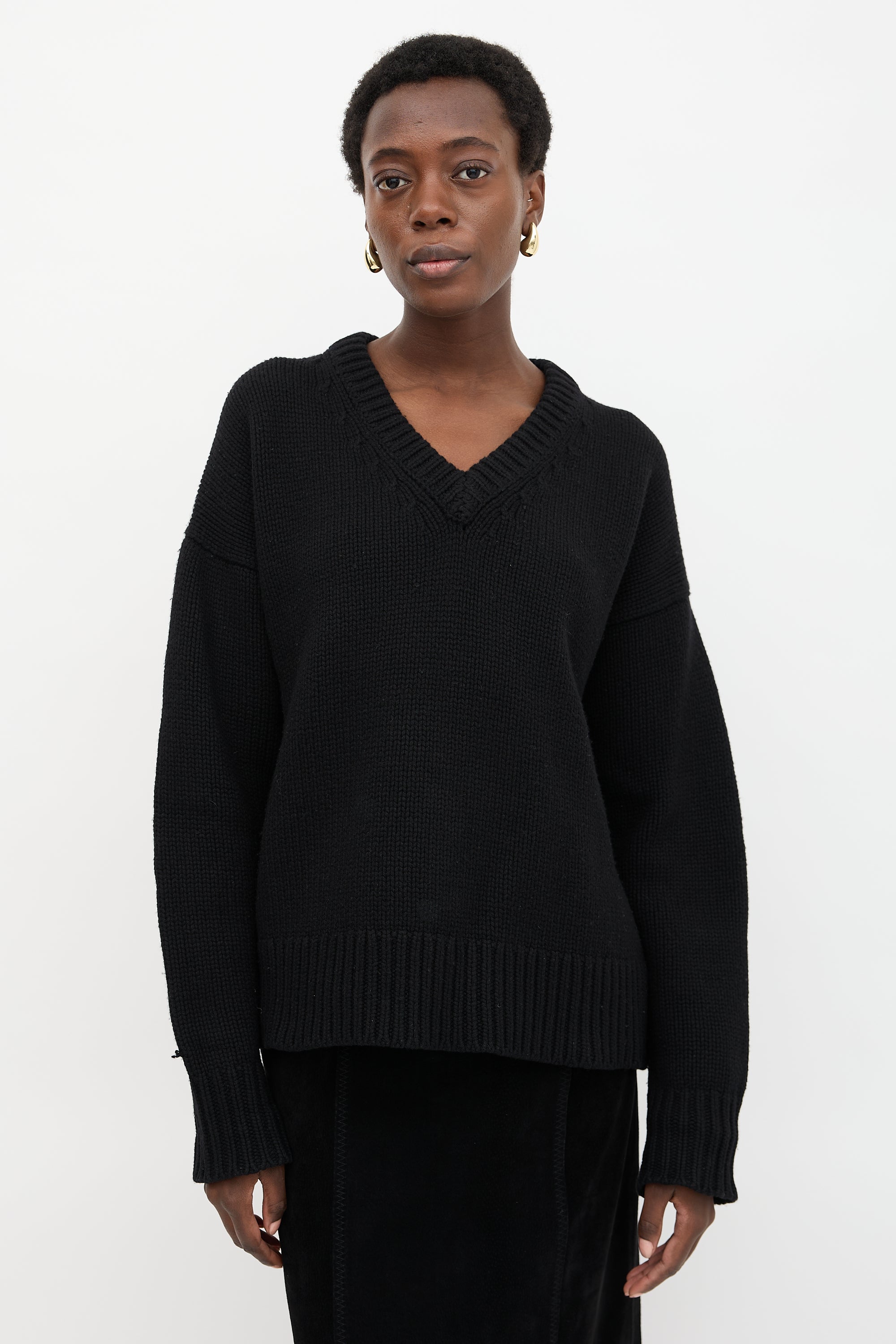 Pre-owned The Row black wool and cashmere Davion sweater featuring V-neckline, centre back stripe detail, and ribbed collar, hem, and cuffs.