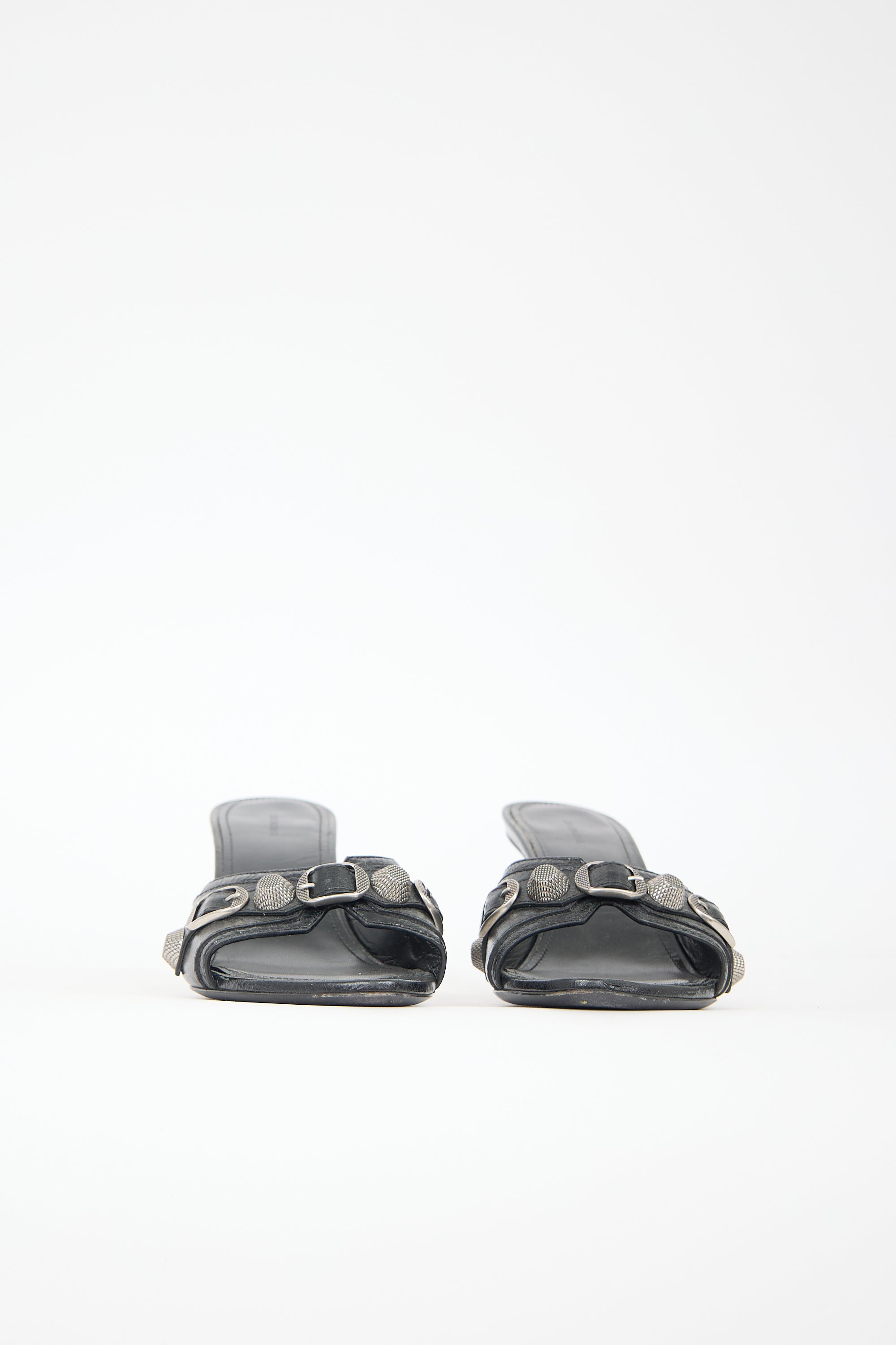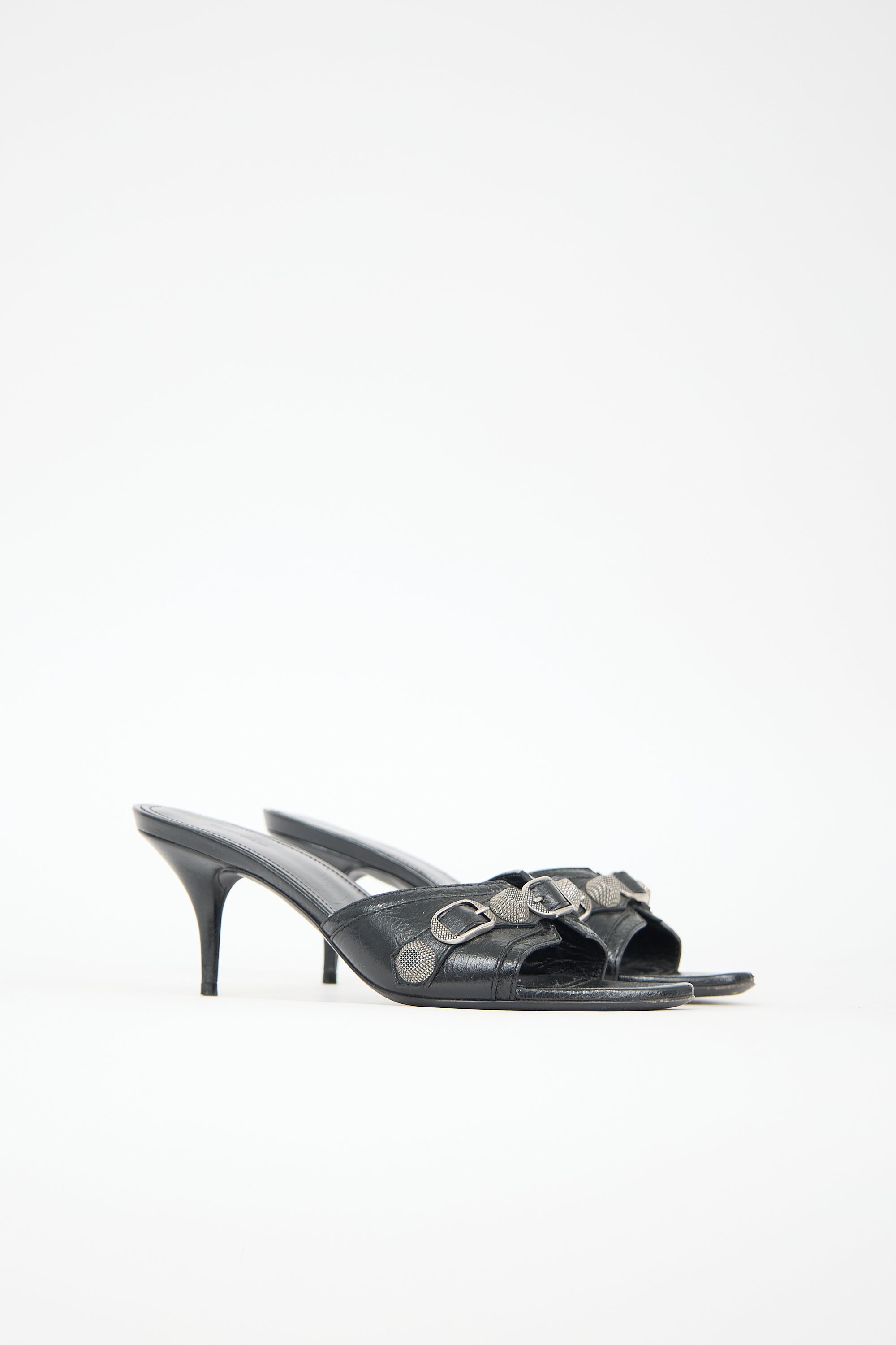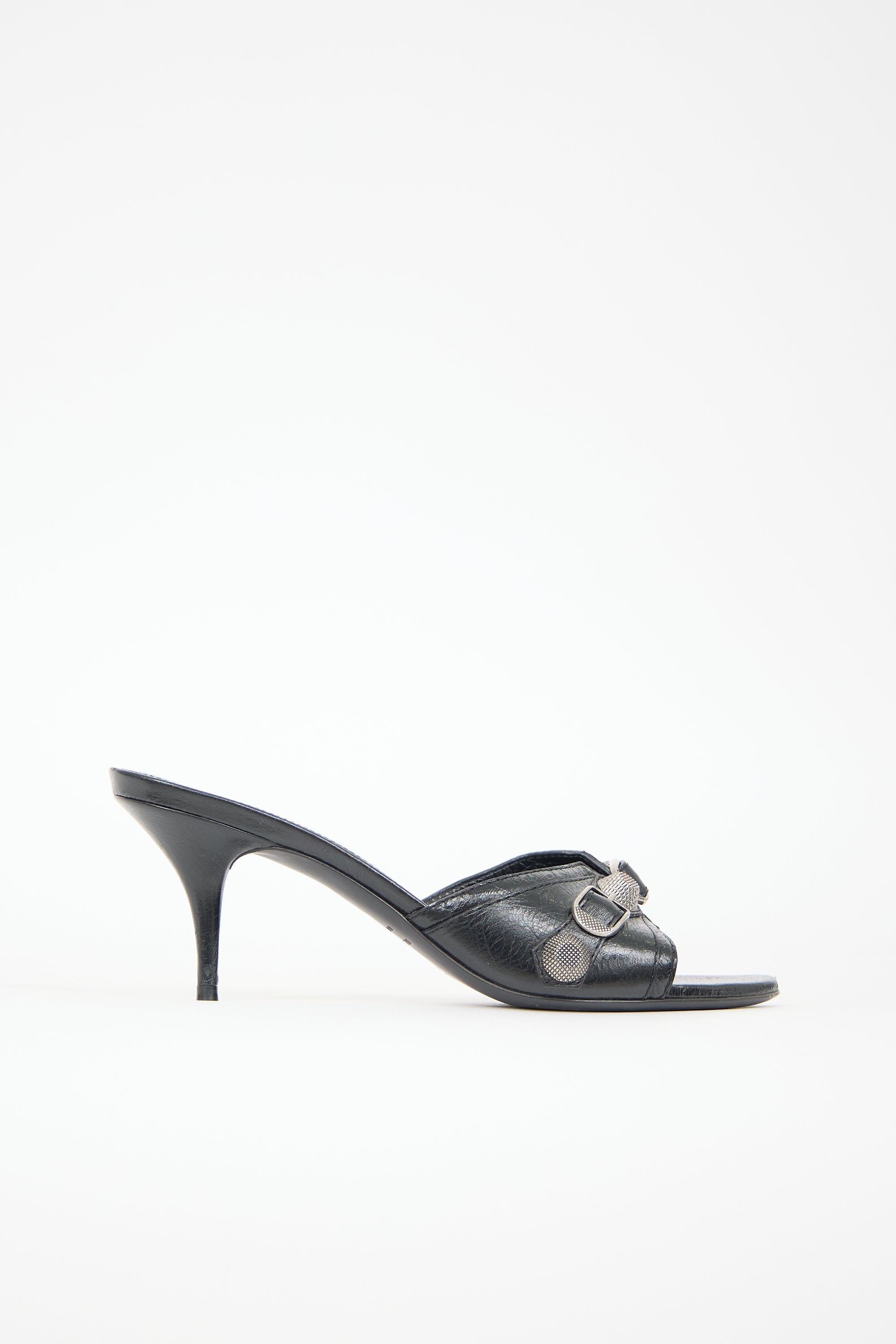Pre-owned Balenciaga black leather mules featuring rounded toe, Cagole stud embellished vamp strap, and covered kitten heel.