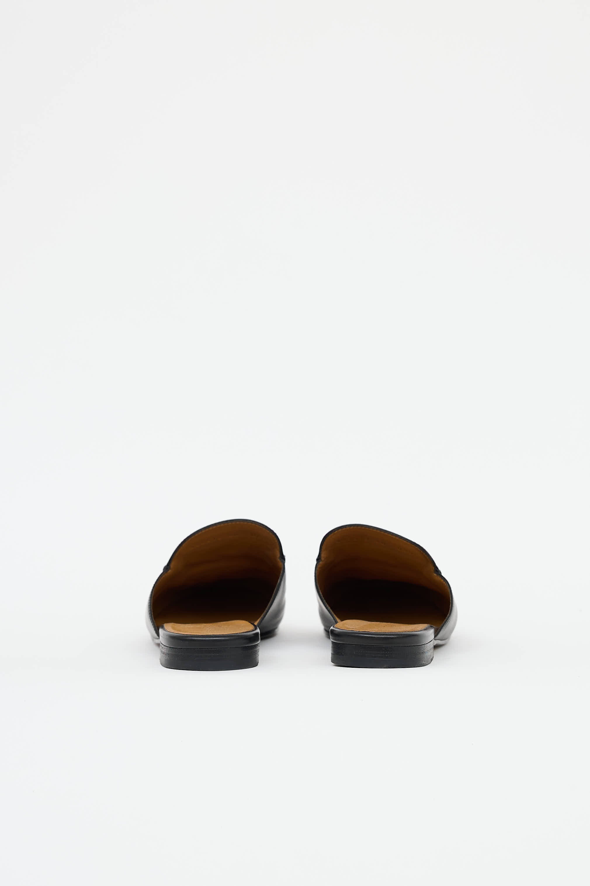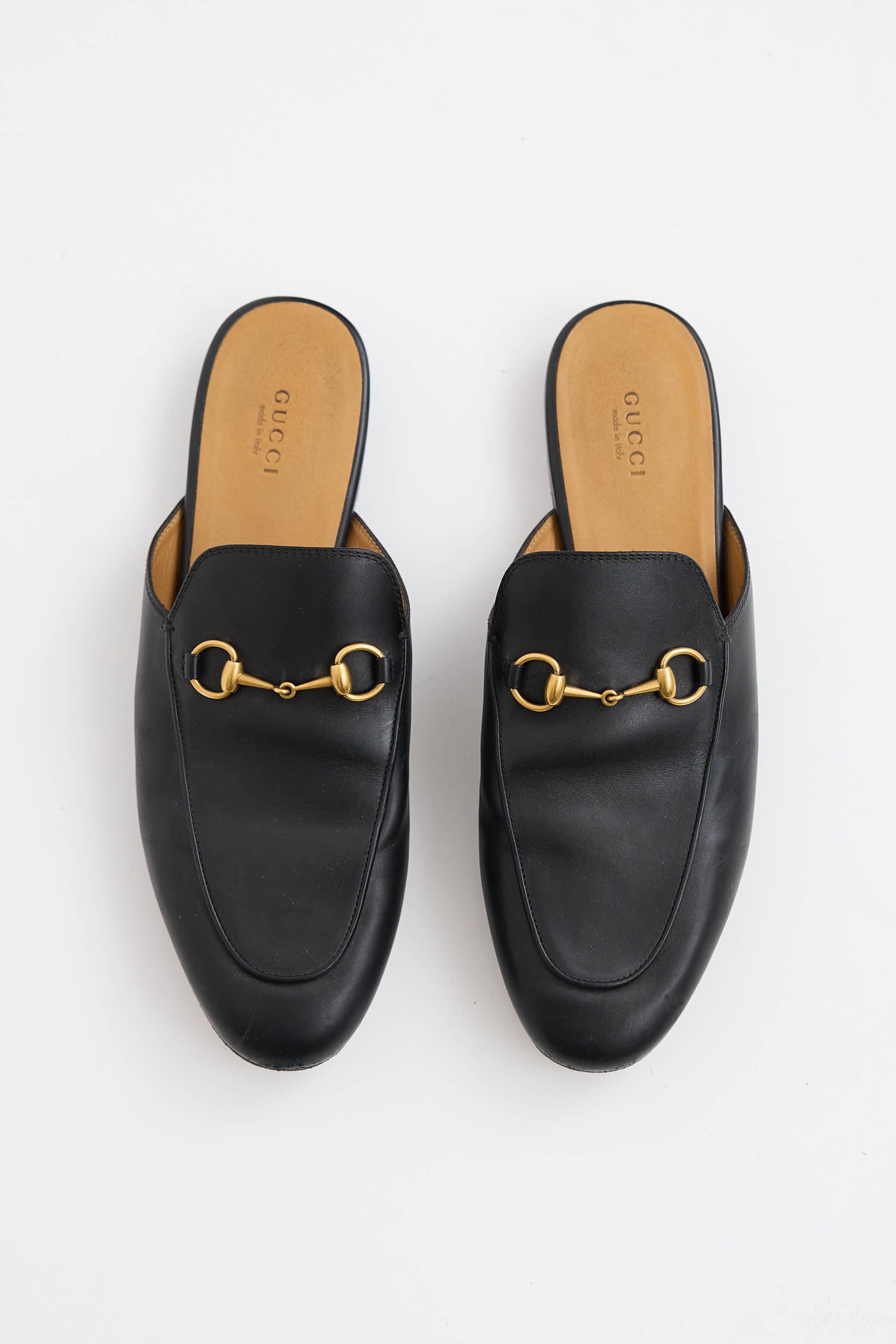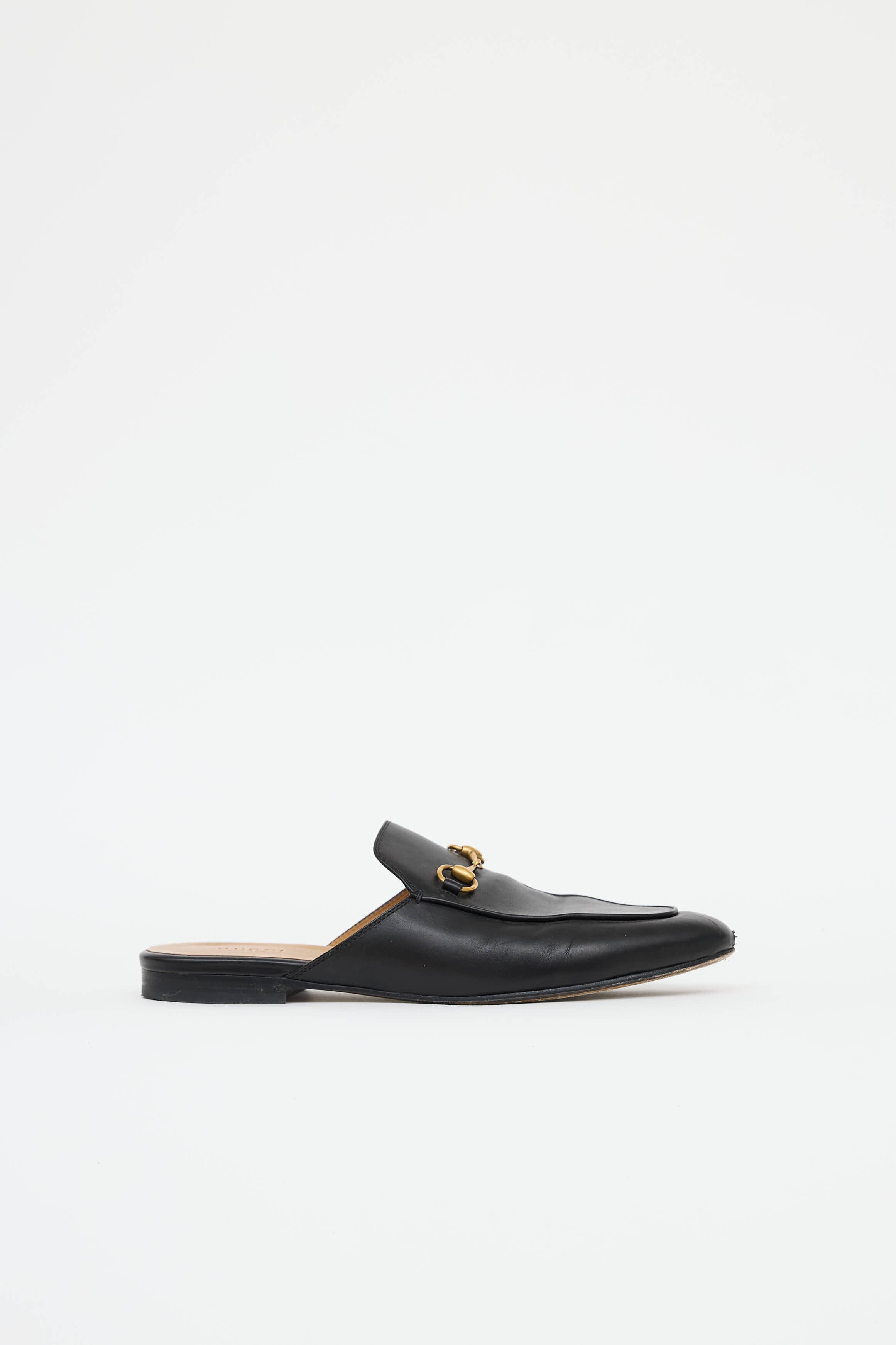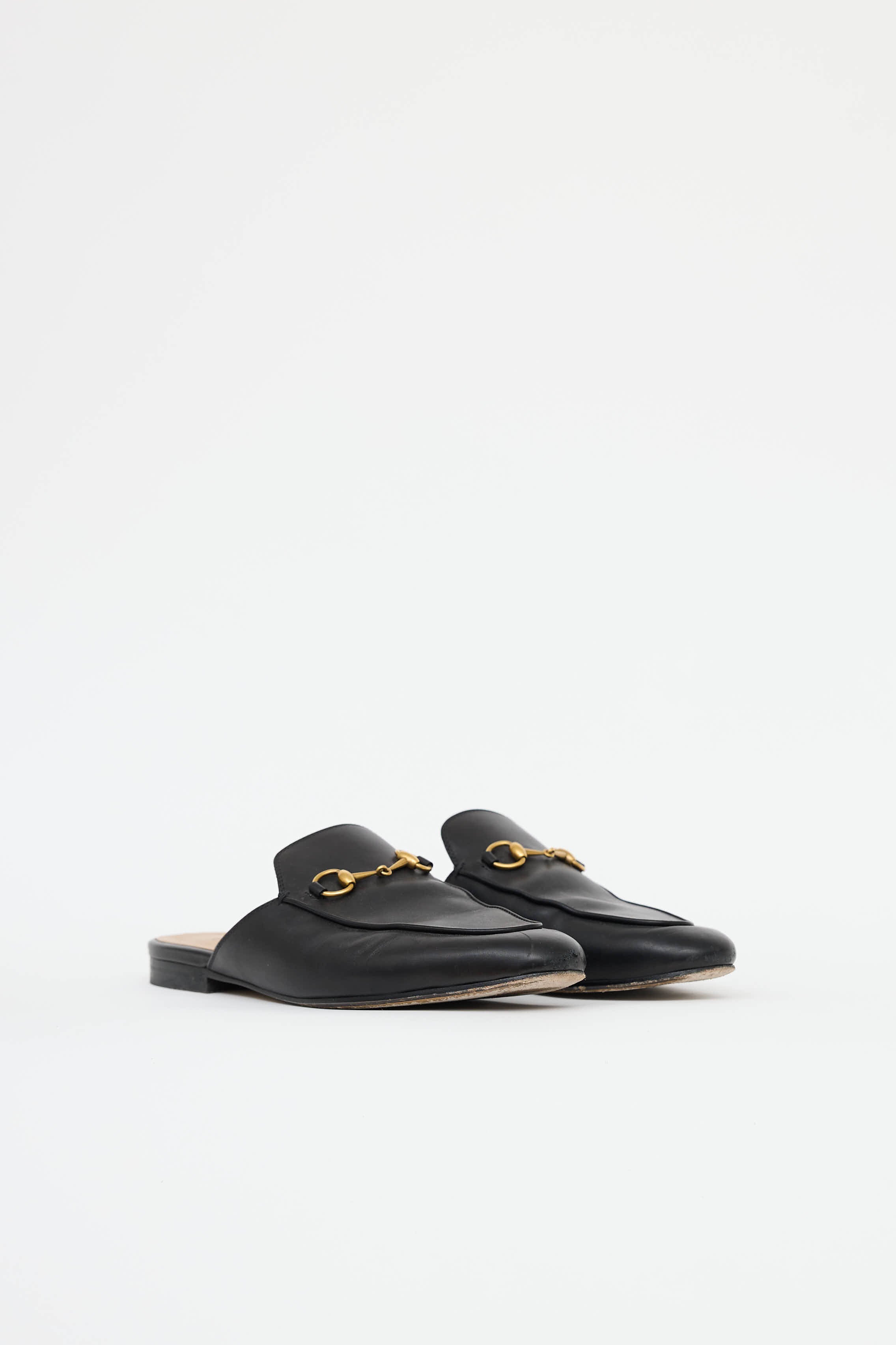 Pre-owned Gucci black leather Princetown mules featuring an almond toe, slip on entry, gold tone Horse bit across vamp, and a small stacked heel.