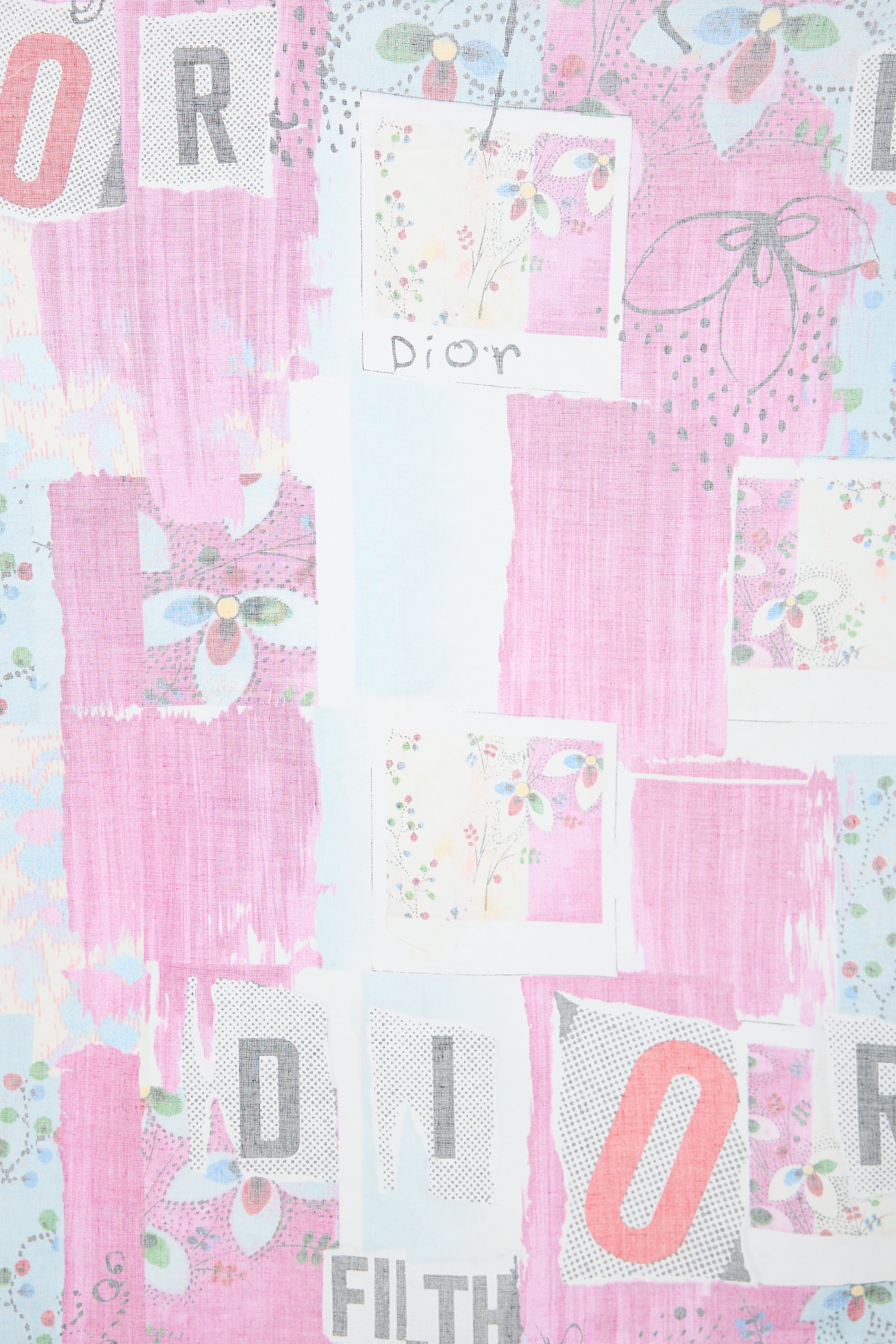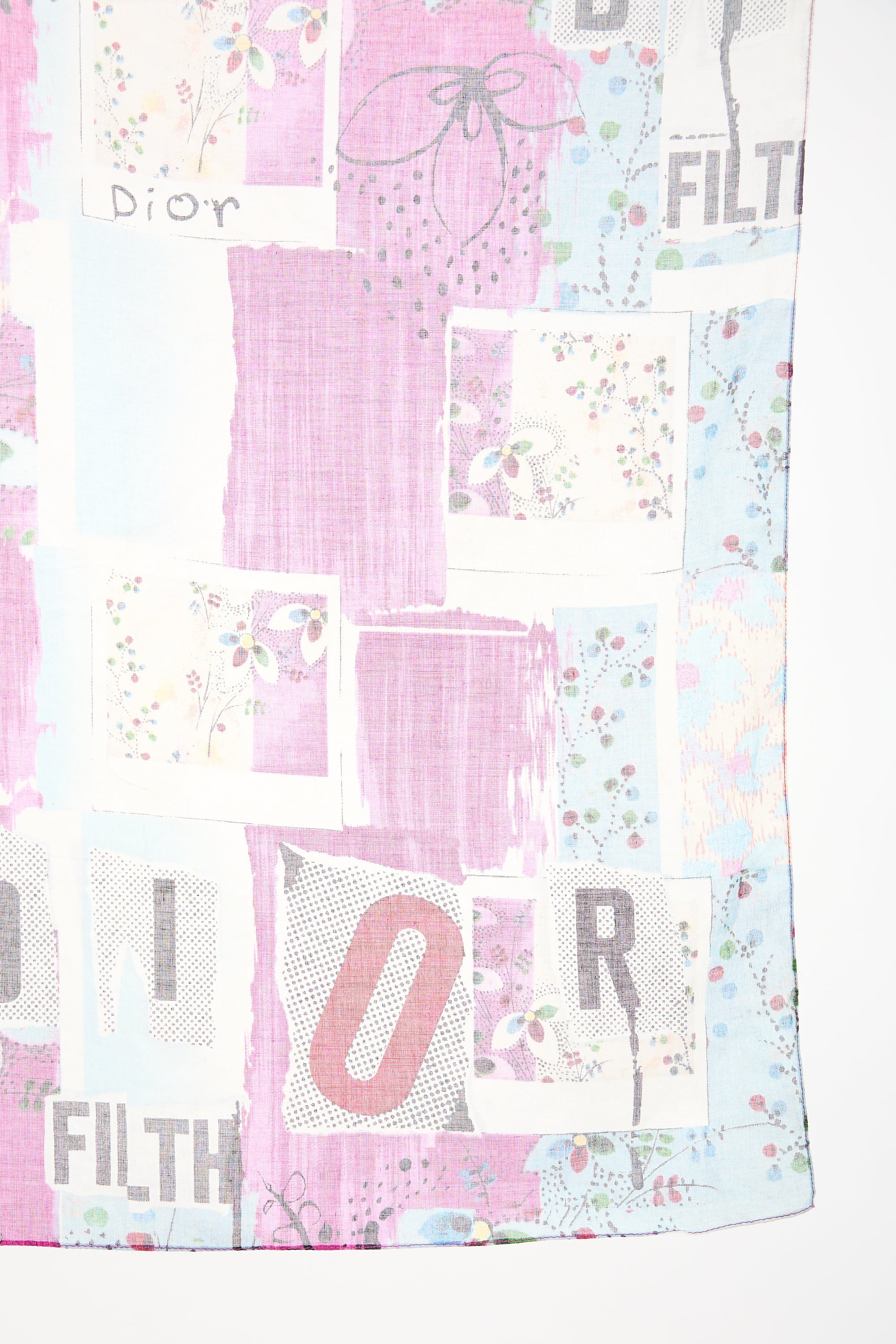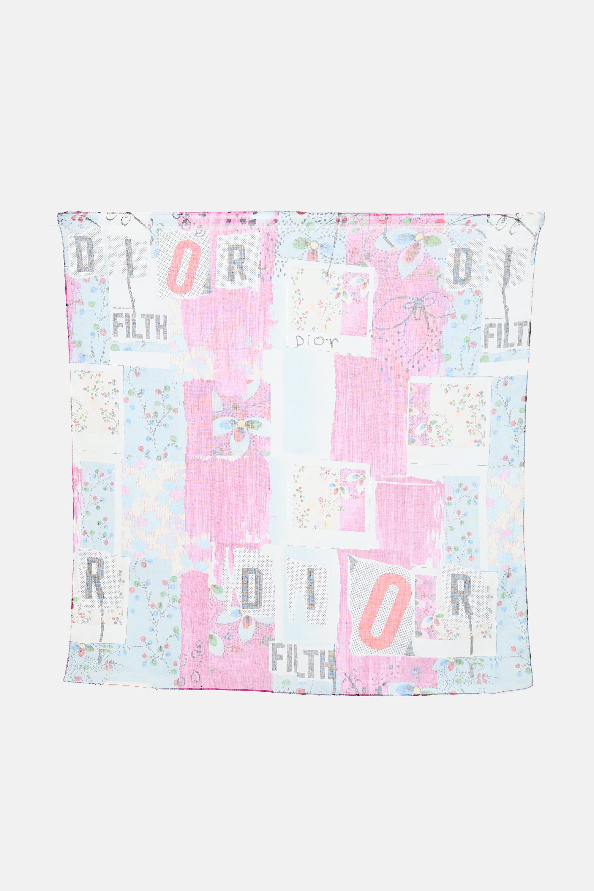 Pre-owned Dior SS 2003 pink , blue, and multicolour cotton scarf featuring mixed floral print, scrapbook motif logo, and "Filth" graphic.
