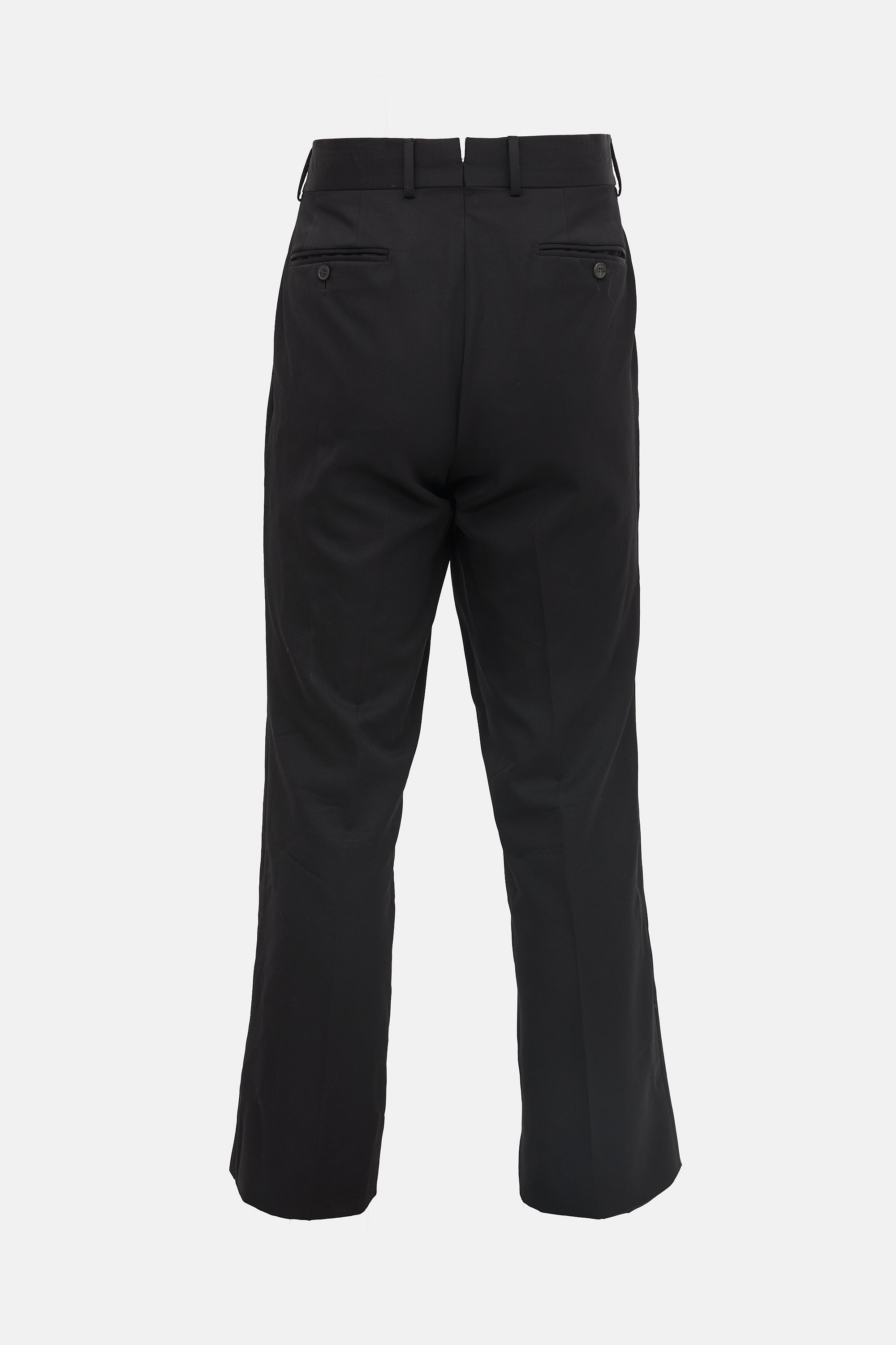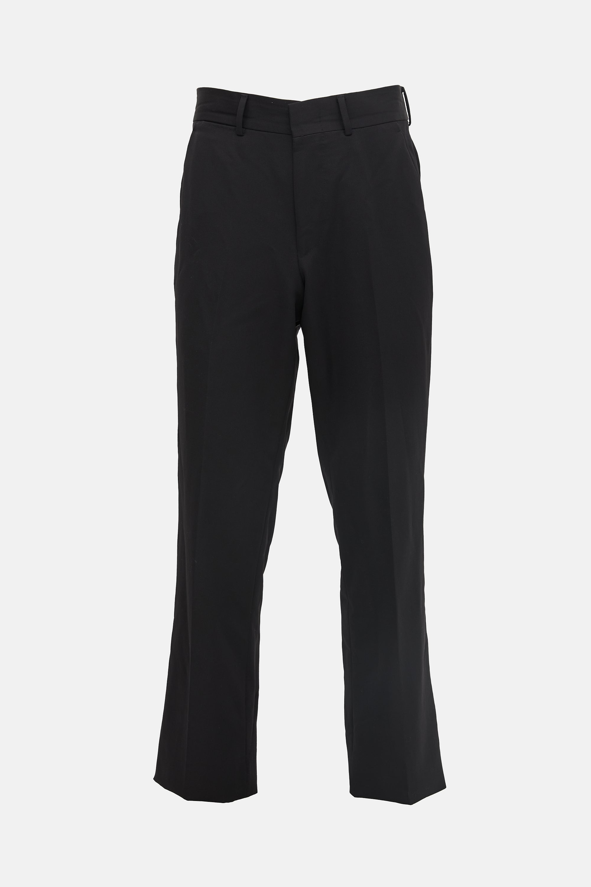 Pre-owned Gucci black trousers featuring a zip fly, belt loops, four pocket styling, pressed seams, V-cut back waist, and a straight leg.