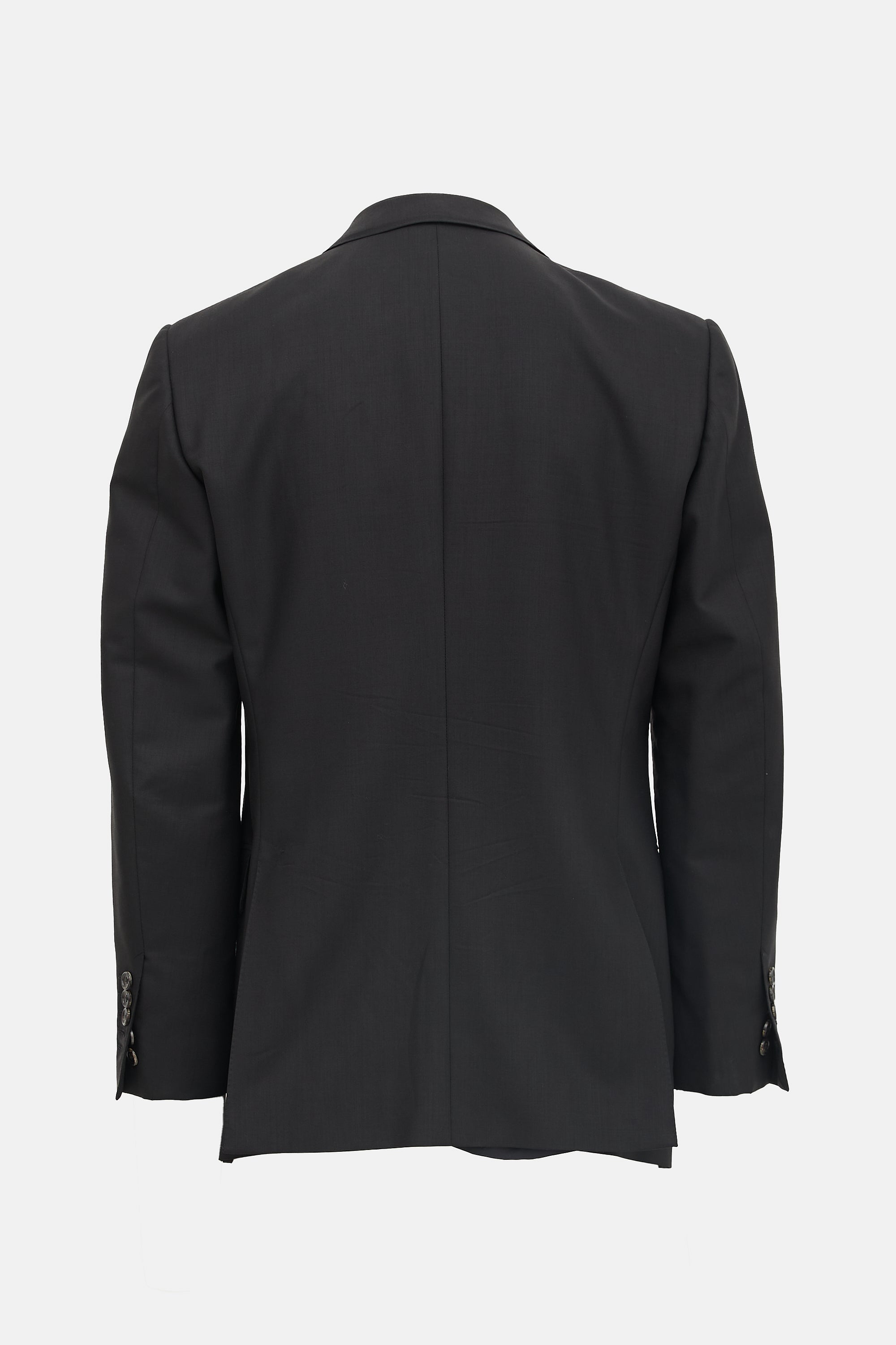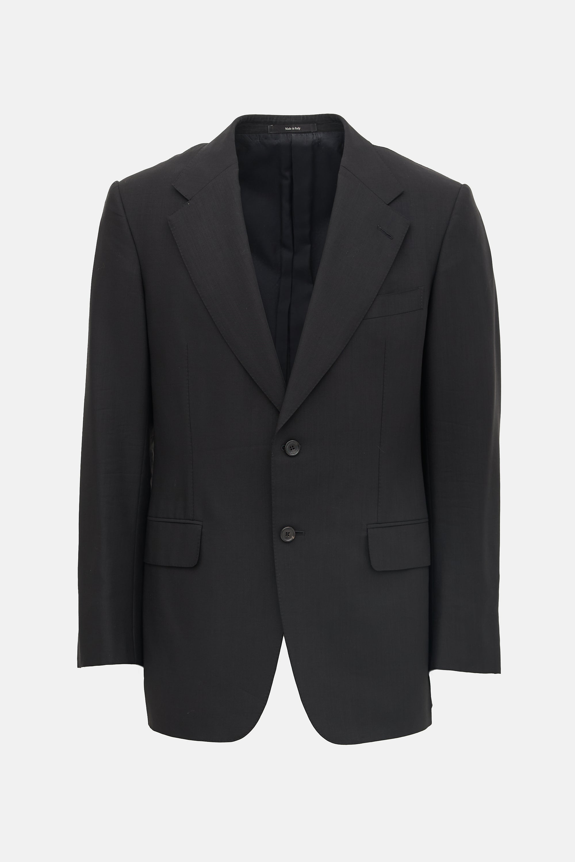 Pre-owned Gucci black wool and mohair blend blazer featuring notched lapel, single breasted. button front, welt pocket at left chest, two flap pockets at hip, back double vents, padded shoulders, and buttoned cuffs. Lined.