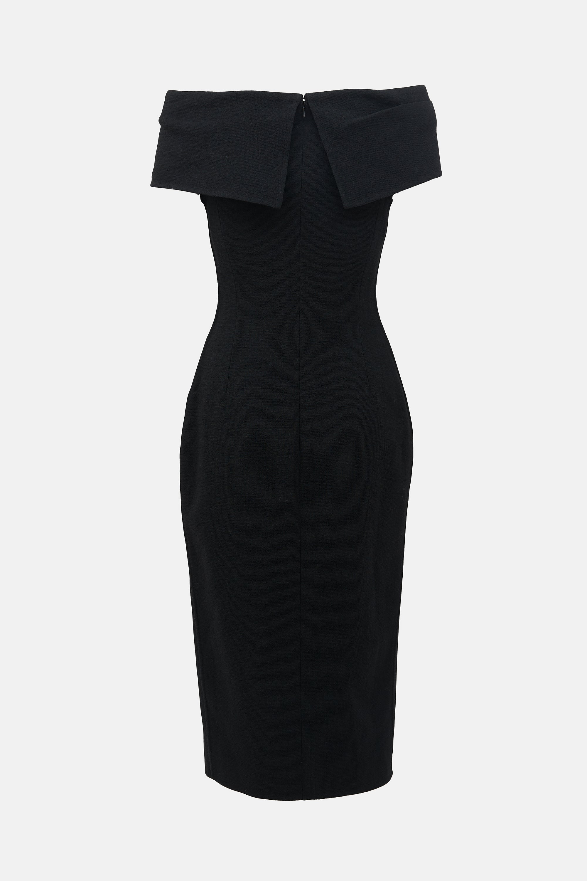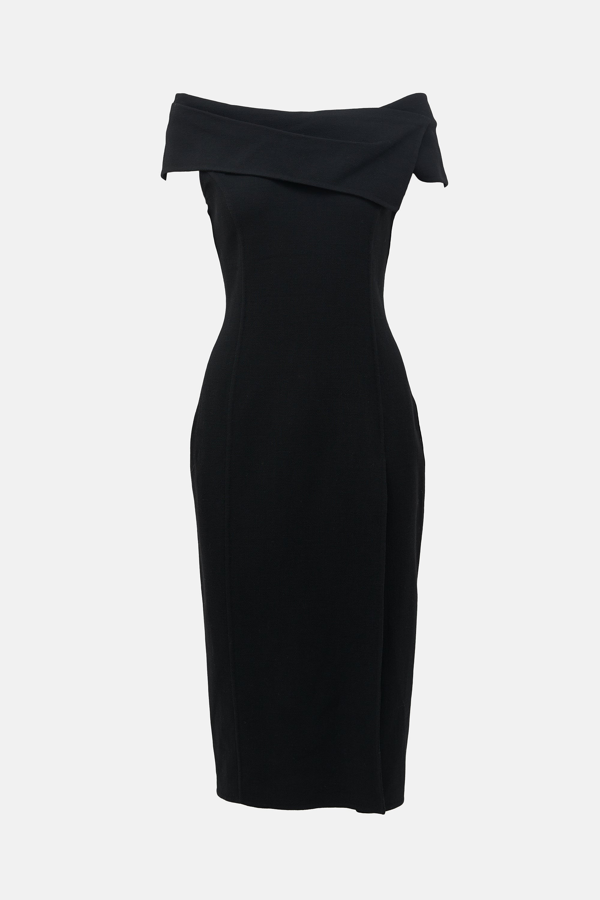 Pre-owned Oscar de la Renta black wool midi dress featuring an off the shoulder design, fold over neckline, back zip closure, piped seams, and front leg slit. Lined.