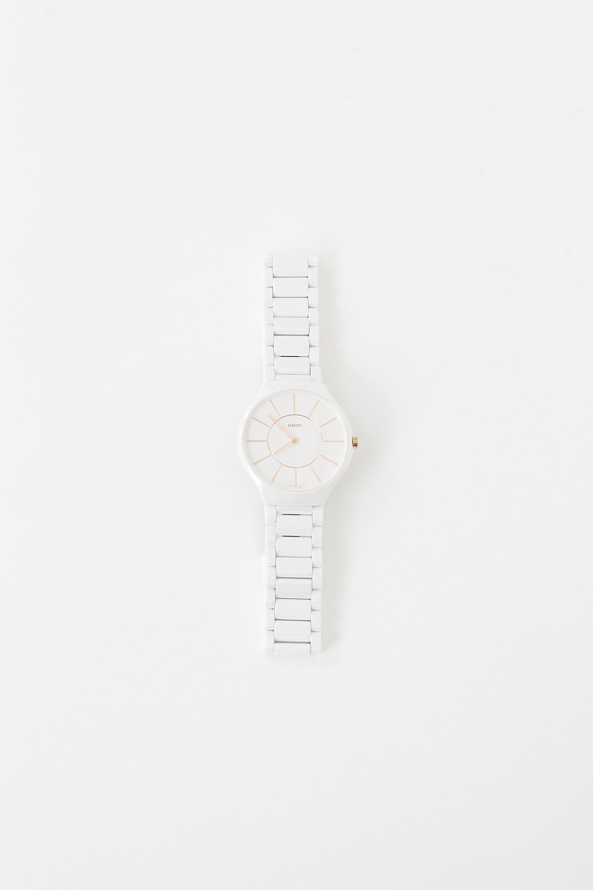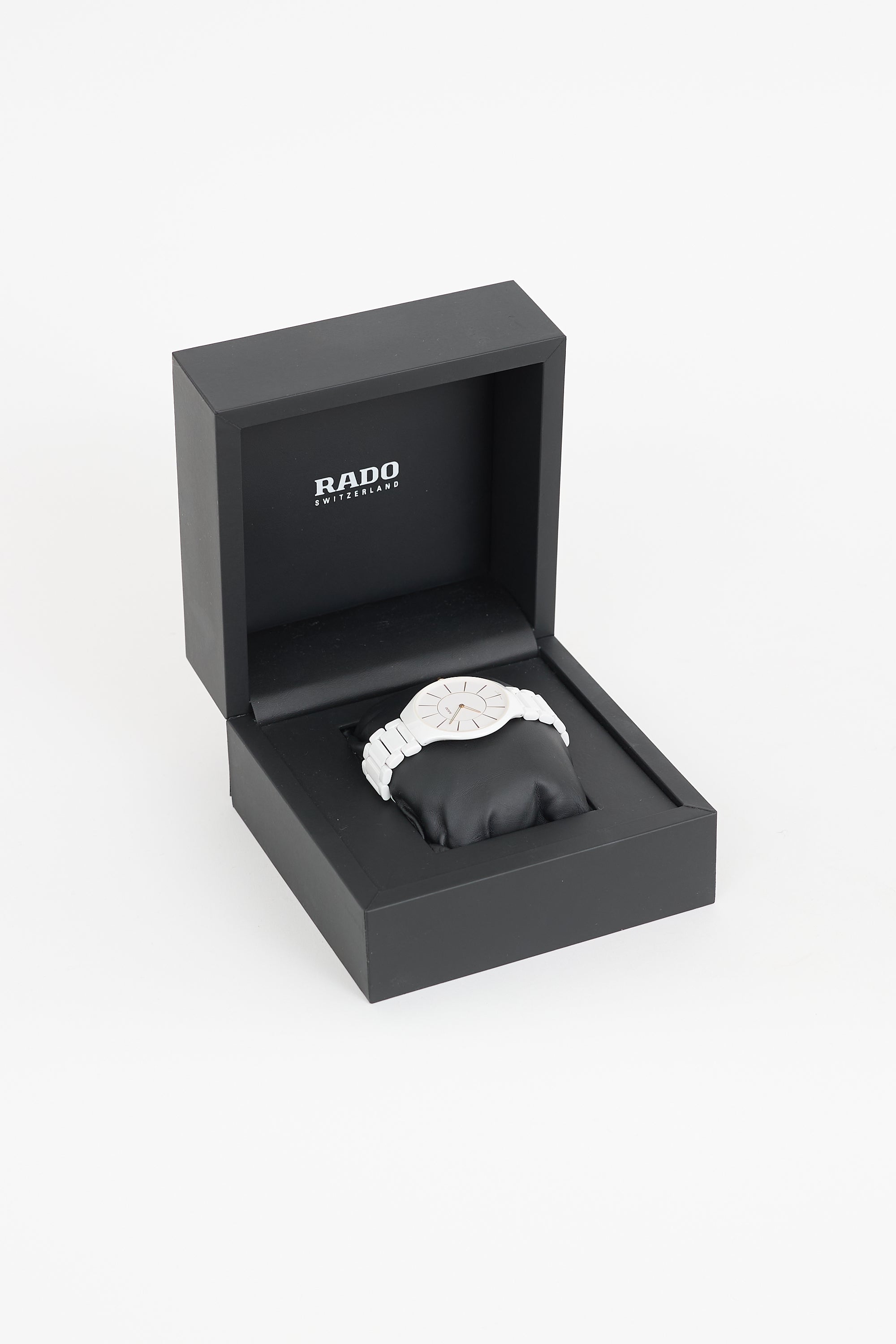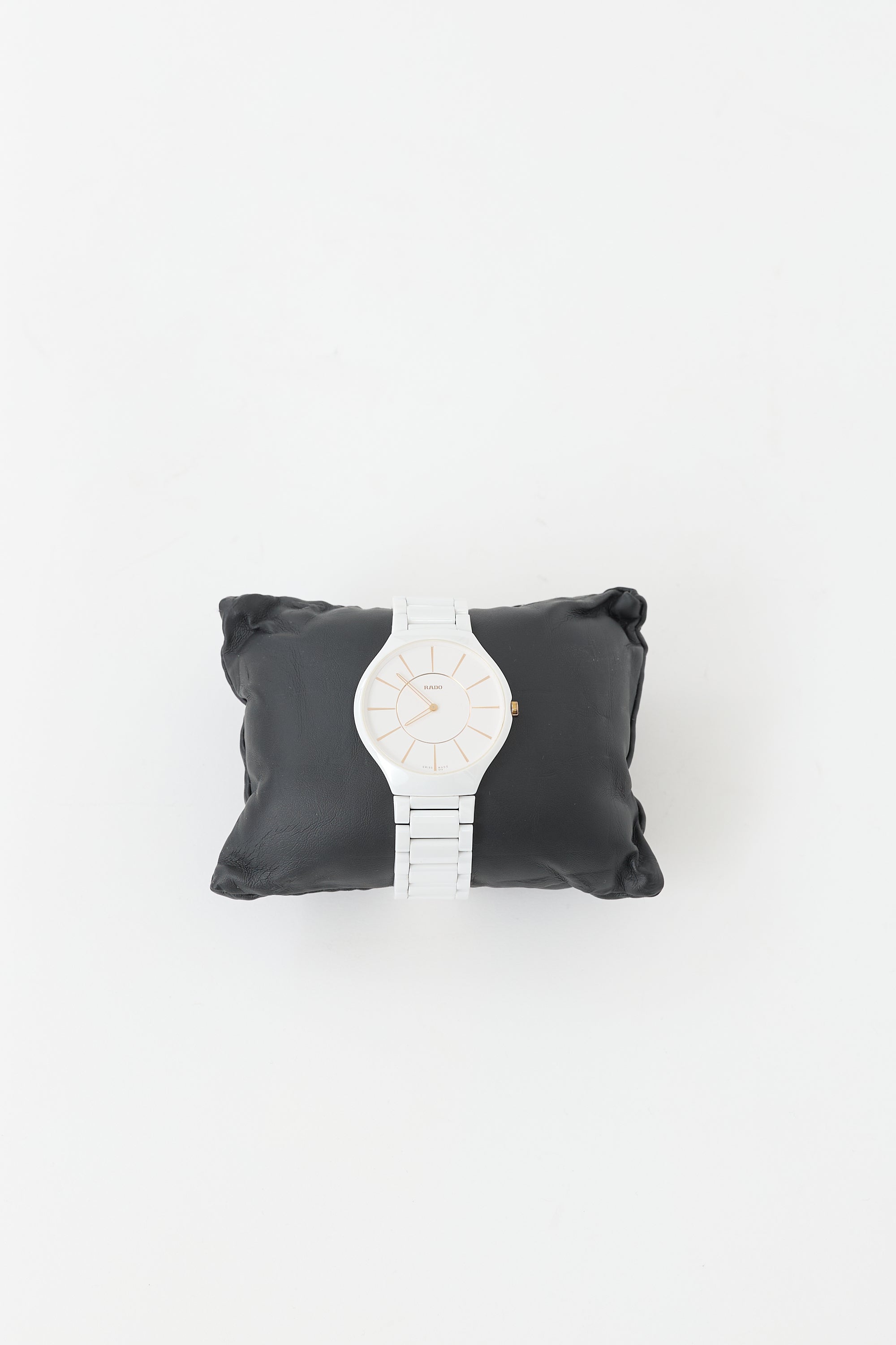 Pre-owned Rado white ceramic True Thinline watch featuring gold tone hardware, gold dial, tonal crystal, quartz movement, sheen bracelet, and deployant clasp. Includes original box, leather card holder, and watch pillow.
