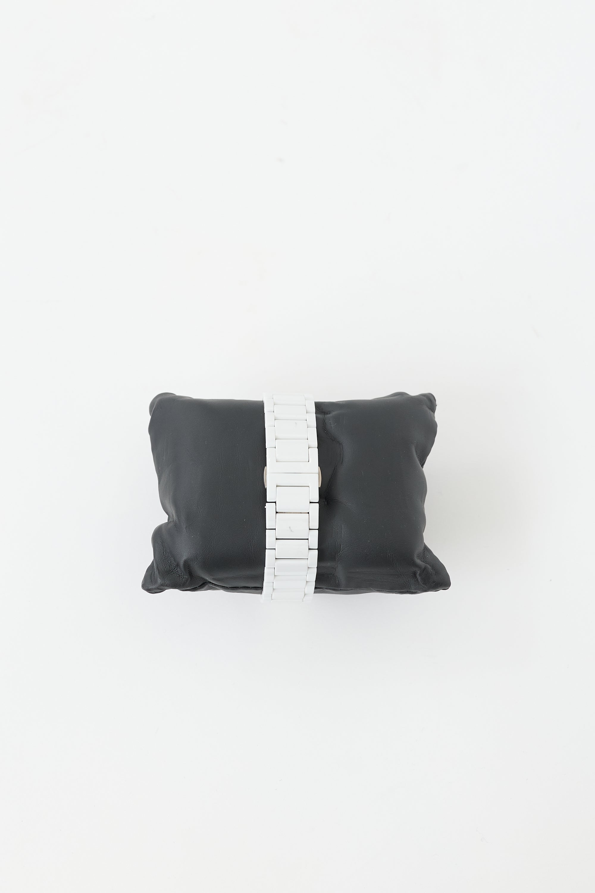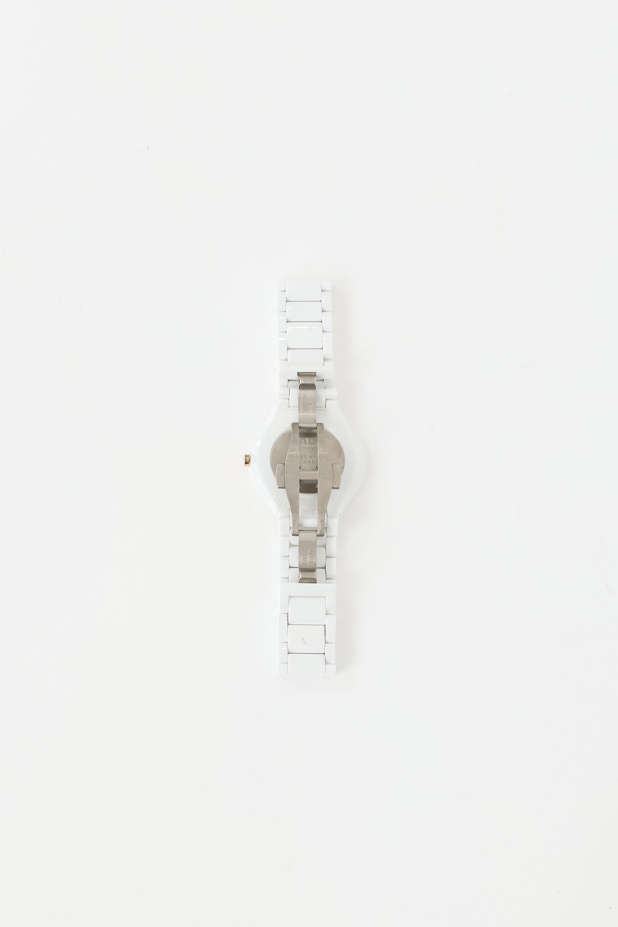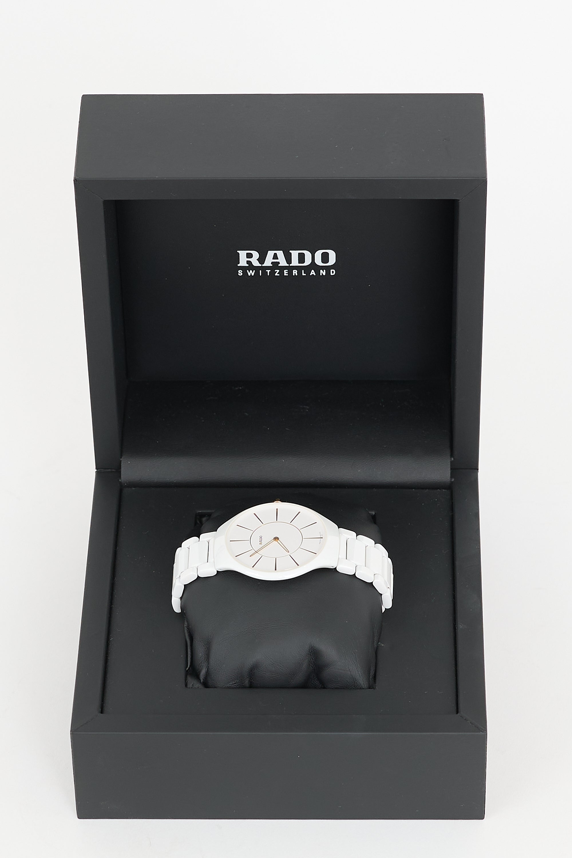 Pre-owned Rado white ceramic True Thinline watch featuring gold tone hardware, gold dial, tonal crystal, quartz movement, sheen bracelet, and deployant clasp. Includes original box, leather card holder, and watch pillow.
