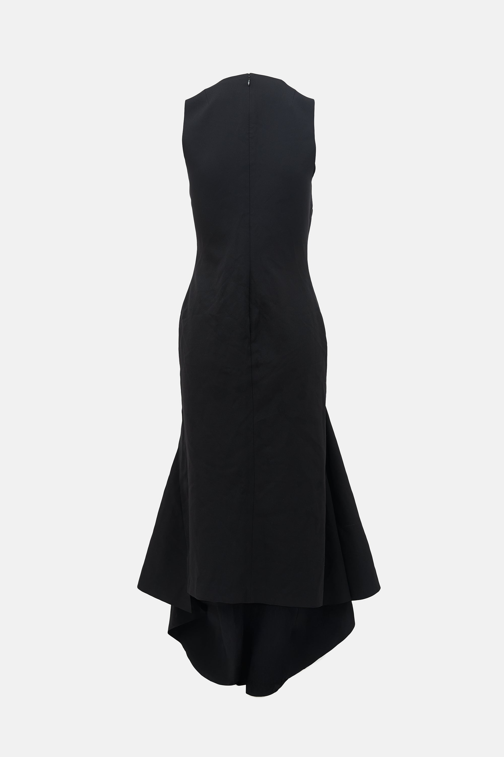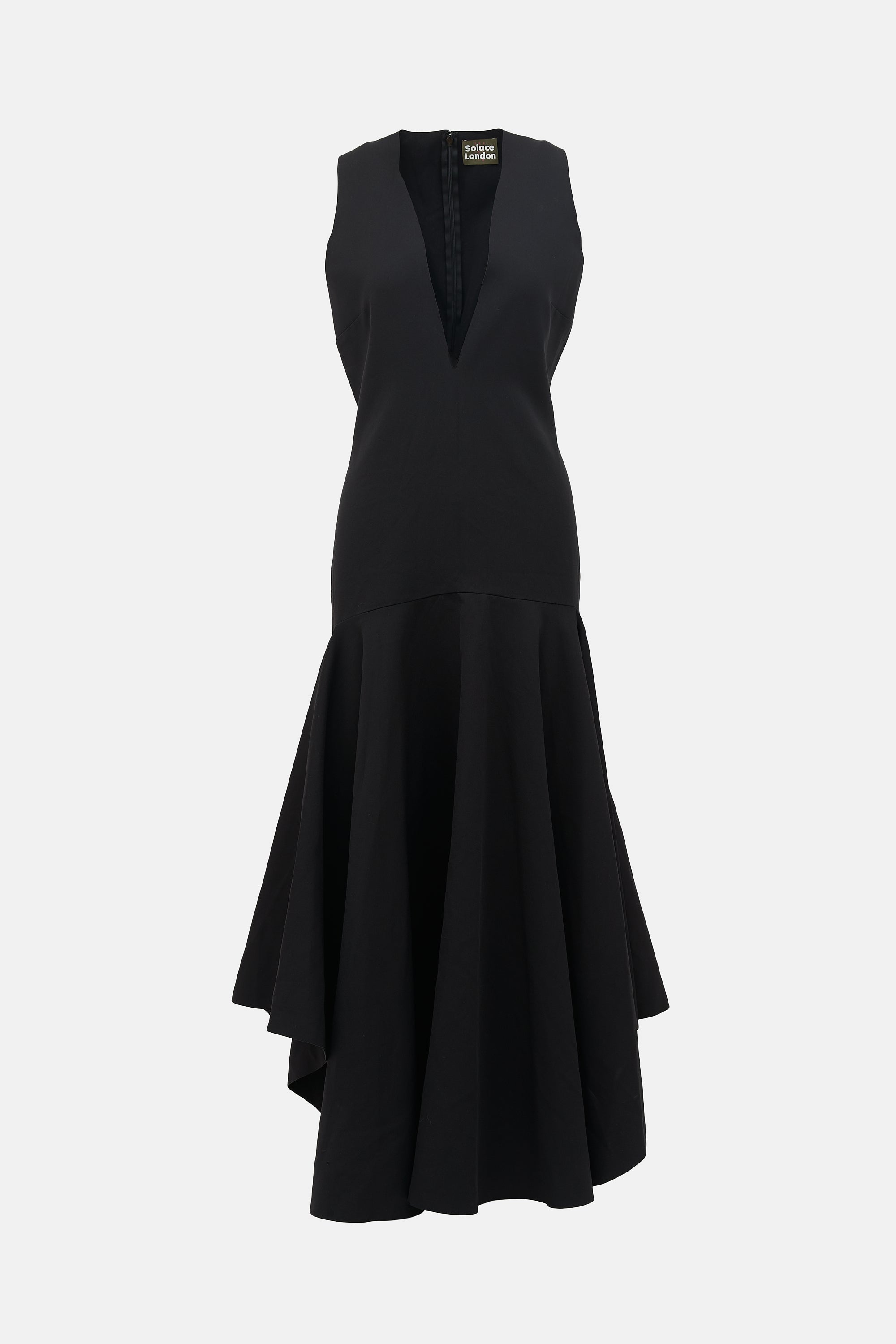 Pre-owned Solace London black crepe Santana dress featuring a V-neckline, back zip closure, darted bust, and a fitted bodice with a flounce asymmetric skirt.