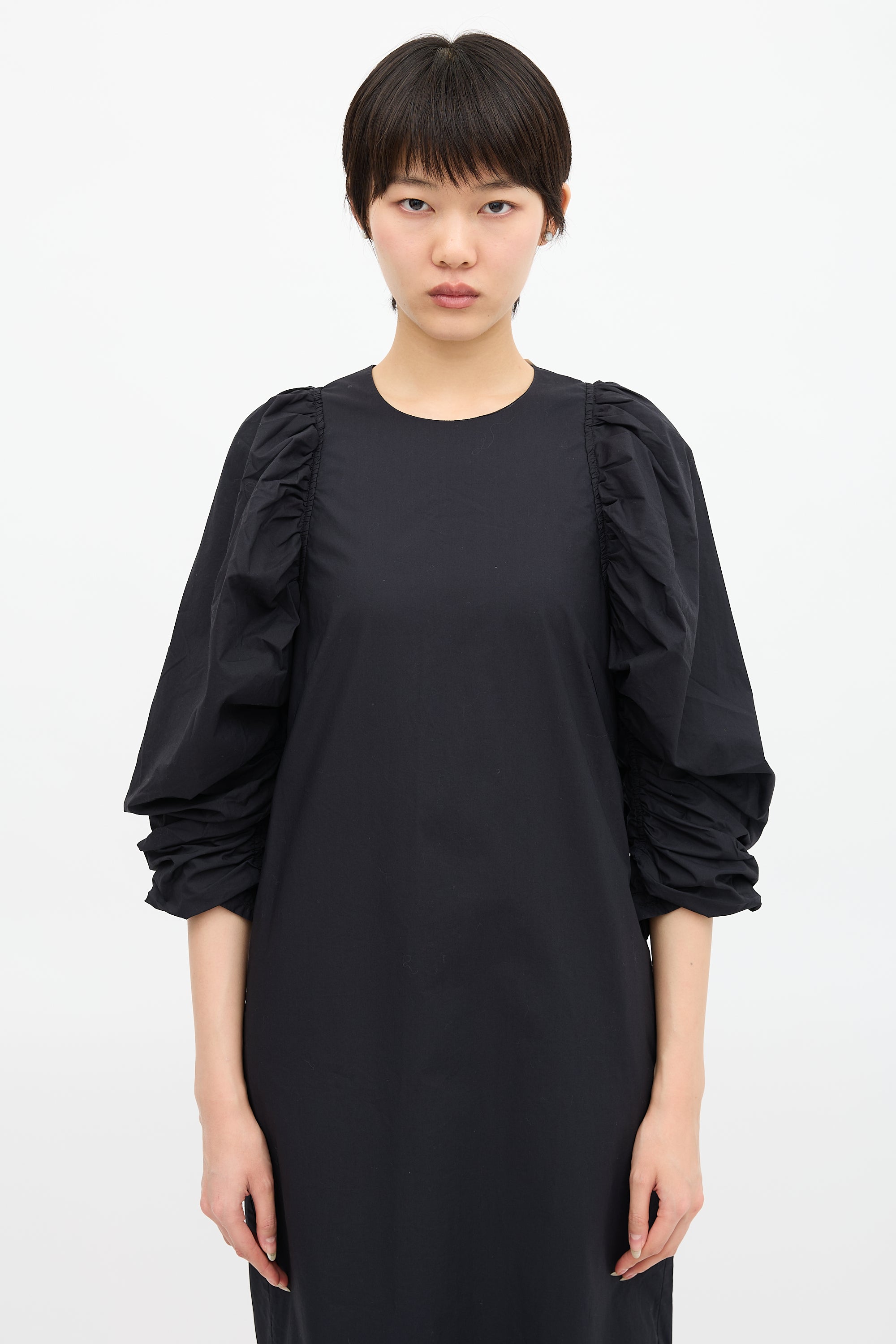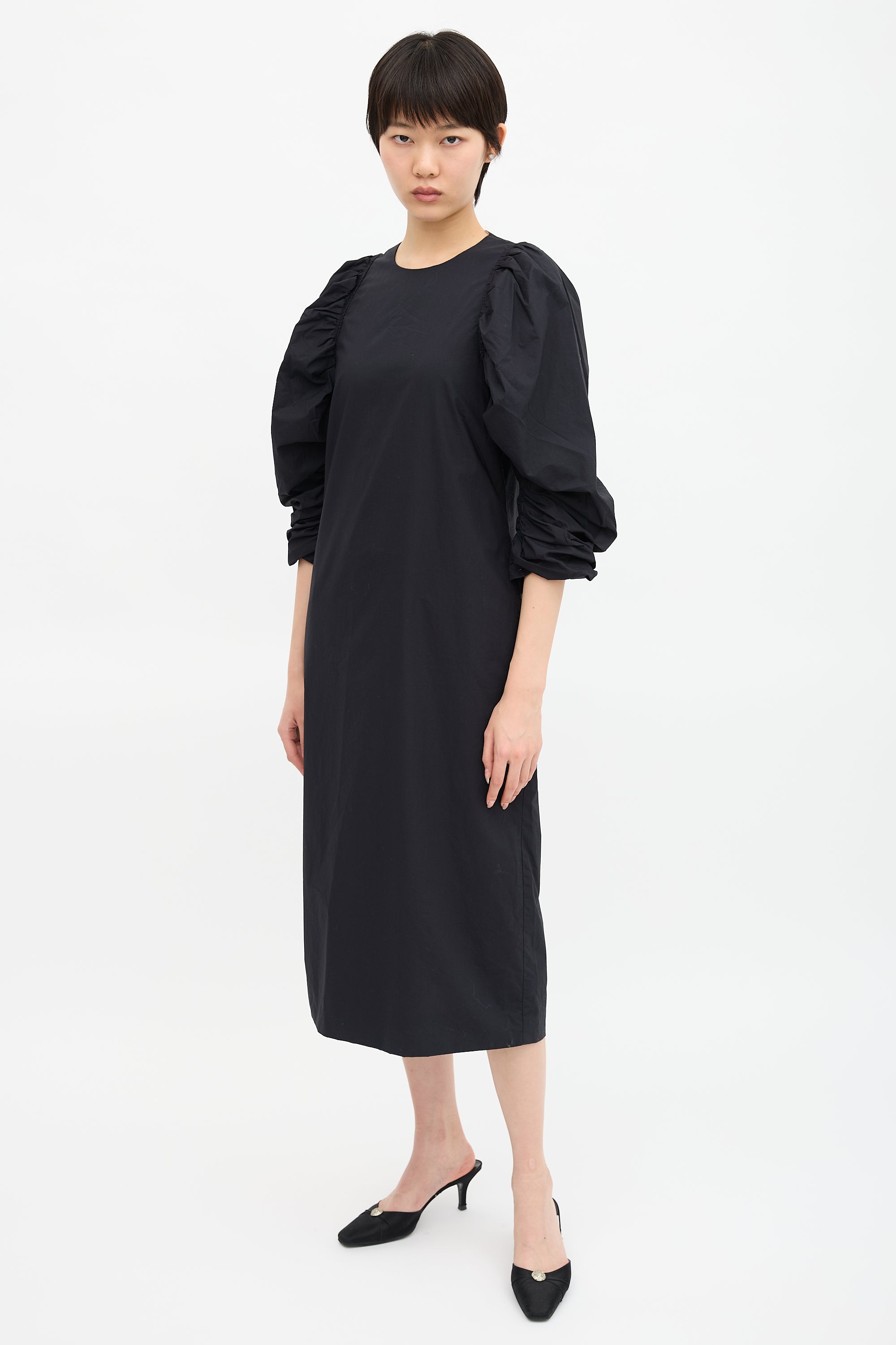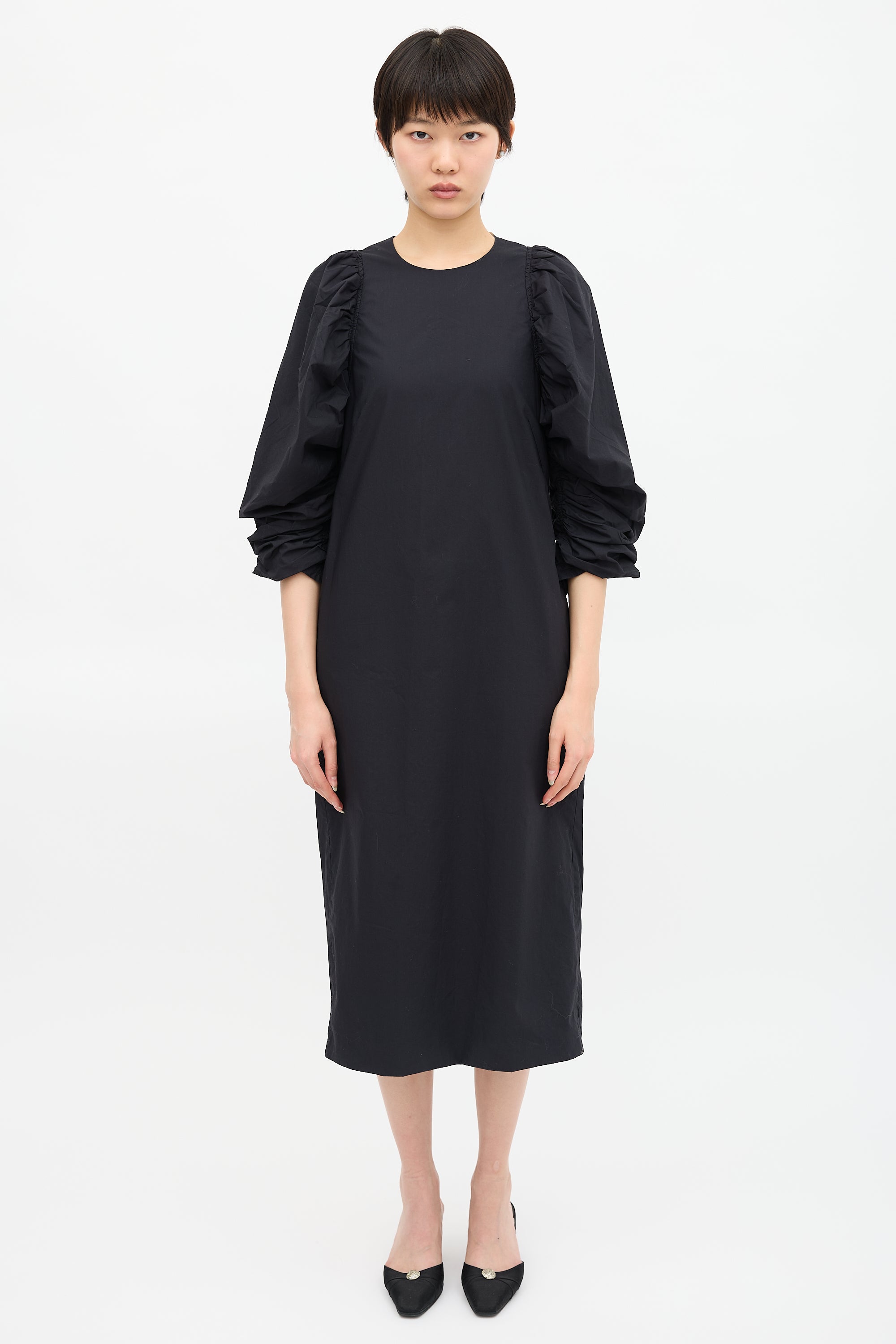 Pre-owned Birgitte Herskind black Keen midi dress featuring a round neckline, ruched half length puff sleeves, in seam pockets, concealed back zip, and back vent. Lined.