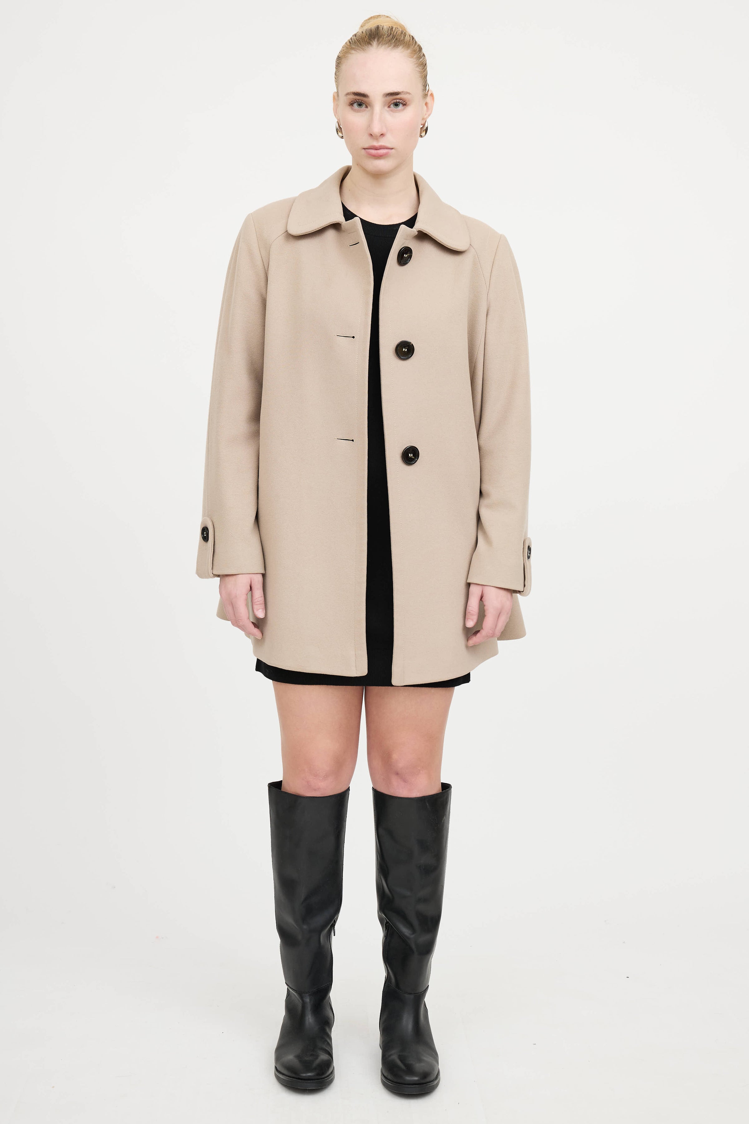 Pre-owned Burberry beige wool jacket featuring a pointed collar, long raglan sleeves with buttoned cuffs, two slip pockets at hip, and button up closure. Lined.