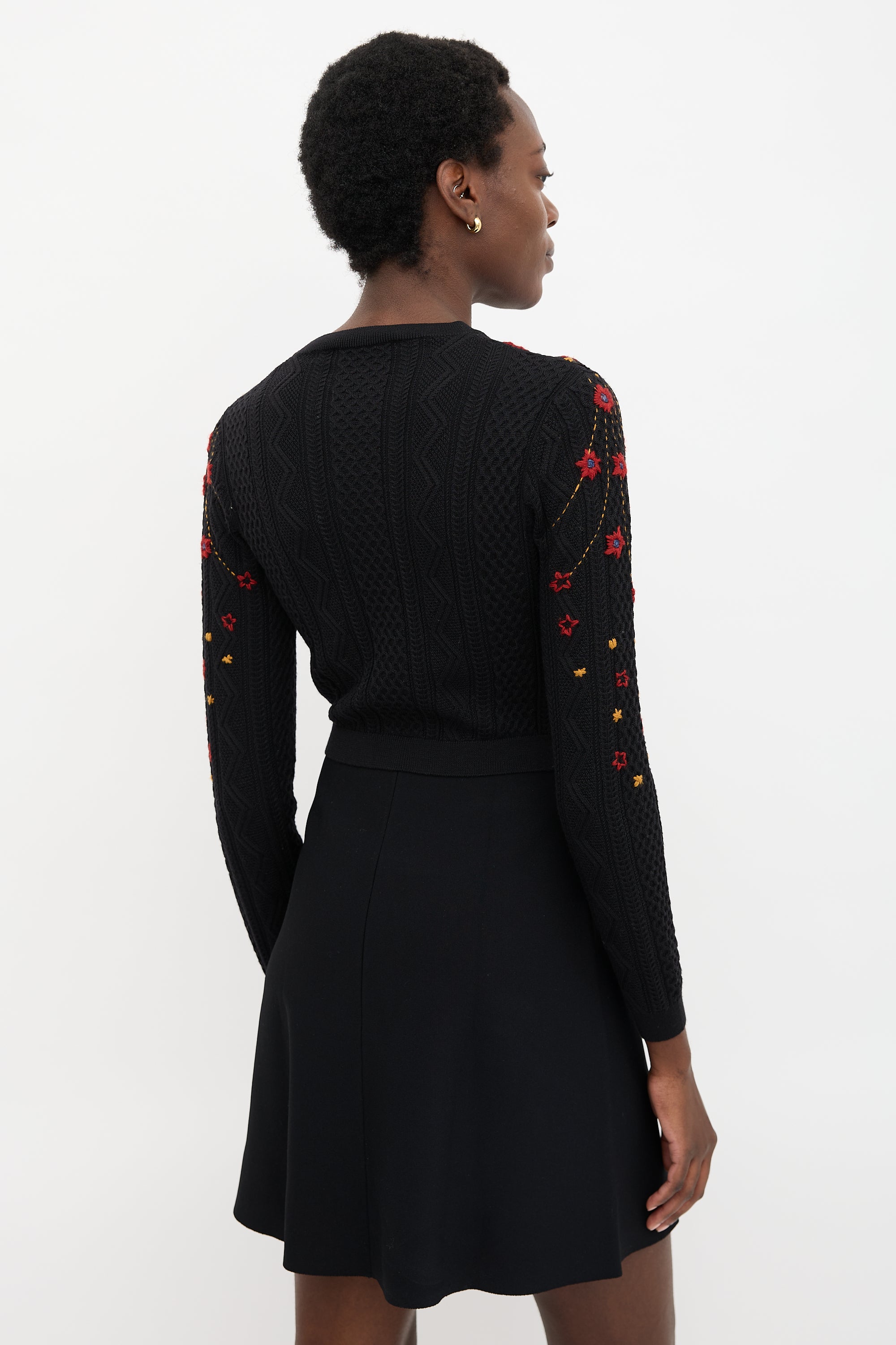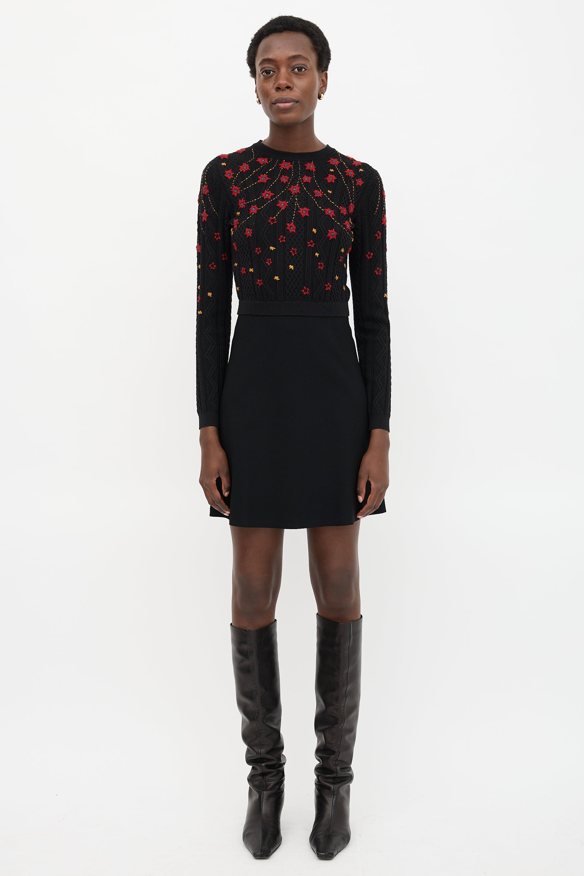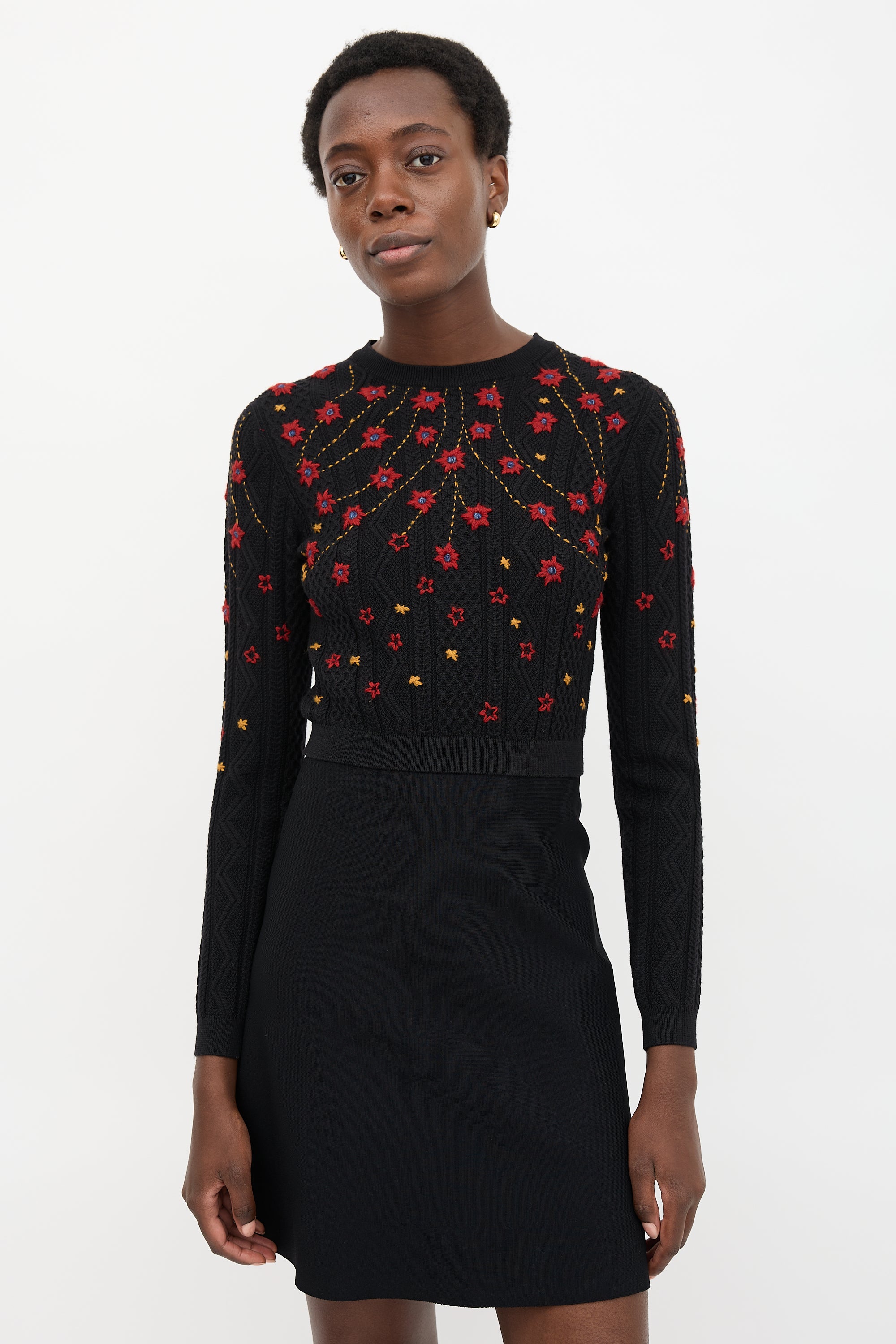 Pre-owned Valentino black midi dress featuring knit top, crew neckline, multicolour floral embroidered at front, and flare skirt.