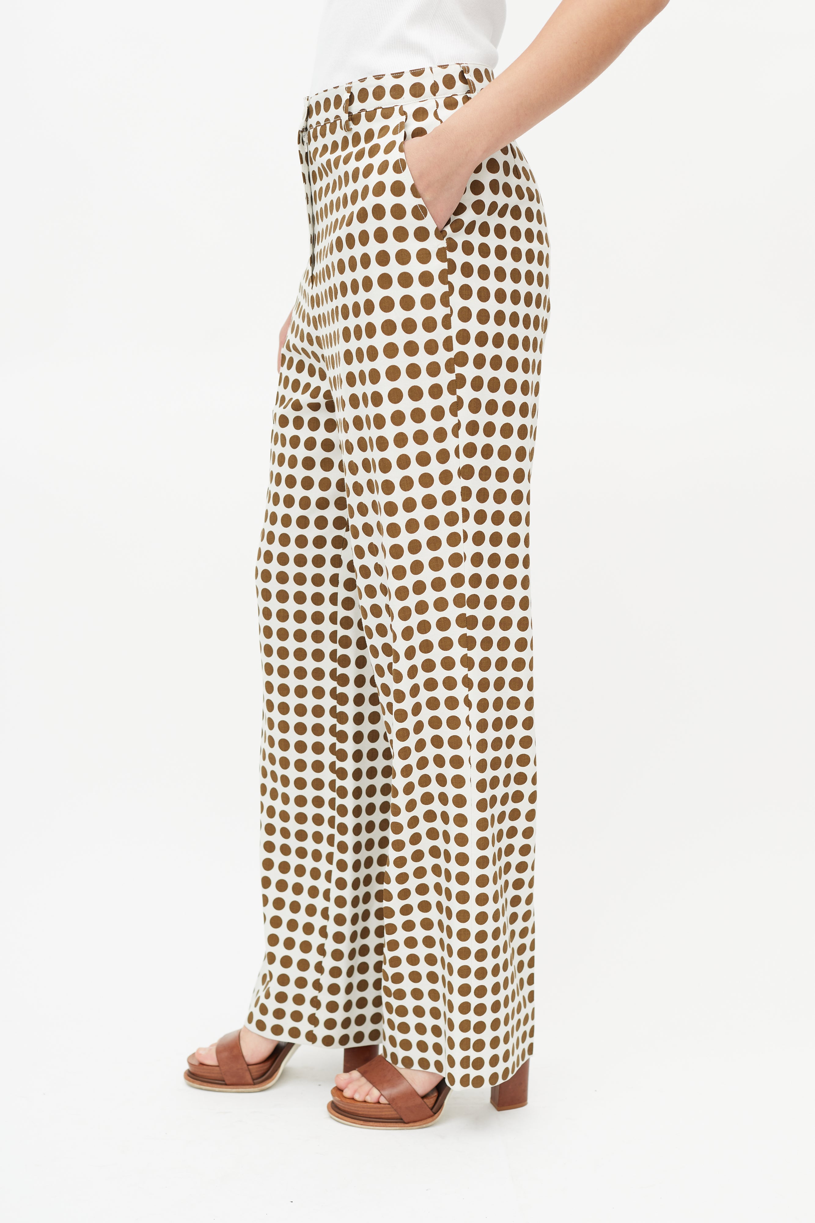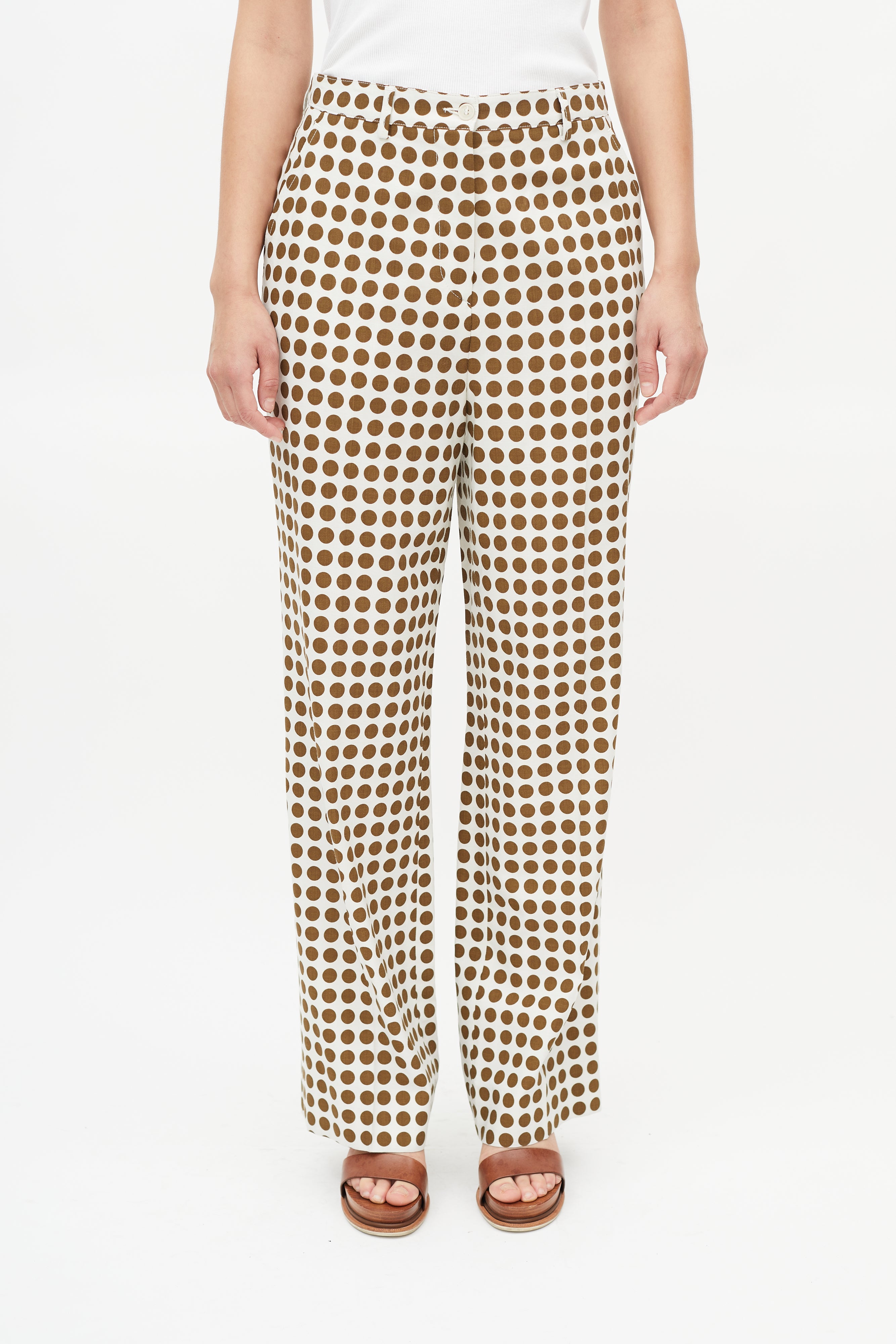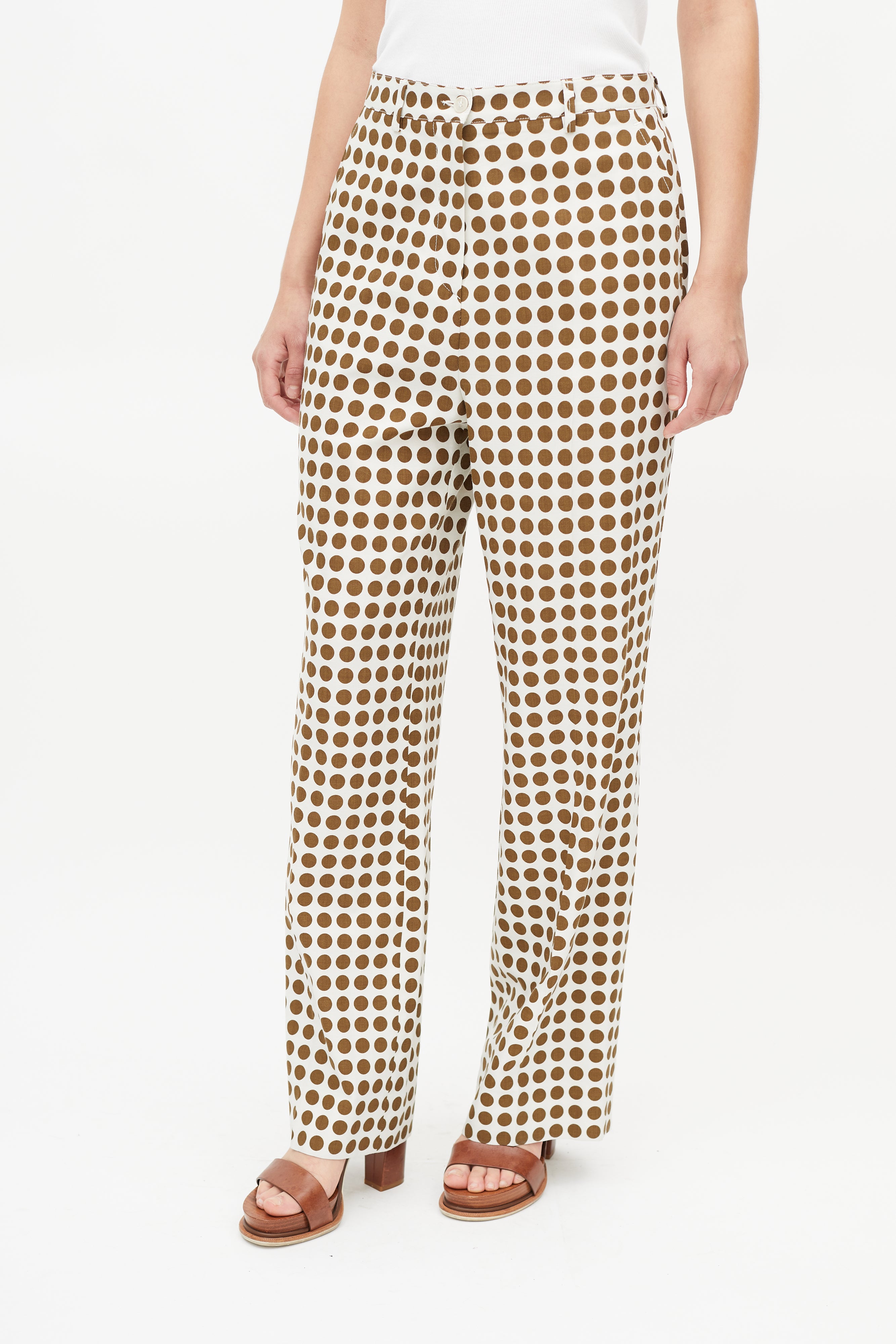 Pre-owned Bottega Veneta cream trousers featuring brown dots print throughout, belt loops, zip fly, two slash pockets at front, and straight legs.