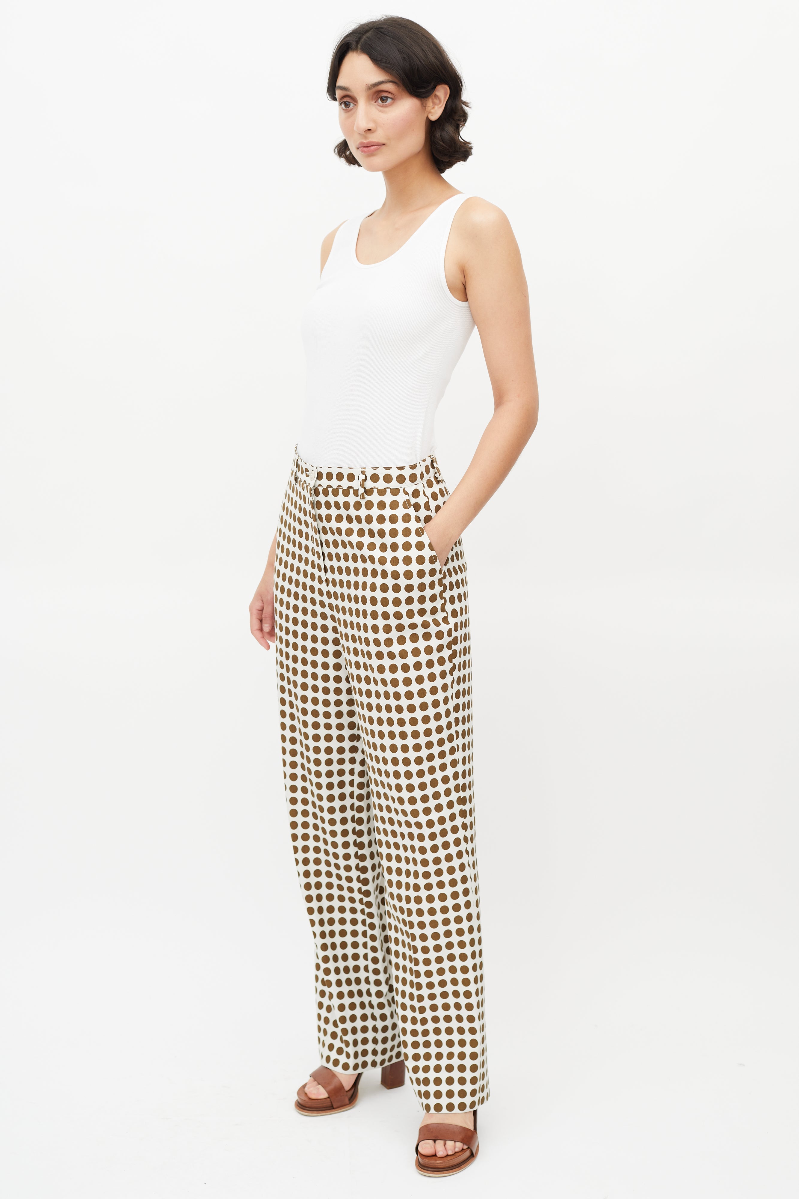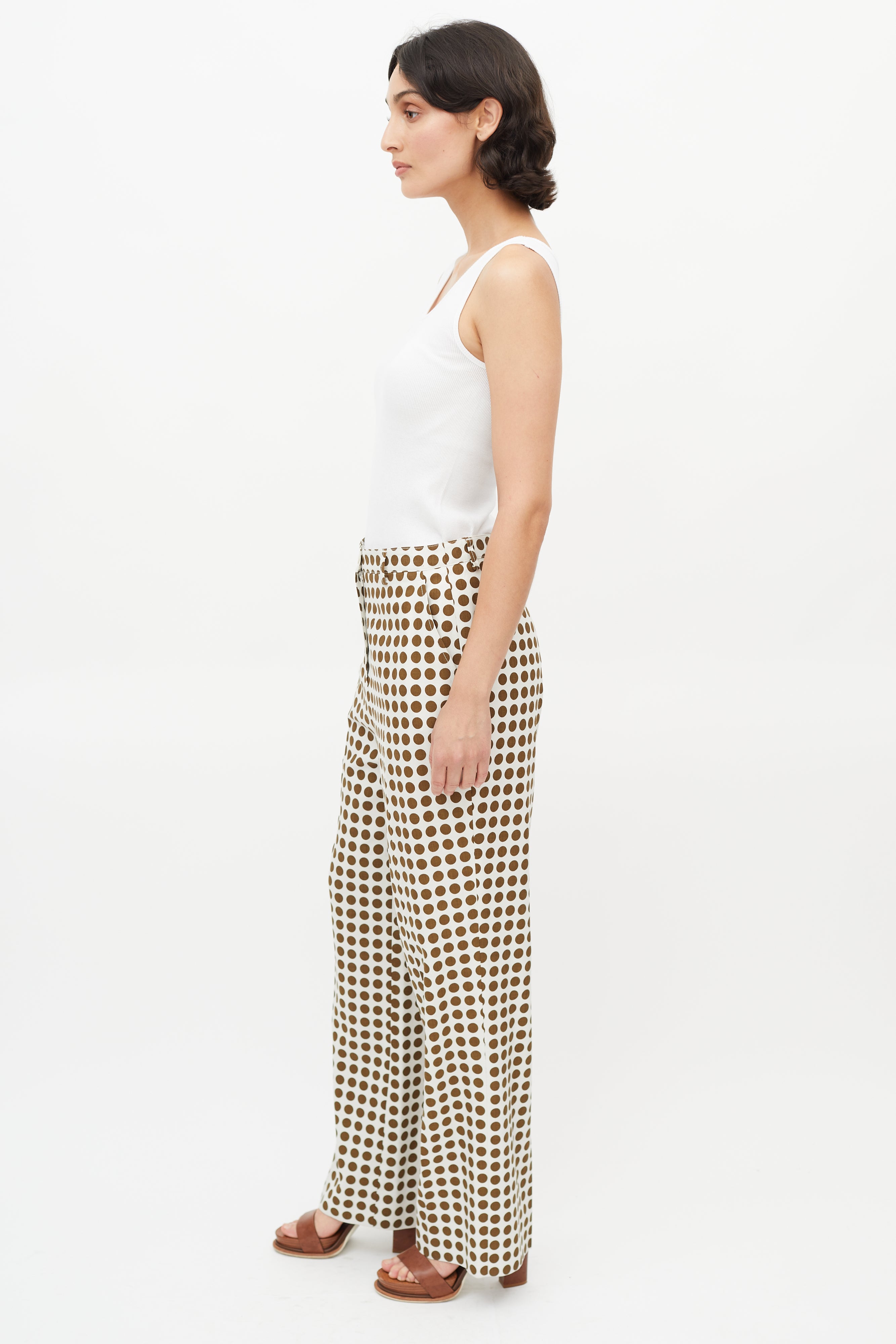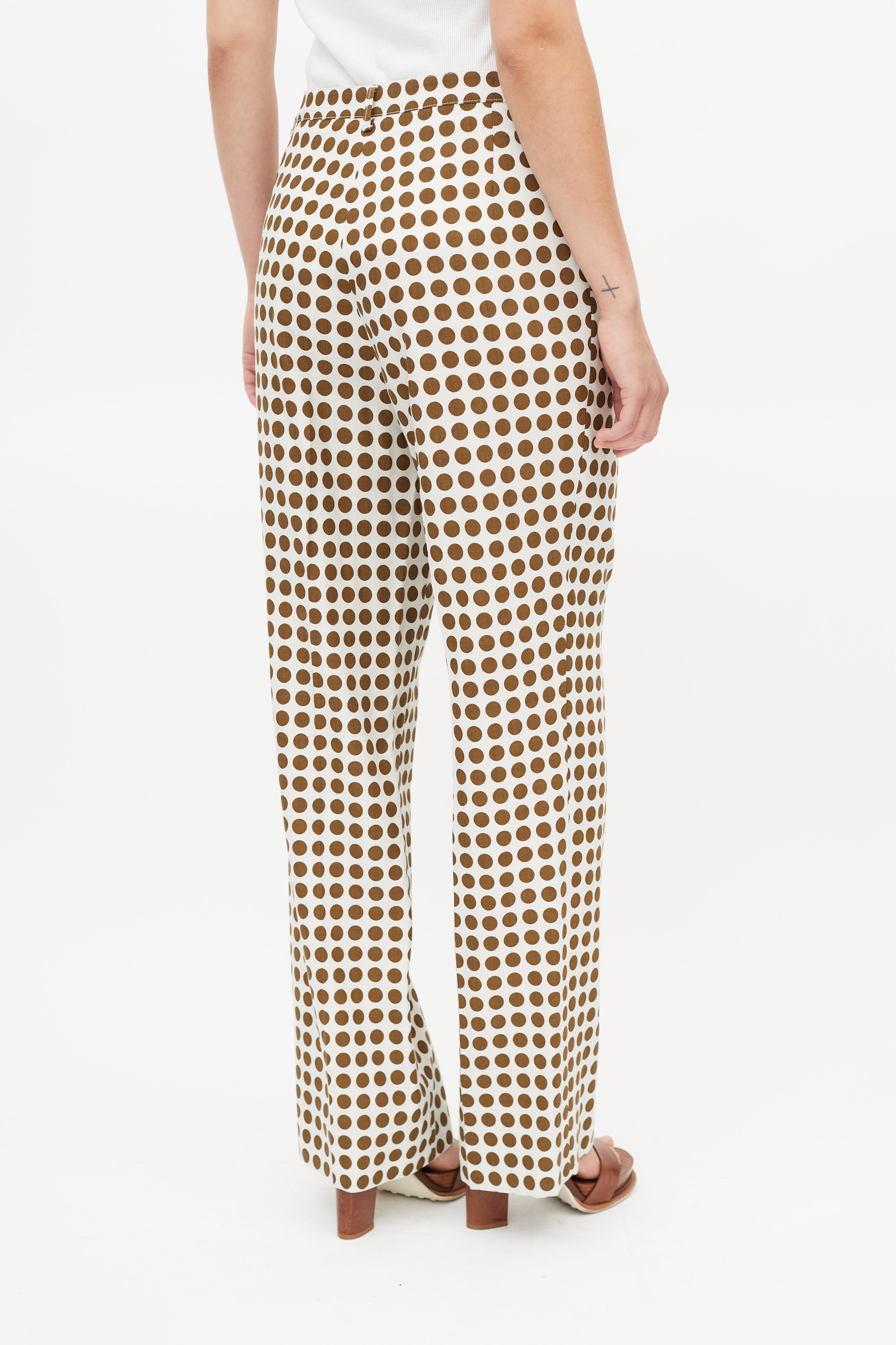 Pre-owned Bottega Veneta cream trousers featuring brown dots print throughout, belt loops, zip fly, two slash pockets at front, and straight legs.