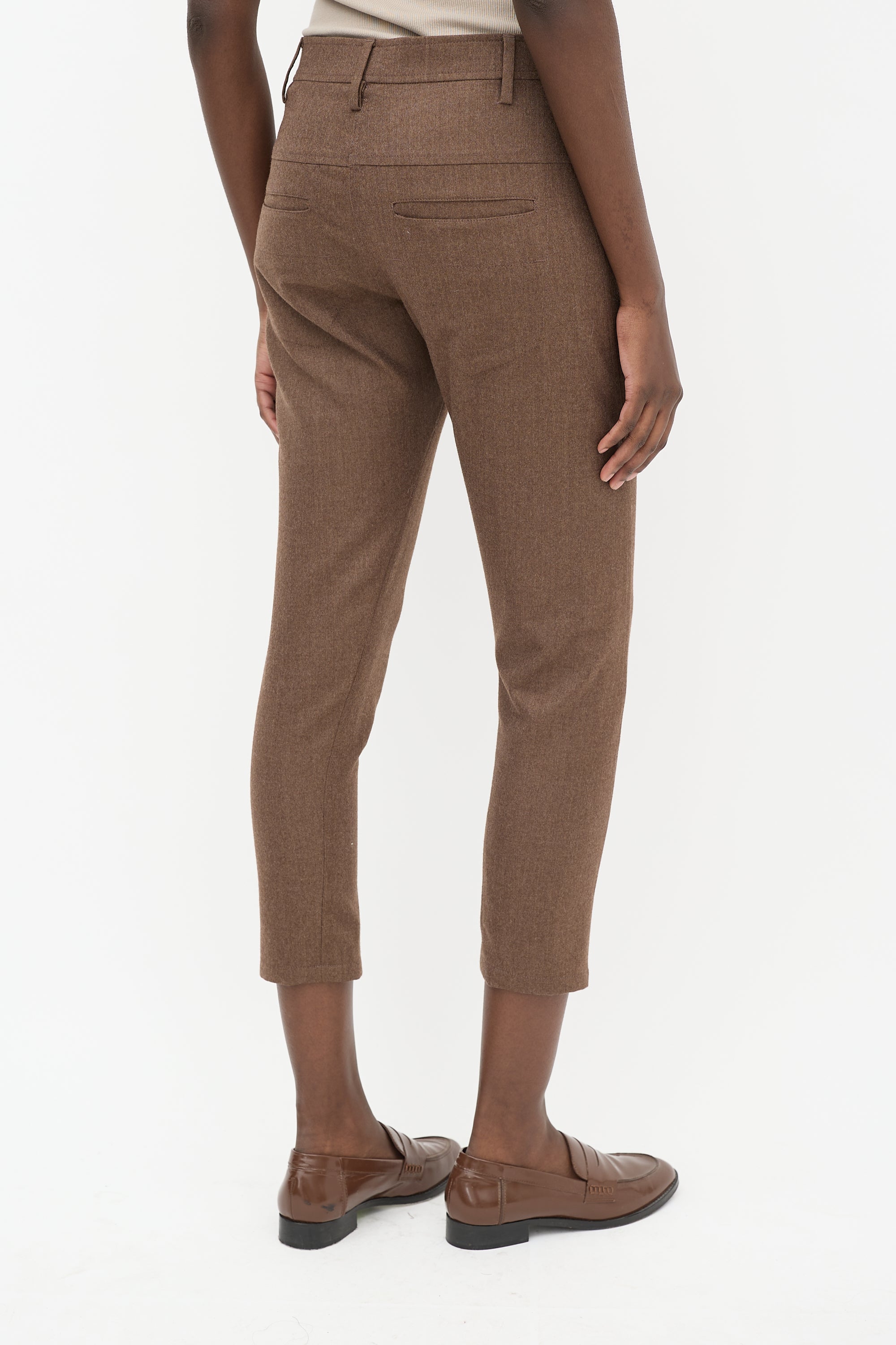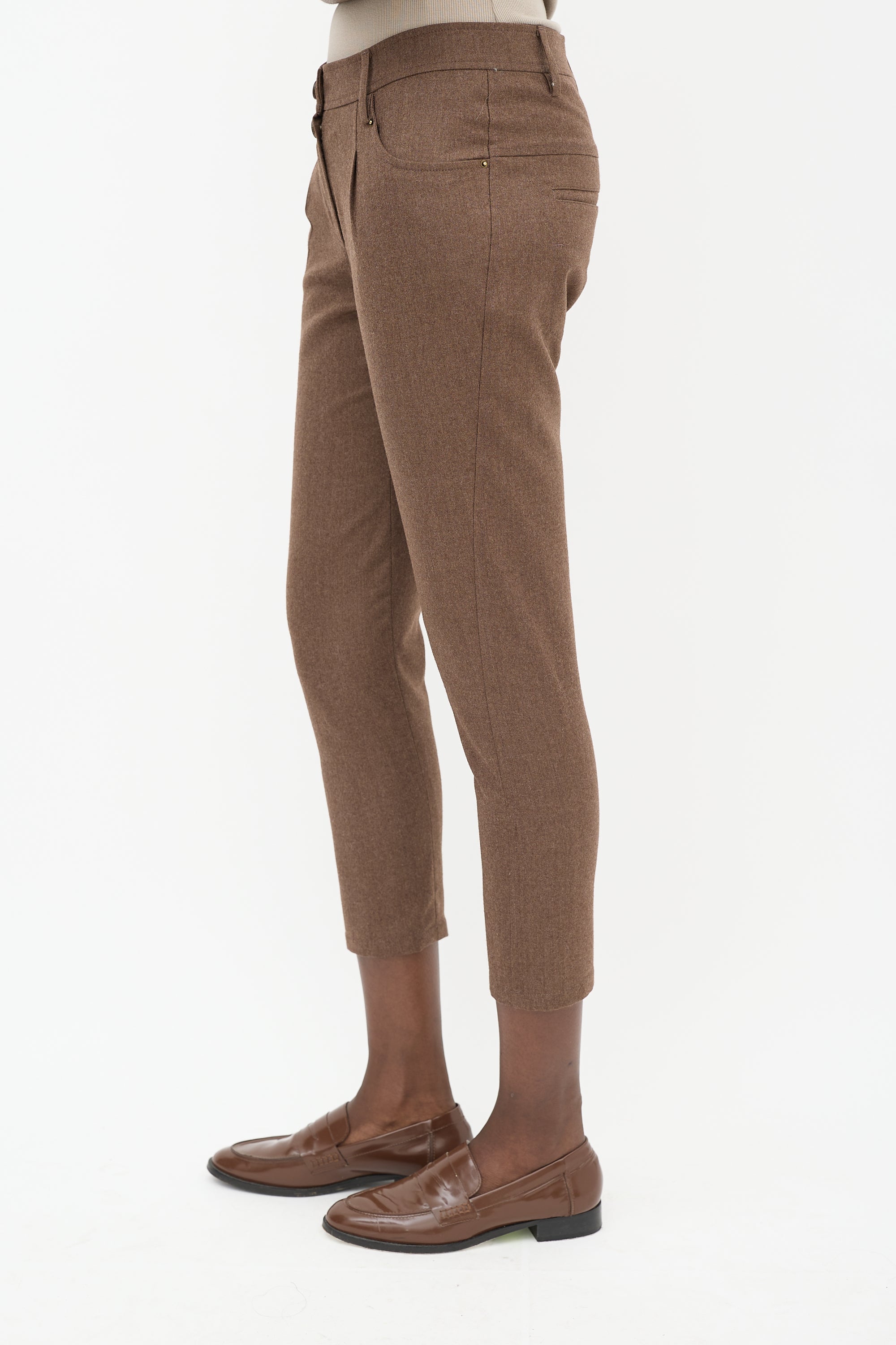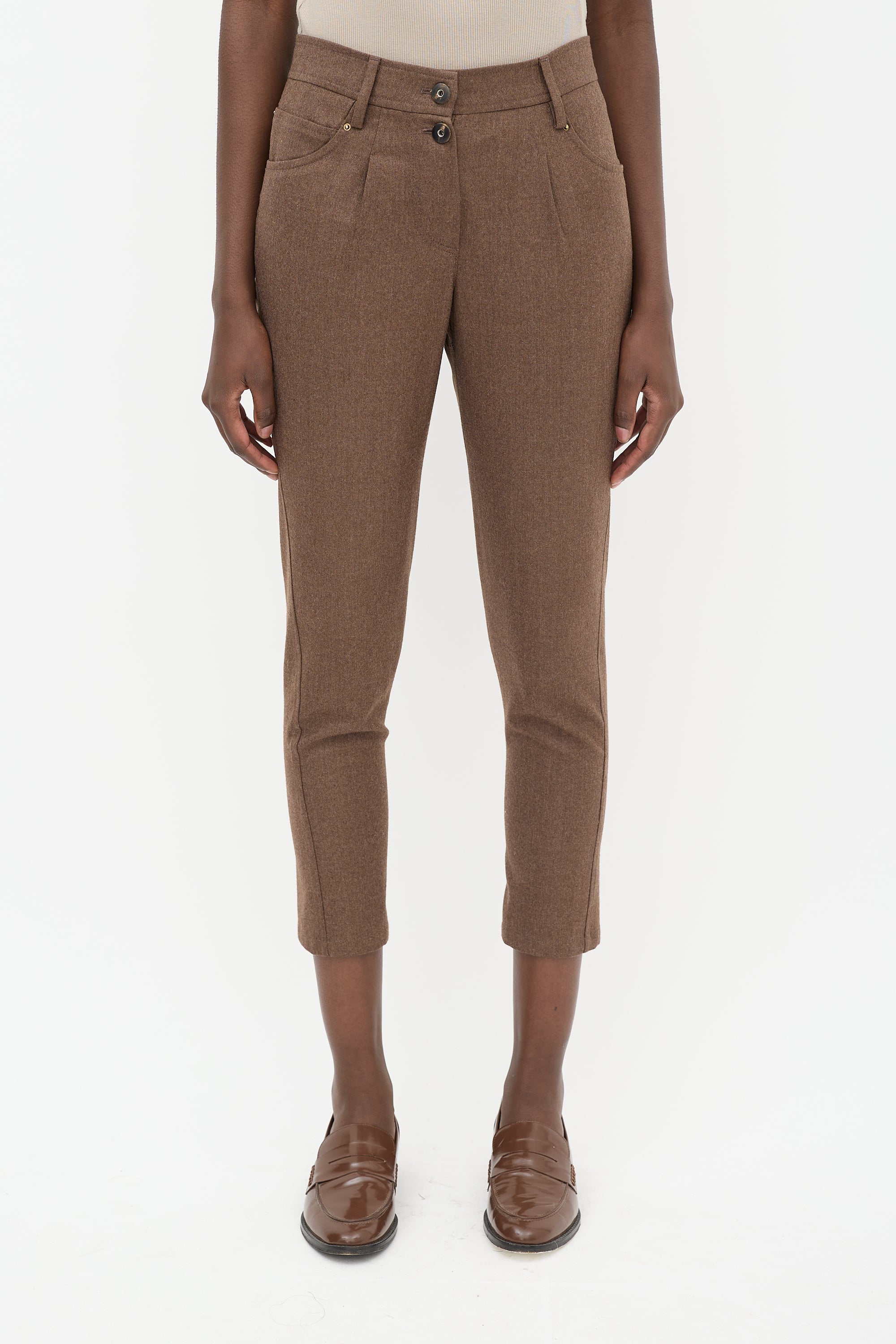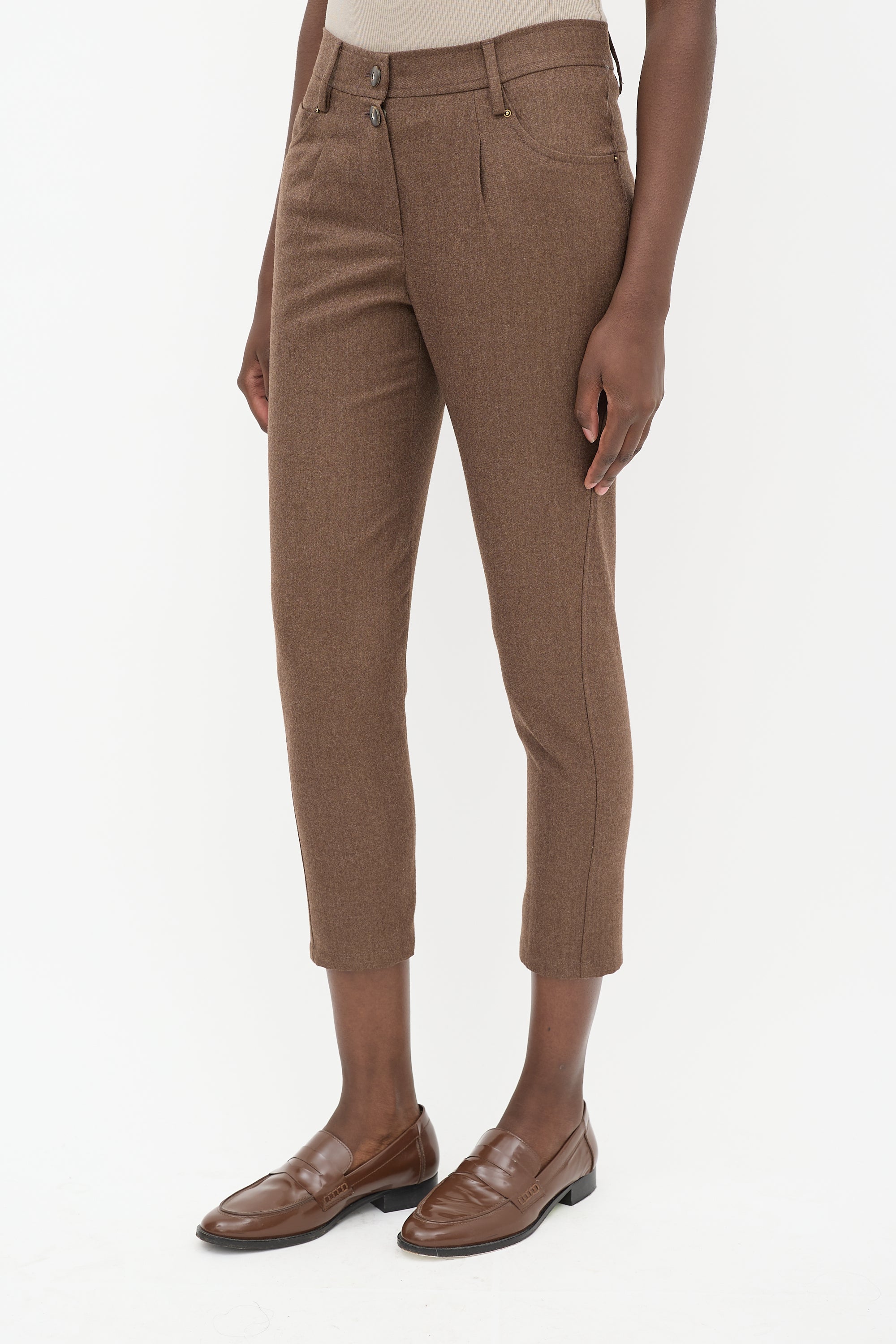 Pre-owned Brunello Cucinelli brown wool trousers featuring five pocket styling, centre pleat, cropped tapered leg, and zip fly with button closure.