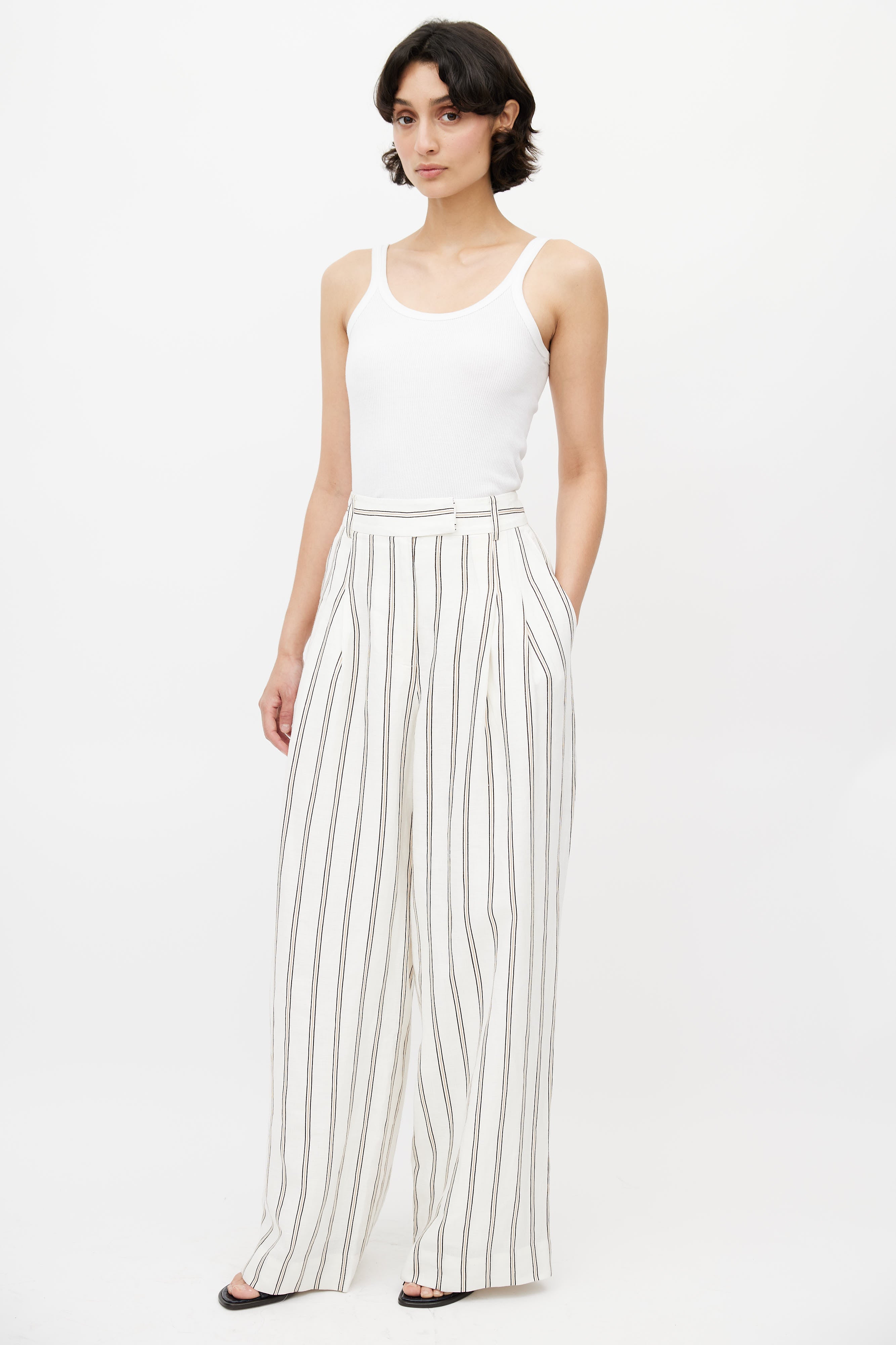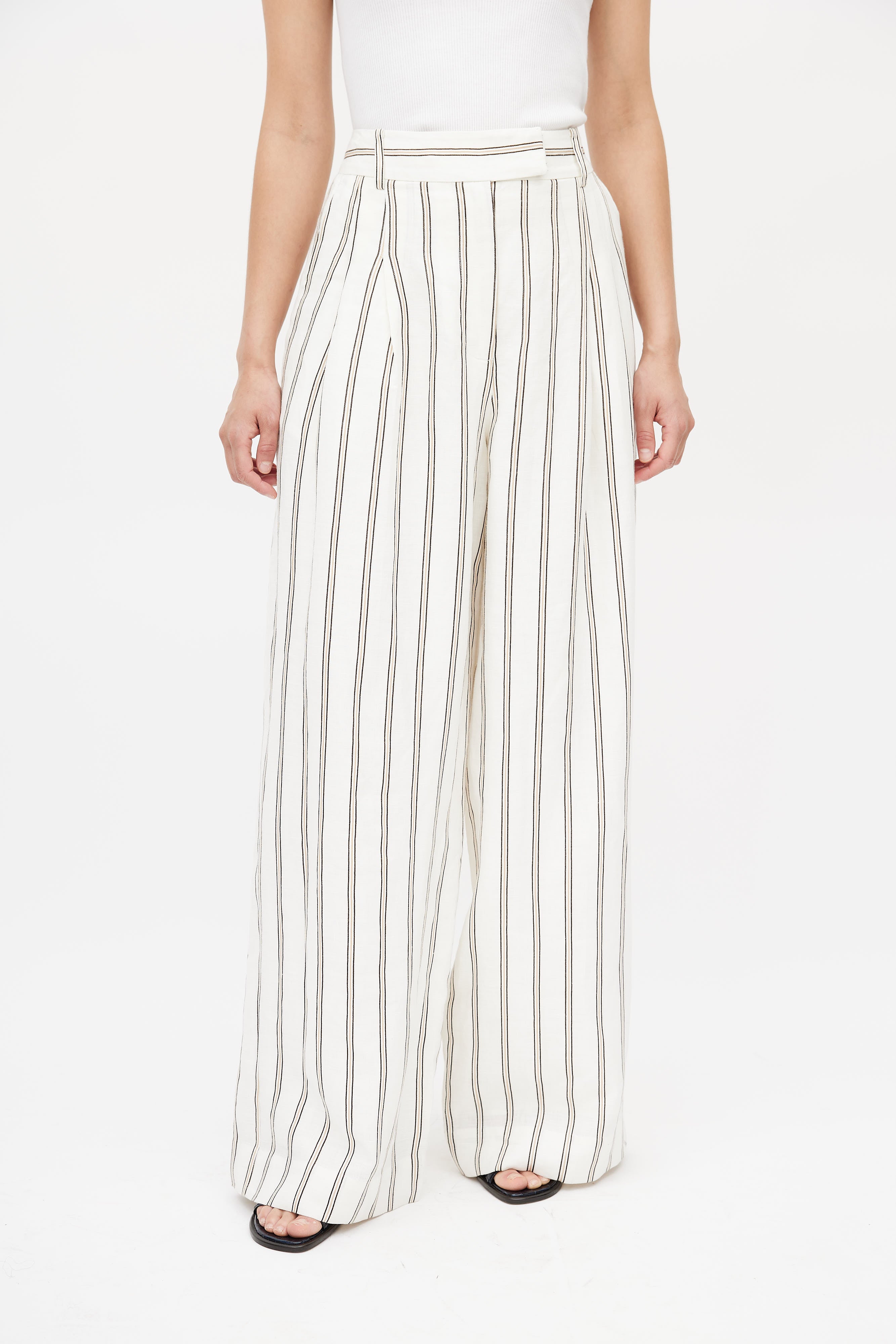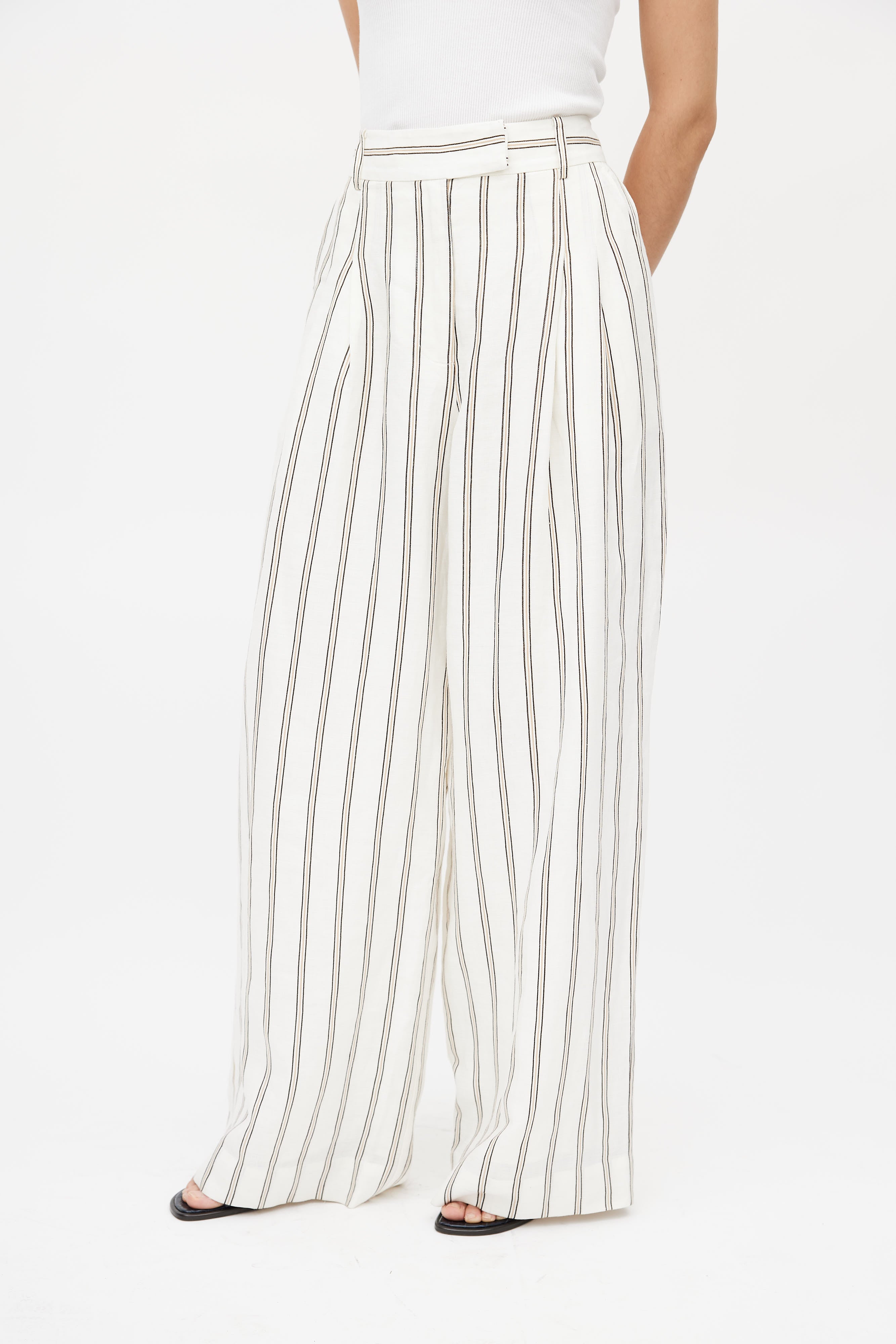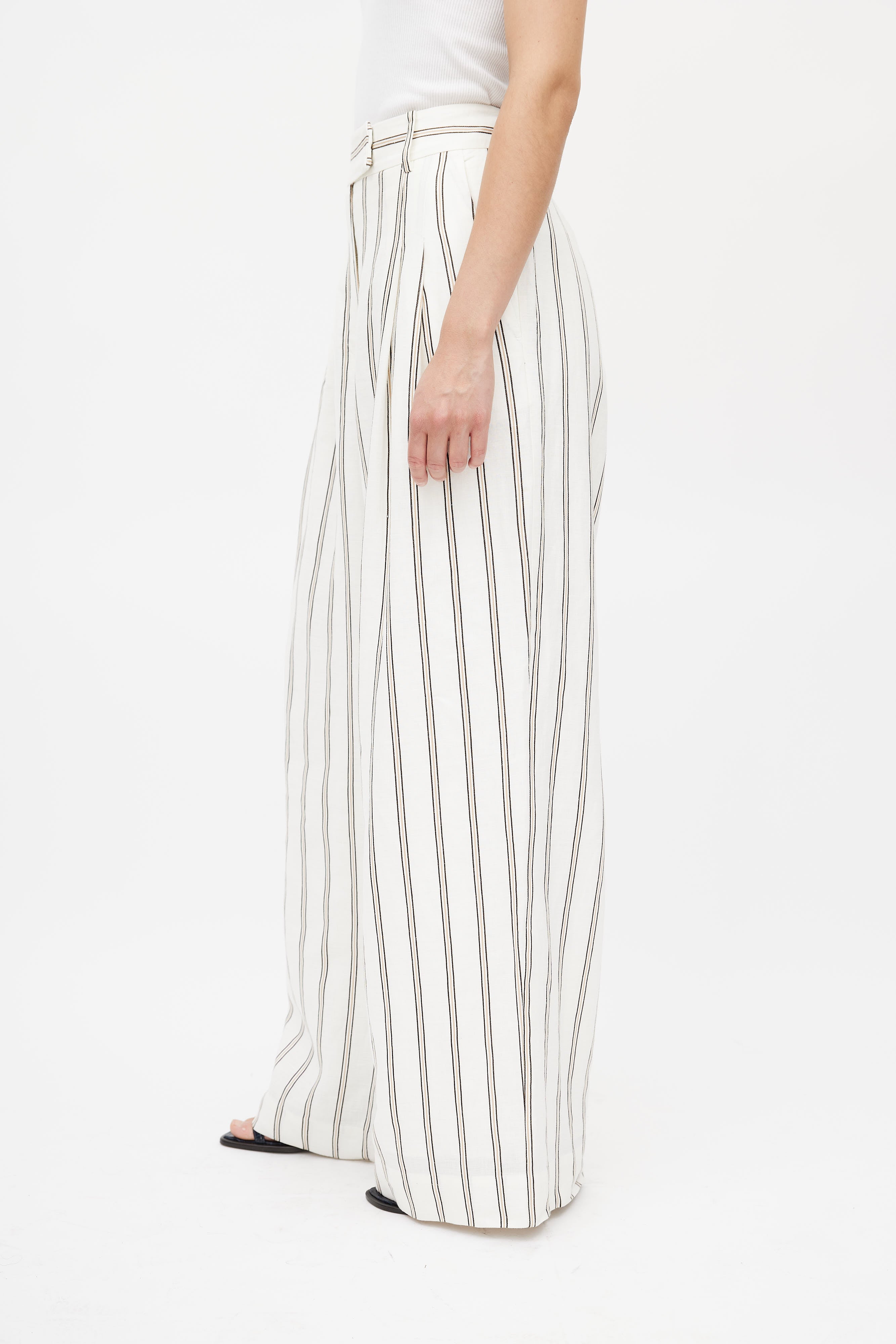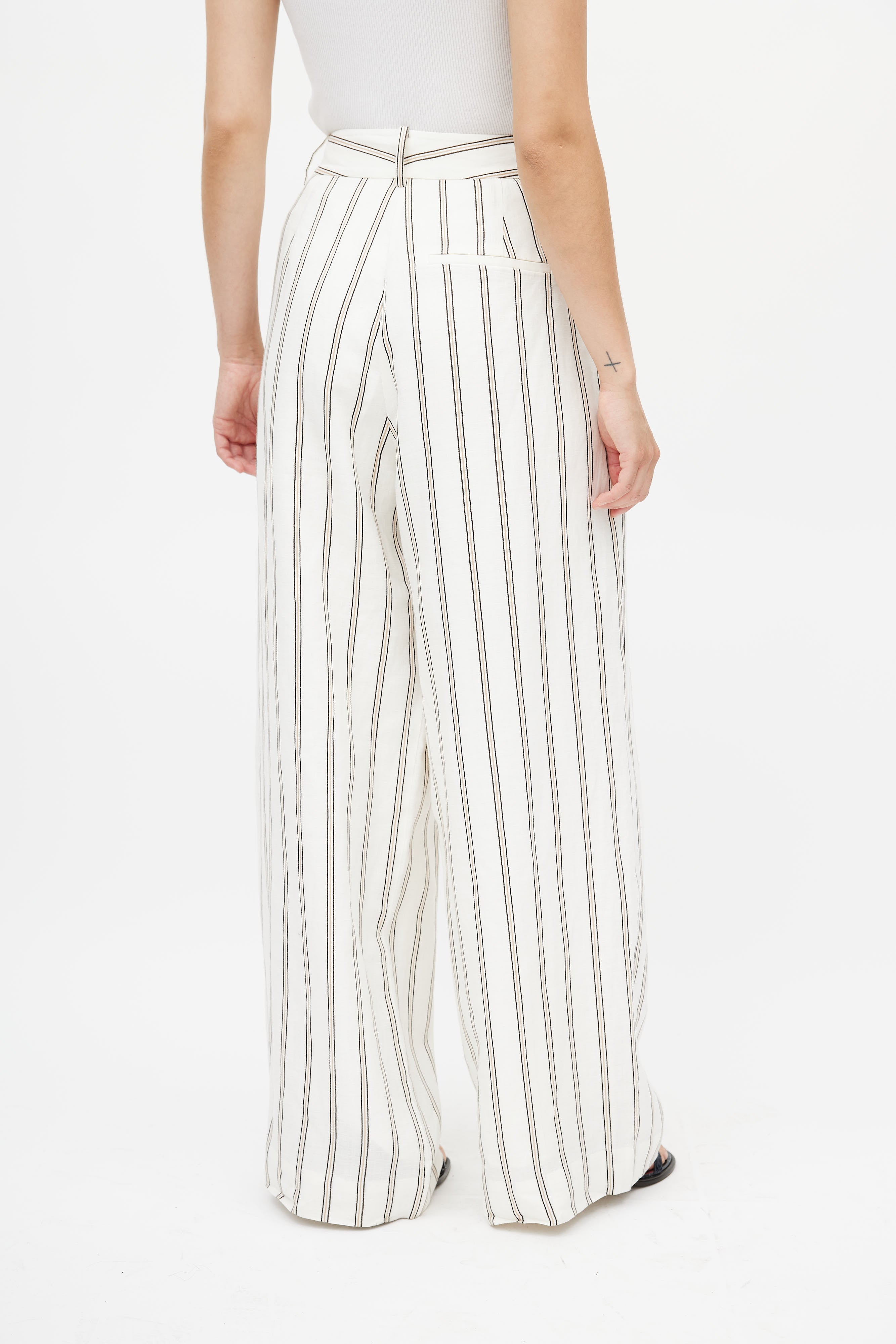 Pre-owned By Malene Birger white linen trousers featuring a multicolour stripe print throughout, two slash pockets at hip, pleated front, one faux welt pocket at back, wide leg, and zip fly with hook and eye closure. Lined.
