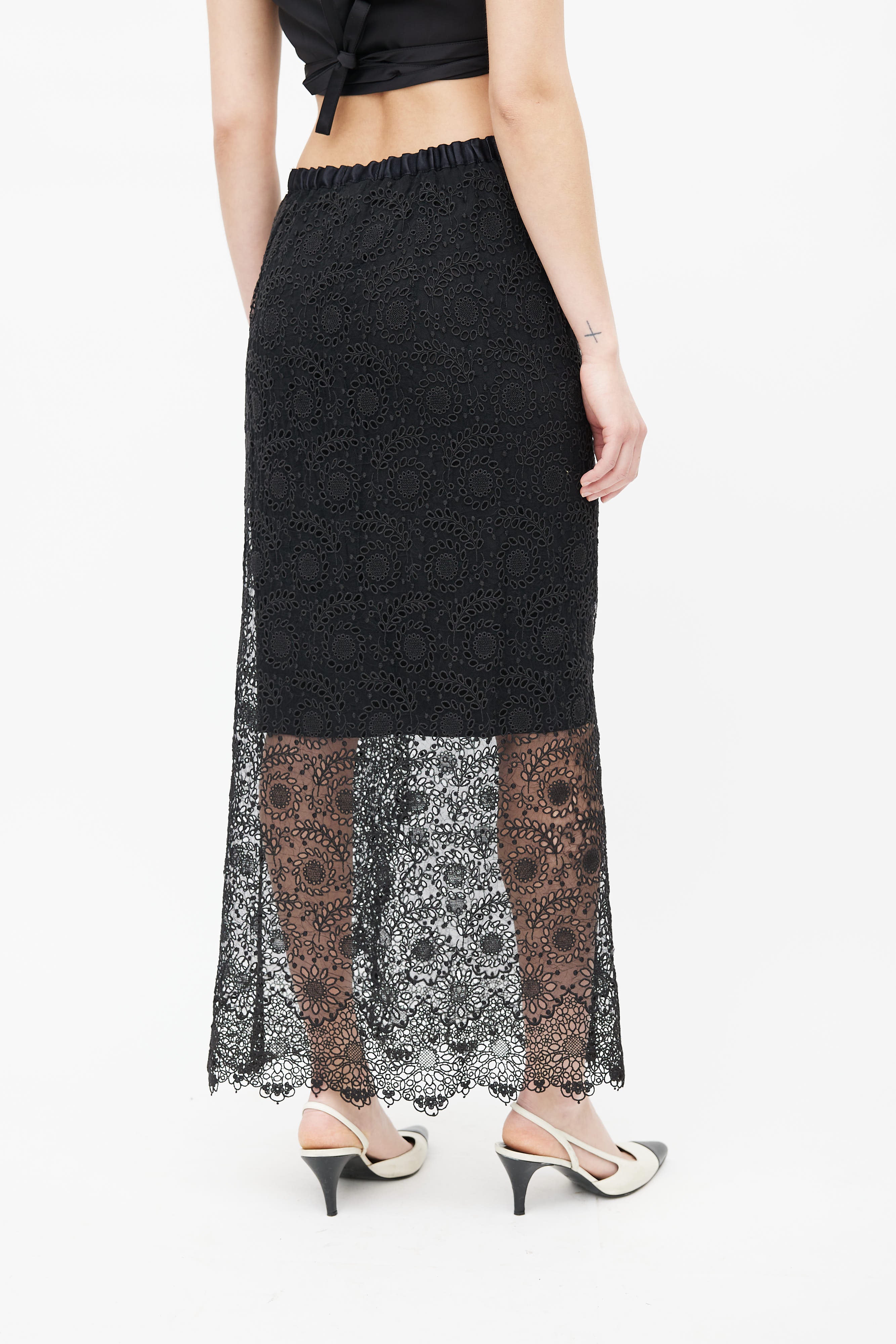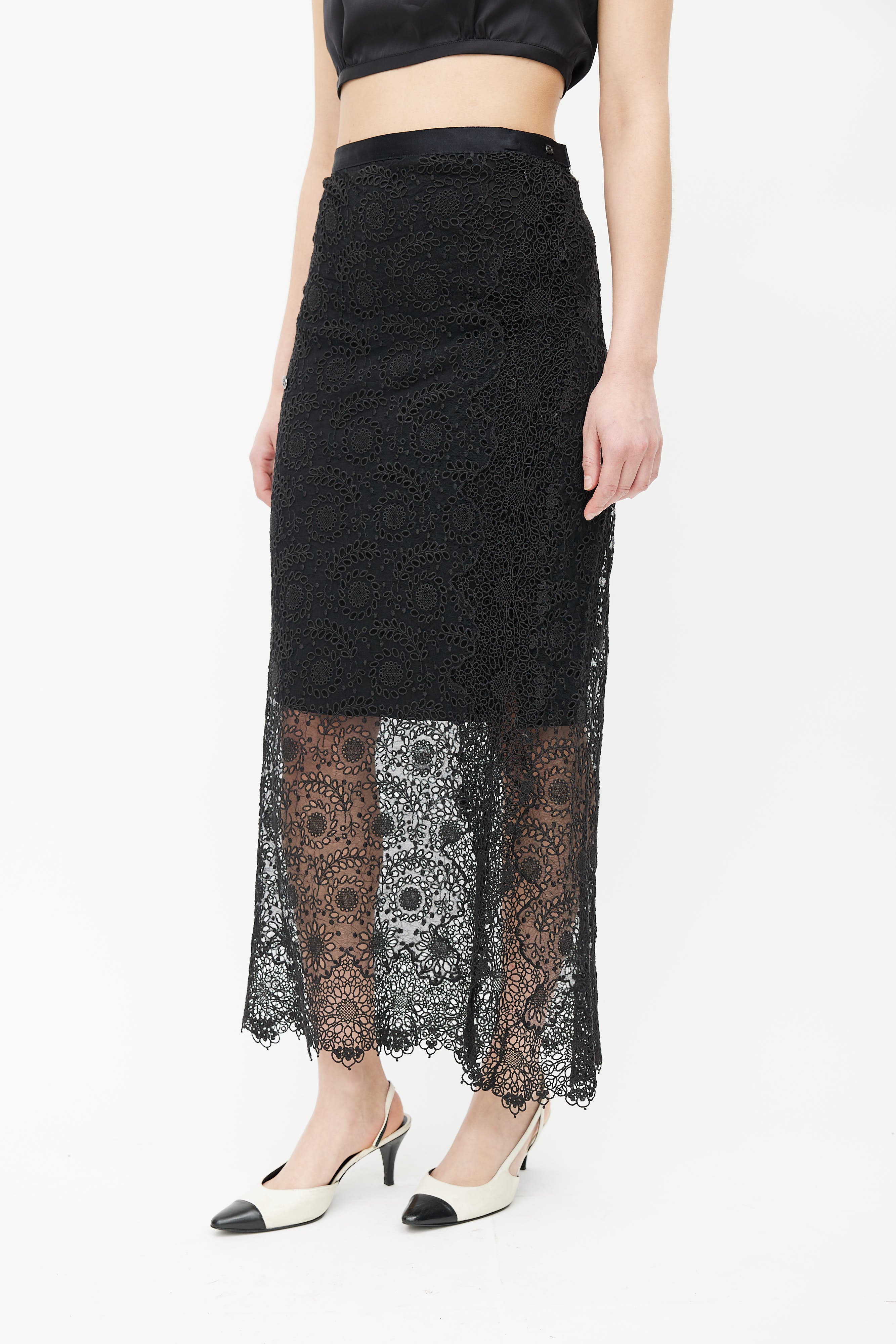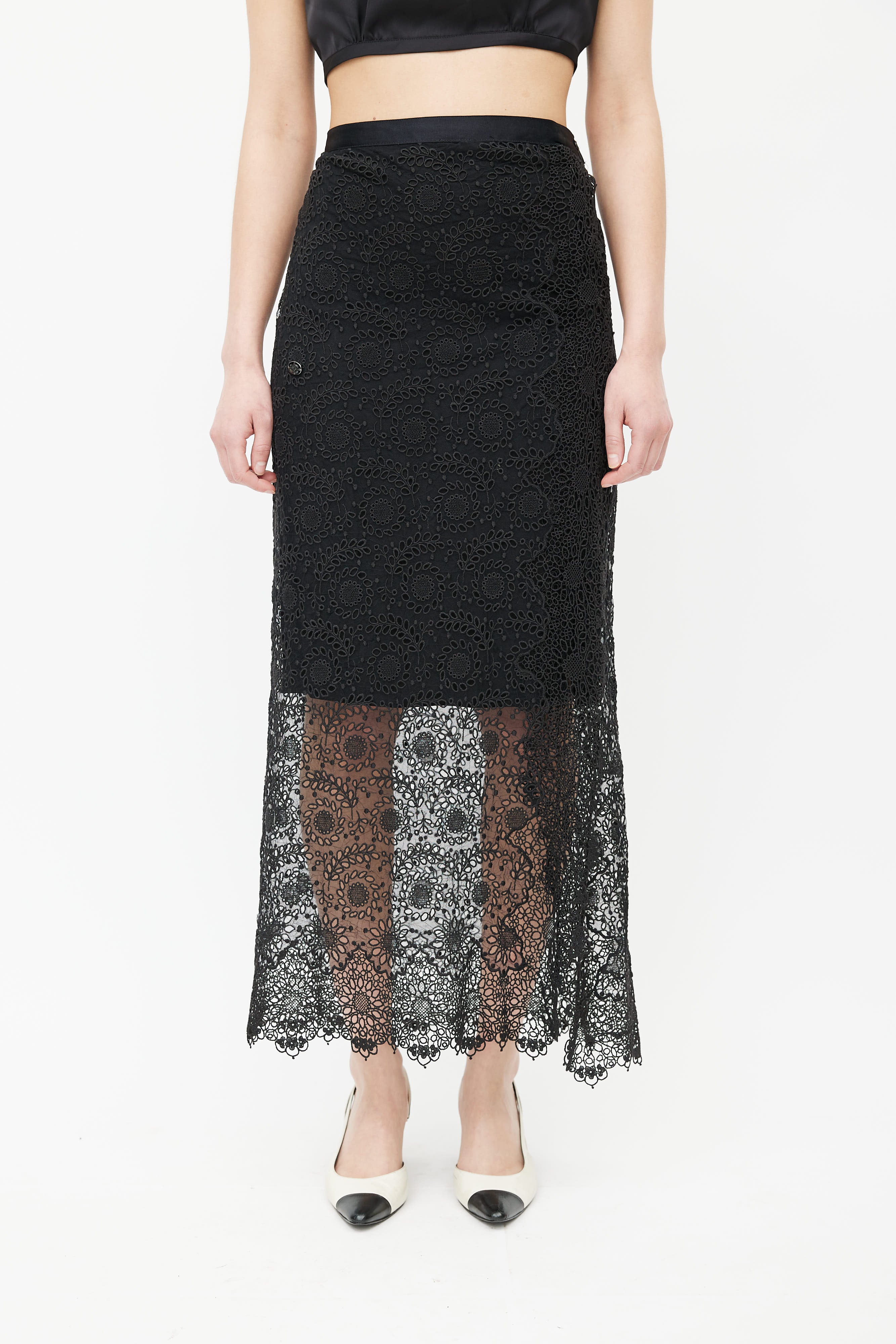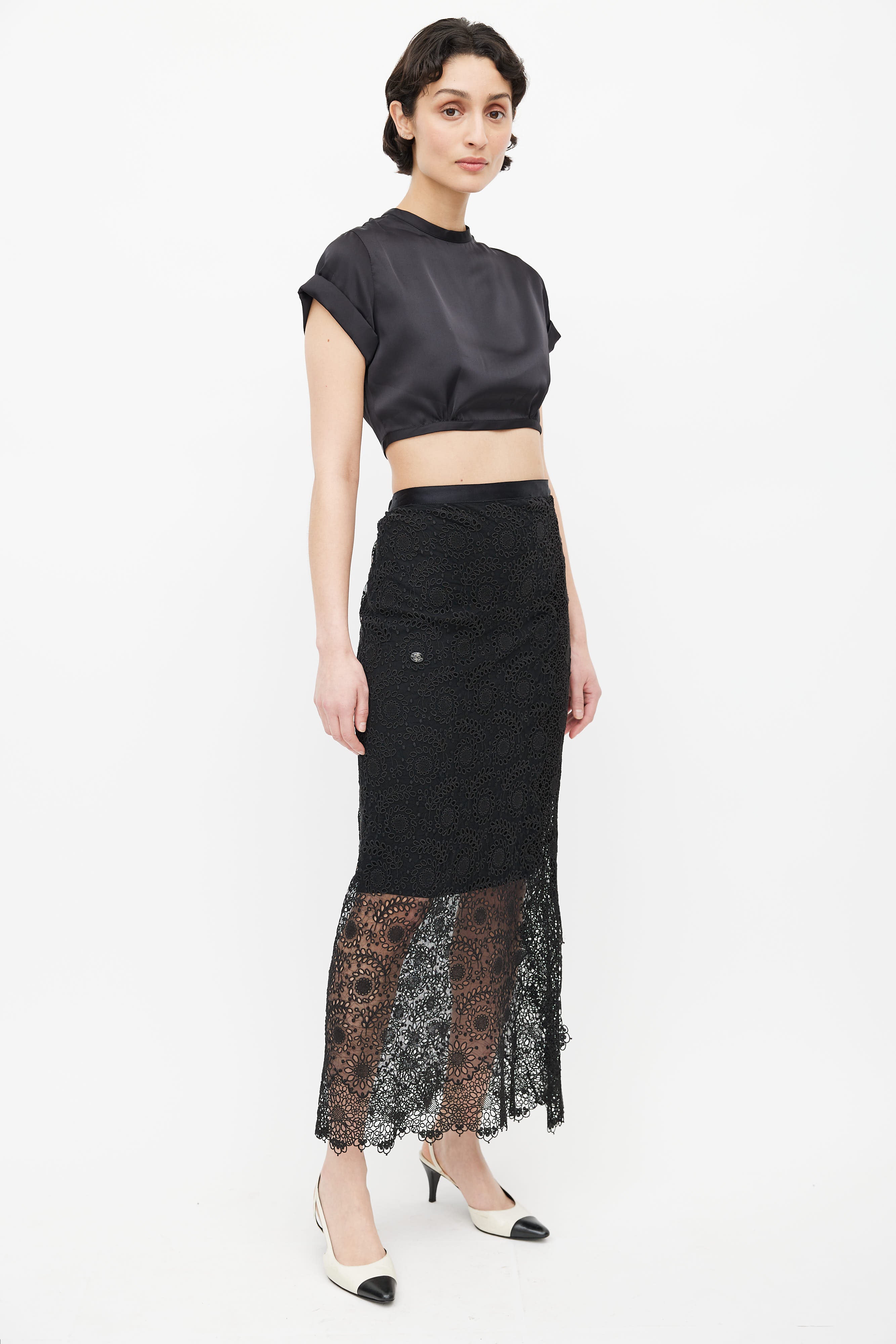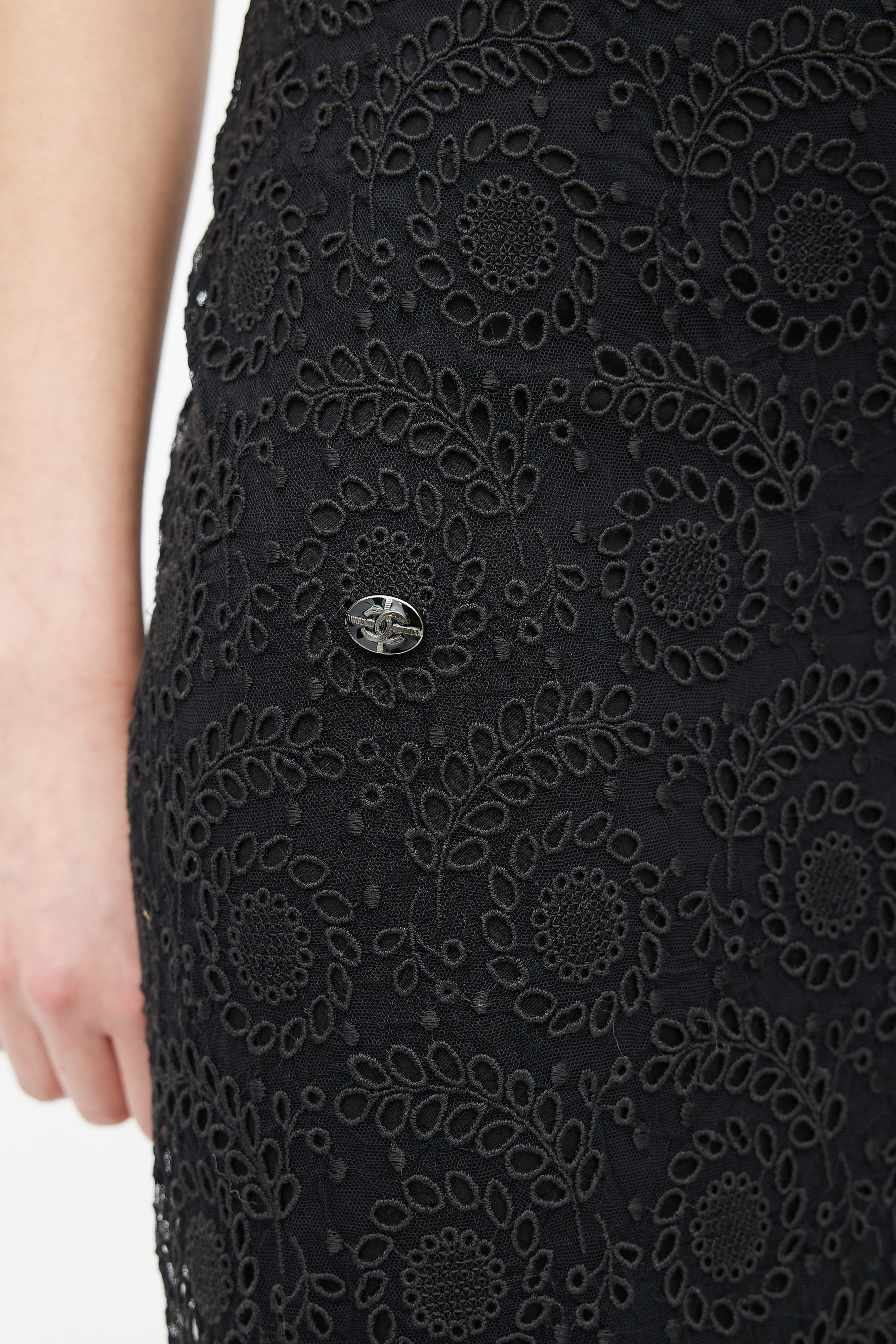 Pre-owned Chanel black skirt featuring straight waistband, elasticized back, concealed zip closure at side, eyelet lace overlay, and CC logo hardware at hip. Lined. Clipped to fit model.