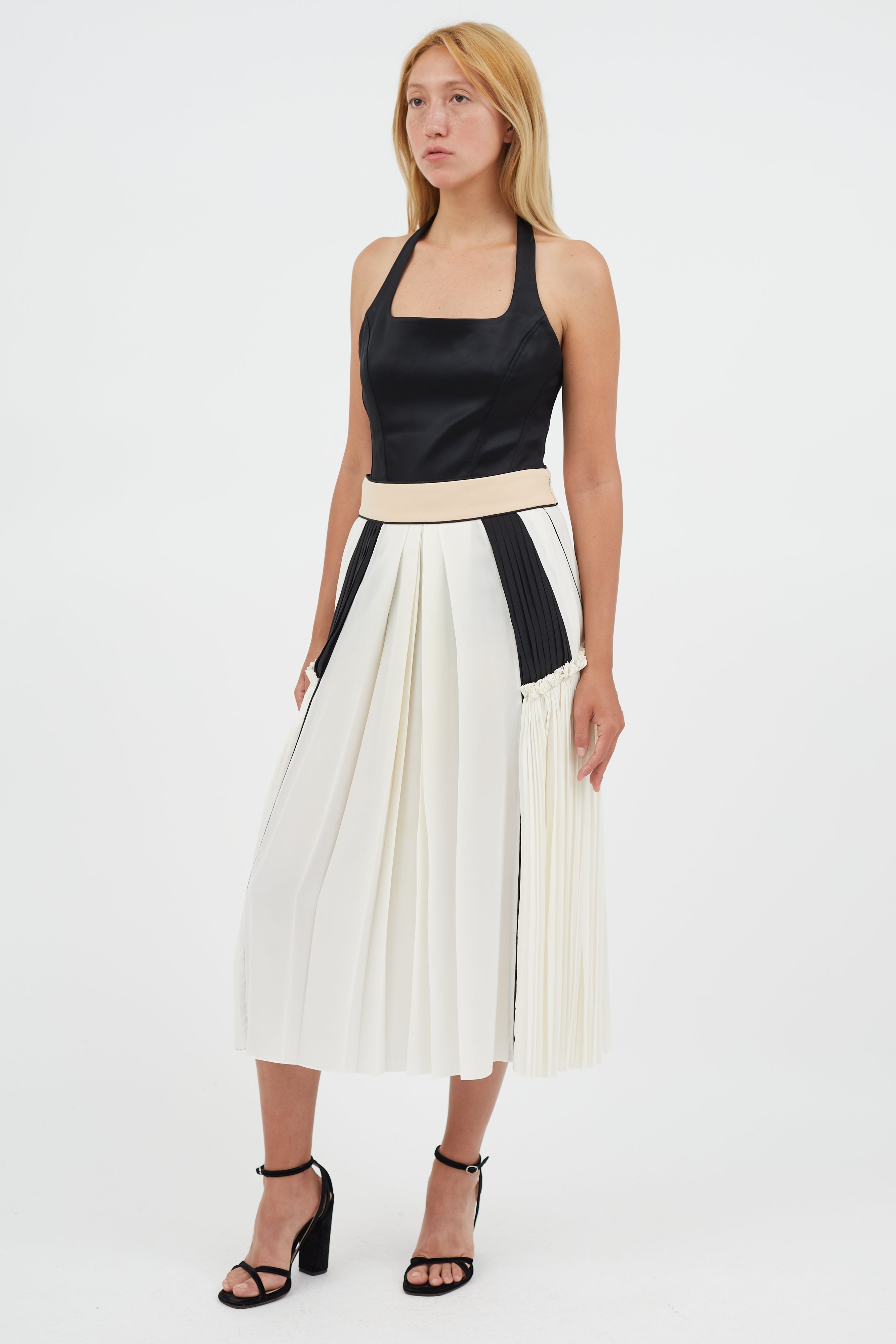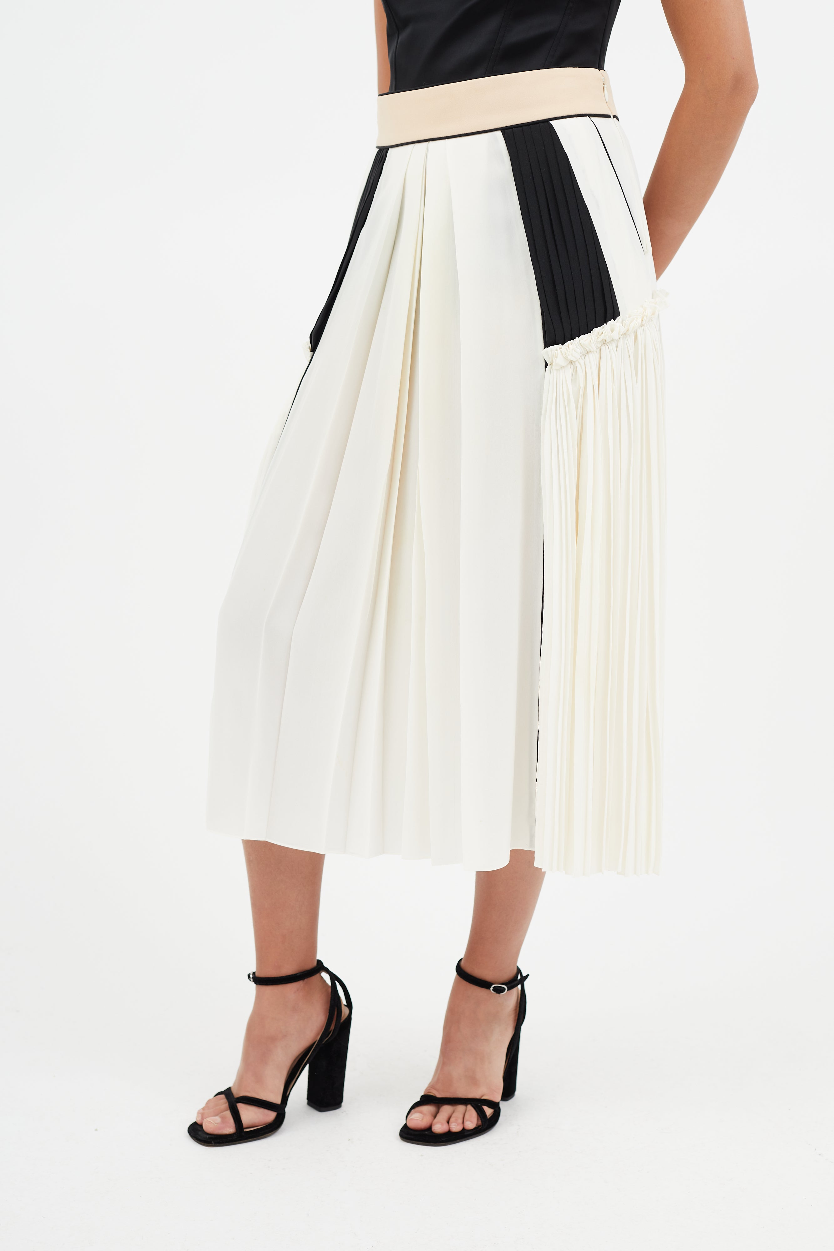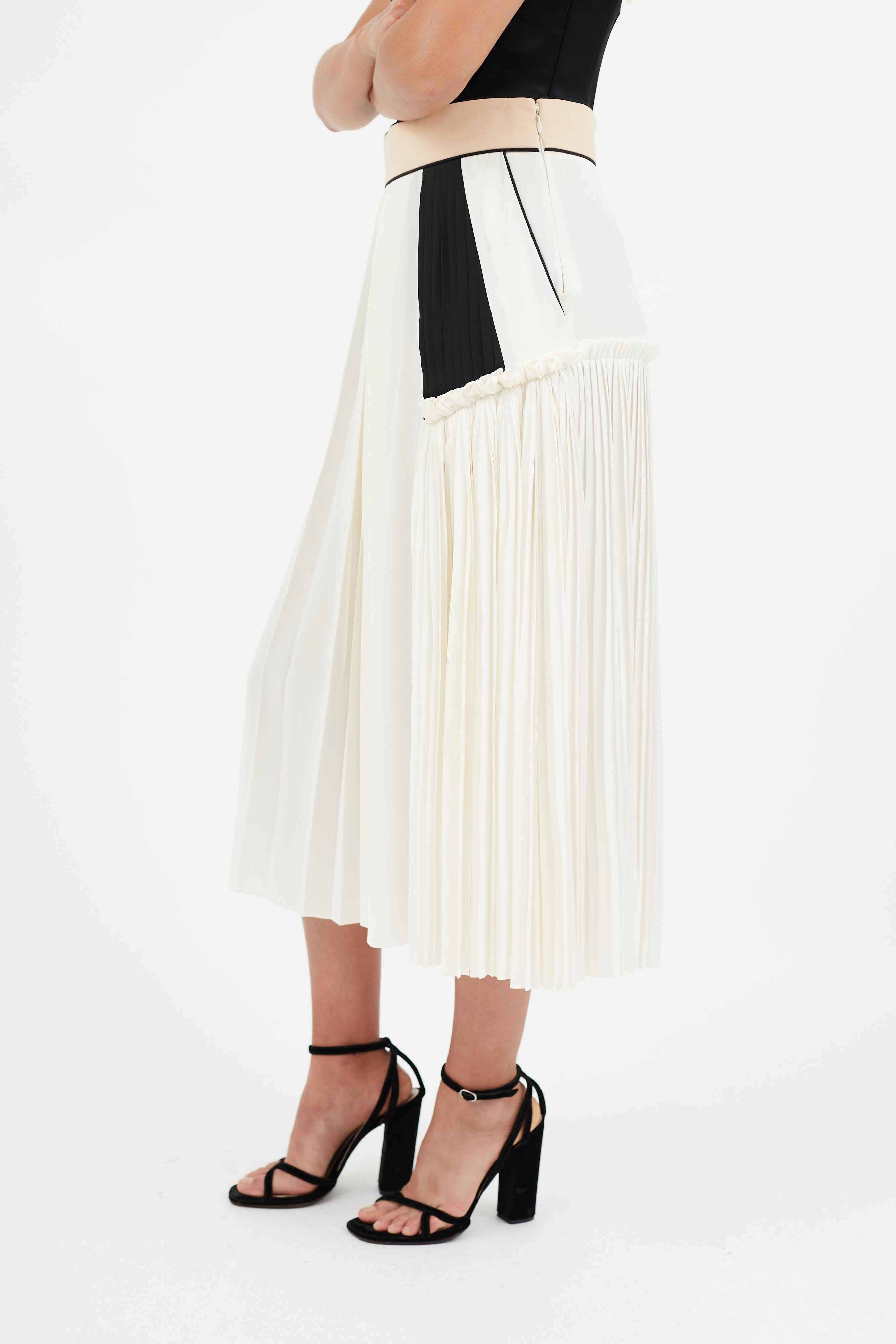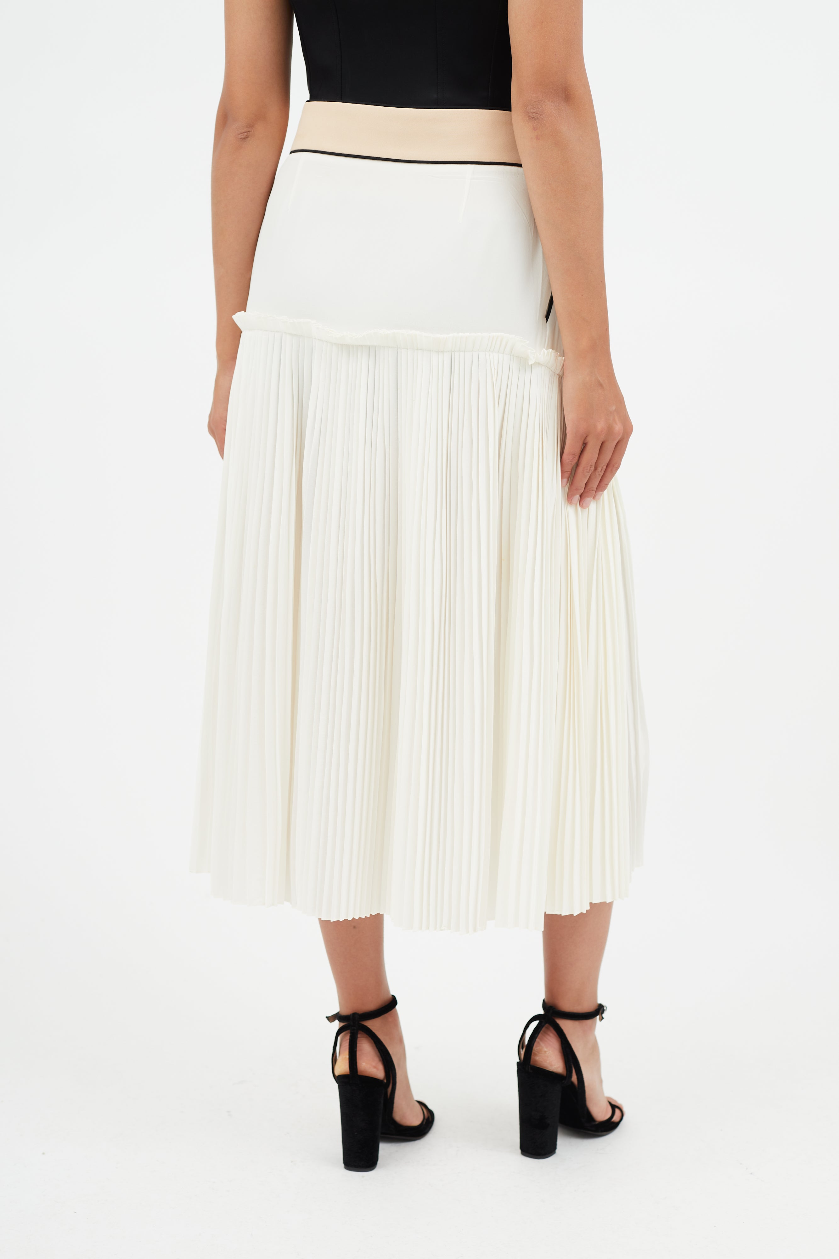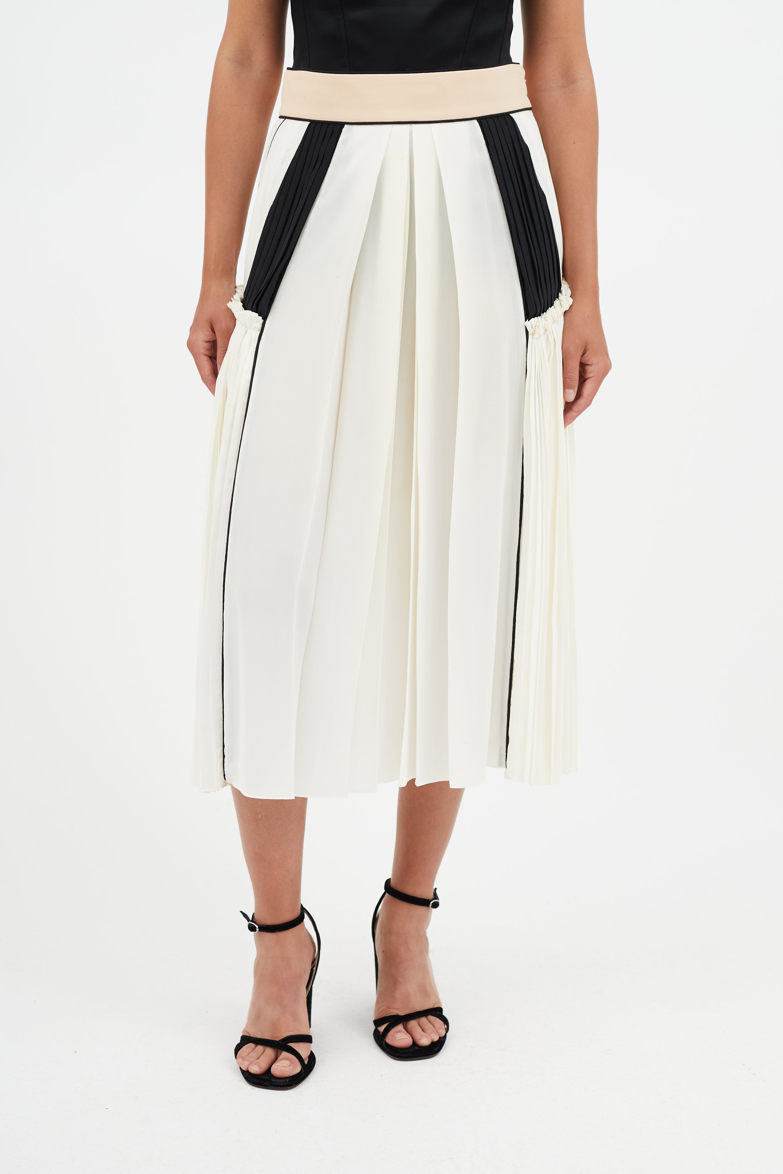 Pre-owned Chloè cream skirt featuring pleated detailing throughout, two slash pockets at hip, pink insert at waist, black trim, and zip at left side with hook and eye closure.