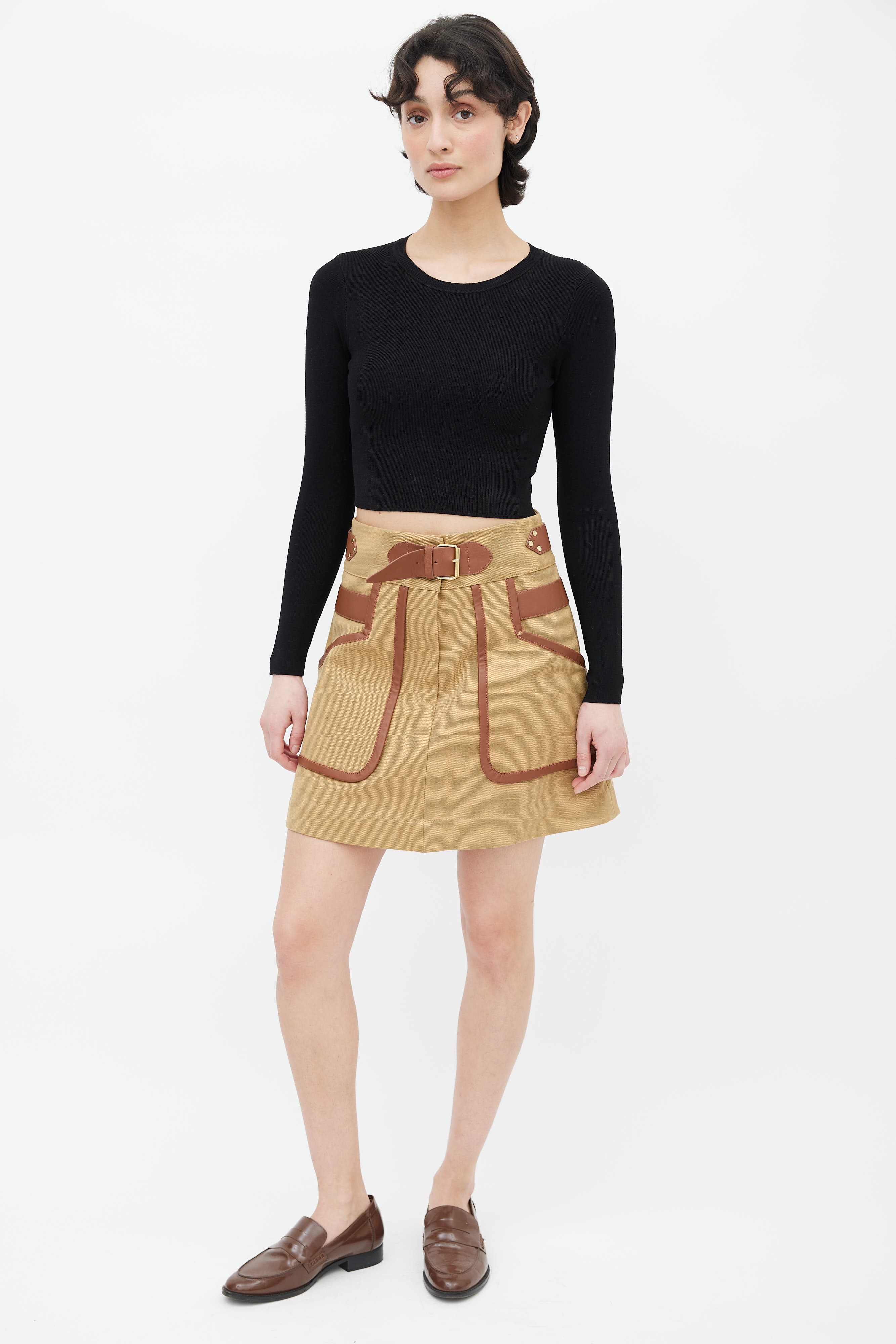 Pre-owned Derek Lam brown cotton mini skirt featuring dark brown leather trim throughout, wide waistband with adjustable buckle strap and zip closure at front, side pockets, and gold-tone hardware. Unlined.