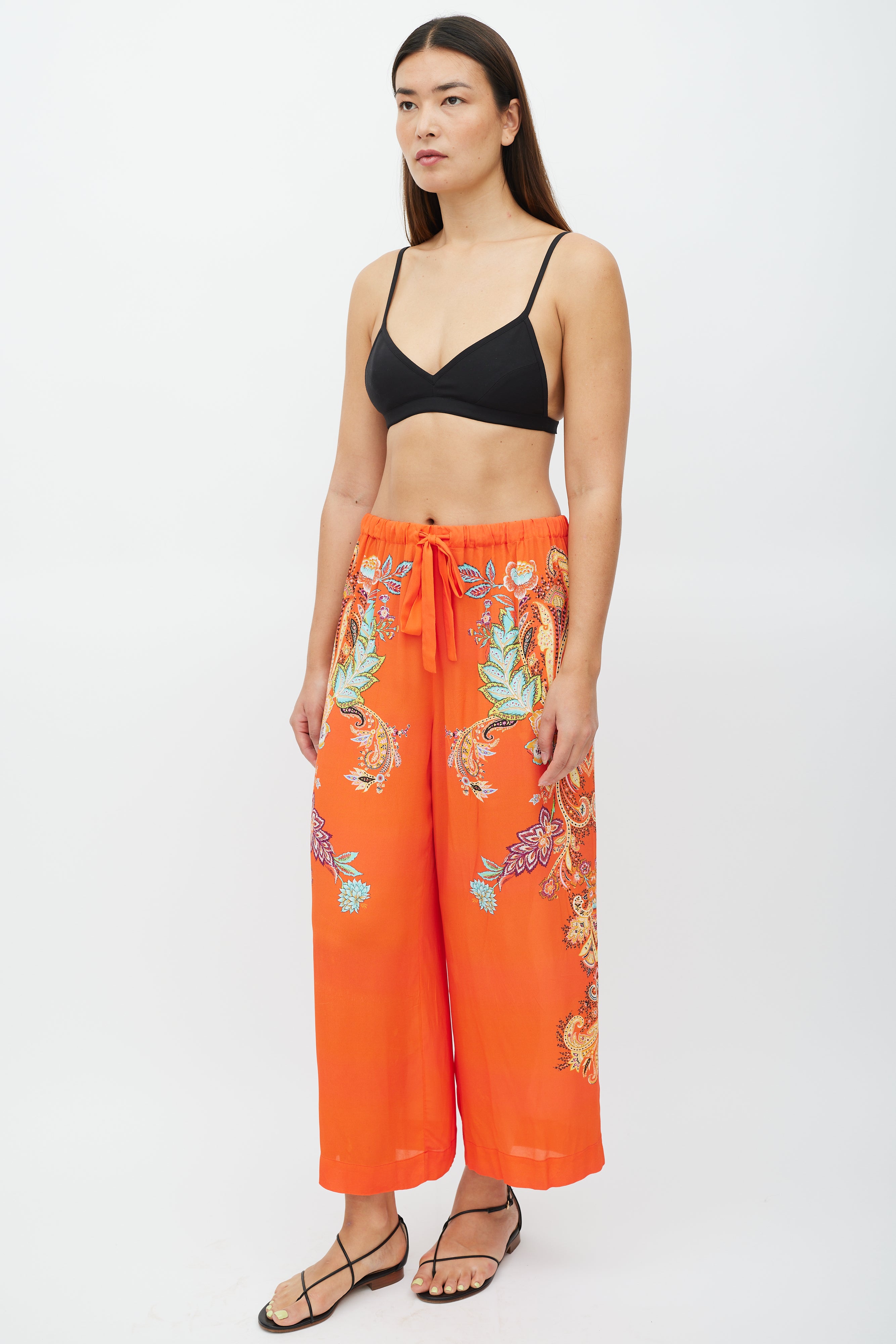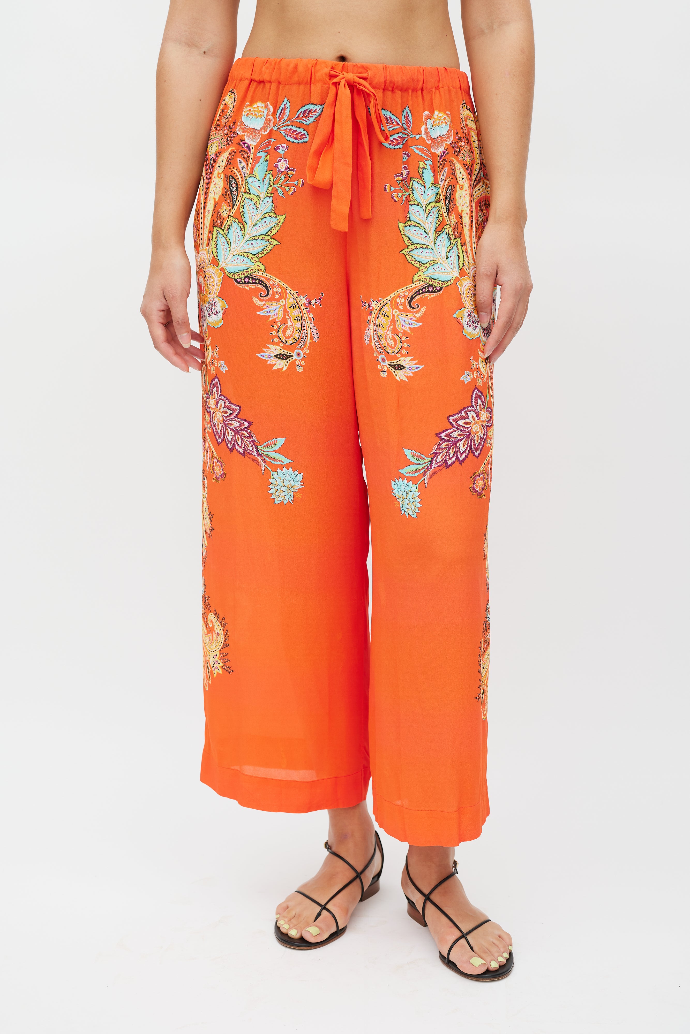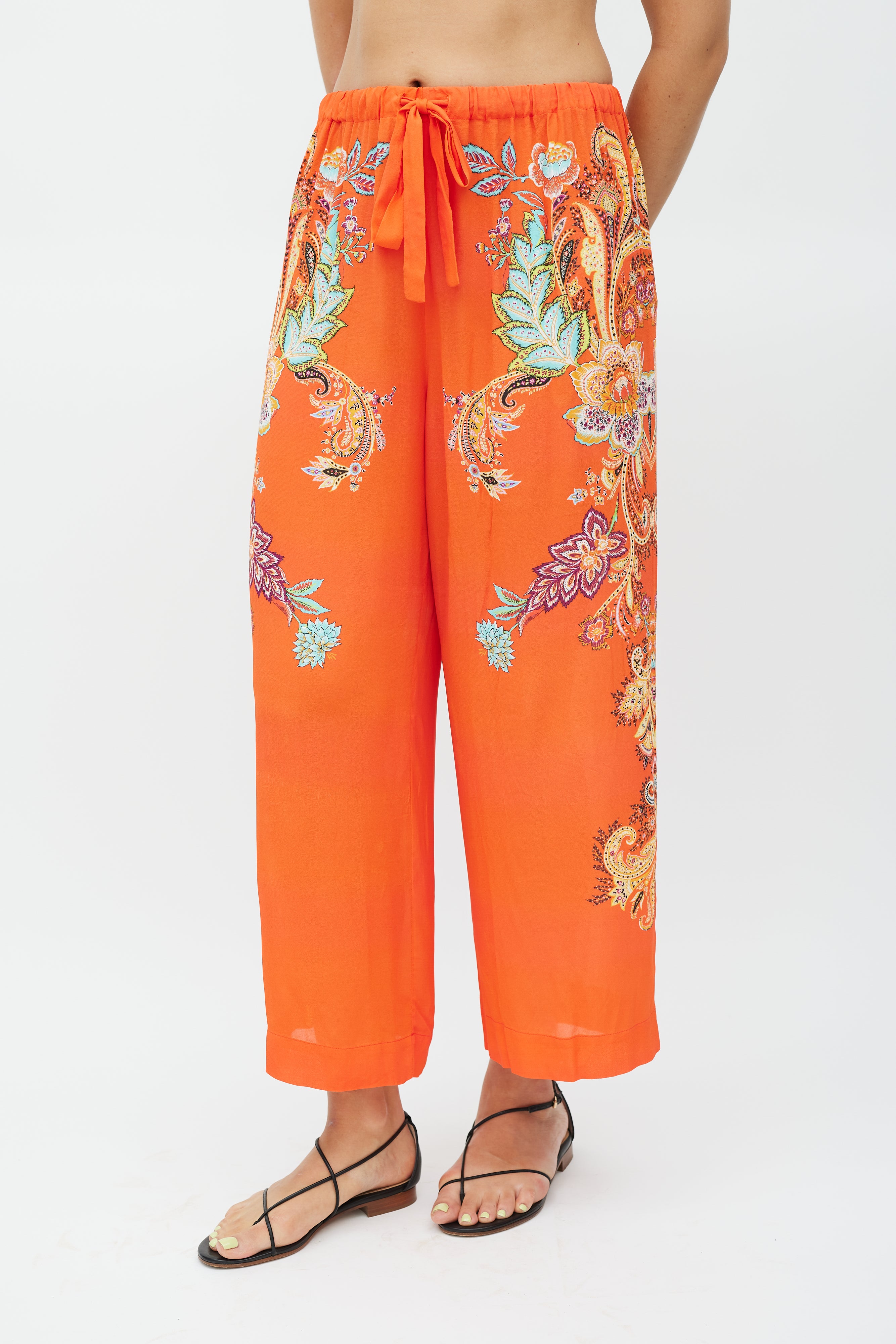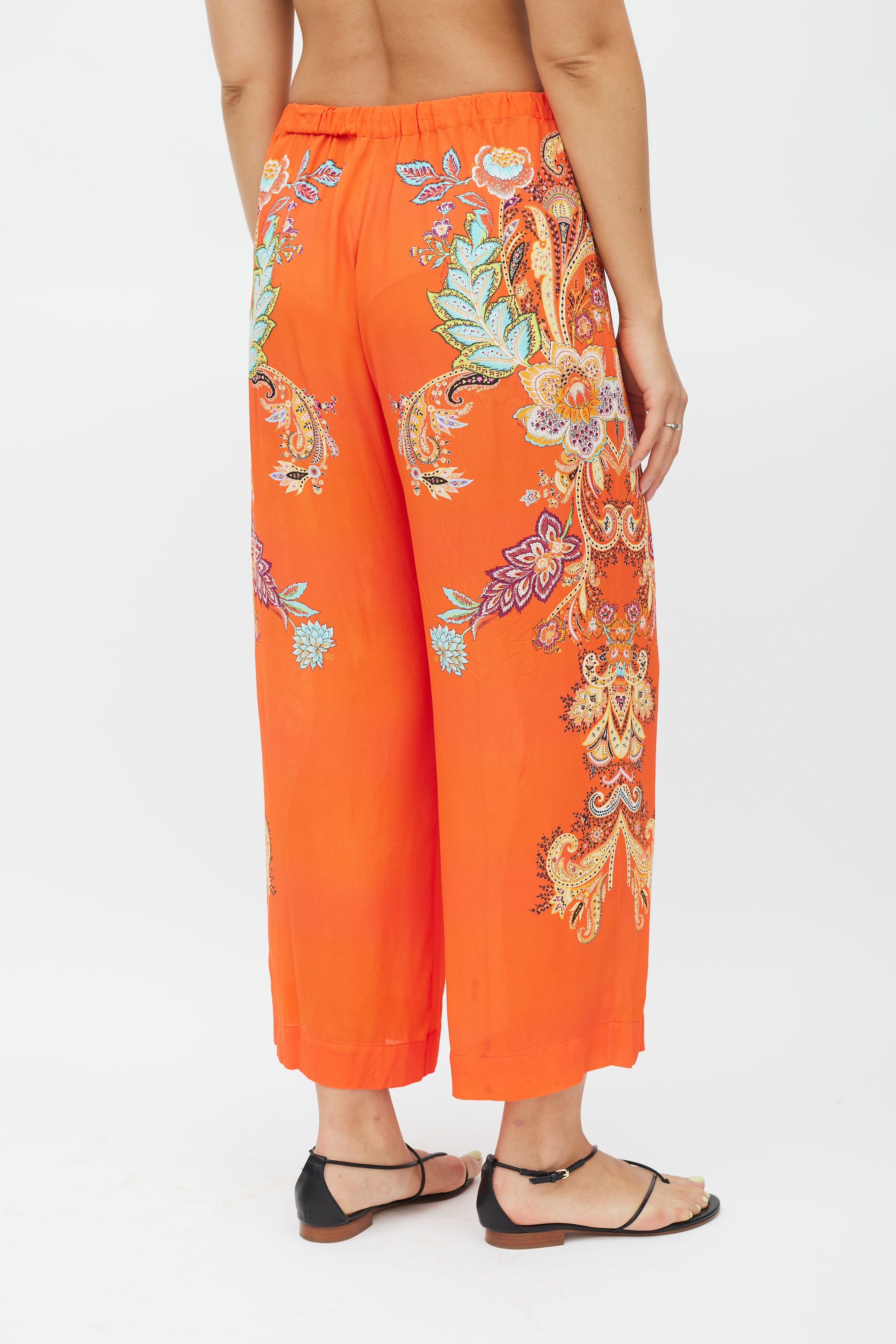 Pre-owned Etro orange trousers featuring a multicolour paisley pattern throughout, elasticized drawstring waist, and wide leg.