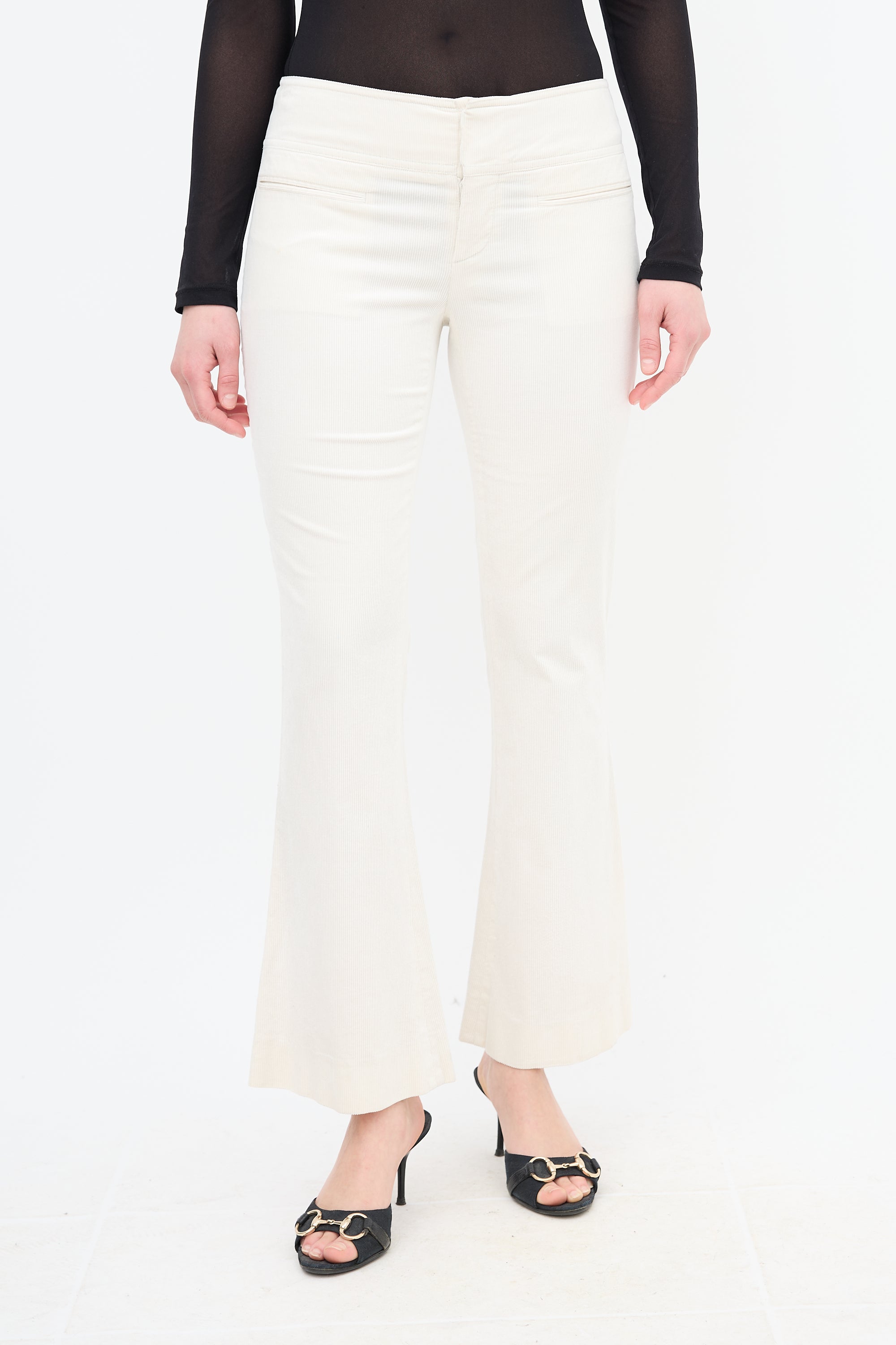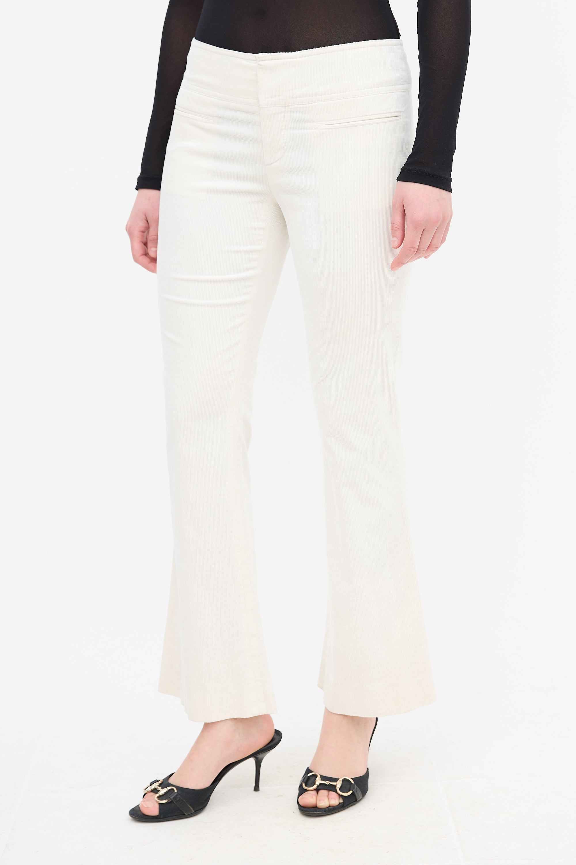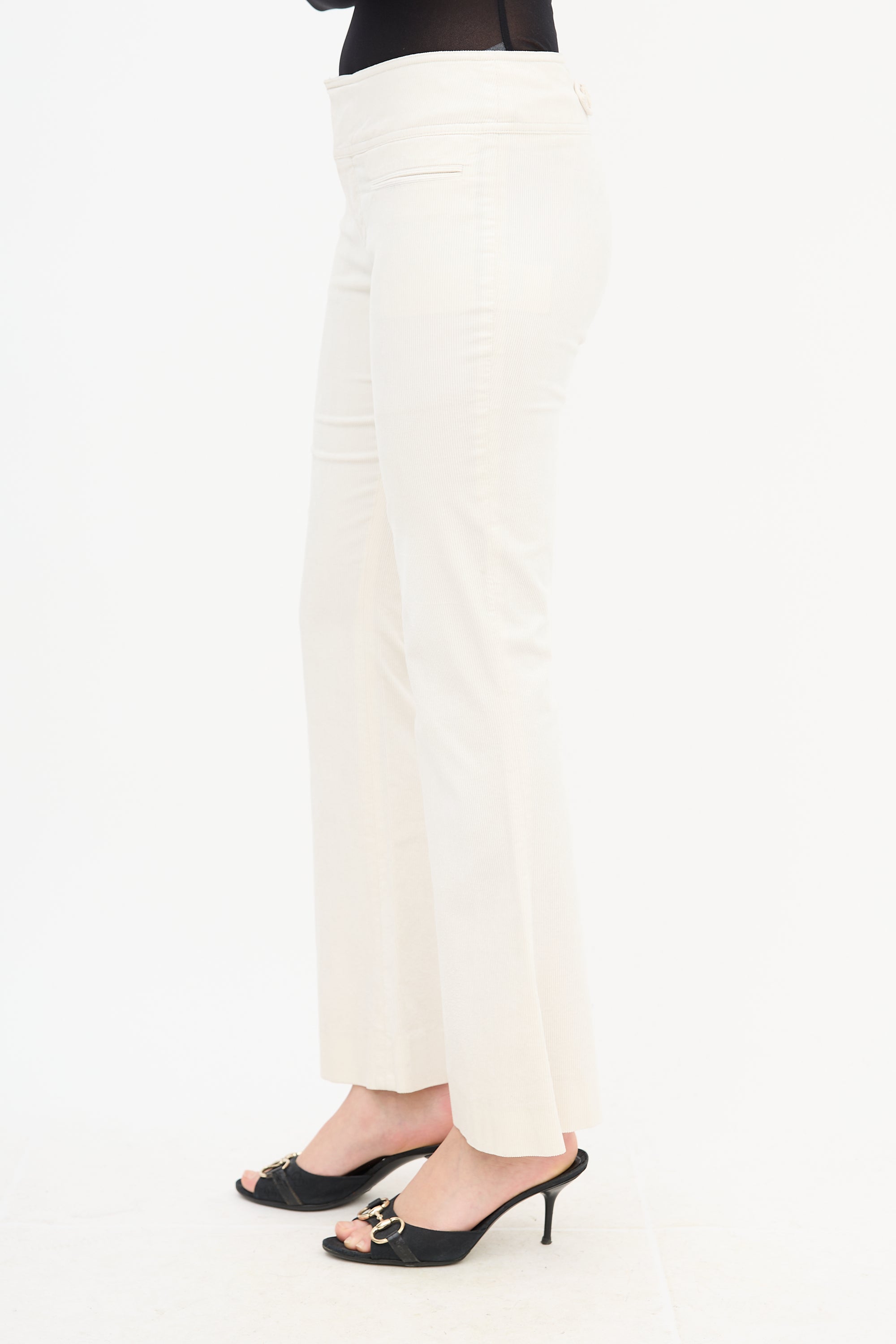 Pre-owned Gucci white corduroy trousers featuring concealed zip fly with clasps fastening, two welt pockets at front, adjustable buckle at back, and flared leg.