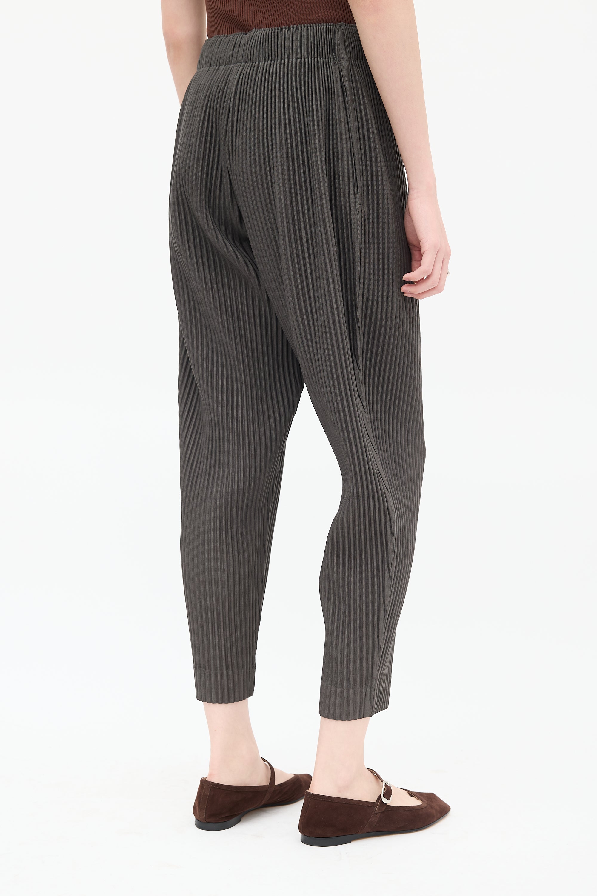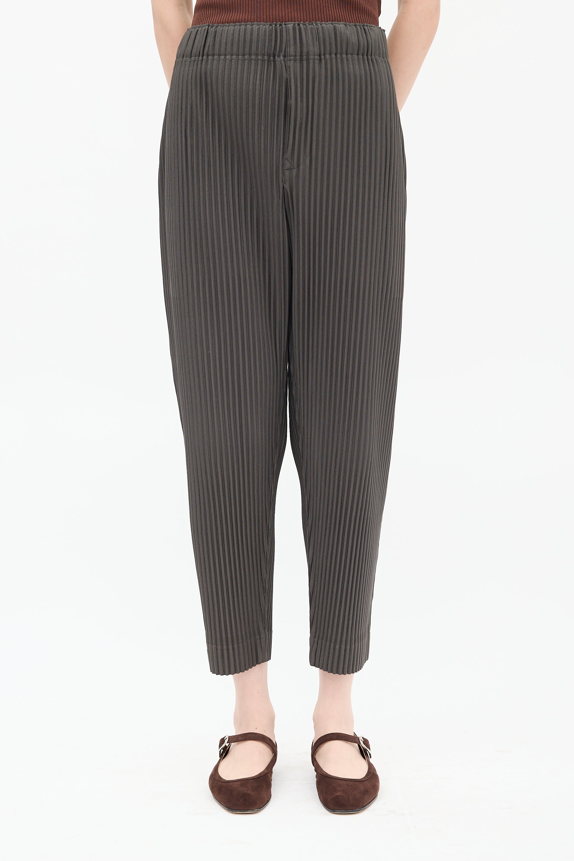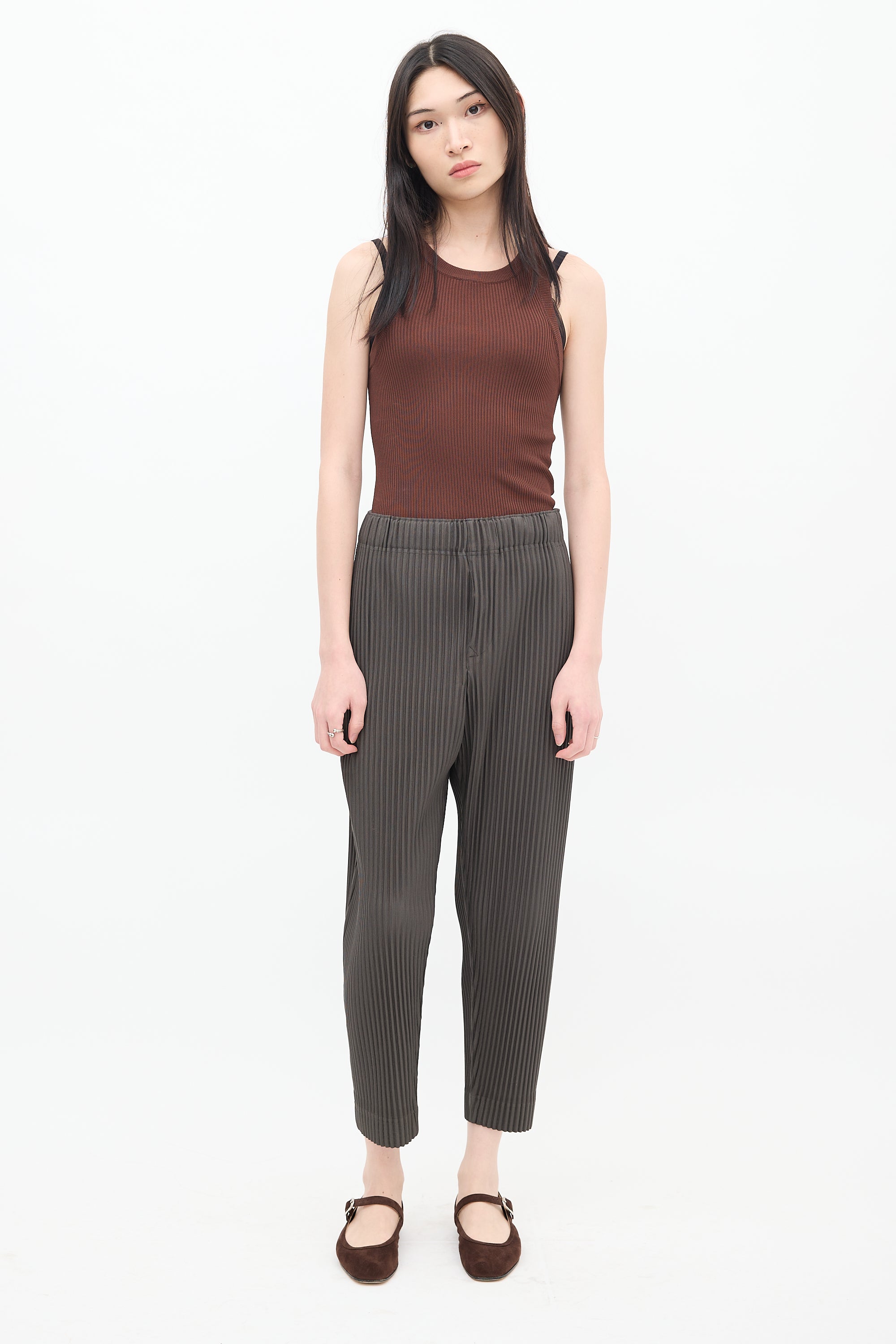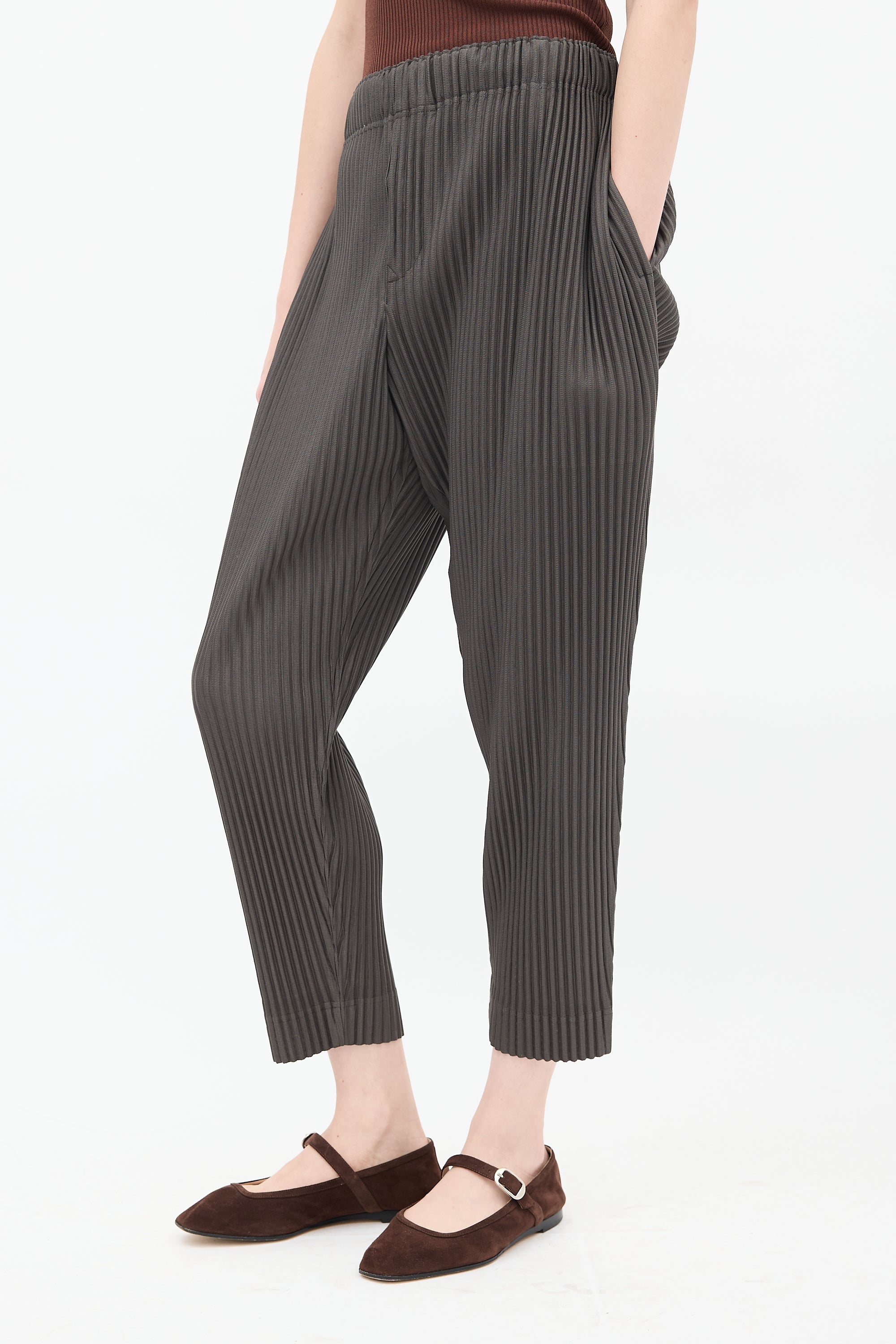 Pre-owned Homme Plissé Issey Miyake dark grey pants featuring an elasticized waist with interior drawstring, dropped seat, tapered leg, in seam pockets, button fly, and signature pleats throughout.