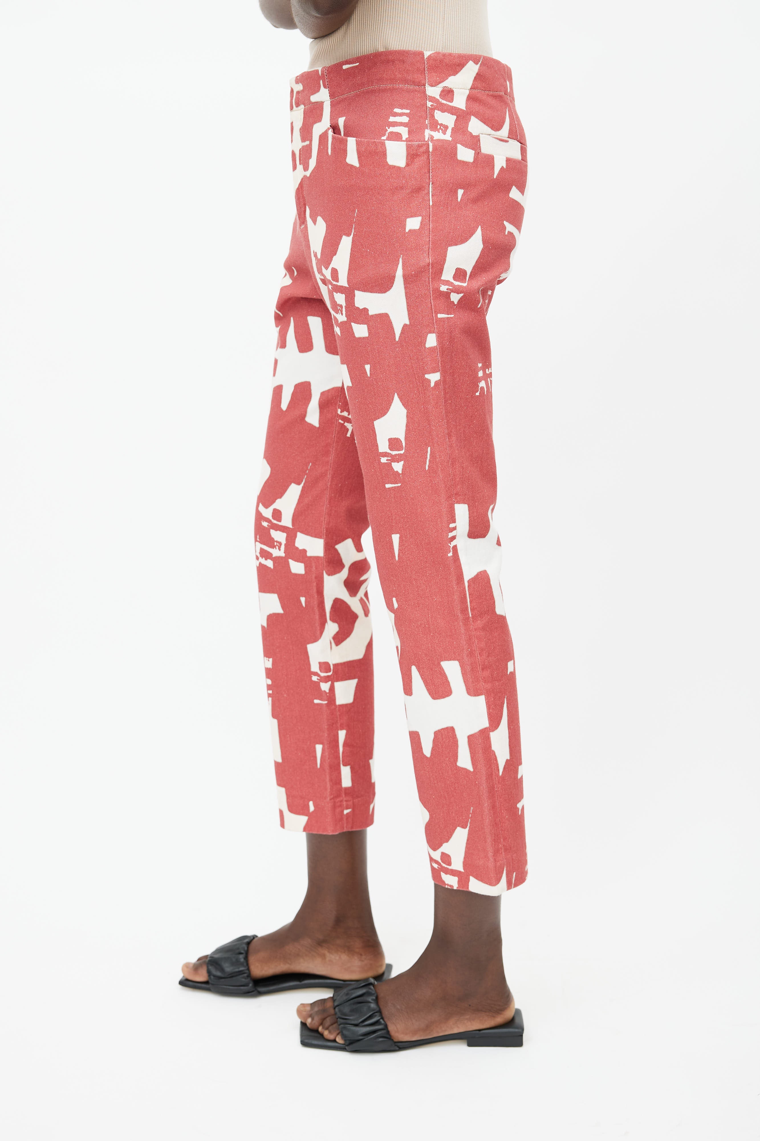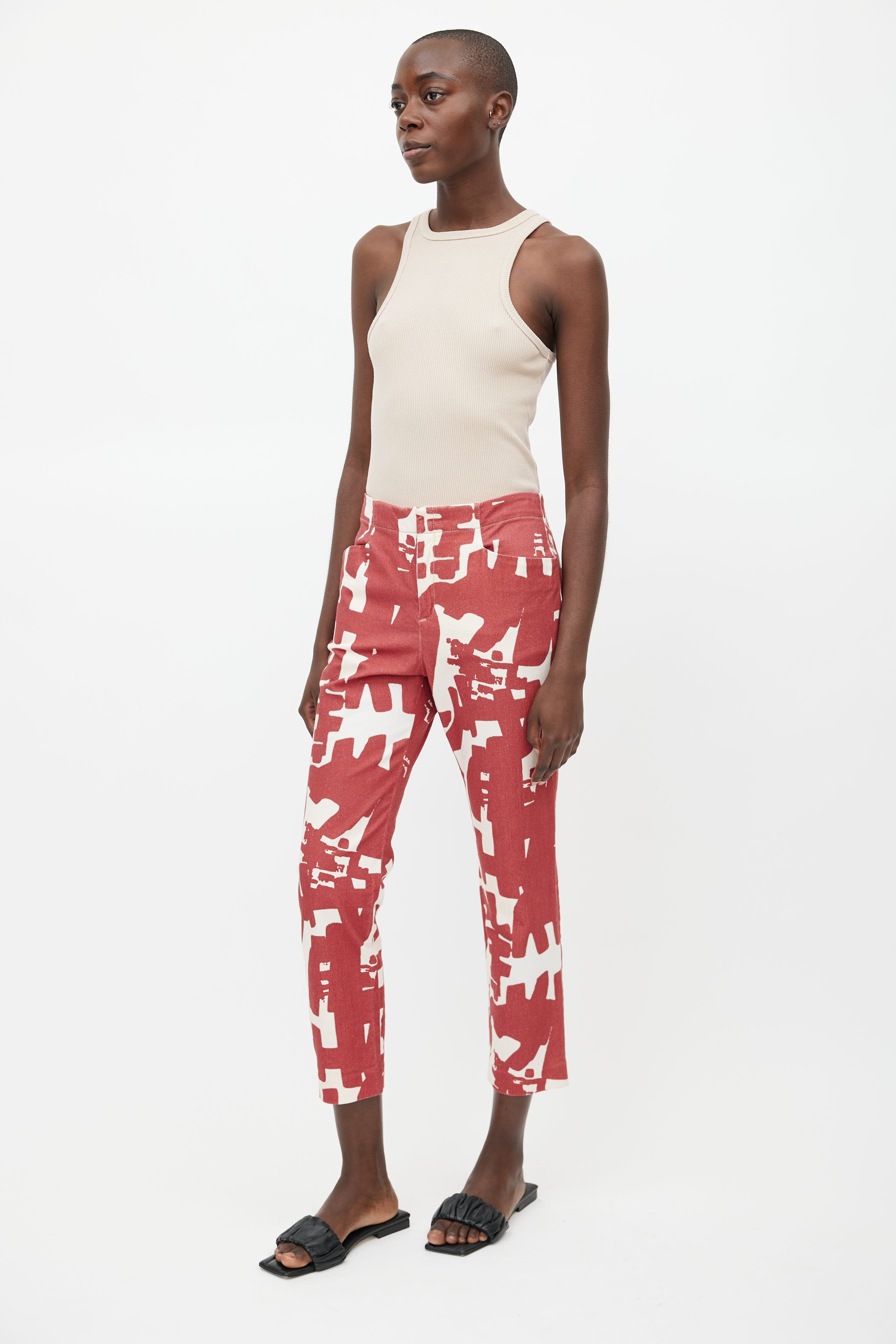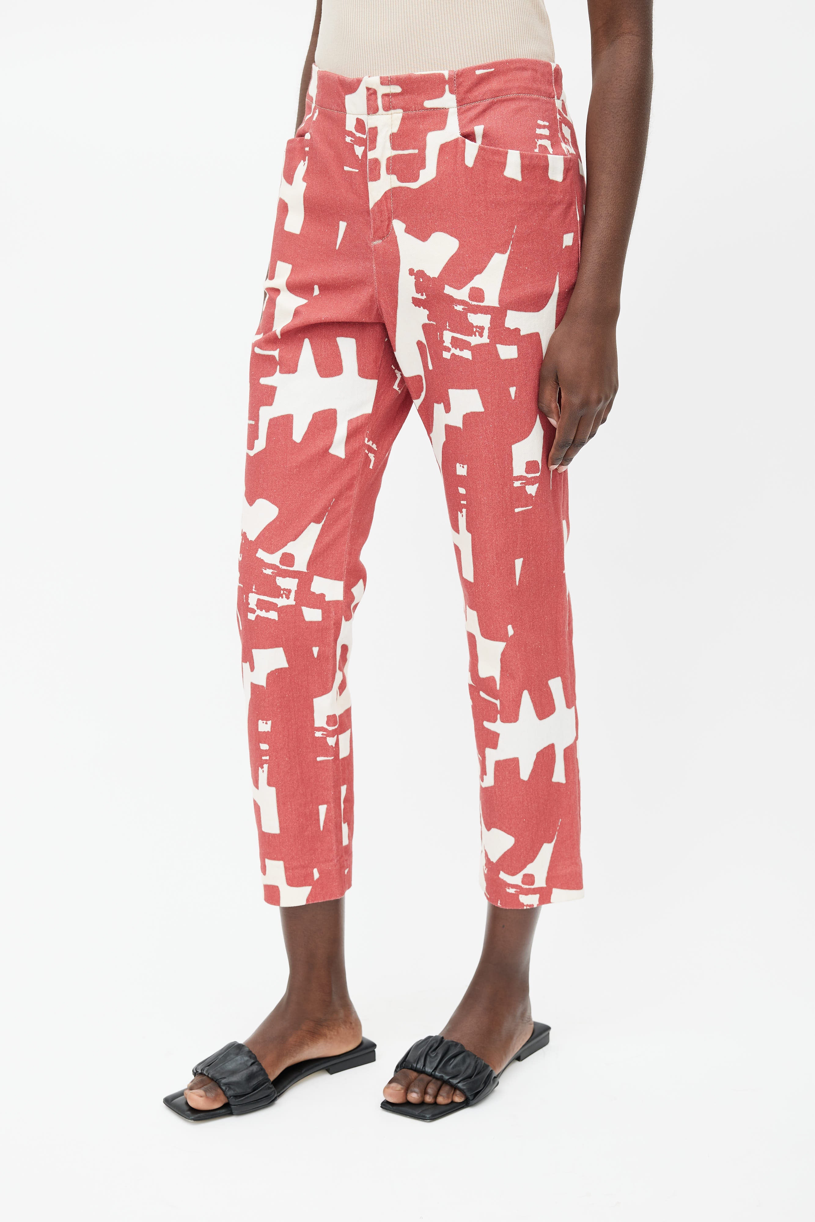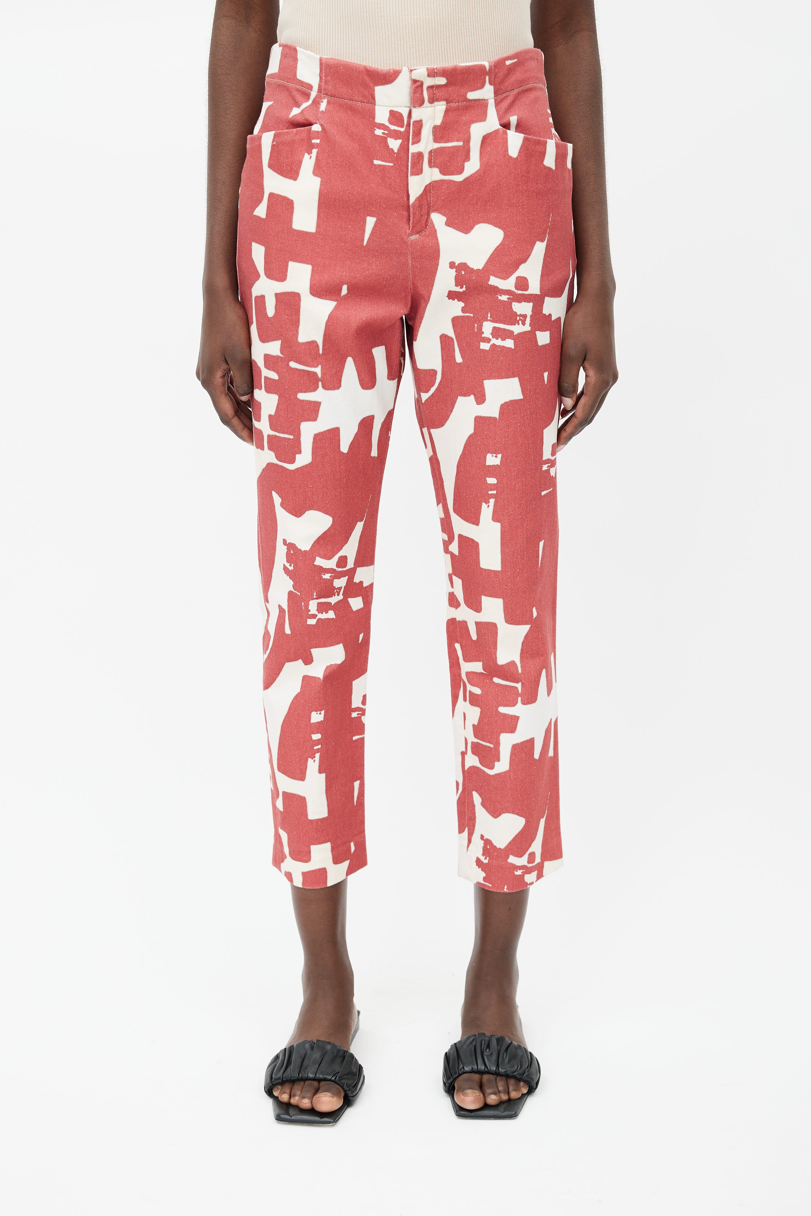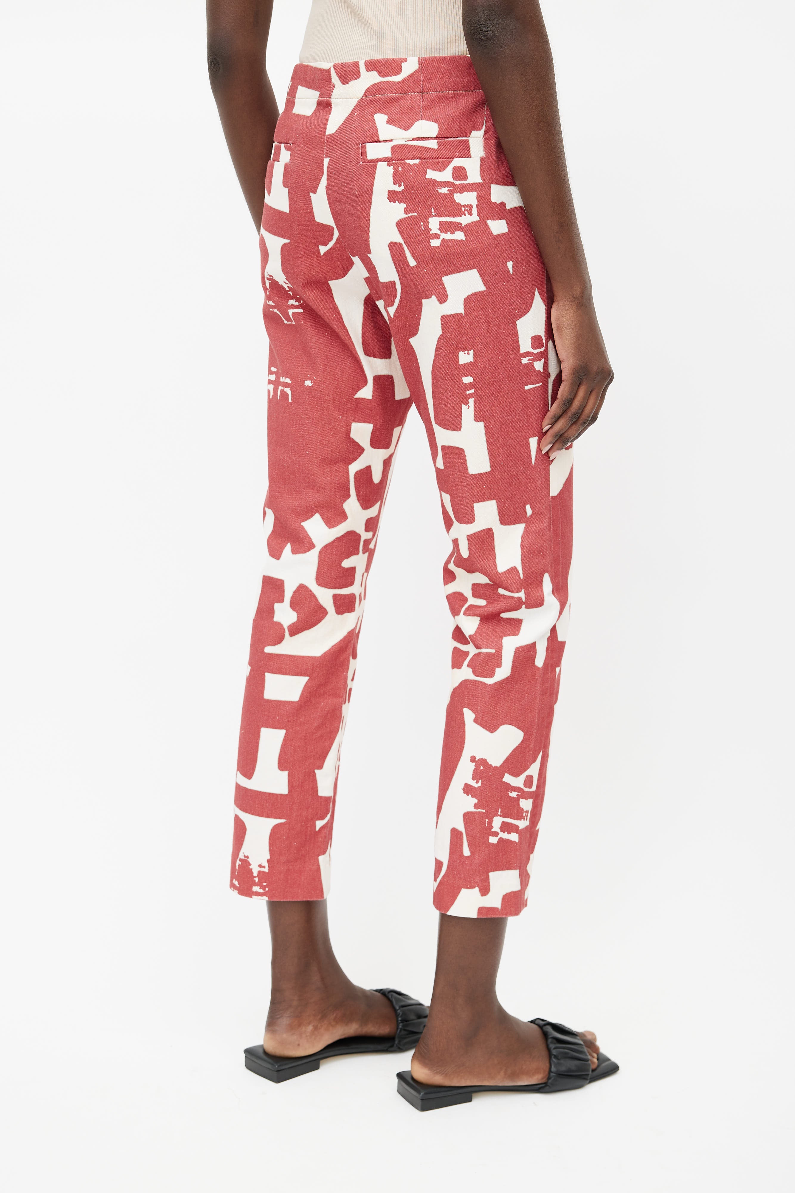 Pre-owned Isabel Marant red and cream pants featuring abstract print, zip fly, two hip pockets, and two buttoned back pockets. Clipped to fit model.